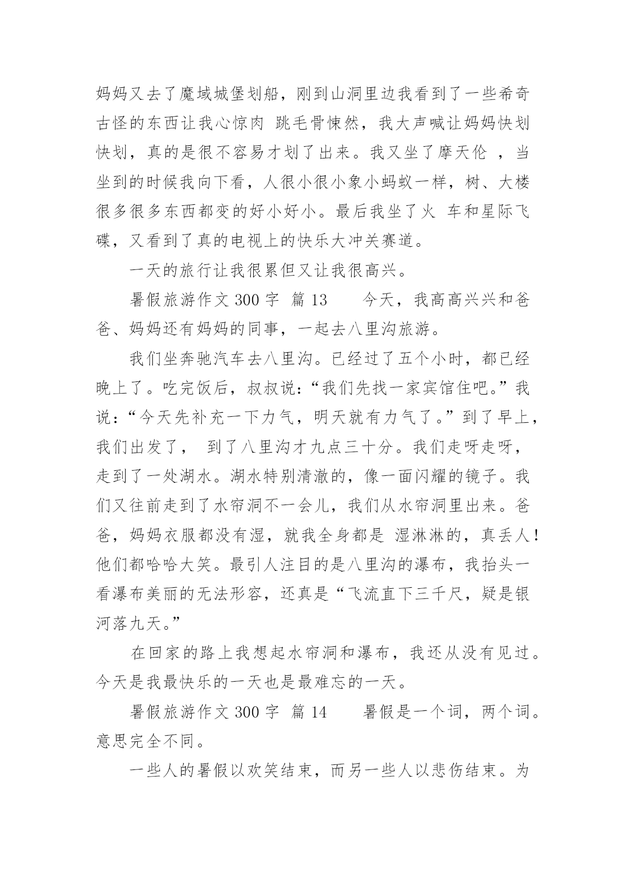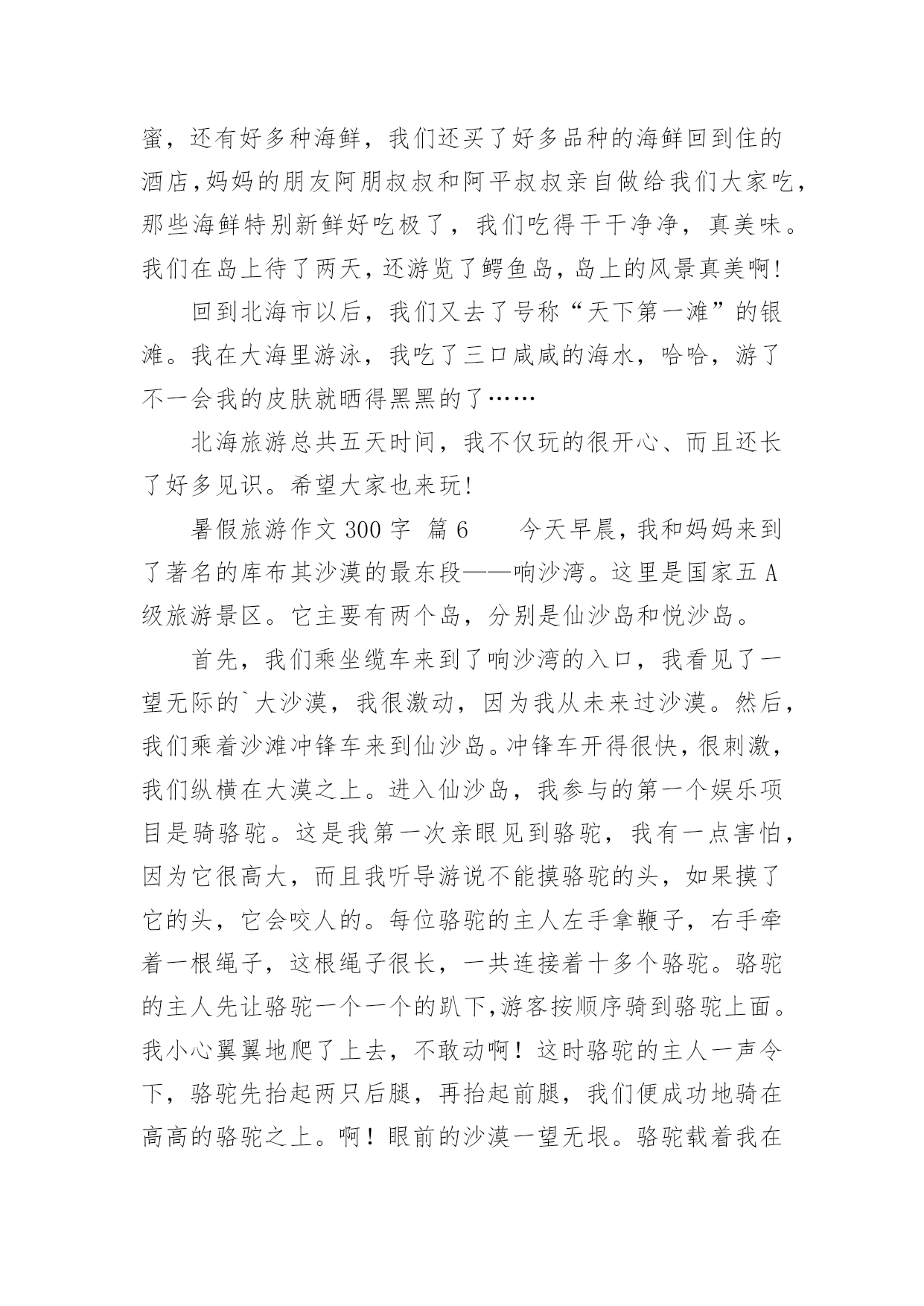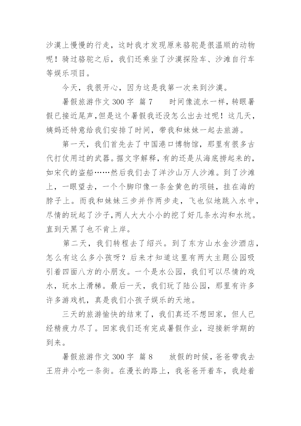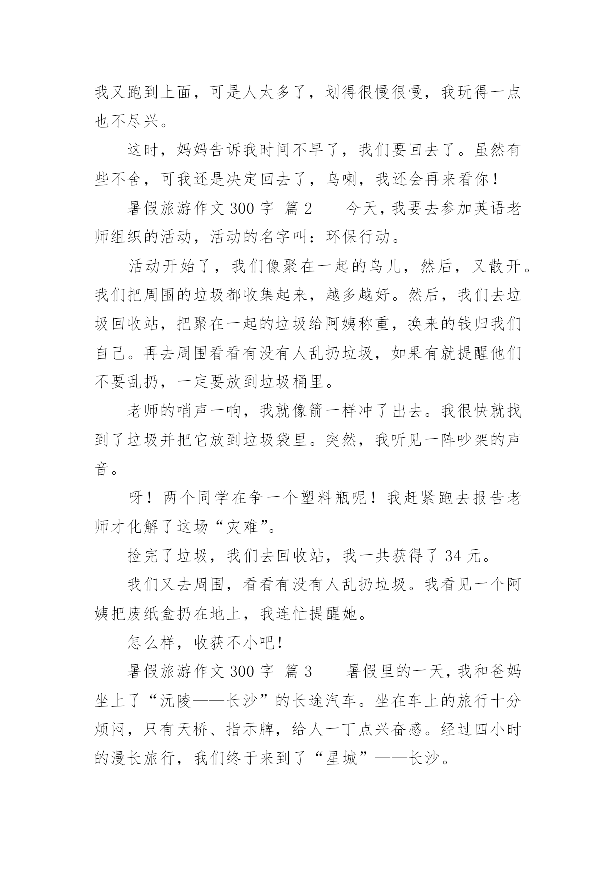 暑假旅游作文300字暑假旅游作文300字(通用22篇)在平凡的学习、工作、生活中,大家都尝试过写作文吧,作文一定要做到主题集中,围绕同一主题作深入阐述,切忌东拉西扯,主题涣散甚至无主题。相信许多人会觉得作文很难写吧,以下是小编收集整理的暑假旅游作文300字,供大家参考借鉴,希望可以帮助到有需要的朋友。暑假旅游作文300字篇1暑假里的一天,阳光明媚,爸爸妈妈领我来到了一个我向往已久的地方——吉林乌喇。刚到那里,我就被眼前的景色迷住了,这里有满族风情人家、有以前的戏剧台、有小河、有炮楼、有人家……在一个满族人家的院子里,我看到有人在打麻将,有人在打水,还有人在用“摇车”哄孩子,我可从来没睡过摇车,想必睡在里边一定很舒服。离开了这个景点,前边是一个亭子。我以最快的速度冲了进去,又以迅雷不及掩耳之势冲了出来,原来我被亭子里的蜜蜂给蛰了,耳朵立马总得老高,就像猪八戒的一只耳朵,还很疼。我哭着想:小蜜蜂,我没有要招惹你的意思,你为什么要欺负我呢?不够意思!我们一家继续前行,来到了小河边时,爸爸买了一袋鱼食,我一点点把鱼食倒入河中,看着小鱼吃得那么开心我也很开心!突然我看到了一个大滑梯,随人群我走了上去,“哧溜”一下我滑了下来,才发现这是一个转轮滑梯,很好玩。于是我又跑到上面,可是人太多了,划得很慢很慢,我玩得一点也不尽兴。这时,妈妈告诉我时间不早了,我们要回去了。虽然有些不舍,可我还是决定回去了,乌喇,我还会再来看你!暑假旅游作文300字篇2今天,我要去参加英语老师组织的活动,活动的名字叫:环保行动。活动开始了,我们像聚在一起的鸟儿,然后,又散开。我们把周围的垃圾都收集起来,越多越好。然后,我们去垃圾回收站,把聚在一起的垃圾给阿姨称重,换来的钱归我们自己。再去周围看看有没有人乱扔垃圾,如果有就提醒他们不要乱扔,一定要放到垃圾桶里。老师的哨声一响,我就像箭一样冲了出去。我很快就找到了垃圾并把它放到垃圾袋里。突然,我听见一阵吵架的声音。呀!两个同学在争一个塑料瓶呢!我赶紧跑去报告老师才化解了这场“灾难”。捡完了垃圾,我们去回收站,我一共获得了34元。我们又去周围,看看有没有人乱扔垃圾。我看见一个阿姨把废纸盒扔在地上,我连忙提醒她。怎么样,收获不小吧!暑假旅游作文300字篇3暑假里的一天,我和爸妈坐上了“沅陵——长沙”的长途汽车。坐在车上的旅行十分烦闷,只有天桥、指示牌,给人一丁点兴奋感。经过四小时的漫长旅行,我们终于来到了“星城”——长沙。冯杰一家也经过长途跋涉来到了长沙。下午,两家人一起去植物园游玩。路上,我和冯杰一起看树,经多个游乐点,终于来到了“环球嘉年华”,“环球嘉年华”,游乐设施真是多啊!有蹦极、旋转秋千、UFO、疯狂坐椅。应有尽有。真想冲进去玩!蹦极冯杰很有兴趣,只见工作人员把安全带套在冯杰身上,另一个工作人员控制机器,一个工作人员抓住冯杰的脚,一松手,冯杰便飞了起来,但安全降落在地面上后,冯杰居然害怕了起来把机会让给了我,我也在工作人员的帮助下“飞”了起来。UFO像个大转盘,我开始以为转盘不转,所以选了个靠边的位置,结果转盘转了起来差点儿被飞了出去。真是惊险啊!第二天,我们一起去世界之窗游玩,先去湘江谷玩,坐了一次激流勇进。第三天,我们去了海底世界玩,认识了很多海底的动物。又和舅舅,冯杰到漂流河玩,我不小心按了泳圈一下,结果翻船了,真是刺激!旅游使我增长了知识,也收获了快乐!暑假旅游作文300字篇4今年暑假,我和妈妈等人一起到期待已久的韩国爱宝乐园。以前都只是在电视剧中和妈妈看韩剧时看见,现在真的亲自到了爱宝乐园游玩,我实在太兴奋、太幸福呢!一到达期待已久的爱宝乐园,眼前为之一亮,景色优美、色彩丰富,就像在电视中一样漂亮,“不”应该更美丽!简直就是小孩的快乐天堂!我好像爱丽丝走进童话故事里,沿途上看见小飞侠、美人鱼、可爱兔……,而且还有好多游乐器材。我玩了旋转木马、碰碰车及旋转车,尤其是旋转车,当初我们以为是小朋友坐的,没想到一坐上去,”尖叫声”一直不断的听到,坐完后,我猛吐,因为实在是太晕了,走路时,一直跌跌撞撞的,再来又玩云霄飞车,超刺激而且在最刺激的时候,机器就故意在那里拍照,再看我们要不要把照片买回家,拜托,谁要买回家啊!而且爱宝乐园很贴心,怕客人脚痛,在每一个地方都装平面电梯,还有小姐在为你服务,真是贴心!最后我们坐车子进入野生动物区,沿路上看到熊、狮子、老虎,最有趣的是“狮虎”,它是狮子和老虎的小孩,它很可爱所以最受大家的欢迎。我和妈妈也被狮虎迷住,而买了很多纪念品呢。快乐的时间总是过得特别快,这次的旅行,让我有个“难忘的经验”。暑假旅游作文300字篇58月1日一大早,我和爸爸、妈妈一起坐飞机去北海旅游。两个小时以后,我们到达了美丽的海滨城市-北海市。我们一行直奔海边,去感受当地渔民的生活,拉网、捕鱼、拾贝,而我