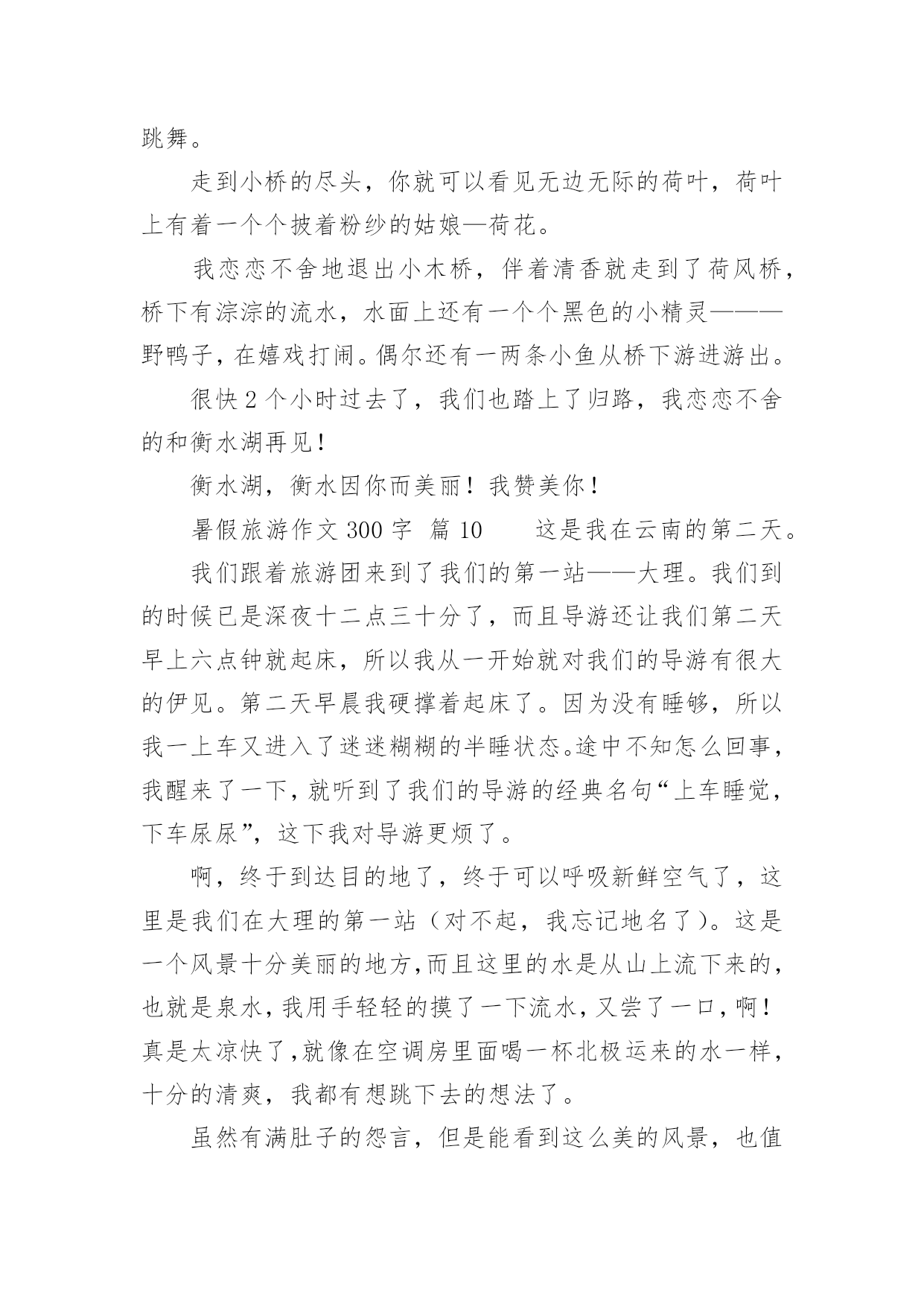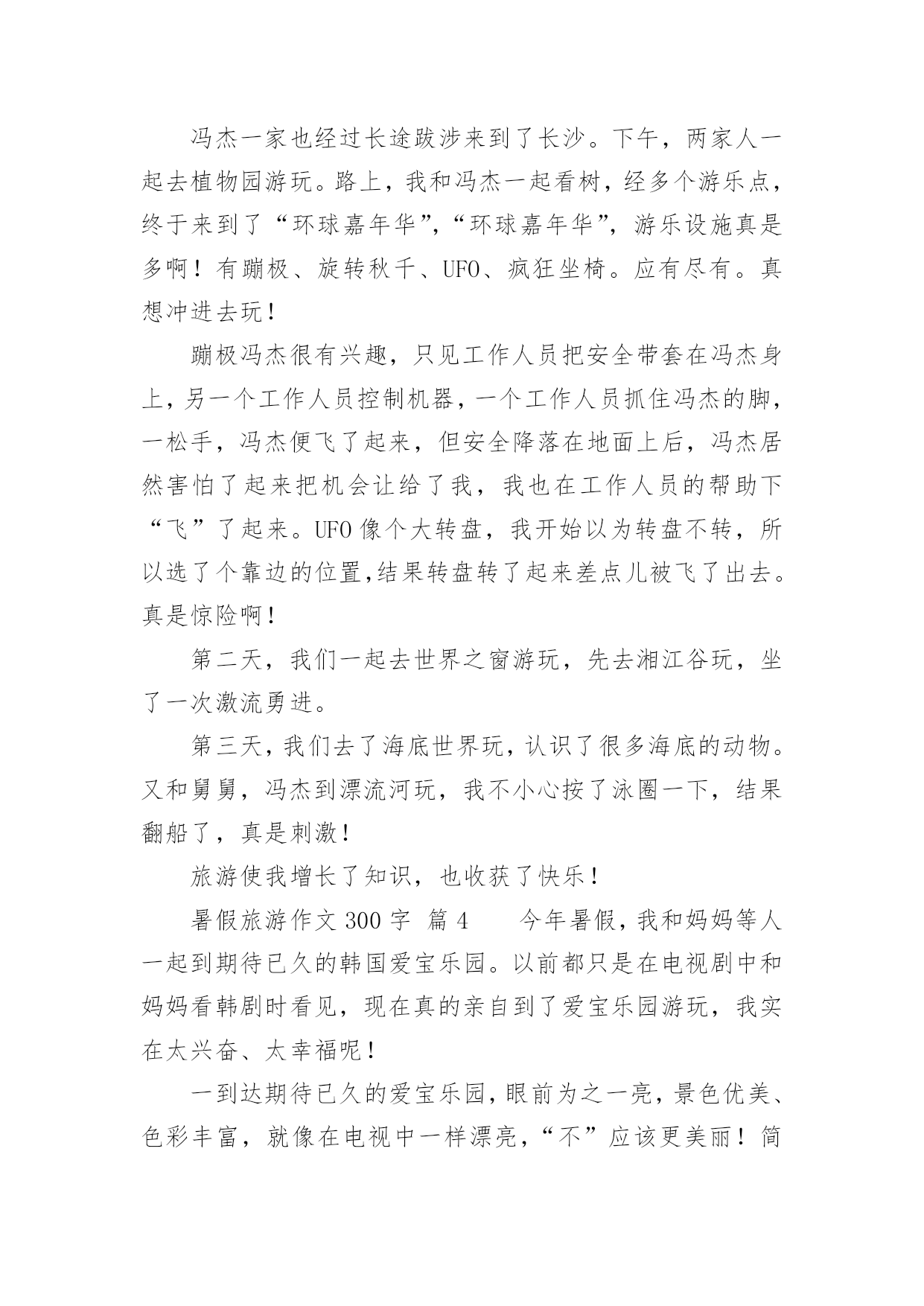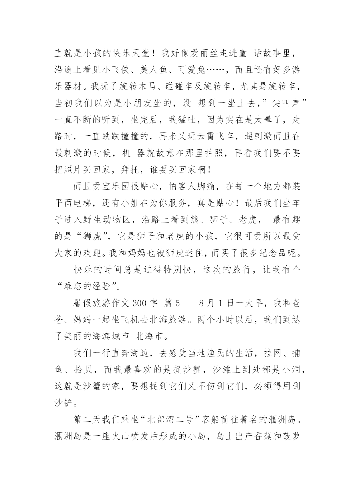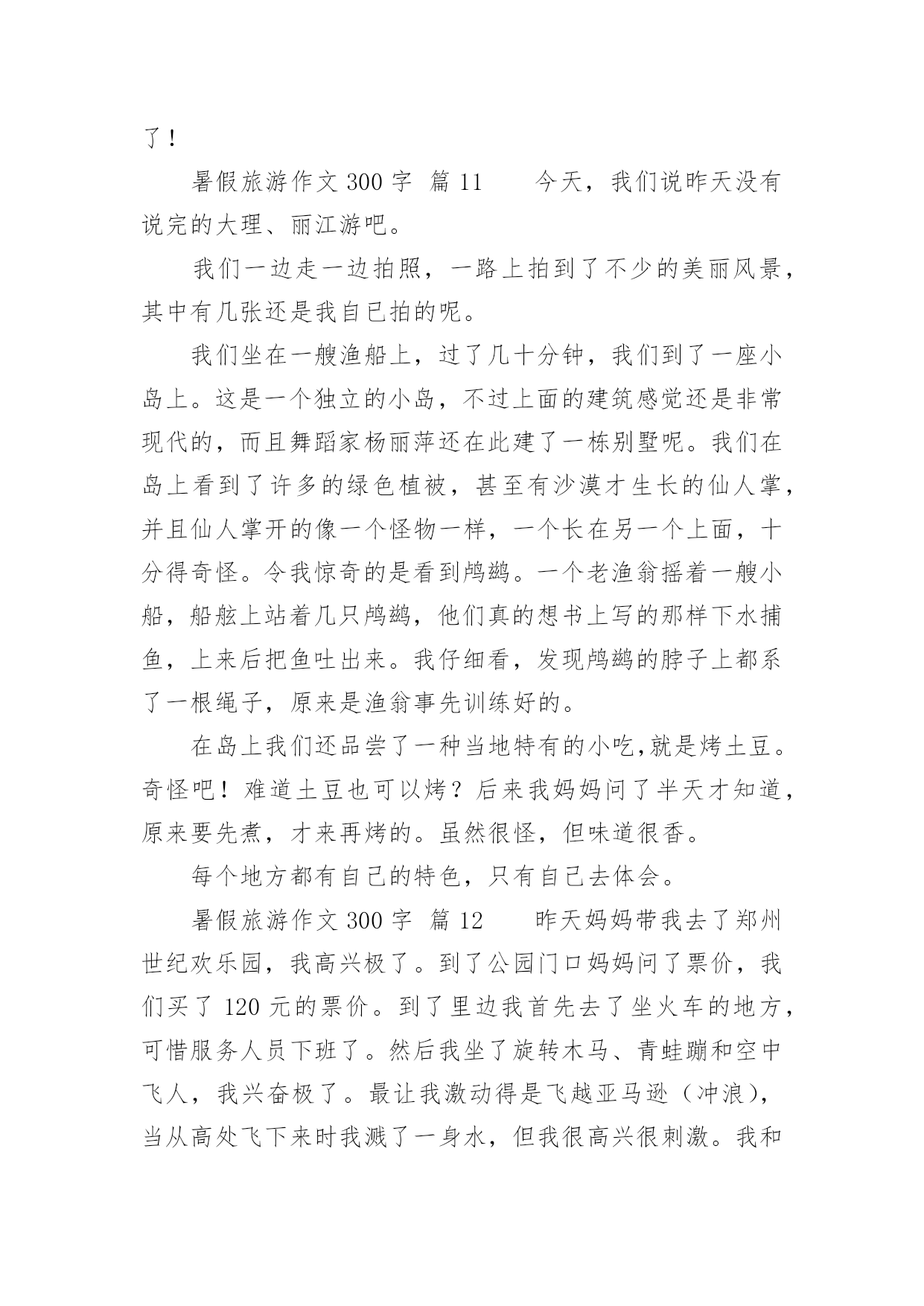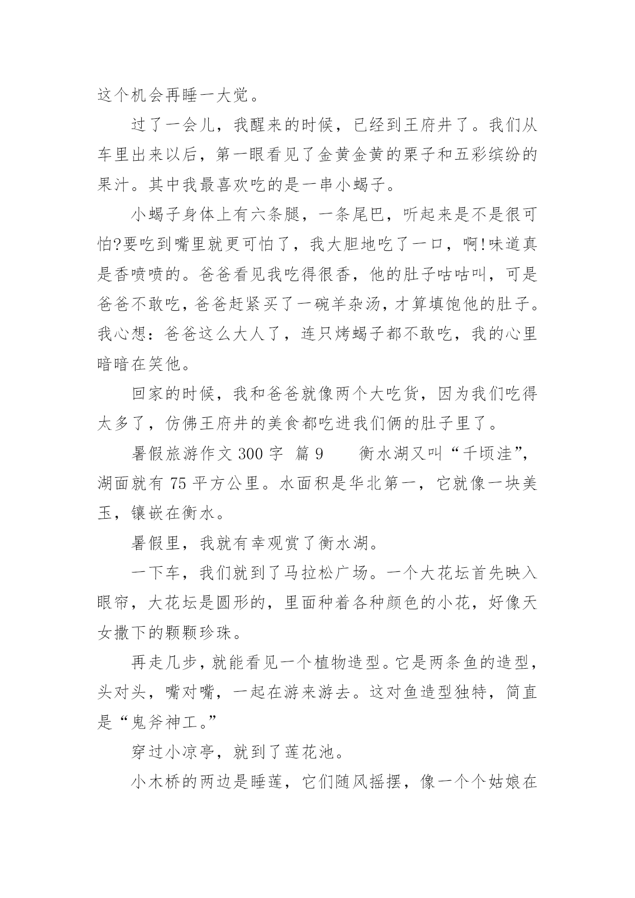 暑假旅游作文300字暑假旅游作文300字(通用22篇)在平凡的学习、工作、生活中,大家都尝试过写作文吧,作文一定要做到主题集中,围绕同一主题作深入阐述,切忌东拉西扯,主题涣散甚至无主题。相信许多人会觉得作文很难写吧,以下是小编收集整理的暑假旅游作文300字,供大家参考借鉴,希望可以帮助到有需要的朋友。暑假旅游作文300字篇1暑假里的一天,阳光明媚,爸爸妈妈领我来到了一个我向往已久的地方——吉林乌喇。刚到那里,我就被眼前的景色迷住了,这里有满族风情人家、有以前的戏剧台、有小河、有炮楼、有人家……在一个满族人家的院子里,我看到有人在打麻将,有人在打水,还有人在用“摇车”哄孩子,我可从来没睡过摇车,想必睡在里边一定很舒服。离开了这个景点,前边是一个亭子。我以最快的速度冲了进去,又以迅雷不及掩耳之势冲了出来,原来我被亭子里的蜜蜂给蛰了,耳朵立马总得老高,就像猪八戒的一只耳朵,还很疼。我哭着想:小蜜蜂,我没有要招惹你的意思,你为什么要欺负我呢?不够意思!我们一家继续前行,来到了小河边时,爸爸买了一袋鱼食,我一点点把鱼食倒入河中,看着小鱼吃得那么开心我也很开心!突然我看到了一个大滑梯,随人群我走了上去,“哧溜”一下我滑了下来,才发现这是一个转轮滑梯,很好玩。于是我又跑到上面,可是人太多了,划得很慢很慢,我玩得一点也不尽兴。这时,妈妈告诉我时间不早了,我们要回去了。虽然有些不舍,可我还是决定回去了,乌喇,我还会再来看你!暑假旅游作文300字篇2今天,我要去参加英语老师组织的活动,活动的名字叫:环保行动。活动开始了,我们像聚在一起的鸟儿,然后,又散开。我们把周围的垃圾都收集起来,越多越好。然后,我们去垃圾回收站,把聚在一起的垃圾给阿姨称重,换来的钱归我们自己。再去周围看看有没有人乱扔垃圾,如果有就提醒他们不要乱扔,一定要放到垃圾桶里。老师的哨声一响,我就像箭一样冲了出去。我很快就找到了垃圾并把它放到垃圾袋里。突然,我听见一阵吵架的声音。呀!两个同学在争一个塑料瓶呢!我赶紧跑去报告老师才化解了这场“灾难”。捡完了垃圾,我们去回收站,我一共获得了34元。我们又去周围,看看有没有人乱扔垃圾。我看见一个阿姨把废纸盒扔在地上,我连忙提醒她。怎么样,收获不小吧!暑假旅游作文300字篇3暑假里的一天,我和爸妈坐上了“沅陵——长沙”的长途汽车。坐在车上的旅行十分烦闷,只有天桥、指示牌,给人一丁点兴奋感。经过四小时的漫长旅行,我们终于来到了“星城”——长沙。冯杰一家也经过长途跋涉来到了长沙。下午,两家人一起去植物园游玩。路上,我和冯杰一起看树,经多个游乐点,终于来到了“环球嘉年华”,“环球嘉年华”,游乐设施真是多啊!有蹦极、旋转秋千、UFO、疯狂坐椅。应有尽有。真想冲进去玩!蹦极冯杰很有兴趣,只见工作人员把安全带套在冯杰身上,另一个工作人员控制机器,一个工作人员抓住冯杰的脚,一松手,冯杰便飞了起来,但安全降落在地面上后,冯杰居然害怕了起来把机会让给了我,我也在工作人员的帮助下“飞”了起来。UFO像个大转盘,我开始以为转盘不转,所以选了个靠边的位置,结果转盘转了起来差点儿被飞了出去。真是惊险啊!第二天,我们一起去世界之窗游玩,先去湘江谷玩,坐了一次激流勇进。第三天,我们去了海底世界玩,认识了很多海底的动物。又和舅舅,冯杰到漂流河玩,我不小心按了泳圈一下,结果翻船了,真是刺激!旅游使我增长了知识,也收获了快乐!暑假旅游作文300字篇4今年暑假,我和妈妈等人一起到期待已久的韩国爱宝乐园。以前都只是在电视剧中和妈妈看韩剧时看见,现在真的亲自到了爱宝乐园游玩,我实在太兴奋、太幸福呢!一到达期待已久的爱宝乐园,眼前为之一亮,景色优美、色彩丰富,就像在电视中一样漂亮,“不”应该更美丽!简直就是小孩的快乐天堂!我好像爱丽丝走进童话故事里,沿途上看见小飞侠、美人鱼、可爱兔……,而且还有好多游乐器材。我玩了旋转木马、碰碰车及旋转车,尤其是旋转车,当初我们以为是小朋友坐的,没想到一坐上去,”尖叫声”一直不断的听到,坐完后,我猛吐,因为实在是太晕了,走路时,一直跌跌撞撞的,再来又玩云霄飞车,超刺激而且在最刺激的时候,机器就故意在那里拍照,再看我们要不要把照片买回家,拜托,谁要买回家啊!而且爱宝乐园很贴心,怕客人脚痛,在每一个地方都装平面电梯,还有小姐在为你服务,真是贴心!最后我们坐车子进入野生动物区,沿路上看到熊、狮子、老虎,最有趣的是“狮虎”,它是狮子和老虎的小孩,它很可爱所以最受大家的欢迎。我和妈妈也被狮虎迷住,而买了很多纪念品呢。快乐的时间总是过得特别快,这次的旅行,让我有个“难忘的经验”。暑假旅游作文300字篇58月1日一大早,我和爸爸、妈妈一起坐飞机去北海旅游。两个小时以后,我们到达了美丽的海滨城市-北海市。我们一行直奔海边,去感受当地渔民的生活,拉网、捕鱼、拾贝,而我
