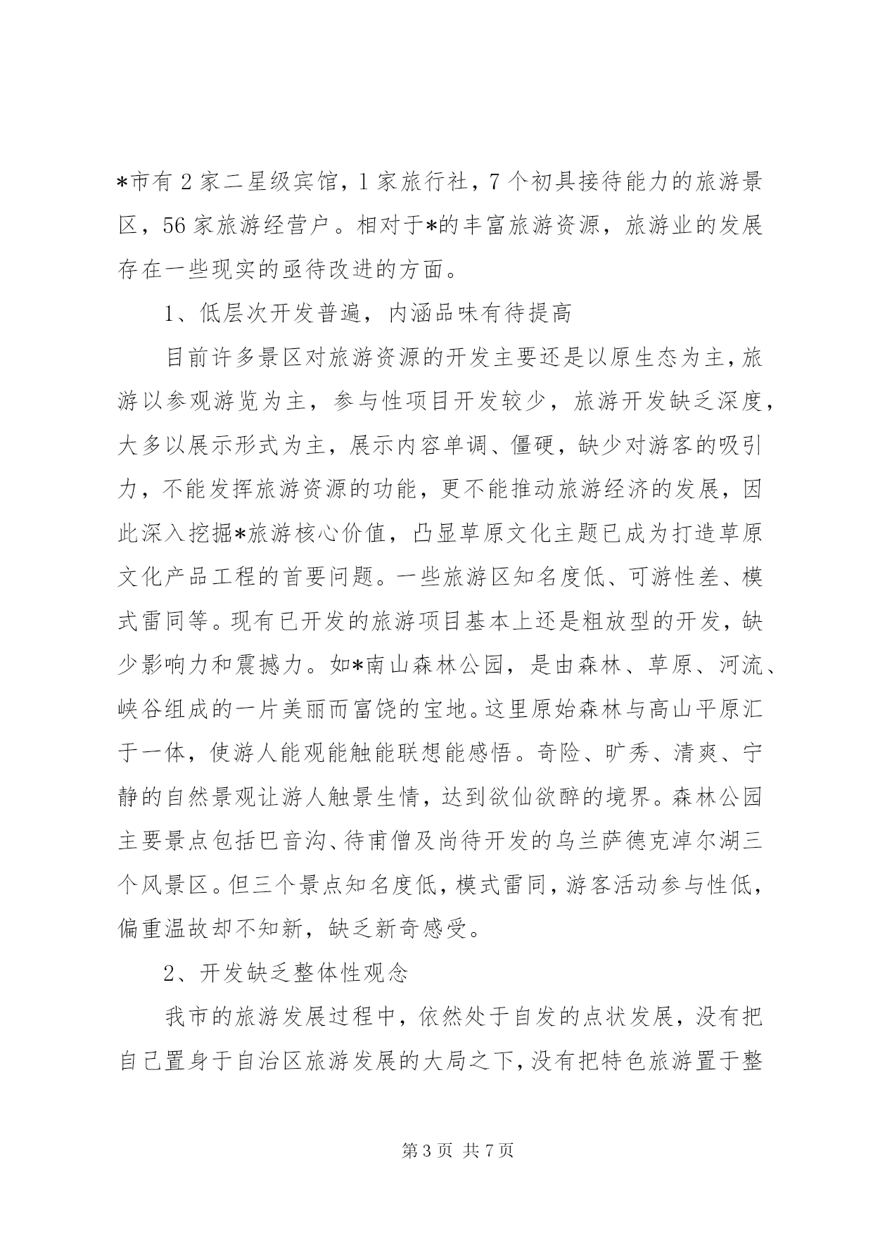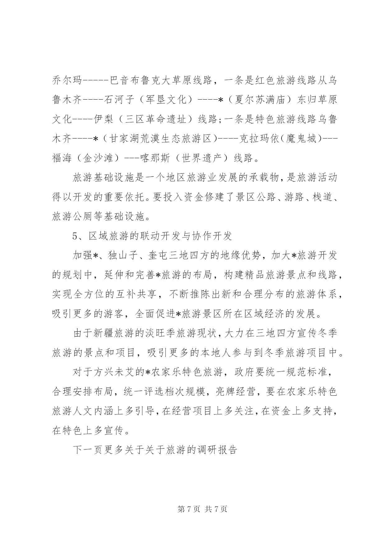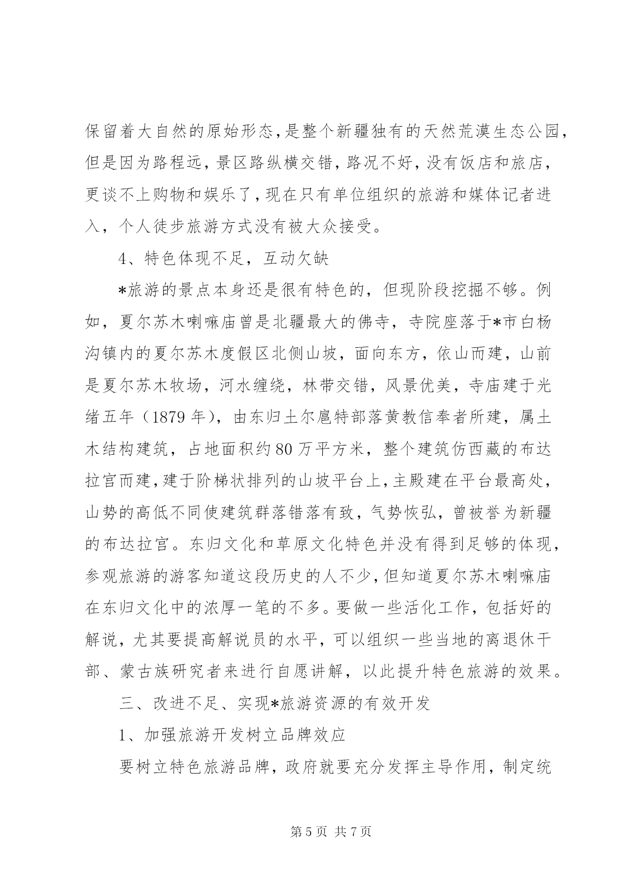 第PAGE\*Arabic\*MERGEFORMAT7页共NUMPAGES\*MERGEFORMAT7页关于旅游的调研报告关于旅游的调研报告篇1旅游业是产业关联度高,就业安置空间大,资源消耗少的劳动密集型产业,有着广阔的发展前景和巨大的市场潜力,在国民经济发展中具有十分重要的地位。目前,我国人民生活总体上已达到小康水平,经济结构发生巨大变化,扩大消费对于保持经济又快又好发展具有重要的促进作用。随着旅游消费比重的不断提高,旅游业正在成为国民经济新的增长点。一、*市旅游资源开发优势1、资源优势。*地处天山北坡,准噶尔盆地的西南缘,地形复杂,地貌类型多样,旅游资源十分丰富,类型齐全,品味独特,组合良好。按国家《旅游资源分类、调查与评估》标准,我市旅游资源共分为7大类,82个景点。特别是从南部山地冰川到北部沙漠中心的甘家湖梭梭林荒漠生态旅游区旅游线,是一条优美的垂直自然带,有一系列别具特色的旅游景点:有罕见的地质遗迹泥火山群;世界上面积最大、保存最完整的白梭梭林保护区甘家湖国家级梭梭林自然保护区;被称为新疆布达拉宫的夏尔苏木喇嘛庙遗址;具有原始风貌的自然景观乌兰萨德克湖泊;最自然的美容、祛病、健身资源*温泉、热气泉;最美的天山风光巴音沟景区、待甫僧景区等。2、地缘优势。旅游区位良好,*市是天山北坡经济带上的一个核心城市,位于奎屯、克拉玛依、金三角之西一角。位居自治区旅游发展战略三线五区的二线之中,便于旅游业的发展。分别与克拉玛依、奎屯、沙湾、石河子等地相邻,是重要的政治、经济、文化、交通枢纽。交通十分便利,铁路、公路网络畅通,乌鲁木齐至*仅需2.5小时。312国道和亚欧第二大路桥横贯东西,217国道穿越南北景区。3、人文优势。*历史悠久,据考证,石器时代就有人类活动踪迹。春秋战国到西汉时期,在匈奴、突厥、蒙古、乌孙等游牧民族活动区域留下许多当时人类活动的历史遗迹。同时土尔扈特人东归后一部分蒙古后裔在*生活以及三区革命、兵团七师红色旅游文化在*都有深厚的一笔。4、市场优势。旅游客源市场广阔,目前,*市方圆65千米范围内居住有100万人口,其中:XX市和XX县区皆为石油城,职工经济收入较高,消费临界点在10002000元以上。随着独山子千万吨炼油项目、百万吨乙烯项目的实施,将为*旅游业带来更为广阔的发展空间,这里将会成为北疆地区游客中心集散地,旅游发展的中心枢纽。二、*旅游发展现状近几年来,*市委、市政府对发展旅游业极为重视,依据《*市旅游资源普查及旅游业发展规划(20*2*5年)》,做了大量的基础性工作,旅游服务体系和服务功能基本形成。截止2006年实现旅游业综合收入2100万元,旅游接待人次22.5万人。目前,*市有2家二星级宾馆,l家旅行社,7个初具接待能力的旅游景区,56家旅游经营户。相对于*的丰富旅游资源,旅游业的发展存在一些现实的亟待改进的方面。1、低层次开发普遍,内涵品味有待提高目前许多景区对旅游资源的开发主要还是以原生态为主,旅游以参观游览为主,参与性项目开发较少,旅游开发缺乏深度,大多以展示形式为主,展示内容单调、僵硬,缺少对游客的吸引力,不能发挥旅游资源的功能,更不能推动旅游经济的发展,因此深入挖掘*旅游核心价值,凸显草原文化主题已成为打造草原文化产品工程的首要问题。一些旅游区知名度低、可游性差、模式雷同等。现有已开发的旅游项目基本上还是粗放型的开发,缺少影响力和震撼力。如*南山森林公园,是由森林、草原、河流、峡谷组成的一片美丽而富饶的宝地。这里原始森林与高山平原汇于一体,使游人能观能触能联想能感悟。奇险、旷秀、清爽、宁静的自然景观让游人触景生情,达到欲仙欲醉的境界。森林公园主要景点包括巴音沟、待甫僧及尚待开发的乌兰萨德克淖尔湖三个风景区。但三个景点知名度低,模式雷同,游客活动参与性低,偏重温故却不知新,缺乏新奇感受。2、开发缺乏整体性观念我市的旅游发展过程中,依然处于自发的点状发展,没有把自己置身于自治区旅游发展的大局之下,没有把特色旅游置于整个旅游业发展的大盘子中。一方面是开发缺少立足于自治区的规划和统筹,旅游项目缺少特色,趋同化倾向较为严重;另一方面是产品单一,缺乏对资源的整合。3、吃、住、行、游、购、娱等综合配套服务设施建设的不完善问题凸显作为刚刚兴起并得到发展的特色旅游,在各个景点得到有效开发的同时各景区的配套设施却没有能及时的跟进,各景区吃、住、行、游、购、娱等需要的综合配套服务设施建设的不完善问题凸显出来。旅游(景点)资源在由于位于较为偏远的地方,各个景点辐射区的基本的服务行业也得不到有效的开发和发展,有的景区甚至找不到一个饭店和一个旅店,当然,缺乏基本的吃住服务条件的旅游景点是无法吸引游客的。如甘家湖荒漠生态旅游区位于准噶尔盆地西南边缘,距市区180千米。甘家湖林区保护区面积5
