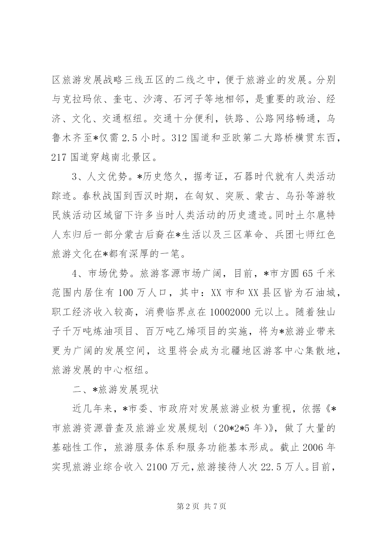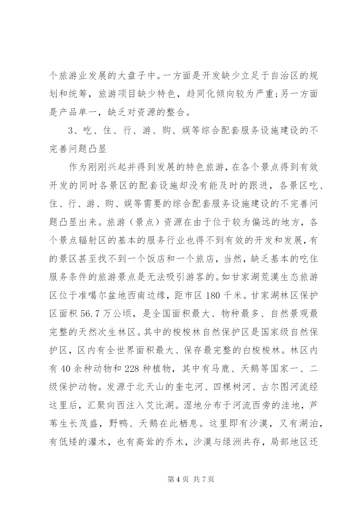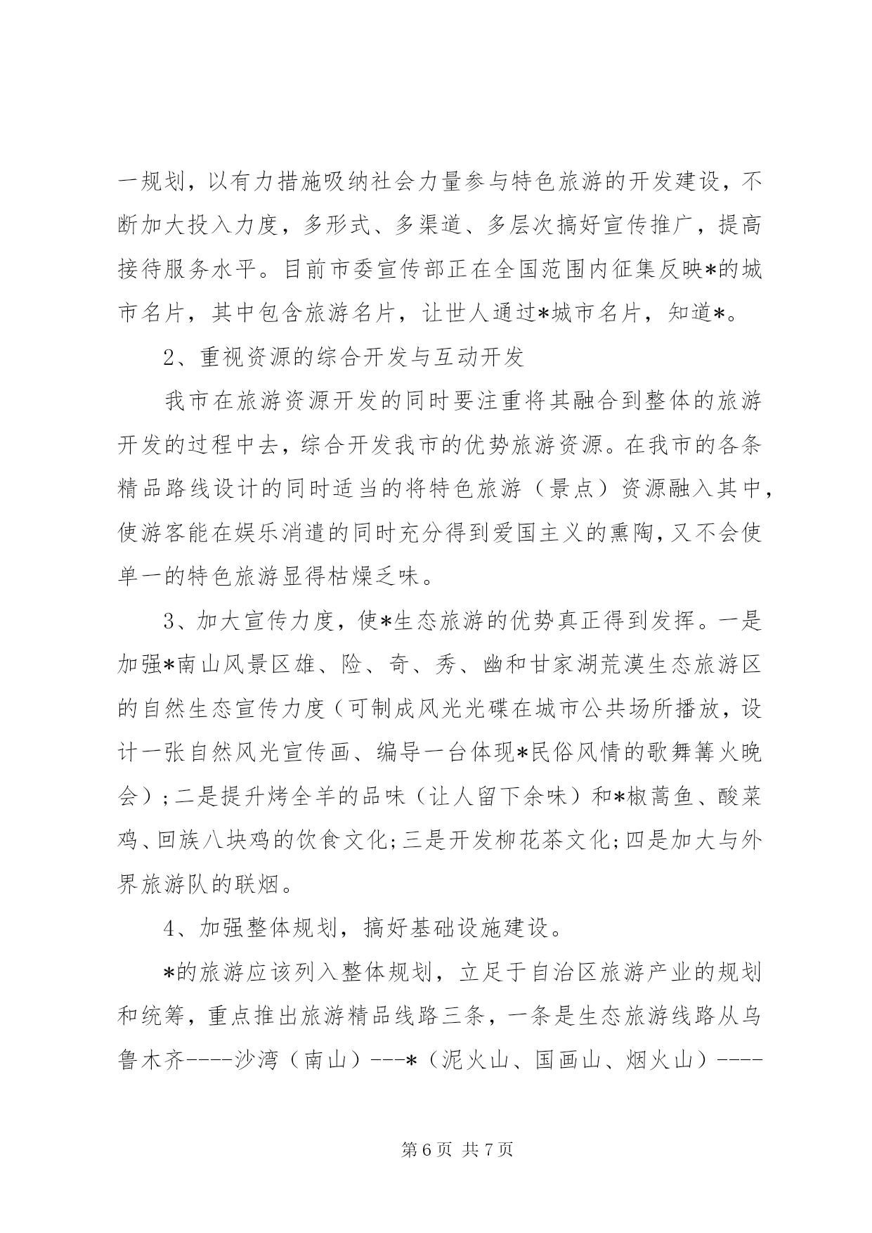 第PAGE\*Arabic\*MERGEFORMAT7页共NUMPAGES\*MERGEFORMAT7页关于旅游的调研报告关于旅游的调研报告篇1旅游业是产业关联度高,就业安置空间大,资源消耗少的劳动密集型产业,有着广阔的发展前景和巨大的市场潜力,在国民经济发展中具有十分重要的地位。目前,我国人民生活总体上已达到小康水平,经济结构发生巨大变化,扩大消费对于保持经济又快又好发展具有重要的促进作用。随着旅游消费比重的不断提高,旅游业正在成为国民经济新的增长点。一、*市旅游资源开发优势1、资源优势。*地处天山北坡,准噶尔盆地的西南缘,地形复杂,地貌类型多样,旅游资源十分丰富,类型齐全,品味独特,组合良好。按国家《旅游资源分类、调查与评估》标准,我市旅游资源共分为7大类,82个景点。特别是从南部山地冰川到北部沙漠中心的甘家湖梭梭林荒漠生态旅游区旅游线,是一条优美的垂直自然带,有一系列别具特色的旅游景点:有罕见的地质遗迹泥火山群;世界上面积最大、保存最完整的白梭梭林保护区甘家湖国家级梭梭林自然保护区;被称为新疆布达拉宫的夏尔苏木喇嘛庙遗址;具有原始风貌的自然景观乌兰萨德克湖泊;最自然的美容、祛病、健身资源*温泉、热气泉;最美的天山风光巴音沟景区、待甫僧景区等。2、地缘优势。旅游区位良好,*市是天山北坡经济带上的一个核心城市,位于奎屯、克拉玛依、金三角之西一角。位居自治区旅游发展战略三线五区的二线之中,便于旅游业的发展。分别与克拉玛依、奎屯、沙湾、石河子等地相邻,是重要的政治、经济、文化、交通枢纽。交通十分便利,铁路、公路网络畅通,乌鲁木齐至*仅需2.5小时。312国道和亚欧第二大路桥横贯东西,217国道穿越南北景区。3、人文优势。*历史悠久,据考证,石器时代就有人类活动踪迹。春秋战国到西汉时期,在匈奴、突厥、蒙古、乌孙等游牧民族活动区域留下许多当时人类活动的历史遗迹。同时土尔扈特人东归后一部分蒙古后裔在*生活以及三区革命、兵团七师红色旅游文化在*都有深厚的一笔。4、市场优势。旅游客源市场广阔,目前,*市方圆65千米范围内居住有100万人口,其中:XX市和XX县区皆为石油城,职工经济收入较高,消费临界点在10002000元以上。随着独山子千万吨炼油项目、百万吨乙烯项目的实施,将为*旅游业带来更为广阔的发展空间,这里将会成为北疆地区游客中心集散地,旅游发展的中心枢纽。二、*旅游发展现状近几年来,*市委、市政府对发展旅游业极为重视,依据《*市旅游资源普查及旅游业发展规划(20*2*5年)》,做了大量的基础性工作,旅游服务体系和服务功能基本形成。截止2006年实现旅游业综合收入2100万元,旅游接待人次22.5万人。目前,*市有2家二星级宾馆,l家旅行社,7个初具接待能力的旅游景区,56家旅游经营户。相对于*的丰富旅游资源,旅游业的发展存在一些现实的亟待改进的方面。1、低层次开发普遍,内涵品味有待提高目前许多景区对旅游资源的开发主要还是以原生态为主,旅游以参观游览为主,参与性项目开发较少,旅游开发缺乏深度,大多以展示形式为主,展示内容单调、僵硬,缺少对游客的吸引力,不能发挥旅游资源的功能,更不能推动旅游经济的发展,因此深入挖掘*旅游核心价值,凸显草原文化主题已成为打造草原文化产品工程的首要问题。一些旅游区知名度低、可游性差、模式雷同等。现有已开发的旅游项目基本上还是粗放型的开发,缺少影响力和震撼力。如*南山森林公园,是由森林、草原、河流、峡谷组成的一片美丽而富饶的宝地。这里原始森林与高山平原汇于一体,使游人能观能触能联想能感悟。奇险、旷秀、清爽、宁静的自然景观让游人触景生情,达到欲仙欲醉的境界。森林公园主要景点包括巴音沟、待甫僧及尚待开发的乌兰萨德克淖尔湖三个风景区。但三个景点知名度低,模式雷同,游客活动参与性低,偏重温故却不知新,缺乏新奇感受。2、开发缺乏整体性观念我市的旅游发展过程中,依然处于自发的点状发展,没有把自己置身于自治区旅游发展的大局之下,没有把特色旅游置于整个旅游业发展的大盘子中。一方面是开发缺少立足于自治区的规划和统筹,旅游项目缺少特色,趋同化倾向较为严重;另一方面是产品单一,缺乏对资源的整合。3、吃、住、行、游、购、娱等综合配套服务设施建设的不完善问题凸显作为刚刚兴起并得到发展的特色旅游,在各个景点得到有效开发的同时各景区的配套设施却没有能及时的跟进,各景区吃、住、行、游、购、娱等需要的综合配套服务设施建设的不完善问题凸显出来。旅游(景点)资源在由于位于较为偏远的地方,各个景点辐射区的基本的服务行业也得不到有效的开发和发展,有的景区甚至找不到一个饭店和一个旅店,当然,缺乏基本的吃住服务条件的旅游景点是无法吸引游客的。如甘家湖荒漠生态旅游区位于准噶尔盆地西南边缘,距市区180千米。甘家湖林区保护区面积5
