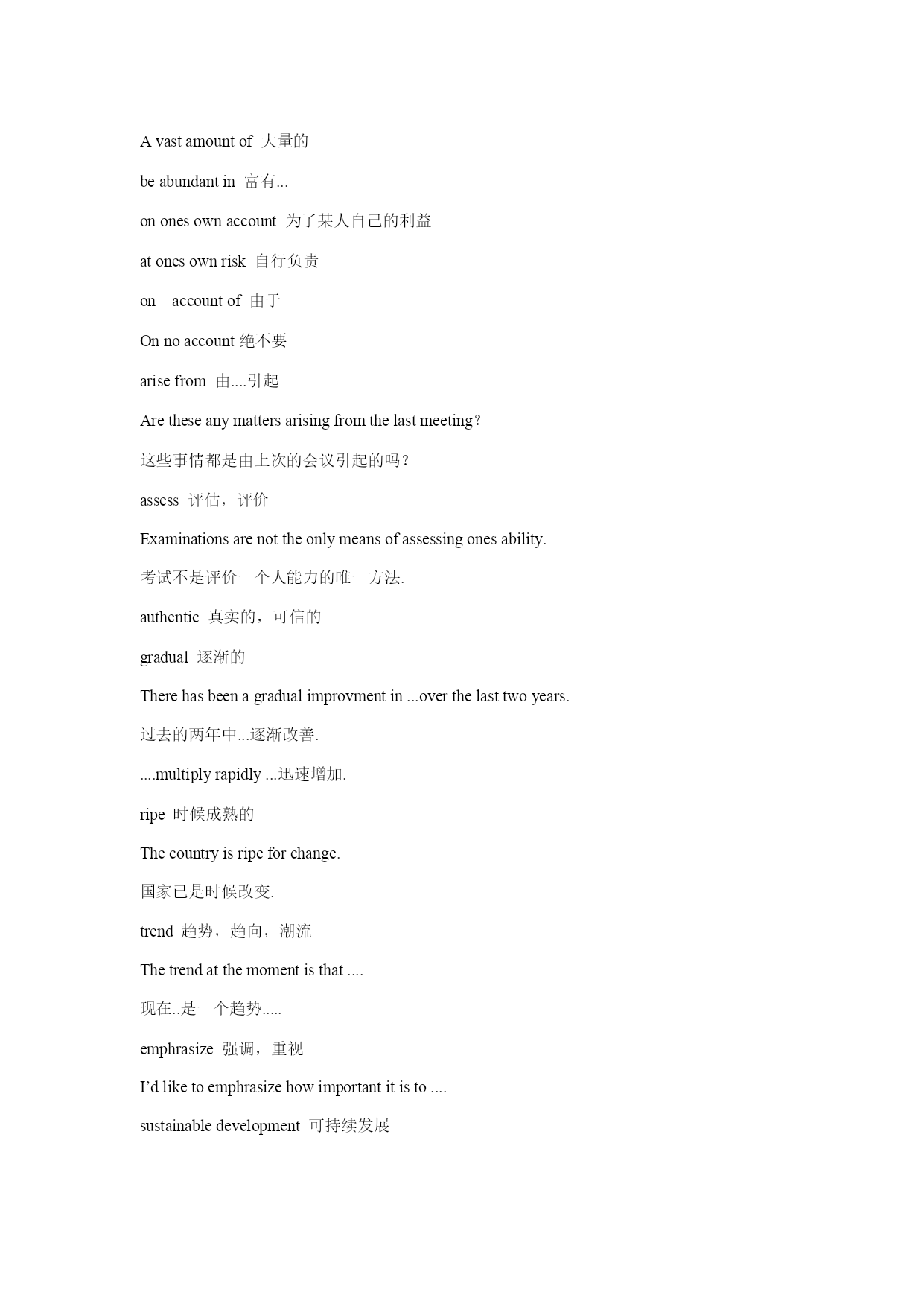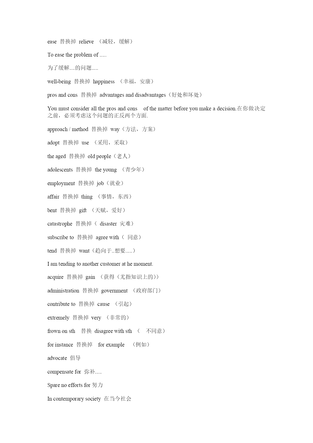 ①词汇篇单词可以说一个人单词量的展现,如果总停留在使用verygood等小学词汇,那老师把你当成发育不完全也正常.所以要使用一些高级词汇(就象是给文章穿上了成人内衣),我不建议大家用考纲以外的词汇(当然你能用更好),夏哥可以教你用高级替换简单词汇~~优缺点:Meritdemerit,advantagesdisadvantages,drawbackssuperiority形容词并列:importantandinevitableconsiderableandobviousConversely替换掉howeverImpact替换掉influenceNotmerelybuteven替换掉notonlybutalsoSomebodyassert替换掉someoneinsist/thought/holdssevere替换掉serious(严重的)aseverewatershortage严重缺水needy替换掉poor(贫穷的)wealthy替换掉rich(富裕的)beneficial替换掉good(有益的)undesirable替换掉bad(不好的,不受欢迎的)nevertheless替换掉however(然而,不过)fundamental/significant替换掉important(重要的)relevant替换掉related(有关的)....ishighlyrelevantto.......extraordinary替换掉surprising(惊人的,非凡的)provided/providing(that)替换掉if(如果.....)promote/strengthen替换掉improve(提高,加强)Moreshouldbedonetostrengthenindustry'slinkswithuniversities.应该做更多的事情加强工业界和大学的联系.copewith替换掉solve(解决)motivate替换掉encourage(激励)Wearelookingforsomeonewhowillbeabletomotivatethestafftoworkhard.我们在寻找能激励职员们努力工作的人.jeopardize替换掉bebadto(损害,危及)Failingexamscouldjeopardizeherfuture.考试不及格危及她的前程.ease替换掉relieve(减轻,缓解)Toeasetheproblemof.....为了缓解....的问题.....well-being替换掉happiness(幸福,安康)prosandcons替换掉advantagesanddisadvantages(好处和坏处)Youmustconsideralltheprosandconsofthematterbeforeyoumakeadecision.在你做决定之前,必须考虑这个问题的正反两个方面.approach/method替换掉way(方法,方案)adopt替换掉use(采用,采取)theaged替换掉oldpeople(老人)adolescents替换掉theyoung(青少年)employment替换掉job(就业)affair替换掉thing(事情,东西)bent替换掉gift(天赋,爱好)catastrophe替换掉(disaster灾难)subscribeto替换掉agreewith(同意)tend替换掉want(趋向于..想要.....)Iamtendingtoanothercustomerathemoment.acquire替换掉gain(获得(尤指知识上的))administration替换掉government(政府部门)contributeto替换掉cause(引起)extremely替换掉very(非常的)frownonsth替换disagreewithsth(不同意)forinstance替换掉forexample(例如)advocate倡导compensatefor弥补.....Sparenoeffortsfor努力Incontemporarysociety在当今社会Avastamountof大量的beabundantin富有...ononesownaccount为了某人自己的利益atonesownrisk自行负责onaccountof由于Onnoaccount绝不要arisefrom由....引起Aretheseanymattersarisingfromthelas