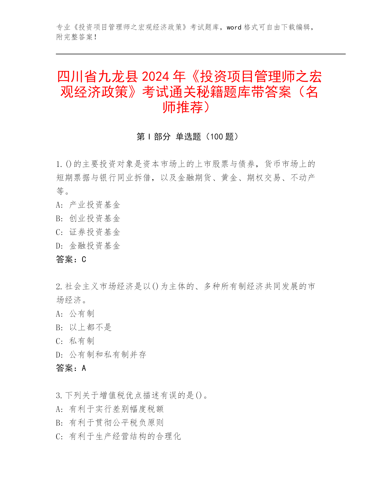 四川省九龙县2024年《投资项目管理师之宏观经济政策》考试通关秘籍题库带答案(名师推荐)