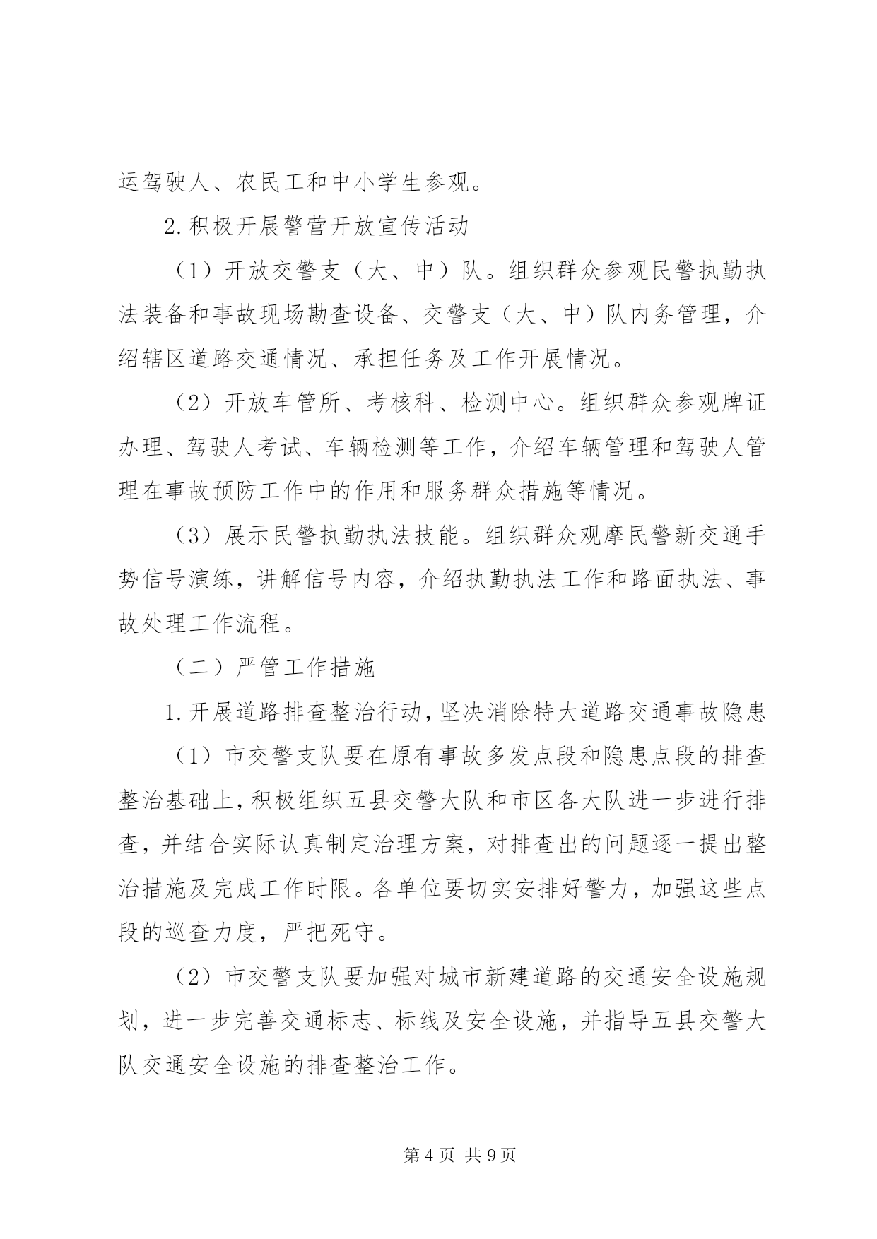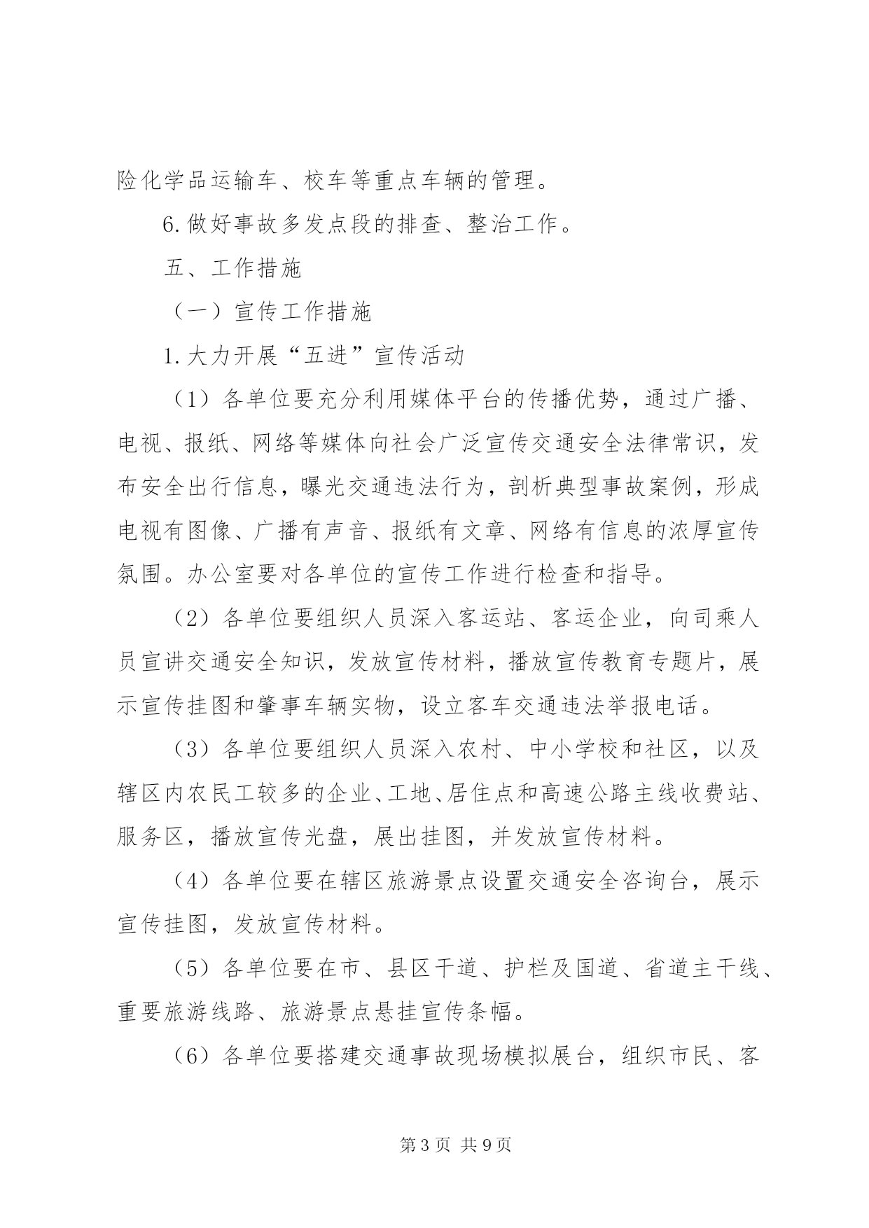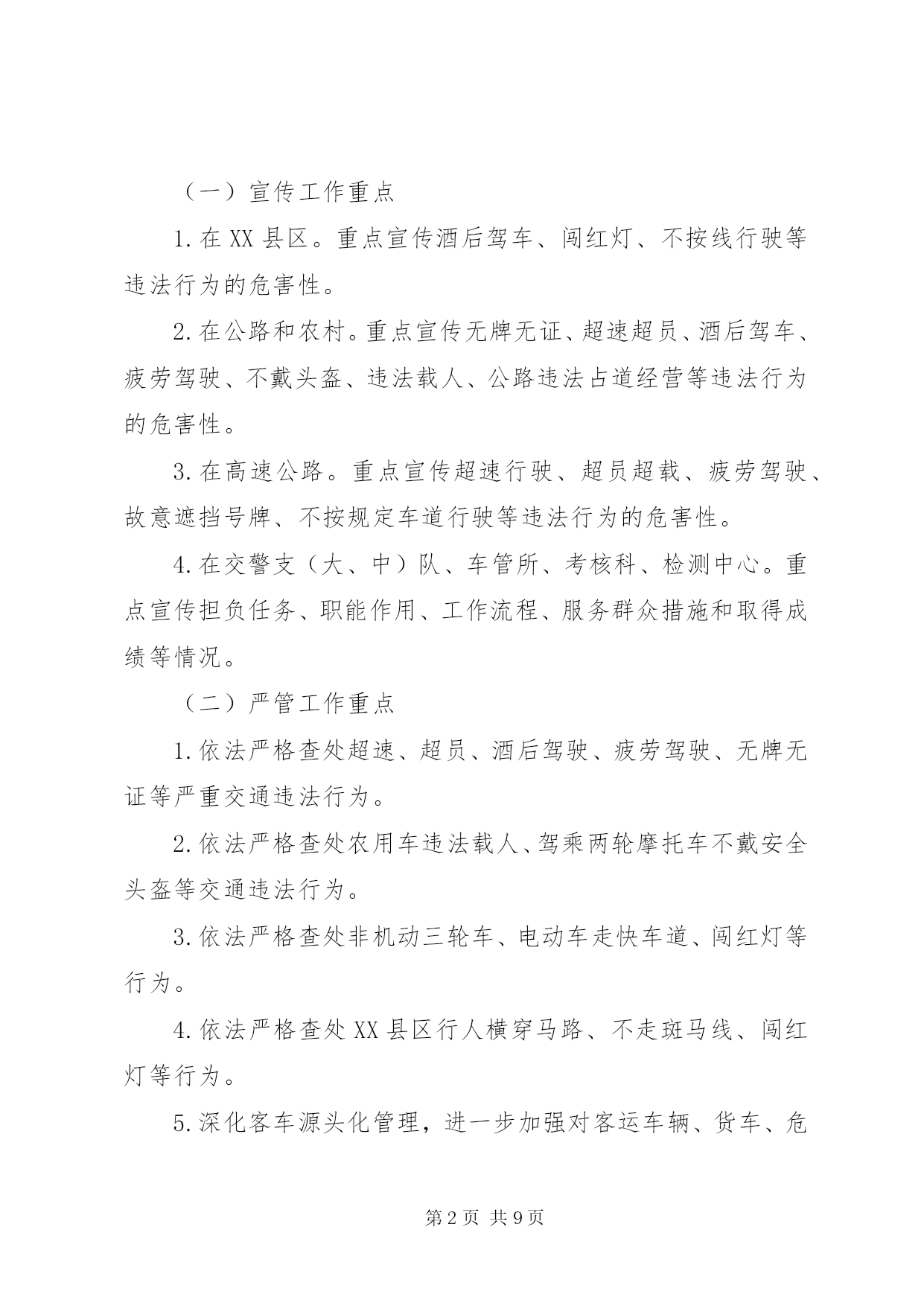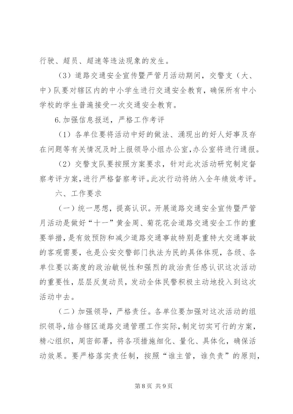 第PAGE\*Arabic\*MERGEFORMAT9页共NUMPAGES\*MERGEFORMAT9页道路交通严管月指导方案为认真落实公安部、省委、省政府指示精神,结合我市实际,决定在全市开展为期一个月的道路交通安全宣传暨严管月活动,现制定实施方案如下:一、工作目标通过开展道路交通安全宣传暨严管月活动,使道路交通安全理念深入人心,在全社会形成“人人关注交通安全,时时处处遵章守法”的良好氛围,有效预防和减少道路交通事故特别是重特大交通事故的发生,实现“降事故、保安全、保畅通”的工作目标,为“十一”黄金周、菊花花会创造和谐畅通的道路交通环境。二、组织领导为加强对全市道路交通安全宣传暨严管月活动的组织领导,市政府成立以副市长为组长,市政府副秘书长为副组长,交通安全委员会成员和各县区主管县区长为成员的领导小组,领导小组下设办公室,办公室设在市交警支队,交警支队支队长兼办公室主任,具体负责活动的组织实施。各县区也要成立相应组织,切实加强领导,各级交通安全委员会成员单位及各相关部门要共同参与,密切配合,组织开展活动。三、时间安排2011年9月24日至10月24日四、工作重点(一)宣传工作重点1.在XX县区。重点宣传酒后驾车、闯红灯、不按线行驶等违法行为的危害性。2.在公路和农村。重点宣传无牌无证、超速超员、酒后驾车、疲劳驾驶、不戴头盔、违法载人、公路违法占道经营等违法行为的危害性。3.在高速公路。重点宣传超速行驶、超员超载、疲劳驾驶、故意遮挡号牌、不按规定车道行驶等违法行为的危害性。4.在交警支(大、中)队、车管所、考核科、检测中心。重点宣传担负任务、职能作用、工作流程、服务群众措施和取得成绩等情况。(二)严管工作重点1.依法严格查处超速、超员、酒后驾驶、疲劳驾驶、无牌无证等严重交通违法行为。2.依法严格查处农用车违法载人、驾乘两轮摩托车不戴安全头盔等交通违法行为。3.依法严格查处非机动三轮车、电动车走快车道、闯红灯等行为。4.依法严格查处XX县区行人横穿马路、不走斑马线、闯红灯等行为。5.深化客车源头化管理,进一步加强对客运车辆、货车、危险化学品运输车、校车等重点车辆的管理。6.做好事故多发点段的排查、整治工作。五、工作措施(一)宣传工作措施1.大力开展“五进”宣传活动(1)各单位要充分利用媒体平台的传播优势,通过广播、电视、报纸、网络等媒体向社会广泛宣传交通安全法律常识,发布安全出行信息,曝光交通违法行为,剖析典型事故案例,形成电视有图像、广播有声音、报纸有文章、网络有信息的浓厚宣传氛围。办公室要对各单位的宣传工作进行检查和指导。(2)各单位要组织人员深入客运站、客运企业,向司乘人员宣讲交通安全知识,发放宣传材料,播放宣传教育专题片,展示宣传挂图和肇事车辆实物,设立客车交通违法举报电话。(3)各单位要组织人员深入农村、中小学校和社区,以及辖区内农民工较多的企业、工地、居住点和高速公路主线收费站、服务区,播放宣传光盘,展出挂图,并发放宣传材料。(4)各单位要在辖区旅游景点设置交通安全咨询台,展示宣传挂图,发放宣传材料。(5)各单位要在市、县区干道、护栏及国道、省道主干线、重要旅游线路、旅游景点悬挂宣传条幅。(6)各单位要搭建交通事故现场模拟展台,组织市民、客运驾驶人、农民工和中小学生参观。2.积极开展警营开放宣传活动(1)开放交警支(大、中)队。组织群众参观民警执勤执法装备和事故现场勘查设备、交警支(大、中)队内务管理,介绍辖区道路交通情况、承担任务及工作开展情况。(2)开放车管所、考核科、检测中心。组织群众参观牌证办理、驾驶人考试、车辆检测等工作,介绍车辆管理和驾驶人管理在事故预防工作中的作用和服务群众措施等情况。(3)展示民警执勤执法技能。组织群众观摩民警新交通手势信号演练,讲解信号内容,介绍执勤执法工作和路面执法、事故处理工作流程。(二)严管工作措施1.开展道路排查整治行动,坚决消除特大道路交通事故隐患(1)市交警支队要在原有事故多发点段和隐患点段的排查整治基础上,积极组织五县交警大队和市区各大队进一步进行排查,并结合实际认真制定治理方案,对排查出的问题逐一提出整治措施及完成工作时限。各单位要切实安排好警力,加强这些点段的巡查力度,严把死守。(2)市交警支队要加强对城市新建道路的交通安全设施规划,进一步完善交通标志、标线及安全设施,并指导五县交警大队交通安全设施的排查整治工作。(3)高速支队要加强对高速公路的排查整治,积极会同高速公路建设部门,认真排查整治高速公路引线存在的问题,消除隐患。(4)五县公安交警部门根据各自的实际,开展本地的排查整治活动。2.加大对农用车违法载人的治理力度,坚决遏制因农用车违法载人引发的特大道路事故(1)各单位要积极开展村口、路口和路面巡查行动。在农用车辆经常出入的村口、路口