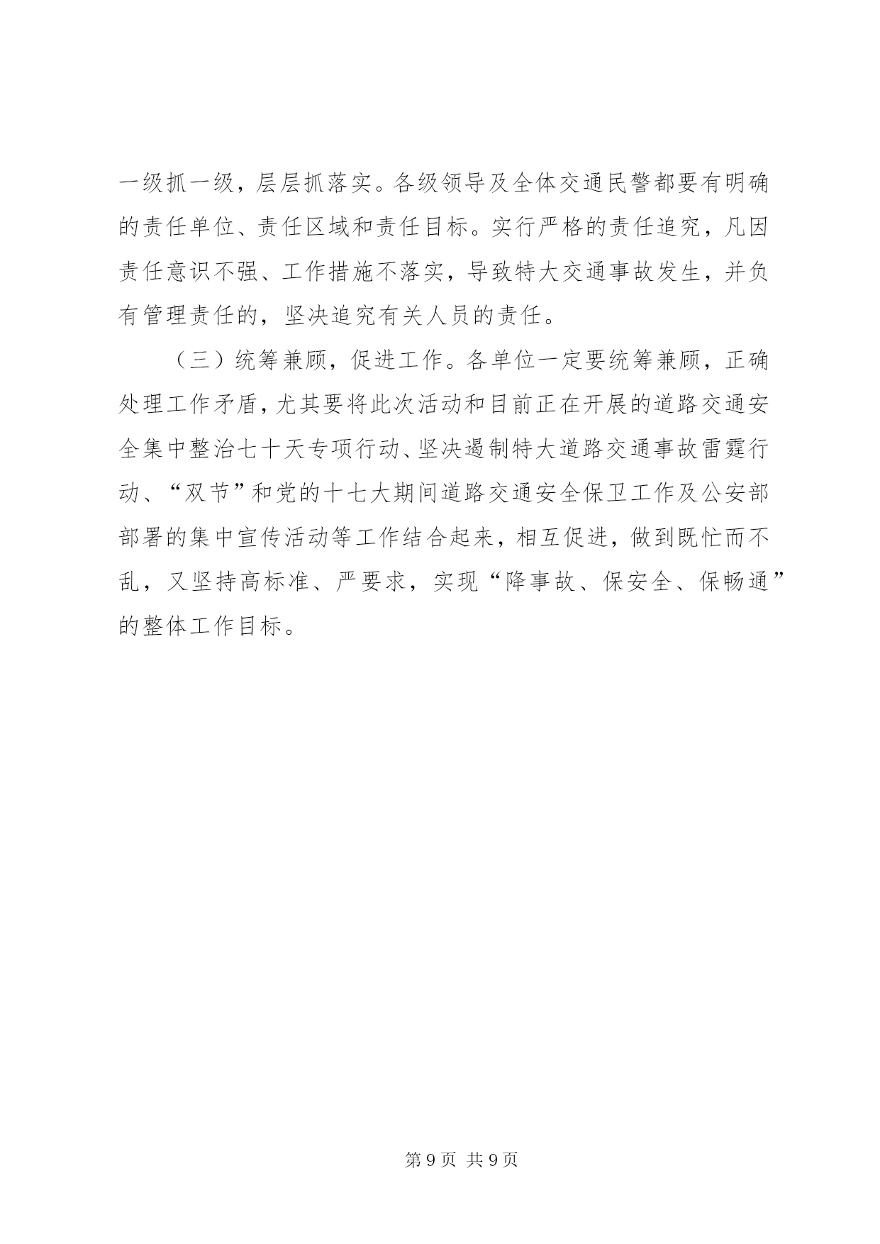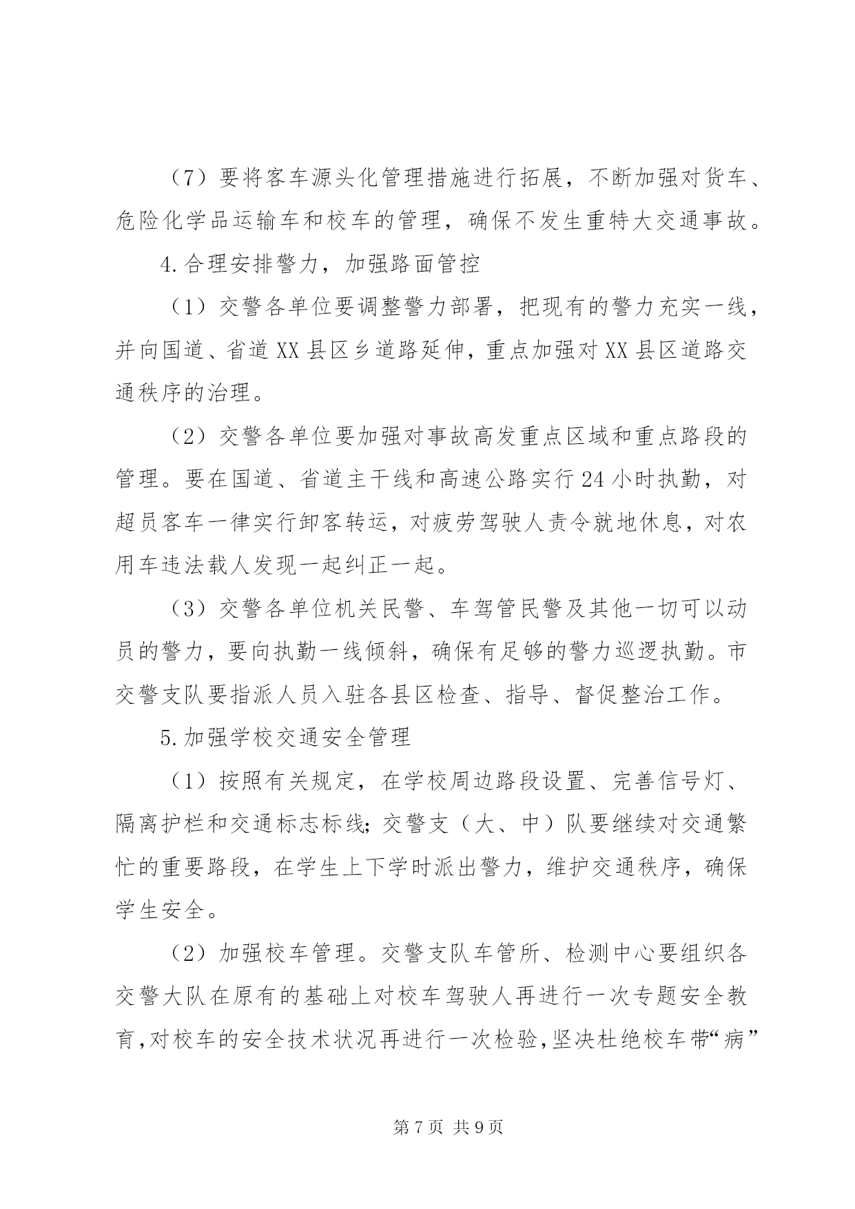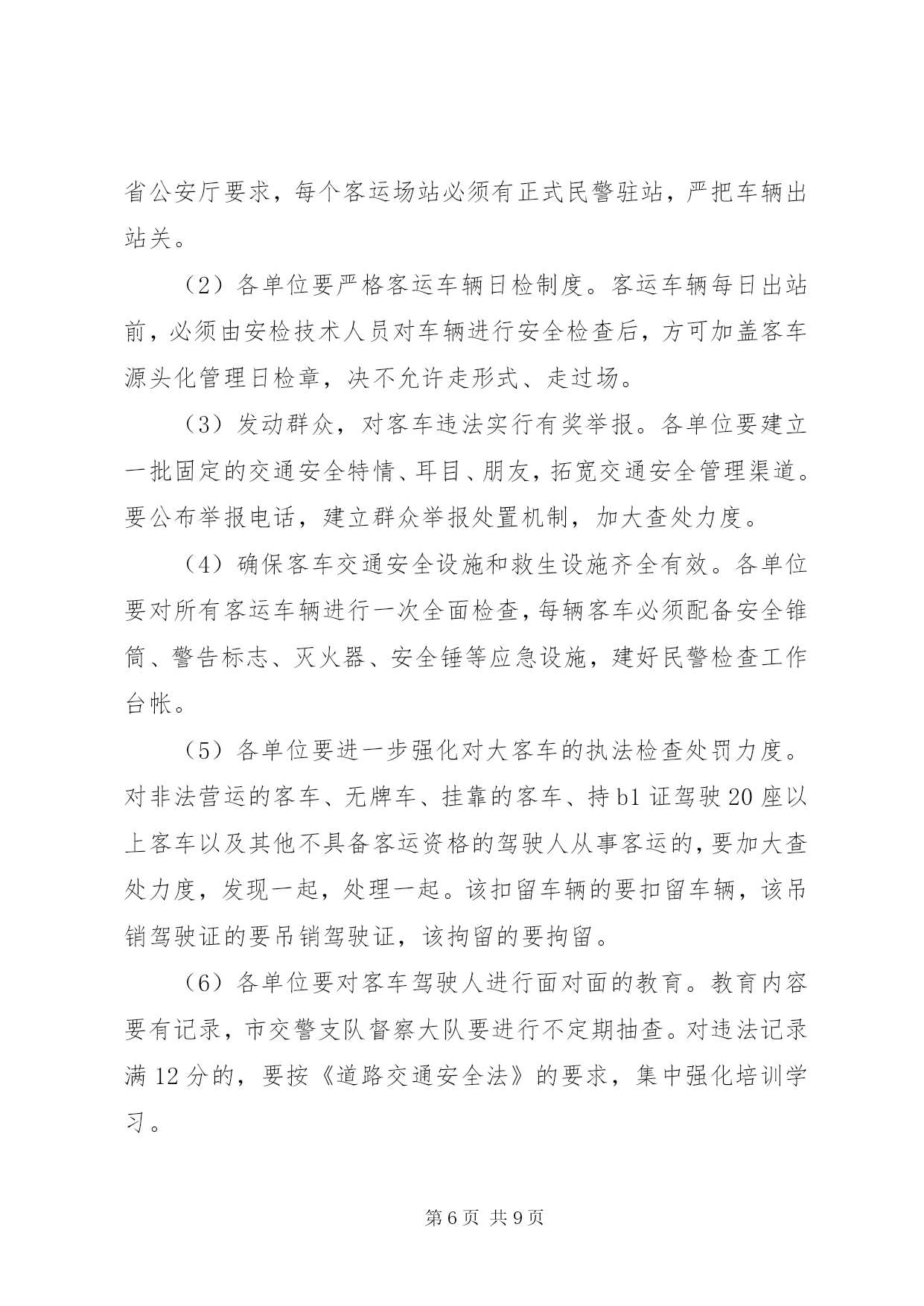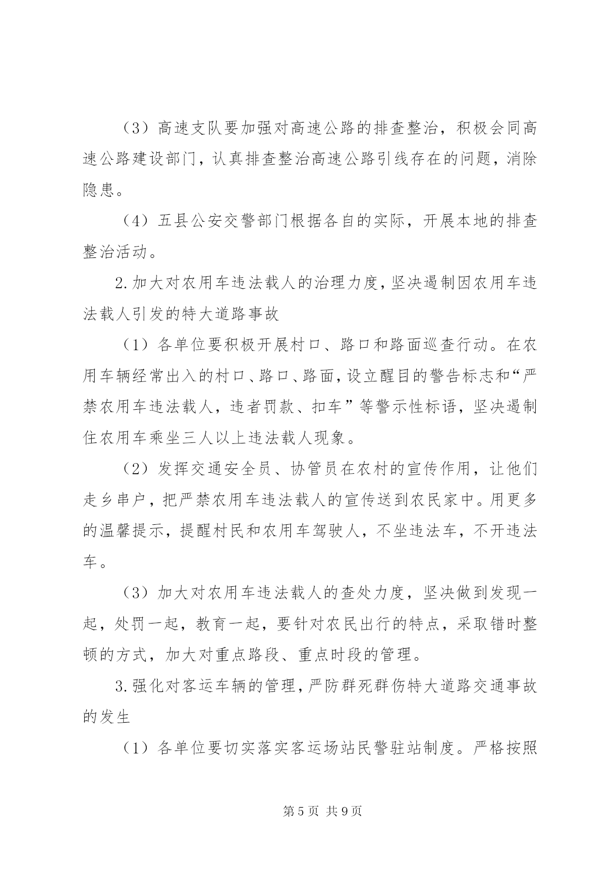 第PAGE\*Arabic\*MERGEFORMAT9页共NUMPAGES\*MERGEFORMAT9页道路交通严管月指导方案为认真落实公安部、省委、省政府指示精神,结合我市实际,决定在全市开展为期一个月的道路交通安全宣传暨严管月活动,现制定实施方案如下:一、工作目标通过开展道路交通安全宣传暨严管月活动,使道路交通安全理念深入人心,在全社会形成“人人关注交通安全,时时处处遵章守法”的良好氛围,有效预防和减少道路交通事故特别是重特大交通事故的发生,实现“降事故、保安全、保畅通”的工作目标,为“十一”黄金周、菊花花会创造和谐畅通的道路交通环境。二、组织领导为加强对全市道路交通安全宣传暨严管月活动的组织领导,市政府成立以副市长为组长,市政府副秘书长为副组长,交通安全委员会成员和各县区主管县区长为成员的领导小组,领导小组下设办公室,办公室设在市交警支队,交警支队支队长兼办公室主任,具体负责活动的组织实施。各县区也要成立相应组织,切实加强领导,各级交通安全委员会成员单位及各相关部门要共同参与,密切配合,组织开展活动。三、时间安排2011年9月24日至10月24日四、工作重点(一)宣传工作重点1.在XX县区。重点宣传酒后驾车、闯红灯、不按线行驶等违法行为的危害性。2.在公路和农村。重点宣传无牌无证、超速超员、酒后驾车、疲劳驾驶、不戴头盔、违法载人、公路违法占道经营等违法行为的危害性。3.在高速公路。重点宣传超速行驶、超员超载、疲劳驾驶、故意遮挡号牌、不按规定车道行驶等违法行为的危害性。4.在交警支(大、中)队、车管所、考核科、检测中心。重点宣传担负任务、职能作用、工作流程、服务群众措施和取得成绩等情况。(二)严管工作重点1.依法严格查处超速、超员、酒后驾驶、疲劳驾驶、无牌无证等严重交通违法行为。2.依法严格查处农用车违法载人、驾乘两轮摩托车不戴安全头盔等交通违法行为。3.依法严格查处非机动三轮车、电动车走快车道、闯红灯等行为。4.依法严格查处XX县区行人横穿马路、不走斑马线、闯红灯等行为。5.深化客车源头化管理,进一步加强对客运车辆、货车、危险化学品运输车、校车等重点车辆的管理。6.做好事故多发点段的排查、整治工作。五、工作措施(一)宣传工作措施1.大力开展“五进”宣传活动(1)各单位要充分利用媒体平台的传播优势,通过广播、电视、报纸、网络等媒体向社会广泛宣传交通安全法律常识,发布安全出行信息,曝光交通违法行为,剖析典型事故案例,形成电视有图像、广播有声音、报纸有文章、网络有信息的浓厚宣传氛围。办公室要对各单位的宣传工作进行检查和指导。(2)各单位要组织人员深入客运站、客运企业,向司乘人员宣讲交通安全知识,发放宣传材料,播放宣传教育专题片,展示宣传挂图和肇事车辆实物,设立客车交通违法举报电话。(3)各单位要组织人员深入农村、中小学校和社区,以及辖区内农民工较多的企业、工地、居住点和高速公路主线收费站、服务区,播放宣传光盘,展出挂图,并发放宣传材料。(4)各单位要在辖区旅游景点设置交通安全咨询台,展示宣传挂图,发放宣传材料。(5)各单位要在市、县区干道、护栏及国道、省道主干线、重要旅游线路、旅游景点悬挂宣传条幅。(6)各单位要搭建交通事故现场模拟展台,组织市民、客运驾驶人、农民工和中小学生参观。2.积极开展警营开放宣传活动(1)开放交警支(大、中)队。组织群众参观民警执勤执法装备和事故现场勘查设备、交警支(大、中)队内务管理,介绍辖区道路交通情况、承担任务及工作开展情况。(2)开放车管所、考核科、检测中心。组织群众参观牌证办理、驾驶人考试、车辆检测等工作,介绍车辆管理和驾驶人管理在事故预防工作中的作用和服务群众措施等情况。(3)展示民警执勤执法技能。组织群众观摩民警新交通手势信号演练,讲解信号内容,介绍执勤执法工作和路面执法、事故处理工作流程。(二)严管工作措施1.开展道路排查整治行动,坚决消除特大道路交通事故隐患(1)市交警支队要在原有事故多发点段和隐患点段的排查整治基础上,积极组织五县交警大队和市区各大队进一步进行排查,并结合实际认真制定治理方案,对排查出的问题逐一提出整治措施及完成工作时限。各单位要切实安排好警力,加强这些点段的巡查力度,严把死守。(2)市交警支队要加强对城市新建道路的交通安全设施规划,进一步完善交通标志、标线及安全设施,并指导五县交警大队交通安全设施的排查整治工作。(3)高速支队要加强对高速公路的排查整治,积极会同高速公路建设部门,认真排查整治高速公路引线存在的问题,消除隐患。(4)五县公安交警部门根据各自的实际,开展本地的排查整治活动。2.加大对农用车违法载人的治理力度,坚决遏制因农用车违法载人引发的特大道路事故(1)各单位要积极开展村口、路口和路面巡查行动。在农用车辆经常出入的村口、路口