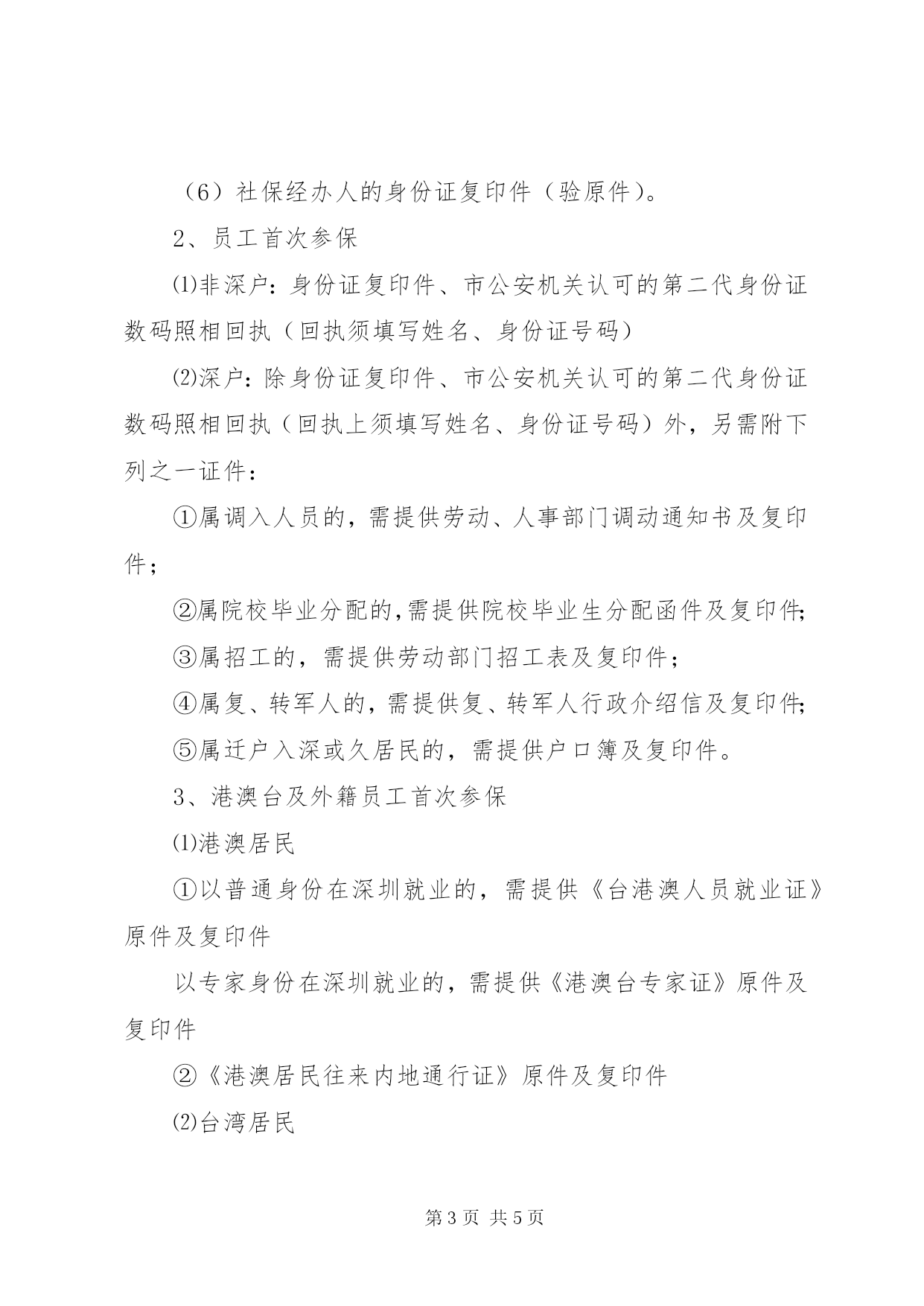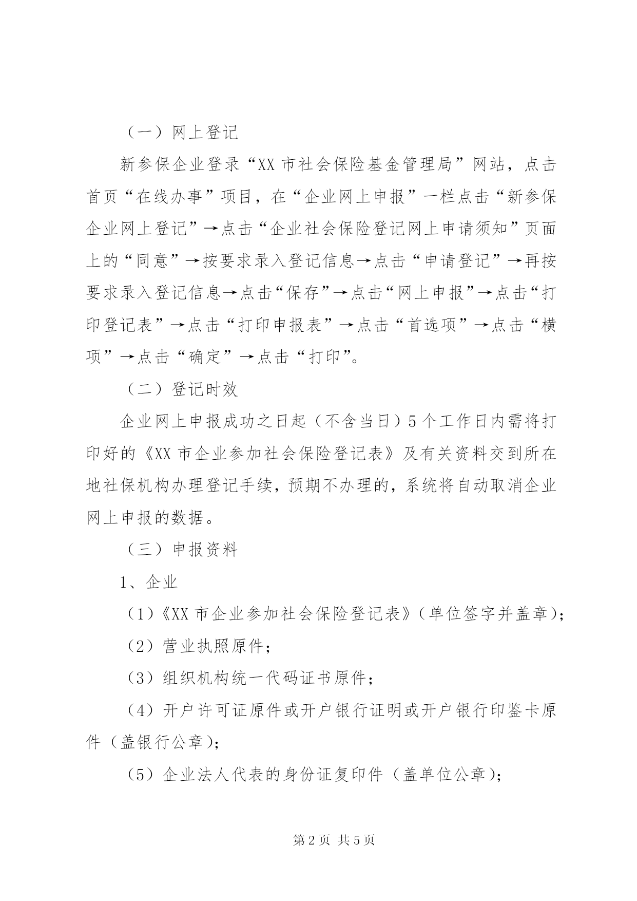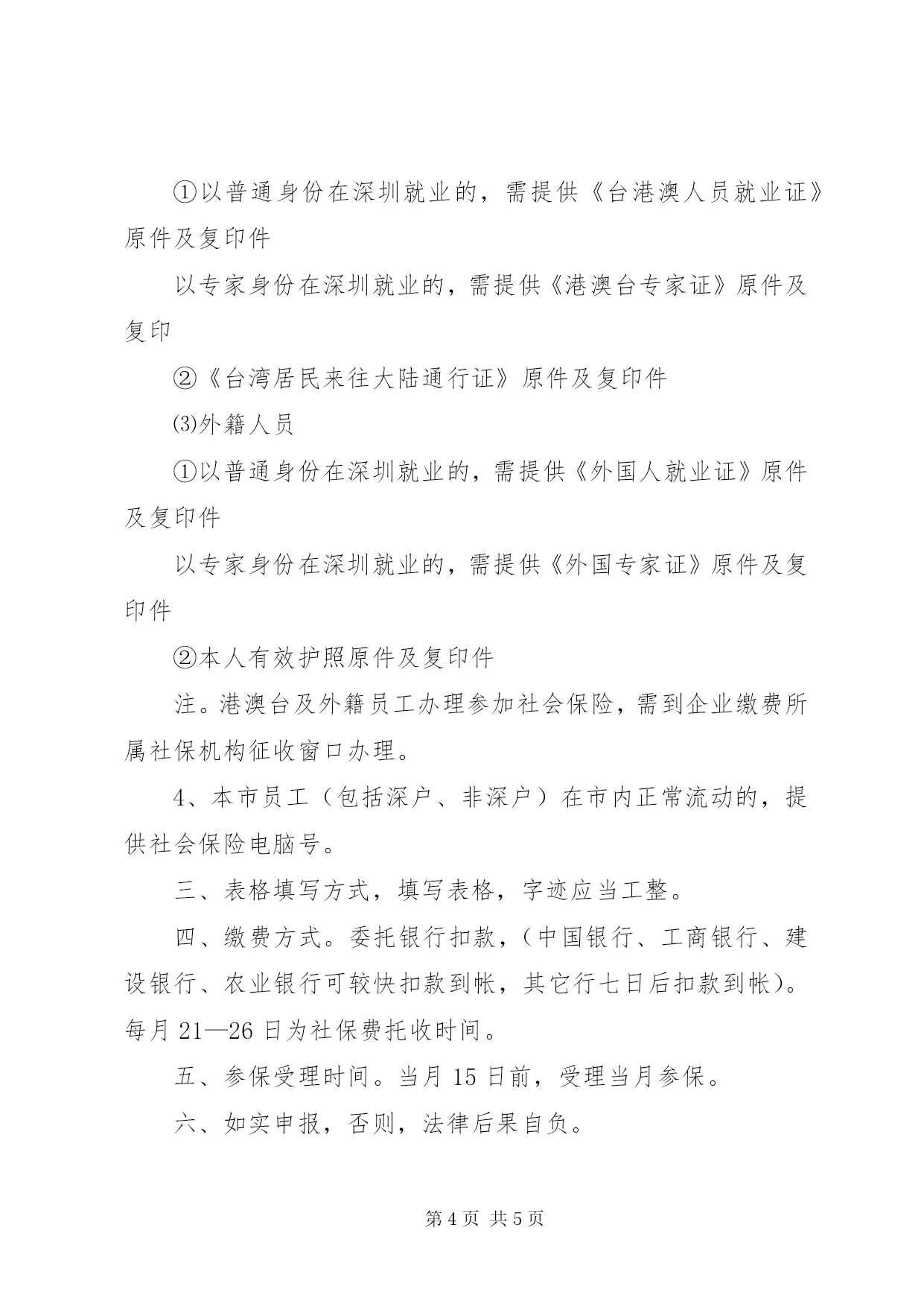 第PAGE\*Arabic\*MERGEFORMAT5页共NUMPAGES\*MERGEFORMAT5页XX市社会保险条例XX市企业参加社会保险须知一、参保险种:(一)企业应参保险种。养老、医疗、工伤、失业、生育医疗保险。(二)员工应参保险种:1、深户。养老保险、综合医疗保险、工伤保险、失业保险、生育医疗保险等,固定工、合同工可参加住房积金。2、非深户的城镇户籍在职人员。养老保险、住院医疗保险、工伤保险、失业保险、生育医疗保险。鼓励用人单位为非深户的城镇户籍员工参加综合医疗保险。3、非深户的农村户籍在职人员。养老保险、农民工医疗保险、工伤保险、失业保险。鼓励用人单位为非深户的农村户籍员工参加综合医疗保险或住院医疗保险。农民工医疗保险适用于与本市企业建立劳动关系的农民工。生育医疗保险适用于参加综合医疗保险和住院医疗保险未达法定退休年龄的人员。用人单位可选择参加医疗保险的形式,但不得在选择参保后12个月内变更形式。员工参保只能选择一地参保,不能同时两地参保,如一地已参保,应当出示当地社保部门证明。二、办理社保登记程序(一)网上登记新参保企业登录“XX市社会保险基金管理局”网站,点击首页“在线办事”项目,在“企业网上申报”一栏点击“新参保企业网上登记”→点击“企业社会保险登记网上申请须知”页面上的“同意”→按要求录入登记信息→点击“申请登记”→再按要求录入登记信息→点击“保存”→点击“网上申报”→点击“打印登记表”→点击“打印申报表”→点击“首选项”→点击“横项”→点击“确定”→点击“打印”。(二)登记时效企业网上申报成功之日起(不含当日)5个工作日内需将打印好的《XX市企业参加社会保险登记表》及有关资料交到所在地社保机构办理登记手续,预期不办理的,系统将自动取消企业网上申报的数据。(三)申报资料1、企业(1)《XX市企业参加社会保险登记表》(单位签字并盖章);(2)营业执照原件;(3)组织机构统一代码证书原件;(4)开户许可证原件或开户银行证明或开户银行印鉴卡原件(盖银行公章);(5)企业法人代表的身份证复印件(盖单位公章);(6)社保经办人的身份证复印件(验原件)。2、员工首次参保⑴非深户:身份证复印件、市公安机关认可的第二代身份证数码照相回执(回执须填写姓名、身份证号码)⑵深户:除身份证复印件、市公安机关认可的第二代身份证数码照相回执(回执上须填写姓名、身份证号码)外,另需附下列之一证件:①属调入人员的,需提供劳动、人事部门调动通知书及复印件;②属院校毕业分配的,需提供院校毕业生分配函件及复印件;③属招工的,需提供劳动部门招工表及复印件;④属复、转军人的,需提供复、转军人行政介绍信及复印件;⑤属迁户入深或久居民的,需提供户口簿及复印件。3、港澳台及外籍员工首次参保⑴港澳居民①以普通身份在深圳就业的,需提供《台港澳人员就业证》原件及复印件以专家身份在深圳就业的,需提供《港澳台专家证》原件及复印件②《港澳居民往来内地通行证》原件及复印件⑵台湾居民①以普通身份在深圳就业的,需提供《台港澳人员就业证》原件及复印件以专家身份在深圳就业的,需提供《港澳台专家证》原件及复印②《台湾居民来往大陆通行证》原件及复印件⑶外籍人员①以普通身份在深圳就业的,需提供《外国人就业证》原件及复印件以专家身份在深圳就业的,需提供《外国专家证》原件及复印件②本人有效护照原件及复印件注。港澳台及外籍员工办理参加社会保险,需到企业缴费所属社保机构征收窗口办理。4、本市员工(包括深户、非深户)在市内正常流动的,提供社会保险电脑号。三、表格填写方式,填写表格,字迹应当工整。四、缴费方式。委托银行扣款,(中国银行、工商银行、建设银行、农业银行可较快扣款到帐,其它行七日后扣款到帐)。每月21—26日为社保费托收时间。五、参保受理时间。当月15日前,受理当月参保。六、如实申报,否则,法律后果自负。七、网址:电话查询:96888XX市社会保险基金管理局