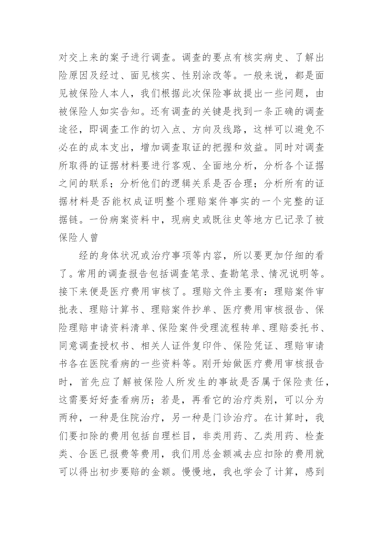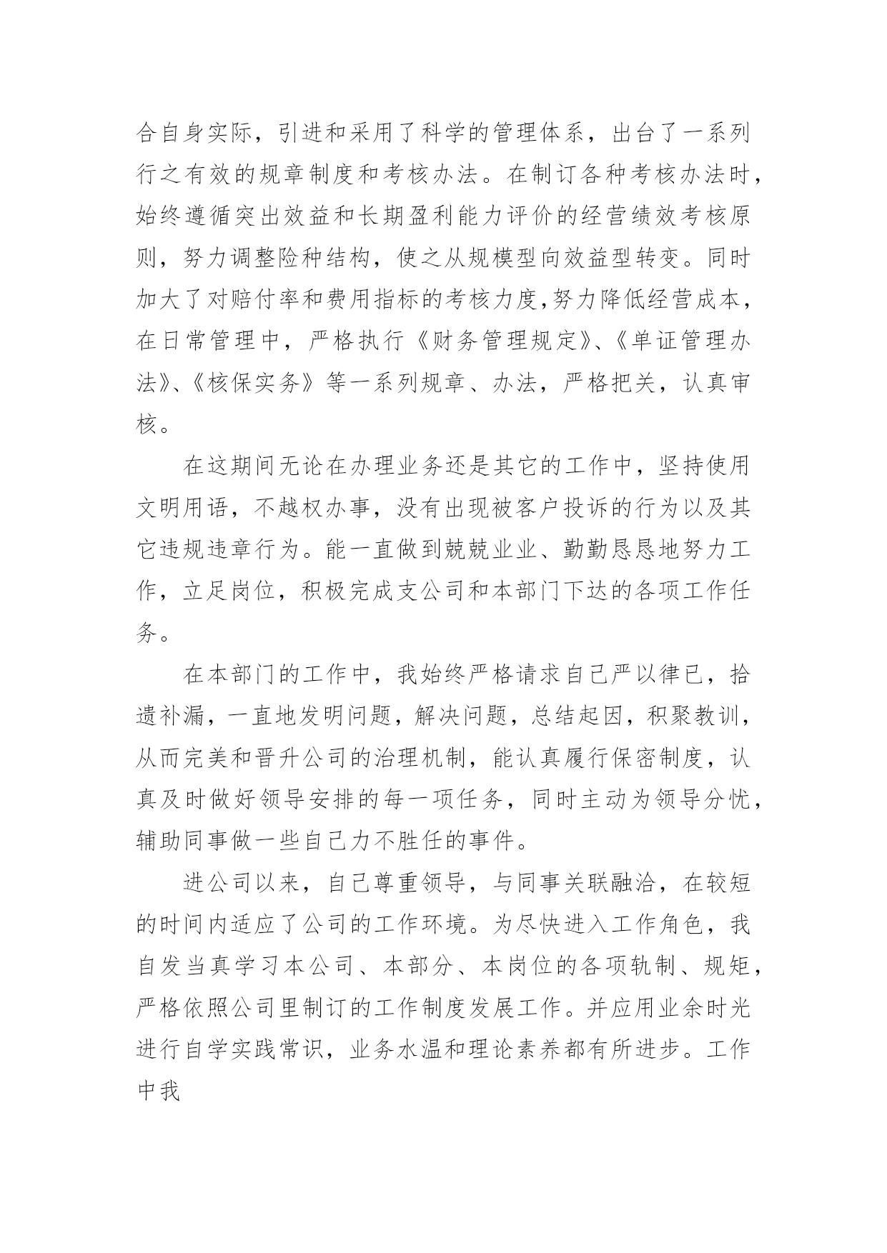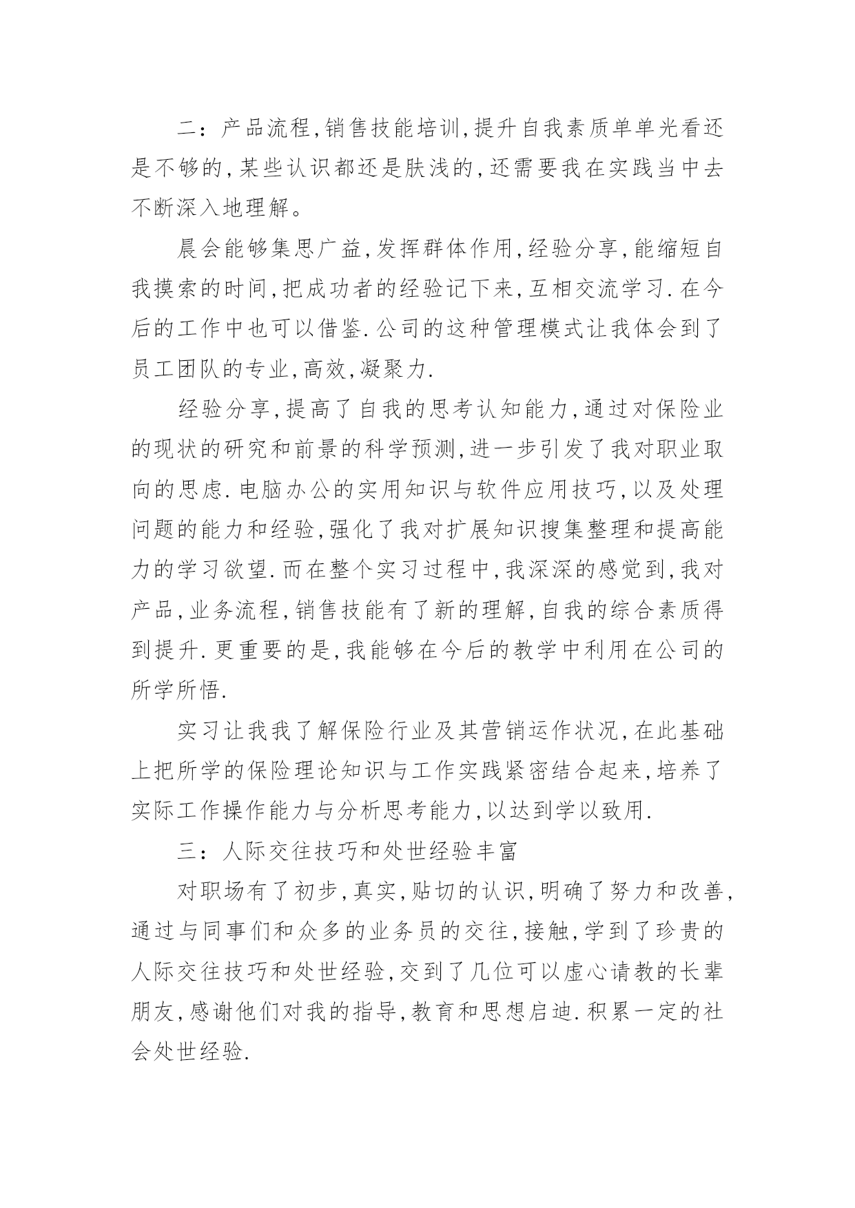 保险公司实习自我鉴定自我鉴定是一个人在某个阶段的学习和工作生活等表现的一个自我总结,自我鉴定可以总结以往思想,发扬成绩,因此好好准备一份自我鉴定吧。自我鉴定怎么写才能发挥它的作用呢?下面是小编为大家收集的保险公司实习自我鉴定,希望能够帮助到大家。保险公司实习自我鉴定1转瞬间2个月试用期已濒临序幕,首先感激公司能给我展现才干、实现本身价值的机遇。我于20xx年11月3日成为公司的试用员工,现将我的工作及学习生活情形作如下汇报。在工作期间我明白到,服务是企业的生存之本,服务质量的好坏不仅关系到公司业务的发展,还关系到公司的声誉以及未来。因此,我从未放松过对服务质量的要求和服务技能的提高。按照总公司“统一标识、统一柜面、统一形象”的要求。使客户来办理业务时感觉到更专业、更方便、更温馨,全面提升了服务质量和公司的形象。我坚持“以人为本、客户至上”的服务理念,想客户所想,急客户所急。对于出现重大事故的家庭,我们没有死板地执行规定,而是以最快的时间确定事故性质,然后第一时间将赔款送到客户家中,帮助他们渡过难关。我在做好服务的同时,严格按照上级公司有关规定,结合自身实际,引进和采用了科学的管理体系,出台了一系列行之有效的规章制度和考核办法。在制订各种考核办法时,始终遵循突出效益和长期盈利能力评价的经营绩效考核原则,努力调整险种结构,使之从规模型向效益型转变。同时加大了对赔付率和费用指标的考核力度,努力降低经营成本,在日常管理中,严格执行《财务管理规定》、《单证管理办法》、《核保实务》等一系列规章、办法,严格把关,认真审核。在这期间无论在办理业务还是其它的工作中,坚持使用文明用语,不越权办事,没有出现被客户投诉的行为以及其它违规违章行为。能一直做到兢兢业业、勤勤恳恳地努力工作,立足岗位,积极完成支公司和本部门下达的各项工作任务。在本部门的工作中,我始终严格请求自己严以律已,拾遗补漏,一直地发明问题,解决问题,总结起因,积聚教训,从而完美和晋升公司的治理机制,能认真履行保密制度,认真及时做好领导安排的每一项任务,同时主动为领导分忧,辅助同事做一些自己力不胜任的事件。进公司以来,自己尊重领导,与同事关联融洽,在较短的时间内适应了公司的工作环境。为尽快进入工作角色,我自发当真学习本公司、本部分、本岗位的各项轨制、规矩,严格依照公司里制订的工作制度发展工作。并应用业余时光进行自学实践常识,业务水温和理论素养都有所进步。工作中我始终坚持谦逊谨严、虚心求教的态度,主动向引导、共事们求教,向实践学习,把所学的知识应用于实际工作中,在实际中测验所学知识,查找不足,提高本人,避免跟战胜浅尝辄止、一知半解的偏向。近两个月的工作,培育了我乐观、自负、老实、坦白的生涯立场;认真、谨慎、踊跃、自动的工作风格。以上是我在保险公司的试用期自我鉴定,请上级领导批评指正。保险公司实习自我鉴定2经过学校的安排,我到了xxx保险公司分公司,从事我不曾熟悉的保险工作,紧张,茫然,不知所措的感觉涌涌来之,但是我可以克服,因为我坚信自己可以面对。在工作期间我明白到,服务是企业的生存之本,服务质量的好坏不仅关系到公司业务的发展,还关系到公司的声誉以及未来。因此,我从未放松过对服务质量的要求和服务技能的提高。按照总公司“统一标识、统一柜面、统一形象”的要求。使客户来办理业务时感觉到更专业、更方便、更温馨,全面提升了服务质量和公司的形象。我坚持“以人为本、客户至上”的服务理念,想客户所想,急客户所急。对于出现重大事故的家庭,我们没有死板地执行规定,而是以最快的时间确定事故性质,然后第一时间将赔款送到客户家中,帮助他们渡过难关。我在做好服务的同时,严格按照上级公司有关规定,结合自身实际,引进和采用了科学的管理体系,出台了一系列行之有效的规章制度和考核办法。在制订各种考核办法时,始终遵循突出效益和长期盈利能力评价的经营绩效考核原则,努力调整险种结构,使之从规模型向效益型转变。同时加大了对赔付率和费用指标的考核力度,努力降低经营成本,在日常管理中,严格执行《财务管理规定》、《单证管理办法》、《核保实务》等一系列规章、办法,严格把关,认真审核。在这期间无论在办理业务还是其它的工作中,坚持使用文明用语,不越权办事,不以权谋私,没有出现被客户投诉的行为以及其它违规违章行为。能一直做到兢兢业业、勤勤恳恳地努力工作,立足岗位,积极完成支公司和本部门下达的各项工作任务。这次保险公司的实习让我受益匪浅,我坚信在今后的工作中我将取得更大的进步。保险公司实习自我鉴定3成果形式:实习报告成果名称:平常工作中的严谨态度学生姓名:学号:专业:保险学班级:保险指导教师:XX完成时间:XXX平常工作中的严谨态度实践是检验真理的惟一标准。在课堂上,我们学习了很多理论知识,但是如果我们在实际当中不能灵活运用,那就等于没有学。