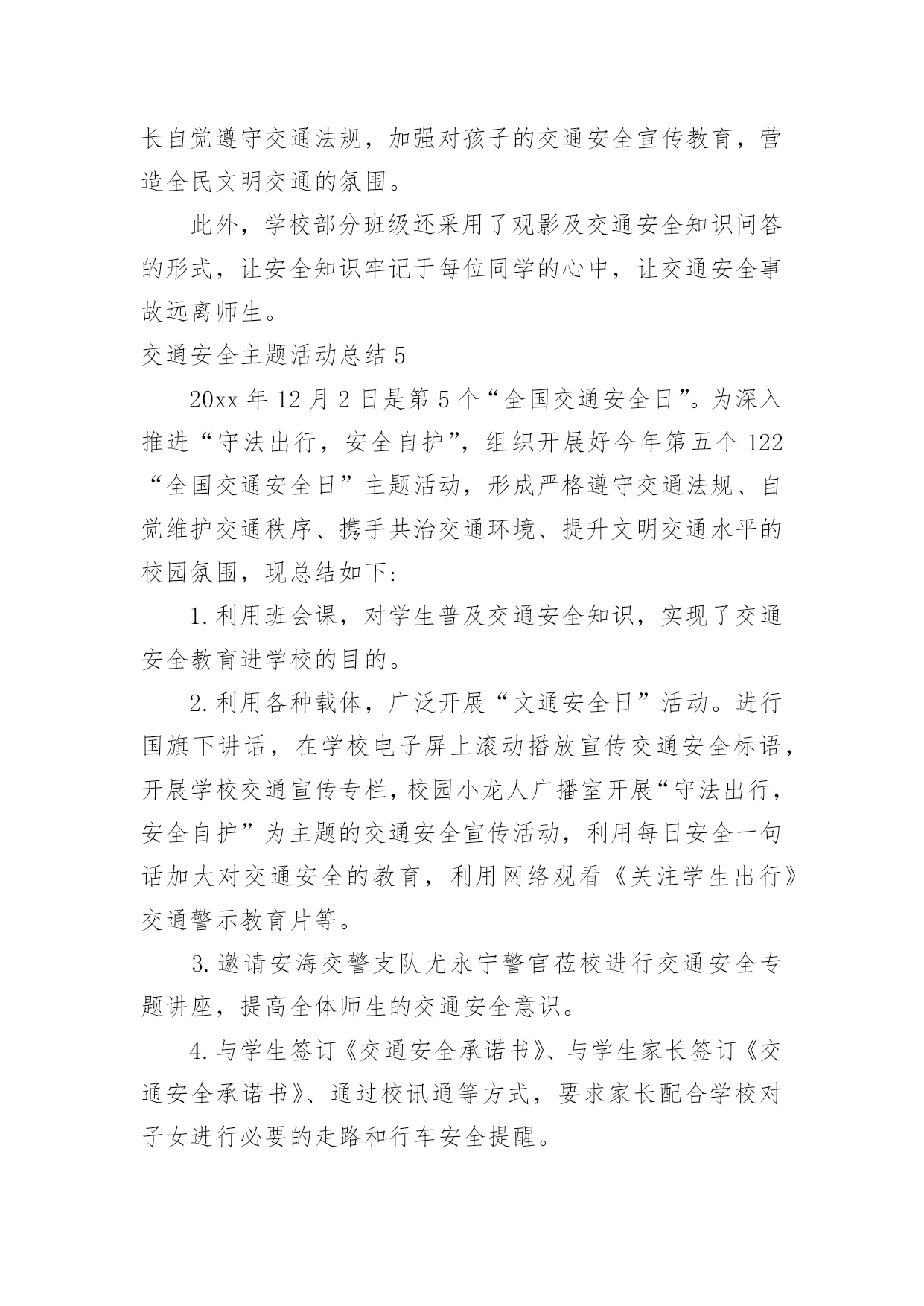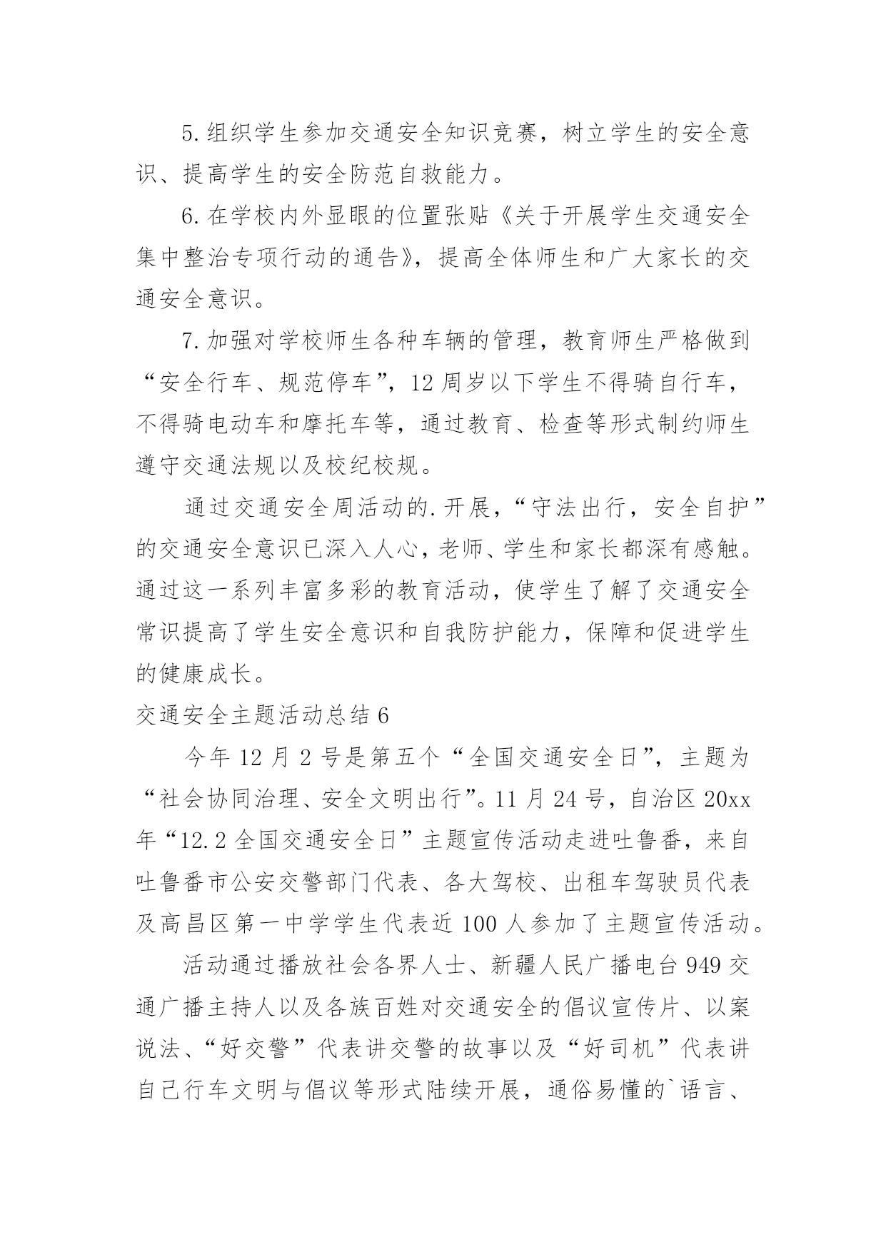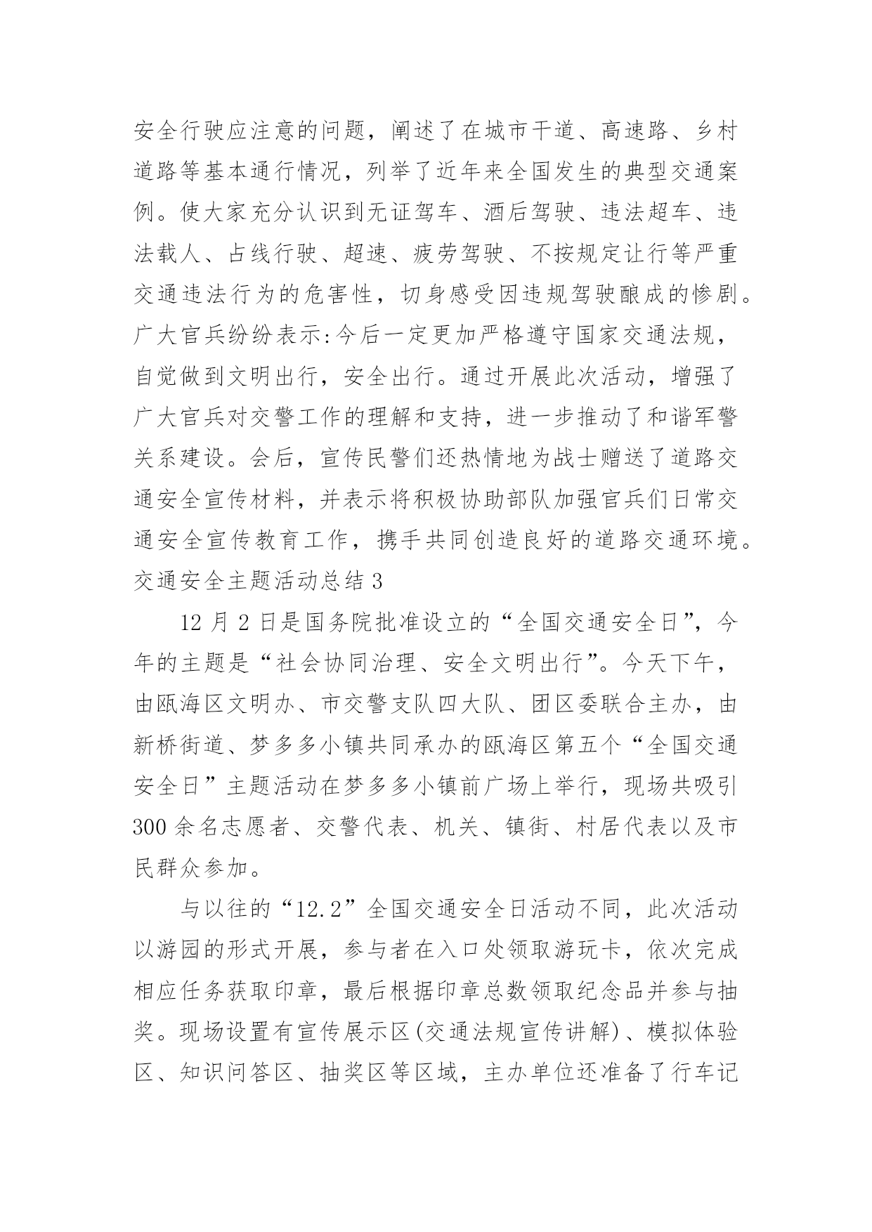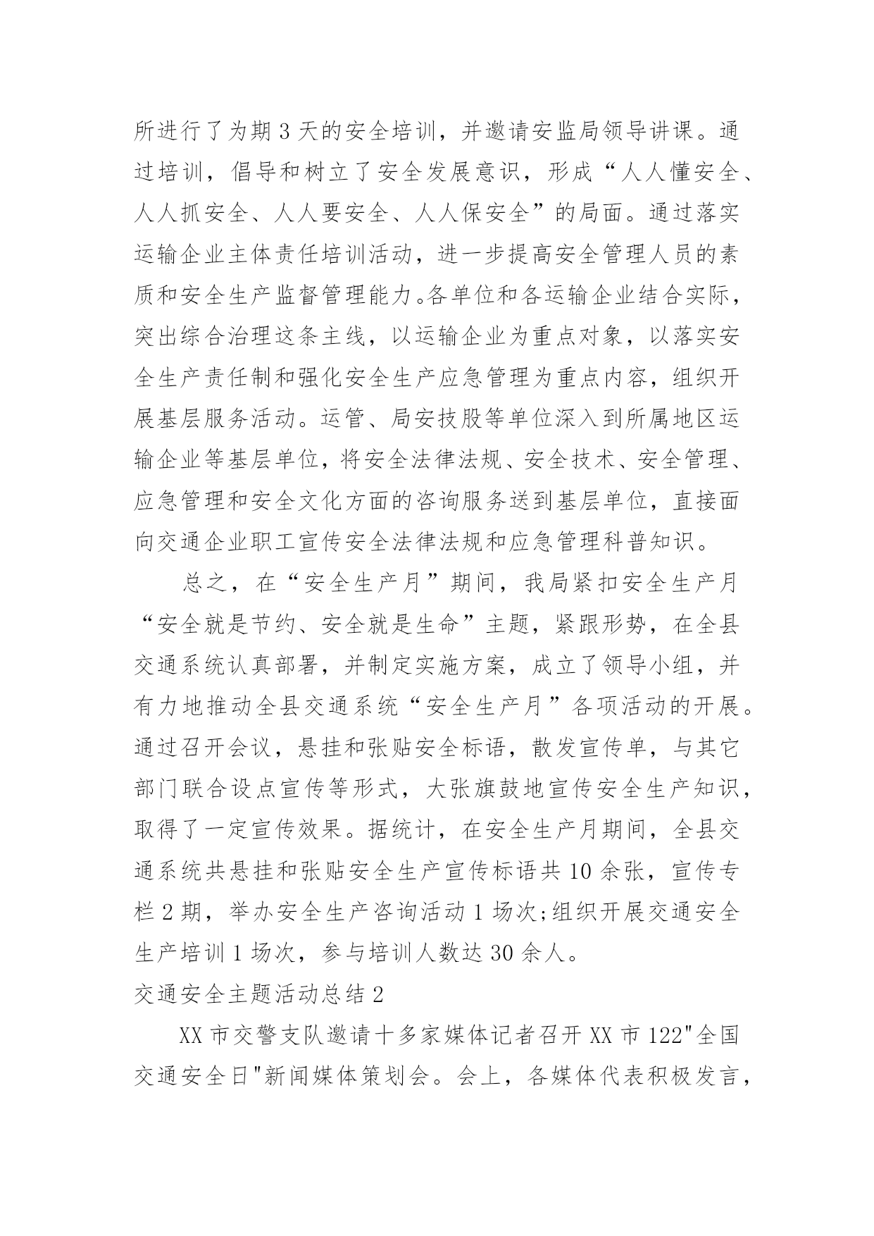 交通安全主题活动总结交通安全主题活动总结总结就是把一个时间段取得的成绩、存在的问题及得到的经验和教训进行一次全面系统的总结的书面材料,写总结有利于我们学习和工作能力的提高,是时候写一份总结了。总结一般是怎么写的呢?以下是小编为大家整理的交通安全主题活动总结,仅供参考,希望能够帮助到大家。交通安全主题活动总结1根据中共县委宣传部等六部门以及市交通局、县安委会有关活动安排部署,我局认真贯彻,积极组织,落实全国“安全生产月”活动,使得安全生产宣传教育活动迅速在全县交通系统开展起来,取得了一定的效果。一、认真结合实际,制定活动方案。我局结合工作实际,认真制定《20xx年县交通行业“安全生产月”活动方案号,以下发通知、召开动员大会、培训班等形式,推动“安全生产月”活动的开展。二、加强组织领导,促进“活动”有序开展。为加强县交通行业“安全生产月”活动的顺利开展,我局成立了以局长为组长的交通系统“安全生产月”活动领导小组。通过强化组织领导,使各单位充分认识安全生产宣传教育工作的重要性,把“安全生产月”活动作为“安全生产年”和“创业服务年”的.重要内容,纳入安全生产工作年度考核范围,切实抓紧抓好;督促各单位利用“安全生产月”活动有利时机,扎实开展“安康杯”安全生产劳动竞赛、“安全发展优秀图片展览”活动,结合安全生产宣传教育行动,全面推动安全生产执法行动、安全生产治理行动的落实。全县交通系统各单位都要求成立了的“安全生产月”活动组织机构,以不断创新形式和内容,细致谋划,精心部署,务求实效,确保各项活动顺利开展。三、紧扣主题,深入开展“活动”。围绕“安全就是节约、安全就是生命”这一“安全生产月”活动的主题,我县交通行业在今年的“安全生产月”的各项活动中,突出保增长、保民生、保稳定,唱响安全发展主旋律,强化企业安全生产主体责任落实,扎实开展安全生产宣传教育、安全生产执法、安全生产治理,切实加强交通安全生产法制体制机制、交通安全生产保障能力、交通安全生产依法监管队伍“三项建设”,努力提高我县交通行业全体员工的安全意识和安全文化素养,推动交通行业安全持续稳定发展。全县交通系统各单位开展交通安全知识专题教育,努力提升安全管理人员的管理水平和交通从业人员的安全意识,大力宣传“安全发展”科学理念和“发展是第一要务,安全是第一责任”的观念。6月2日,我局组织交通系统各单位及相关企业安全生产主要责任人共30余人,在太乙村干休所进行了为期3天的安全培训,并邀请安监局领导讲课。通过培训,倡导和树立了安全发展意识,形成“人人懂安全、人人抓安全、人人要安全、人人保安全”的局面。通过落实运输企业主体责任培训活动,进一步提高安全管理人员的素质和安全生产监督管理能力。各单位和各运输企业结合实际,突出综合治理这条主线,以运输企业为重点对象,以落实安全生产责任制和强化安全生产应急管理为重点内容,组织开展基层服务活动。运管、局安技股等单位深入到所属地区运输企业等基层单位,将安全法律法规、安全技术、安全管理、应急管理和安全文化方面的咨询服务送到基层单位,直接面向交通企业职工宣传安全法律法规和应急管理科普知识。总之,在“安全生产月”期间,我局紧扣安全生产月“安全就是节约、安全就是生命”主题,紧跟形势,在全县交通系统认真部署,并制定实施方案,成立了领导小组,并有力地推动全县交通系统“安全生产月”各项活动的开展。通过召开会议,悬挂和张贴安全标语,散发宣传单,与其它部门联合设点宣传等形式,大张旗鼓地宣传安全生产知识,取得了一定宣传效果。据统计,在安全生产月期间,全县交通系统共悬挂和张贴安全生产宣传标语共10余张,宣传专栏2期,举办安全生产咨询活动1场次;组织开展交通安全生产培训1场次,参与培训人数达30余人。交通安全主题活动总结2XX市交警支队邀请十多家媒体记者召开XX市122"全国交通安全日"新闻媒体策划会。会上,各媒体代表积极发言,为122全国交通安全日积极献计献策,全力做好此次宣传工作。进社区家庭11月23日9时,鸡东县公安交警大队宣教中队民警联合城镇二中队民警走进警民社区以"拒绝危险驾驶、安全文明出行"为主题开展交通安全宣传活动。活动中,宣传民警通过摆放交通安全宣传展板、发放交通安全宣传材料、面对面宣讲交通安全法律法规等形式,向社区工作者和社区居民详细讲解了驾乘车辆、步行等方面的日常出行安全常识,以及有关道路交通违法处理、机动车及驾驶证定期审验、道路交通事故应急处理方法等交通安全知识,并通过例举近期冬季典型交通事故案例,广泛宣传超员、超速、超载、疲劳驾驶、酒驾、毒驾、涉牌涉证等严重违法行为危害性。此次宣传活动,大队共出动警力12人,摆放安全宣传展板4块,发放各类宣传资料400余份。通过宣传,进一步提升了该社区居民的交通安全意识和法治意识。深入人员密集场所11月25日上午9时,交警
