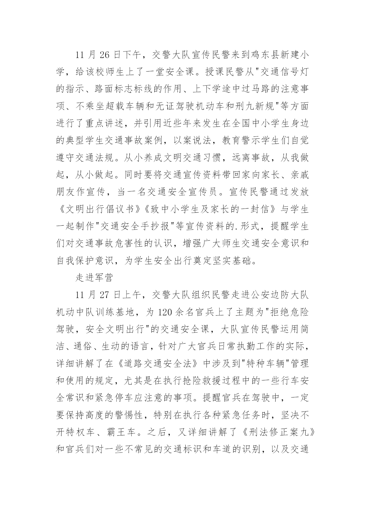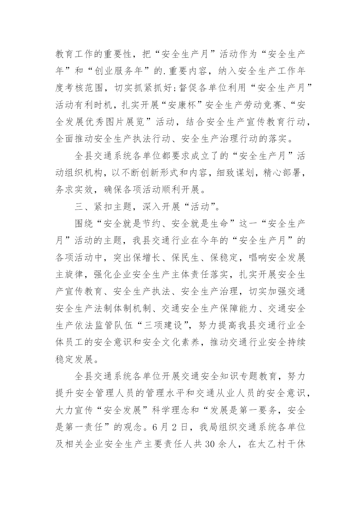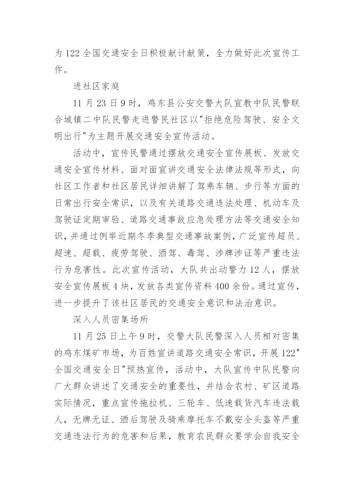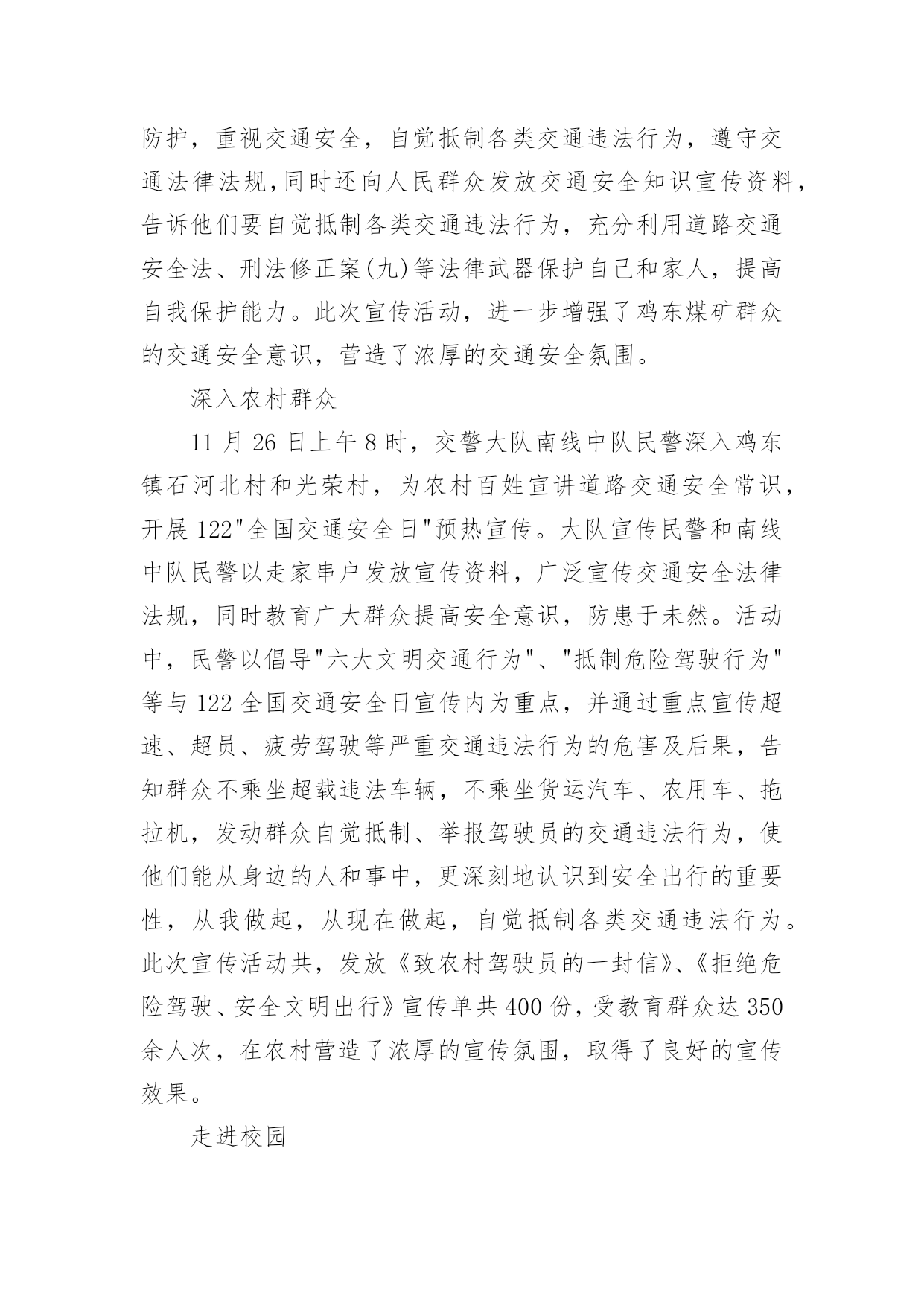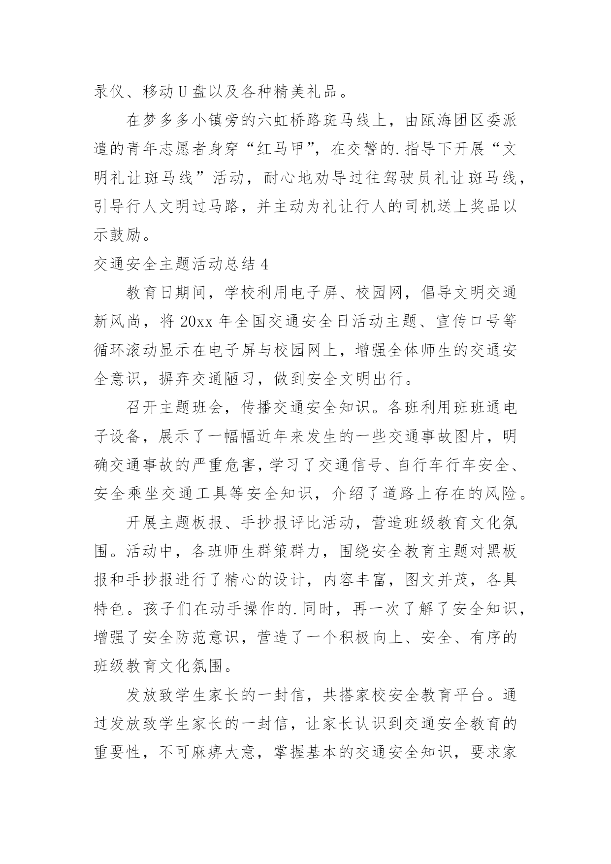 交通安全主题活动总结交通安全主题活动总结总结就是把一个时间段取得的成绩、存在的问题及得到的经验和教训进行一次全面系统的总结的书面材料,写总结有利于我们学习和工作能力的提高,是时候写一份总结了。总结一般是怎么写的呢?以下是小编为大家整理的交通安全主题活动总结,仅供参考,希望能够帮助到大家。交通安全主题活动总结1根据中共县委宣传部等六部门以及市交通局、县安委会有关活动安排部署,我局认真贯彻,积极组织,落实全国“安全生产月”活动,使得安全生产宣传教育活动迅速在全县交通系统开展起来,取得了一定的效果。一、认真结合实际,制定活动方案。我局结合工作实际,认真制定《20xx年县交通行业“安全生产月”活动方案号,以下发通知、召开动员大会、培训班等形式,推动“安全生产月”活动的开展。二、加强组织领导,促进“活动”有序开展。为加强县交通行业“安全生产月”活动的顺利开展,我局成立了以局长为组长的交通系统“安全生产月”活动领导小组。通过强化组织领导,使各单位充分认识安全生产宣传教育工作的重要性,把“安全生产月”活动作为“安全生产年”和“创业服务年”的.重要内容,纳入安全生产工作年度考核范围,切实抓紧抓好;督促各单位利用“安全生产月”活动有利时机,扎实开展“安康杯”安全生产劳动竞赛、“安全发展优秀图片展览”活动,结合安全生产宣传教育行动,全面推动安全生产执法行动、安全生产治理行动的落实。全县交通系统各单位都要求成立了的“安全生产月”活动组织机构,以不断创新形式和内容,细致谋划,精心部署,务求实效,确保各项活动顺利开展。三、紧扣主题,深入开展“活动”。围绕“安全就是节约、安全就是生命”这一“安全生产月”活动的主题,我县交通行业在今年的“安全生产月”的各项活动中,突出保增长、保民生、保稳定,唱响安全发展主旋律,强化企业安全生产主体责任落实,扎实开展安全生产宣传教育、安全生产执法、安全生产治理,切实加强交通安全生产法制体制机制、交通安全生产保障能力、交通安全生产依法监管队伍“三项建设”,努力提高我县交通行业全体员工的安全意识和安全文化素养,推动交通行业安全持续稳定发展。全县交通系统各单位开展交通安全知识专题教育,努力提升安全管理人员的管理水平和交通从业人员的安全意识,大力宣传“安全发展”科学理念和“发展是第一要务,安全是第一责任”的观念。6月2日,我局组织交通系统各单位及相关企业安全生产主要责任人共30余人,在太乙村干休所进行了为期3天的安全培训,并邀请安监局领导讲课。通过培训,倡导和树立了安全发展意识,形成“人人懂安全、人人抓安全、人人要安全、人人保安全”的局面。通过落实运输企业主体责任培训活动,进一步提高安全管理人员的素质和安全生产监督管理能力。各单位和各运输企业结合实际,突出综合治理这条主线,以运输企业为重点对象,以落实安全生产责任制和强化安全生产应急管理为重点内容,组织开展基层服务活动。运管、局安技股等单位深入到所属地区运输企业等基层单位,将安全法律法规、安全技术、安全管理、应急管理和安全文化方面的咨询服务送到基层单位,直接面向交通企业职工宣传安全法律法规和应急管理科普知识。总之,在“安全生产月”期间,我局紧扣安全生产月“安全就是节约、安全就是生命”主题,紧跟形势,在全县交通系统认真部署,并制定实施方案,成立了领导小组,并有力地推动全县交通系统“安全生产月”各项活动的开展。通过召开会议,悬挂和张贴安全标语,散发宣传单,与其它部门联合设点宣传等形式,大张旗鼓地宣传安全生产知识,取得了一定宣传效果。据统计,在安全生产月期间,全县交通系统共悬挂和张贴安全生产宣传标语共10余张,宣传专栏2期,举办安全生产咨询活动1场次;组织开展交通安全生产培训1场次,参与培训人数达30余人。交通安全主题活动总结2XX市交警支队邀请十多家媒体记者召开XX市122"全国交通安全日"新闻媒体策划会。会上,各媒体代表积极发言,为122全国交通安全日积极献计献策,全力做好此次宣传工作。进社区家庭11月23日9时,鸡东县公安交警大队宣教中队民警联合城镇二中队民警走进警民社区以"拒绝危险驾驶、安全文明出行"为主题开展交通安全宣传活动。活动中,宣传民警通过摆放交通安全宣传展板、发放交通安全宣传材料、面对面宣讲交通安全法律法规等形式,向社区工作者和社区居民详细讲解了驾乘车辆、步行等方面的日常出行安全常识,以及有关道路交通违法处理、机动车及驾驶证定期审验、道路交通事故应急处理方法等交通安全知识,并通过例举近期冬季典型交通事故案例,广泛宣传超员、超速、超载、疲劳驾驶、酒驾、毒驾、涉牌涉证等严重违法行为危害性。此次宣传活动,大队共出动警力12人,摆放安全宣传展板4块,发放各类宣传资料400余份。通过宣传,进一步提升了该社区居民的交通安全意识和法治意识。深入人员密集场所11月25日上午9时,交警