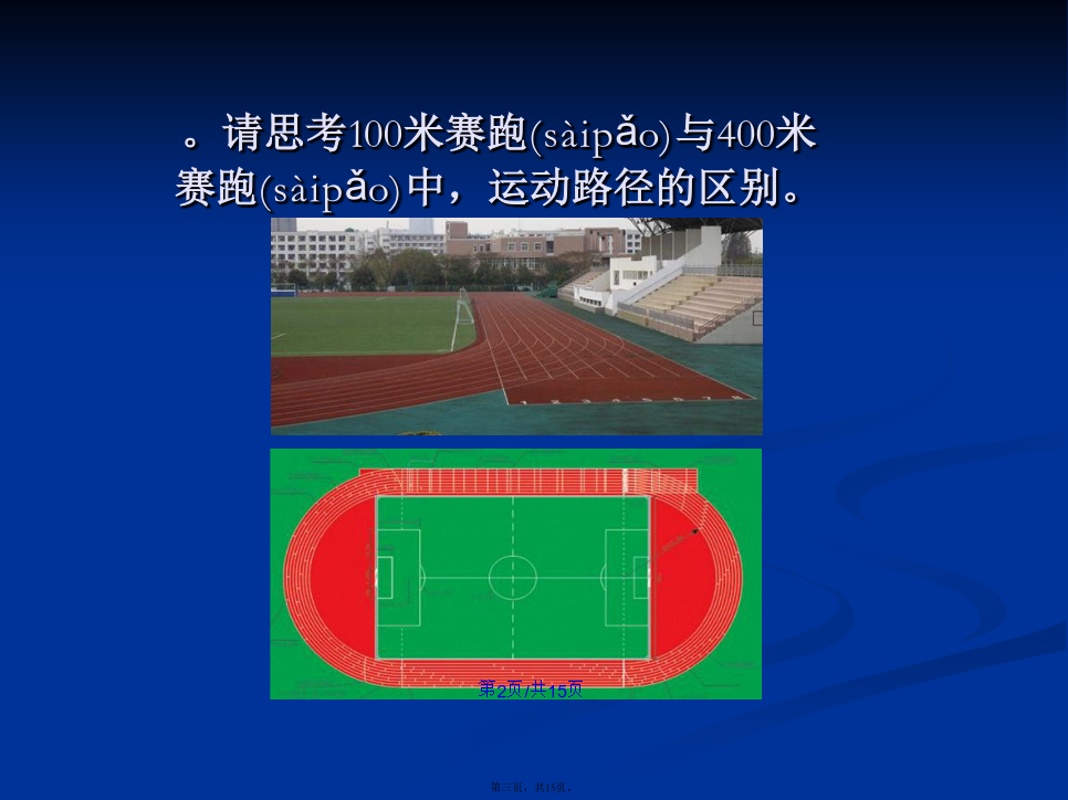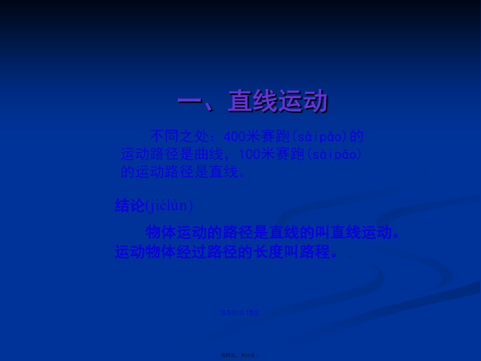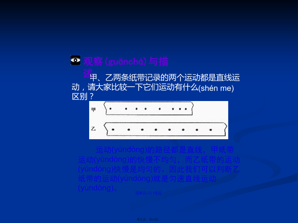 会计学复习(fùxí):机械运动及其相对性。请思考100米赛跑(sàipǎo)与400米赛跑(sàipǎo)中,运动路径的区别。不同之处:400米赛跑(sàipǎo)的运动路径是曲线,100米赛跑(sàipǎo)的运动路径是直线。演示(yǎnshì)实验:二、匀速直线运动(yùndòng)打点(dǎdiɑn)计时器甲、乙两条纸带记录的两个运动都是直线运动,请大家比较一下它们运动有什么(shénme)区别?频闪照相机能记录运动物体经过相等时间(shíjiān)间隔的位置。练习(liànxí)1传送带上货物(huòwù)的运动小结谢谢(xièxie)大家!