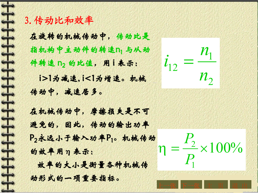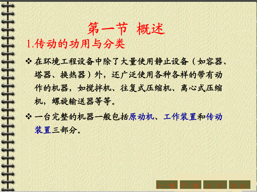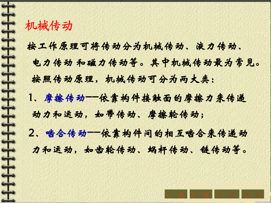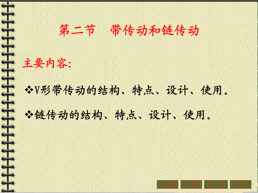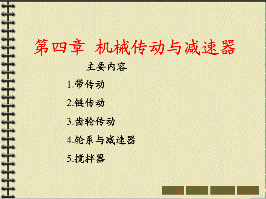 第四章机械传动与减速器第一节概述1.传动的功用与分类机器的组成传动装置机械传动2.传动示意图3.传动比和效率主要内容:一、带传动的工作原理和特点:二、带传动的分类三、V形带和V形带轮1、V形带的截面结构及尺寸V形带已标准化,按截面尺寸的不同,分为Y、Z、A、B、C、D、E七种型号,其截面尺寸见右表。沿V形带中性层(宽度为bp处)量得的带的周长称为节线长度Lp,又称为基准长度、公称长度,它主要用于带传动的几何尺寸计算,其长度系列见右表。2、带传动的特点:3、V形带的应用:4、传动带的受力分析4、传动带的受力分析5.带传动的运动分析2、打滑:有效圆周力的大小与带传递的功率P以及带的速度υ有关。当工作装置要求传递的功率增大时,带两边拉力差F1-F2=Fe也要相应地增大,带两边拉力的这种变化,实际上反映了带和带轮接触面上摩擦力的变化。实践证明,当其他条件不变,且初拉力F0一定时,这个摩擦力有一极限值。若带所传递的圆周力超过带与带轮接触面间的极限摩擦力时,带就会沿着轮面发生全面滑动,这种现象称为打滑。打滑将使传动失效。注意:V形带传动的设计内容主要包括:确定带的型号、长度、根数确定小带轮和大带轮的直径确定中心距确定带轮的材料和结构尺寸等。设计的原始条件为:传动的用途和工作情况,传递的功率,主动轮和从动轮的转速(或传动比),以及外廓尺寸的要求等。下一张下一张(2)确定小带轮的节圆直径d1、验算带速、确定大带轮节圆直径d2(2)确定小带轮的节圆直径d1、验算带速、确定大带轮节圆直径d2V形带带轮最小直径及V形带每m长的质量V形带带轮节圆直径系列(摘录)(3)确定中心距a0和带长Lp(3)确定中心距a0和带长Lp(4)验算小轮包角(4)验算小轮包角(5)计算带的根数ZΔP0--考虑i≠1时,单根V形带所能传递功率的增量,kW。由于P0是按i=1,即d1=d2的条件下计算的。传动比越大,则从动轮直径相对主动轮来说越大,带绕过从动轮时的弯曲应力越小,因此提高了带传动的工作能力。Kα--考虑包角不同时的影响系数,称包角系数,见表4-9KL--考虑带的长度不同时的影响系数,称带长修正系数,见表4-10;KB--弯曲影响系数,见表4-11;Ki--传动比系数,见表4-12;n1--主动轮转速,r/min。7.V形带轮(1)轮缘(2)轮毂(3)轮辐为了延长带的使用寿命,确保带传动的正常运行,必须正确使用和维修。【例题】(P214)【解】(1)计算功率Pc根据工况,由表4-5(P208)查得KA=1.3,故Pc=KAP=1.3×2.2=2.86kW(2)选取V形胶带型号根据Pc=2.86kW,n1=1430r/min,由图4-7确定选用A型,小带轮直径80~100mm。(3)确定小带轮节圆直径d1及大带轮节圆直径d2因带轮越小越费带,所以取d1=100mm,(4)验算带速v(5)确定带公称长度Lp和中心距a由表4-4选用普通V形带公称长度Lp=1800mm,实际中心距:(7)计算带根数Z取Z=3根。(8)带轮结构设计【作业】(P262,第1题)某平流式沉淀池刮泥机采用3级减速装置,其第1级为V形带传动。用Y型异步电动机,其额定功率为7.5KW,转速n1=1450r/min;而工作轮的转速n2=450r/min,每日工作8h,试设计该V形带传动。(取KA=1.2)【作业答案】(P262,第1题)选用V形带型号:A型带d1=125,d2=400a0=500,Lp=1800,a=469z=5四、链传动1、链传动的组成2、链传动的特点3、链条4、链轮5、链传动的运动特性6、链传动的失效7、链条的选用7、链条的选用8、链条的张紧链传动的紧边在上边,若下边为紧边,上边为松边,则易卡死。链条松弛后,要张紧。常见的张紧形式如下:【例题】(P223)【解】(1)确定链轮齿数链轮齿数应取奇数,以变换链与齿的啮合位置。假定v=3~8m/s(需验证),查表4-18选小链轮齿数z1=21。大链轮齿数z2=iz1=3.1×21=65.1,取奇数z2=65。(2)选取链条型号计算功率Pc根据工况,由表4-15查得KA=1.3,故Pc=KAP=1.3×7.5=9.75kW【例题】(3)验算链速【作业】(P262,第3题)设计一生物转盘减速装置的滚子链传动,已知电机转速n1=960r/min,额定功率P=3KW,减速器输入轴转速n2=330r/min,试确定链轮齿数和链条型号与节距。(提示:假定v=3~8m/s,取z1=21,选单排链,工况系数取1.3)【作业答案】(P262,第3题)z1=21,z2=61选用链条型号:08A单排链,节距p=12.7mm链速v=4.27m/s主要内容:一、概述2.齿轮传