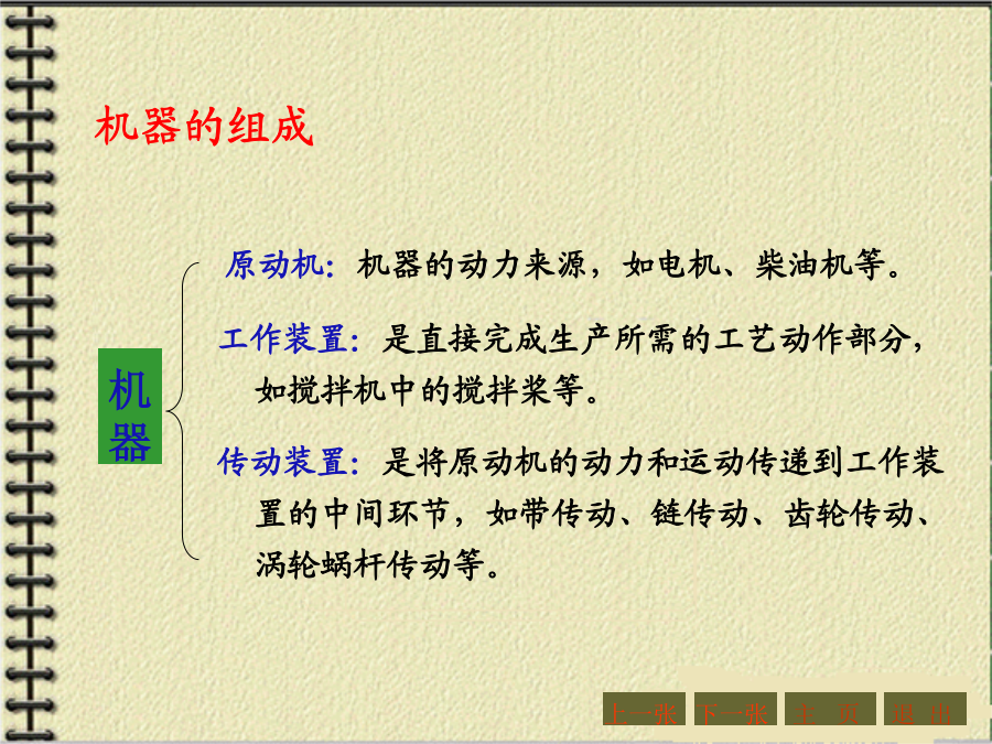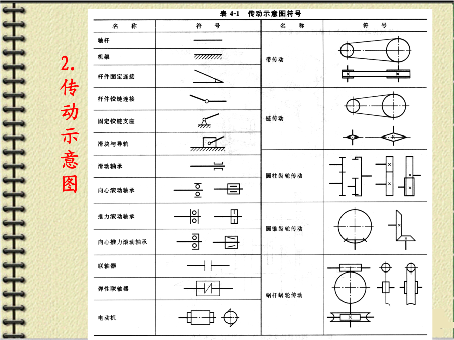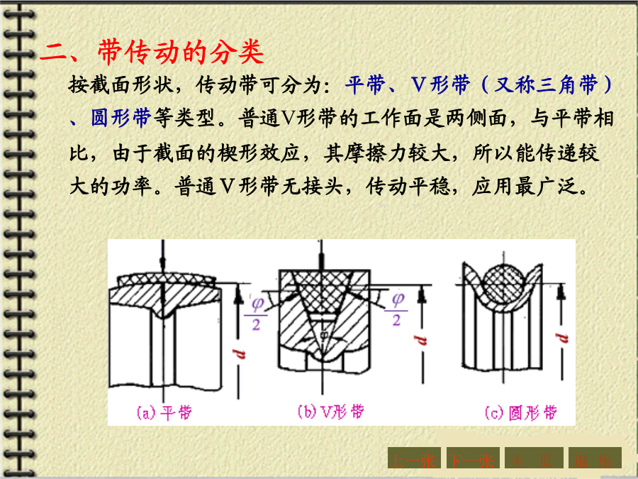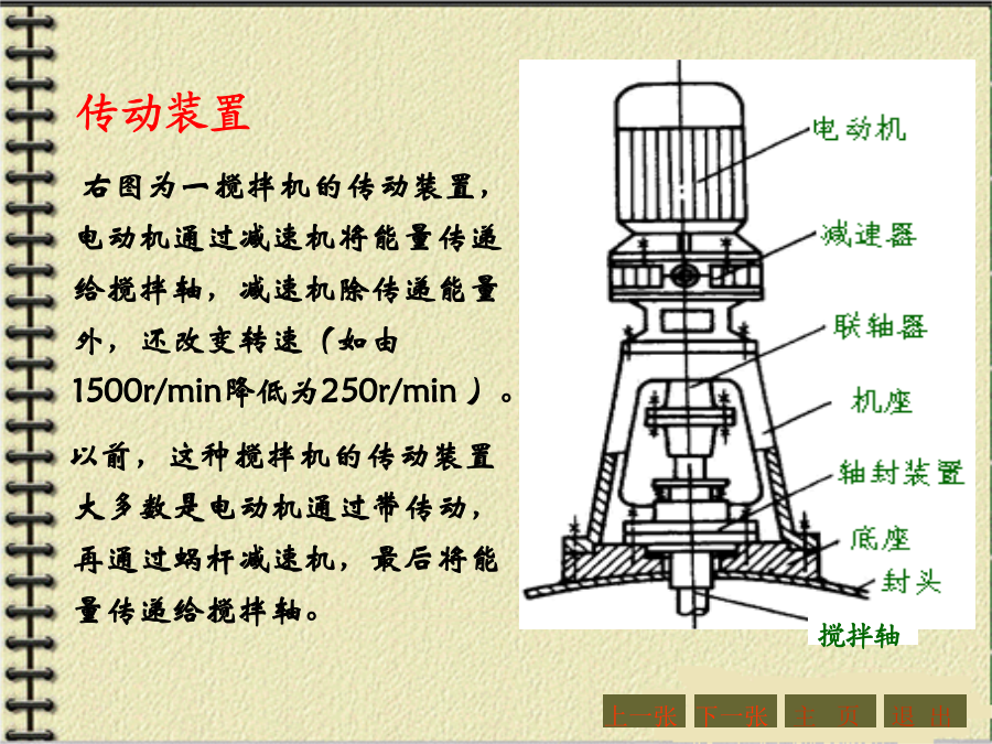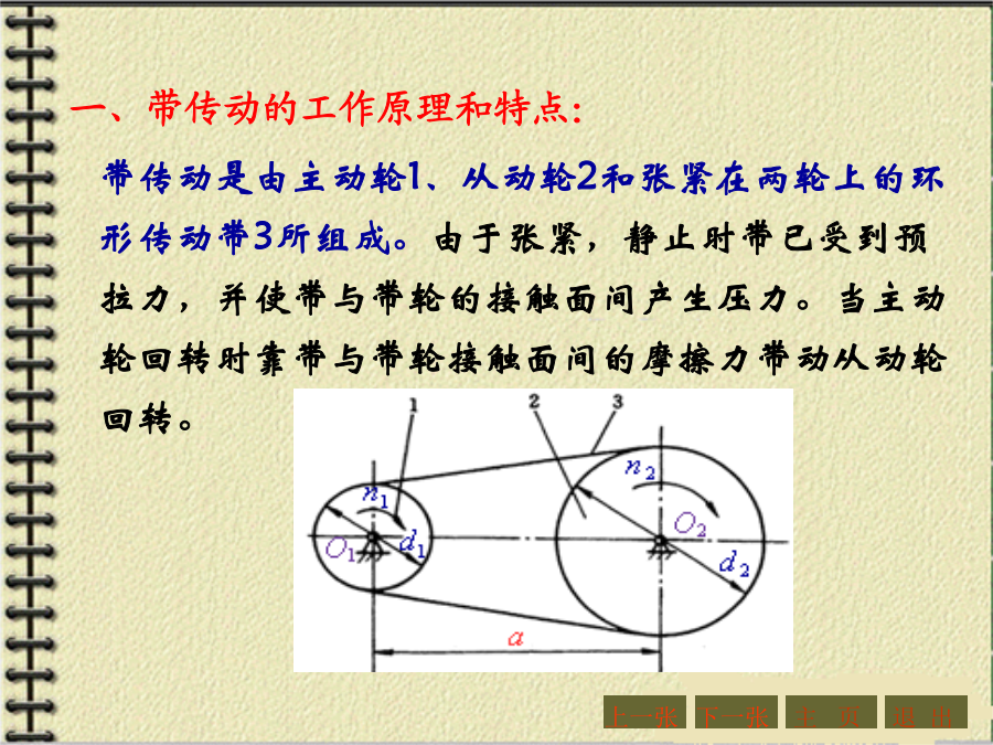 第四章机械传动与减速器第一节概述1.传动的功用与分类机器的组成传动装置机械传动2.传动示意图3.传动比和效率主要内容:一、带传动的工作原理和特点:二、带传动的分类三、V形带和V形带轮1、V形带的截面结构及尺寸V形带已标准化,按截面尺寸的不同,分为Y、Z、A、B、C、D、E七种型号,其截面尺寸见右表。沿V形带中性层(宽度为bp处)量得的带的周长称为节线长度Lp,又称为基准长度、公称长度,它主要用于带传动的几何尺寸计算,其长度系列见右表。2、带传动的特点:3、V形带的应用:4、传动带的受力分析4、传动带的受力分析5.带传动的运动分析2、打滑:有效圆周力的大小与带传递的功率P以及带的速度υ有关。当工作装置要求传递的功率增大时,带两边拉力差F1-F2=Fe也要相应地增大,带两边拉力的这种变化,实际上反映了带和带轮接触面上摩擦力的变化。实践证明,当其他条件不变,且初拉力F0一定时,这个摩擦力有一极限值。若带所传递的圆周力超过带与带轮接触面间的极限摩擦力时,带就会沿着轮面发生全面滑动,这种现象称为打滑。打滑将使传动失效。注意:V形带传动的设计内容主要包括:确定带的型号、长度、根数确定小带轮和大带轮的直径确定中心距确定带轮的材料和结构尺寸等。设计的原始条件为:传动的用途和工作情况,传递的功率,主动轮和从动轮的转速(或传动比),以及外廓尺寸的要求等。下一张下一张(2)确定小带轮的节圆直径d1、验算带速、确定大带轮节圆直径d2(2)确定小带轮的节圆直径d1、验算带速、确定大带轮节圆直径d2V形带带轮最小直径及V形带每m长的质量V形带带轮节圆直径系列(摘录)(3)确定中心距a0和带长Lp(3)确定中心距a0和带长Lp(4)验算小轮包角(4)验算小轮包角(5)计算带的根数ZΔP0--考虑i≠1时,单根V形带所能传递功率的增量,kW。由于P0是按i=1,即d1=d2的条件下计算的。传动比越大,则从动轮直径相对主动轮来说越大,带绕过从动轮时的弯曲应力越小,因此提高了带传动的工作能力。Kα--考虑包角不同时的影响系数,称包角系数,见表4-9KL--考虑带的长度不同时的影响系数,称带长修正系数,见表4-10;KB--弯曲影响系数,见表4-11;Ki--传动比系数,见表4-12;n1--主动轮转速,r/min。7.V形带轮(1)轮缘(2)轮毂(3)轮辐为了延长带的使用寿命,确保带传动的正常运行,必须正确使用和维修。【例题】(P214)【解】(1)计算功率Pc根据工况,由表4-5(P208)查得KA=1.3,故Pc=KAP=1.3×2.2=2.86kW(2)选取V形胶带型号根据Pc=2.86kW,n1=1430r/min,由图4-7确定选用A型,小带轮直径80~100mm。(3)确定小带轮节圆直径d1及大带轮节圆直径d2因带轮越小越费带,所以取d1=100mm,(4)验算带速v(5)确定带公称长度Lp和中心距a由表4-4选用普通V形带公称长度Lp=1800mm,实际中心距:(7)计算带根数Z取Z=3根。(8)带轮结构设计【作业】(P262,第1题)某平流式沉淀池刮泥机采用3级减速装置,其第1级为V形带传动。用Y型异步电动机,其额定功率为7.5KW,转速n1=1450r/min;而工作轮的转速n2=450r/min,每日工作8h,试设计该V形带传动。(取KA=1.2)【作业答案】(P262,第1题)选用V形带型号:A型带d1=125,d2=400a0=500,Lp=1800,a=469z=5四、链传动1、链传动的组成2、链传动的特点3、链条4、链轮5、链传动的运动特性6、链传动的失效7、链条的选用7、链条的选用8、链条的张紧链传动的紧边在上边,若下边为紧边,上边为松边,则易卡死。链条松弛后,要张紧。常见的张紧形式如下:【例题】(P223)【解】(1)确定链轮齿数链轮齿数应取奇数,以变换链与齿的啮合位置。假定v=3~8m/s(需验证),查表4-18选小链轮齿数z1=21。大链轮齿数z2=iz1=3.1×21=65.1,取奇数z2=65。(2)选取链条型号计算功率Pc根据工况,由表4-15查得KA=1.3,故Pc=KAP=1.3×7.5=9.75kW【例题】(3)验算链速【作业】(P262,第3题)设计一生物转盘减速装置的滚子链传动,已知电机转速n1=960r/min,额定功率P=3KW,减速器输入轴转速n2=330r/min,试确定链轮齿数和链条型号与节距。(提示:假定v=3~8m/s,取z1=21,选单排链,工况系数取1.3)【作业答案】(P262,第3题)z1=21,z2=61选用链条型号:08A单排链,节距p=12.7mm链速v=4.27m/s主要内容:一、概述2.齿轮传