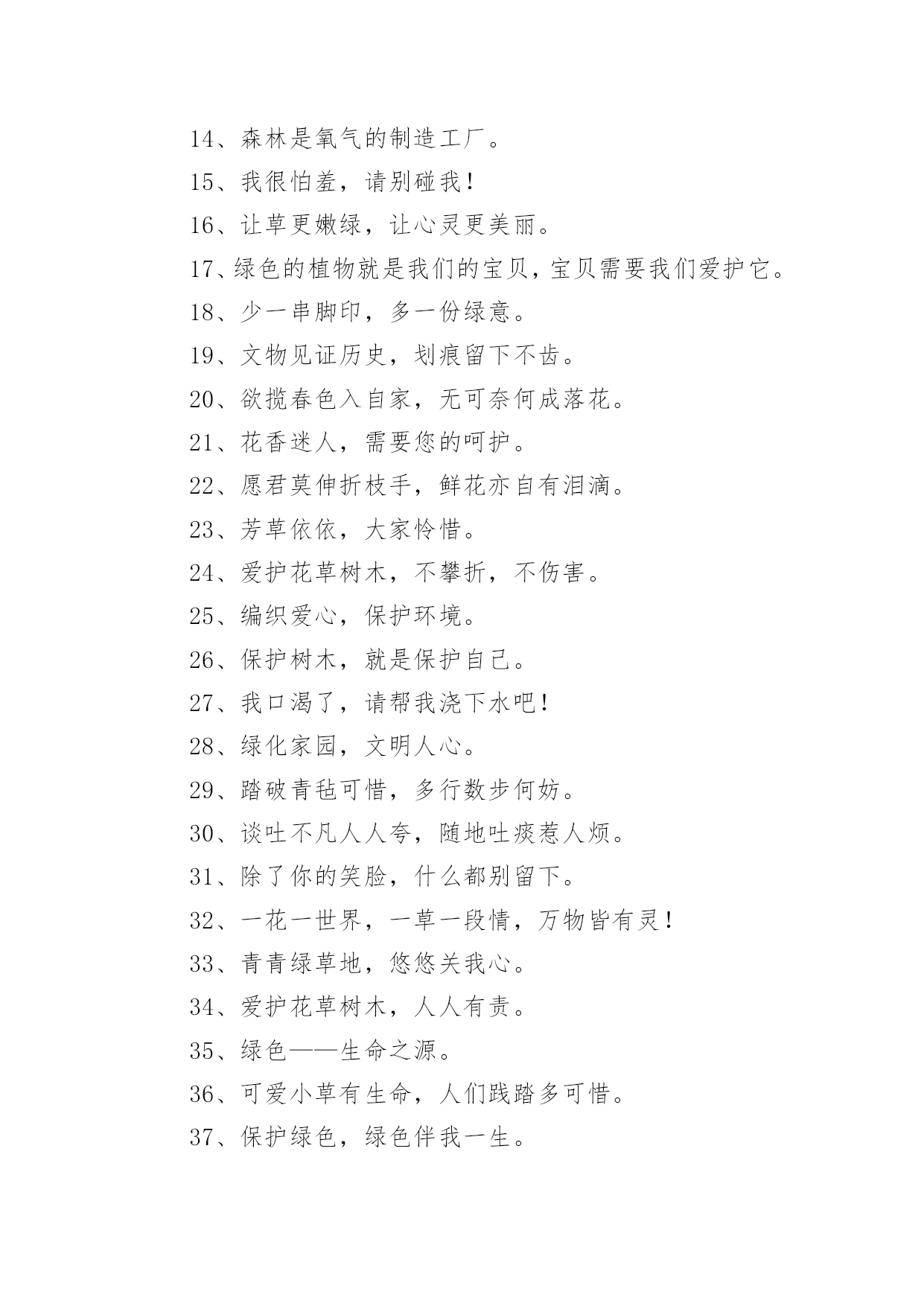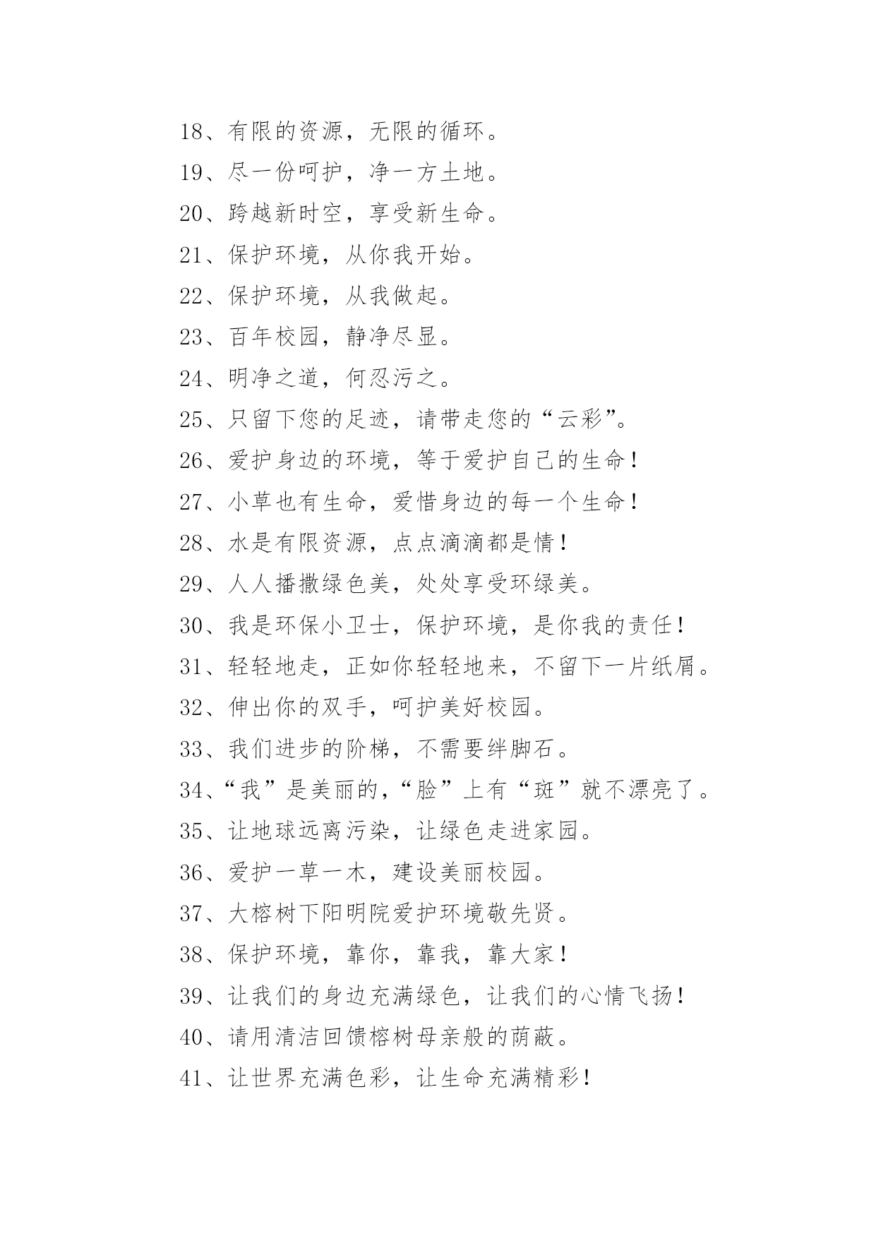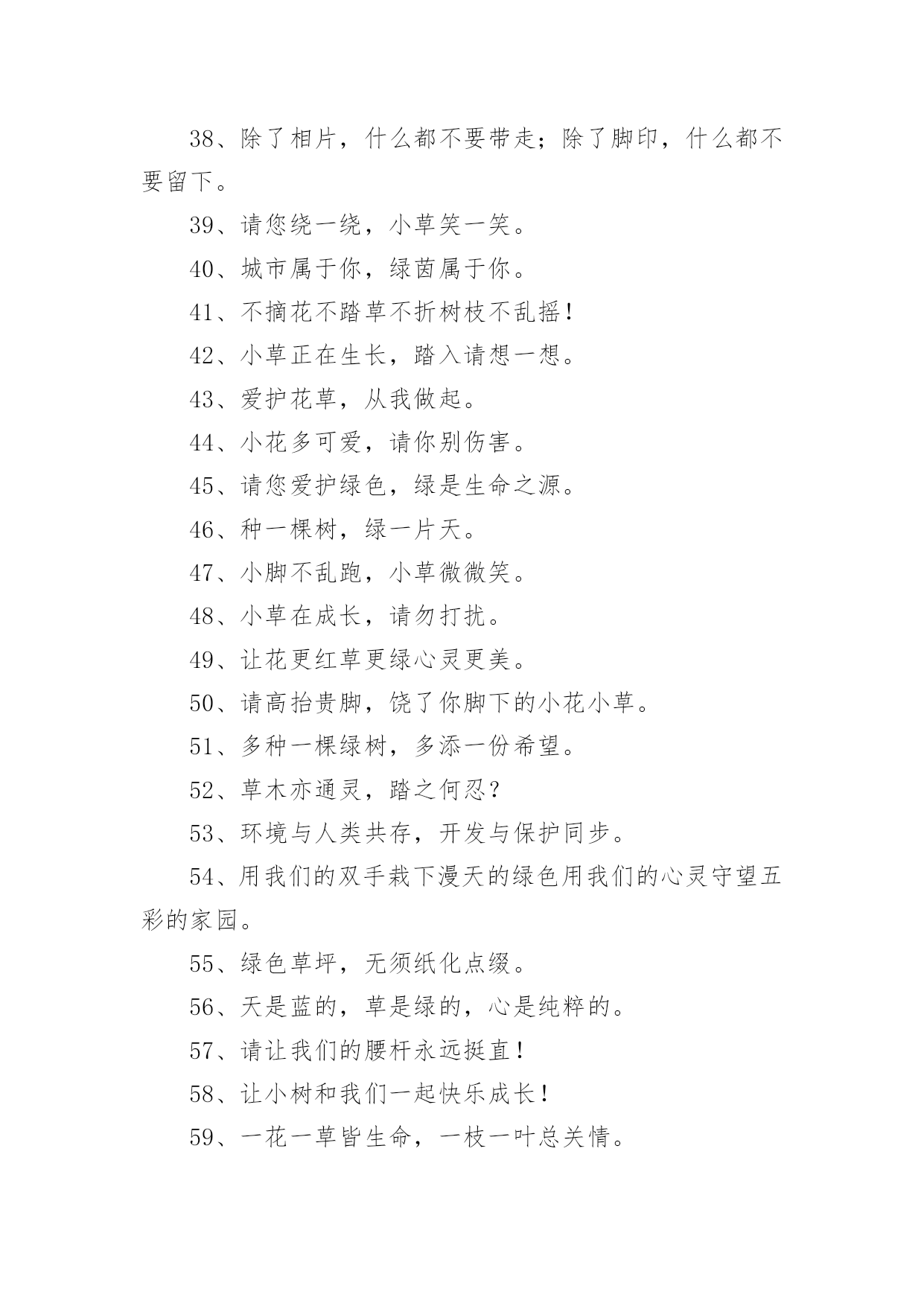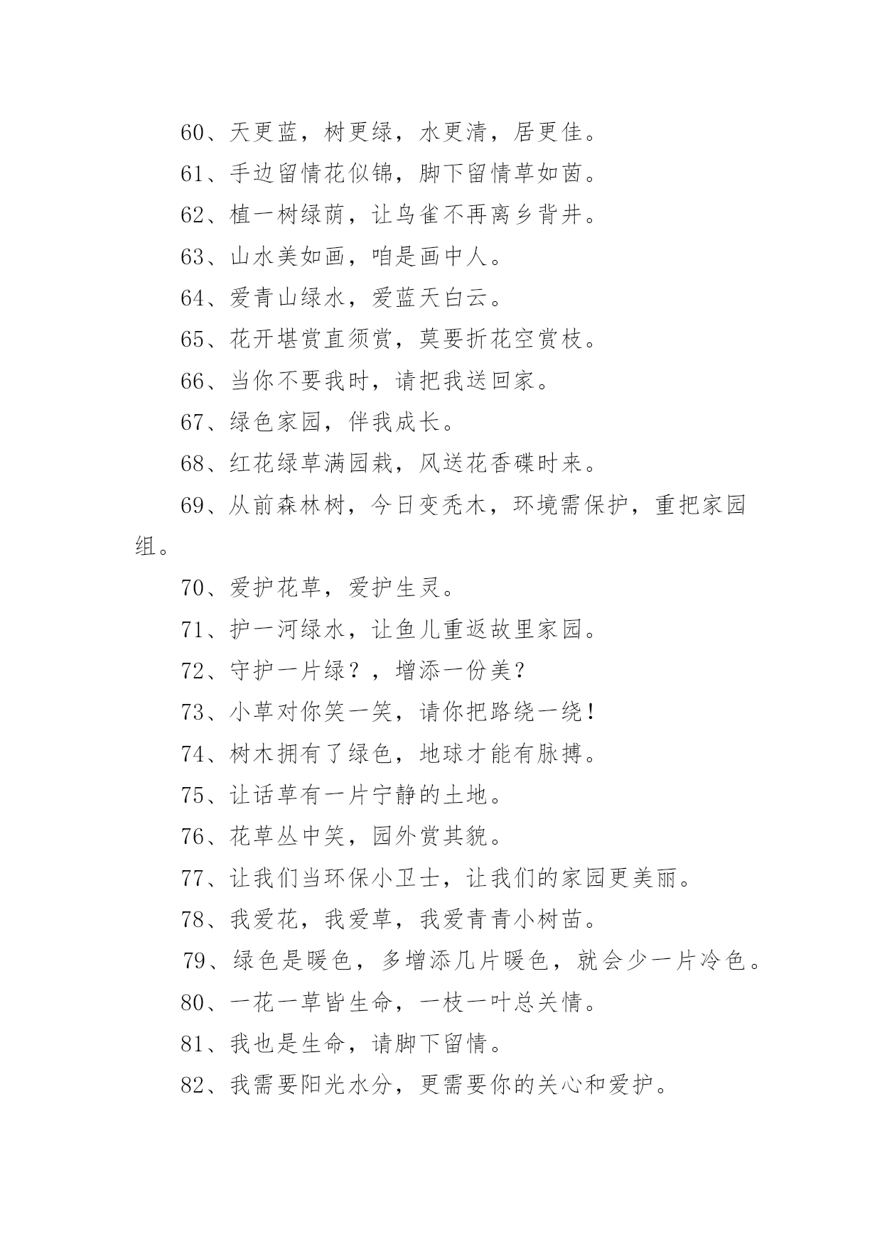 环保宣传标语有关环保宣传标语在学习、工作乃至生活中,大家总少不了接触一些耳熟能详的标语吧,标语以其时间性、阶段性和空间性的特色,表示着不同时代和不同地区人们的生活重点。你还在找寻优秀经典的标语吗?以下是小编为大家整理的有关环保宣传标语,欢迎大家分享。有关环保宣传标语11、花草诚美丽,手脚要留情。2、为了你我的健康,请爱护树木。3、花木有情报春晖,同学爱护喜心扉。4、请爱护花草树木吧,它将给你绿色的生命!5、爱护花草树木,保护环境。6、爱心给绿色,树木更树人。7、不要让最后一片绿色成为我们的梦想。8、绿草茵茵,踏之可惜。9、用心爱护每一片绿色。10、请你别踩我,我怕你的脚。11、绿色无处不在,人类无比可爱。12、天更蓝草更绿花更艳。13、手下留情,脚下留青。14、森林是氧气的制造工厂。15、我很怕羞,请别碰我!16、让草更嫩绿,让心灵更美丽。17、绿色的植物就是我们的宝贝,宝贝需要我们爱护它。18、少一串脚印,多一份绿意。19、文物见证历史,划痕留下不齿。20、欲揽春色入自家,无可奈何成落花。21、花香迷人,需要您的呵护。22、愿君莫伸折枝手,鲜花亦自有泪滴。23、芳草依依,大家怜惜。24、爱护花草树木,不攀折,不伤害。25、编织爱心,保护环境。26、保护树木,就是保护自己。27、我口渴了,请帮我浇下水吧!28、绿化家园,文明人心。29、踏破青毡可惜,多行数步何妨。30、谈吐不凡人人夸,随地吐痰惹人烦。31、除了你的笑脸,什么都别留下。32、一花一世界,一草一段情,万物皆有灵!33、青青绿草地,悠悠关我心。34、爱护花草树木,人人有责。35、绿色——生命之源。36、可爱小草有生命,人们践踏多可惜。37、保护绿色,绿色伴我一生。38、除了相片,什么都不要带走;除了脚印,什么都不要留下。39、请您绕一绕,小草笑一笑。40、城市属于你,绿茵属于你。41、不摘花不踏草不折树枝不乱摇!42、小草正在生长,踏入请想一想。43、爱护花草,从我做起。44、小花多可爱,请你别伤害。45、请您爱护绿色,绿是生命之源。46、种一棵树,绿一片天。47、小脚不乱跑,小草微微笑。48、小草在成长,请勿打扰。49、让花更红草更绿心灵更美。50、请高抬贵脚,饶了你脚下的小花小草。51、多种一棵绿树,多添一份希望。52、草木亦通灵,踏之何忍?53、环境与人类共存,开发与保护同步。54、用我们的双手栽下漫天的绿色用我们的心灵守望五彩的家园。55、绿色草坪,无须纸化点缀。56、天是蓝的,草是绿的,心是纯粹的。57、请让我们的腰杆永远挺直!58、让小树和我们一起快乐成长!59、一花一草皆生命,一枝一叶总关情。60、天更蓝,树更绿,水更清,居更佳。61、手边留情花似锦,脚下留情草如茵。62、植一树绿荫,让鸟雀不再离乡背井。63、山水美如画,咱是画中人。64、爱青山绿水,爱蓝天白云。65、花开堪赏直须赏,莫要折花空赏枝。66、当你不要我时,请把我送回家。67、绿色家园,伴我成长。68、红花绿草满园栽,风送花香碟时来。69、从前森林树,今日变秃木,环境需保护,重把家园组。70、爱护花草,爱护生灵。71、护一河绿水,让鱼儿重返故里家园。72、守护一片绿?,增添一份美?73、小草对你笑一笑,请你把路绕一绕!74、树木拥有了绿色,地球才能有脉搏。75、让话草有一片宁静的土地。76、花草丛中笑,园外赏其貌。77、让我们当环保小卫士,让我们的家园更美丽。78、我爱花,我爱草,我爱青青小树苗。79、绿色是暖色,多增添几片暖色,就会少一片冷色。80、一花一草皆生命,一枝一叶总关情。81、我也是生命,请脚下留情。82、我需要阳光水分,更需要你的关心和爱护。83、不要让最后一滴清水成为我们的眼泪。84、手下留情花更艳,脚下留情草更翠。85、踏破青毡可惜,多行数步无妨。86、我爱花我爱草我爱青青小树苗!87、小草给我一片绿,我给小草一份爱。88、走一走,看一看,花红柳绿美无限。89、给我一片绿,还你一片荫。90、我们和小树一起成长!91、除了你的记忆,什么都别带走。有关环保宣传标语21、小小一口痰,细菌千千万。2、做文明学子,倡低碳之风。3、能源资源有限,节能减排无限。4、只要给予一些爱,就能给你带来郁郁葱葱的绿荫。5、创低碳校园,做文明师生。6、倡导低碳生活,呵护生态家园,共享碧水蓝天。7、环境你我他,绿色靠大家。8、合理使用能源,和谐持续发展。9、鸟儿渴望洁净的天空,人类渴望绿色的家园。10、全员参与改善,持续环保社区。11、喝洁净的水,呼吸新鲜的空气,这需要您每时每刻爱护环境!12、谁污染,谁治理,谁开发,谁保护。13、环境就是你的“脸”,要好好爱护。14、节约眼前一度电,点亮后代一盏灯。15、做节约能源资源表率,建节约型机关。16、保护生态环境,造福子孙后代。17、保护环境是责任,
