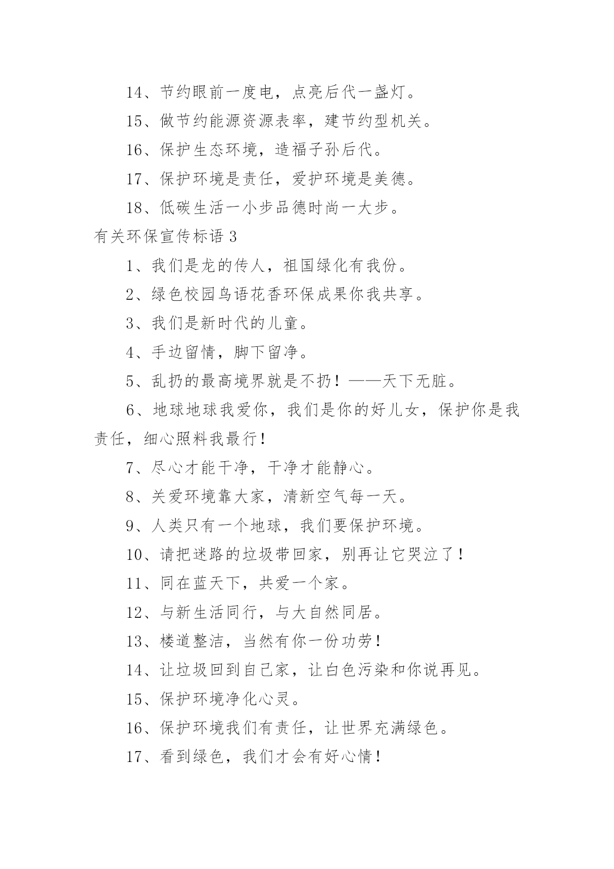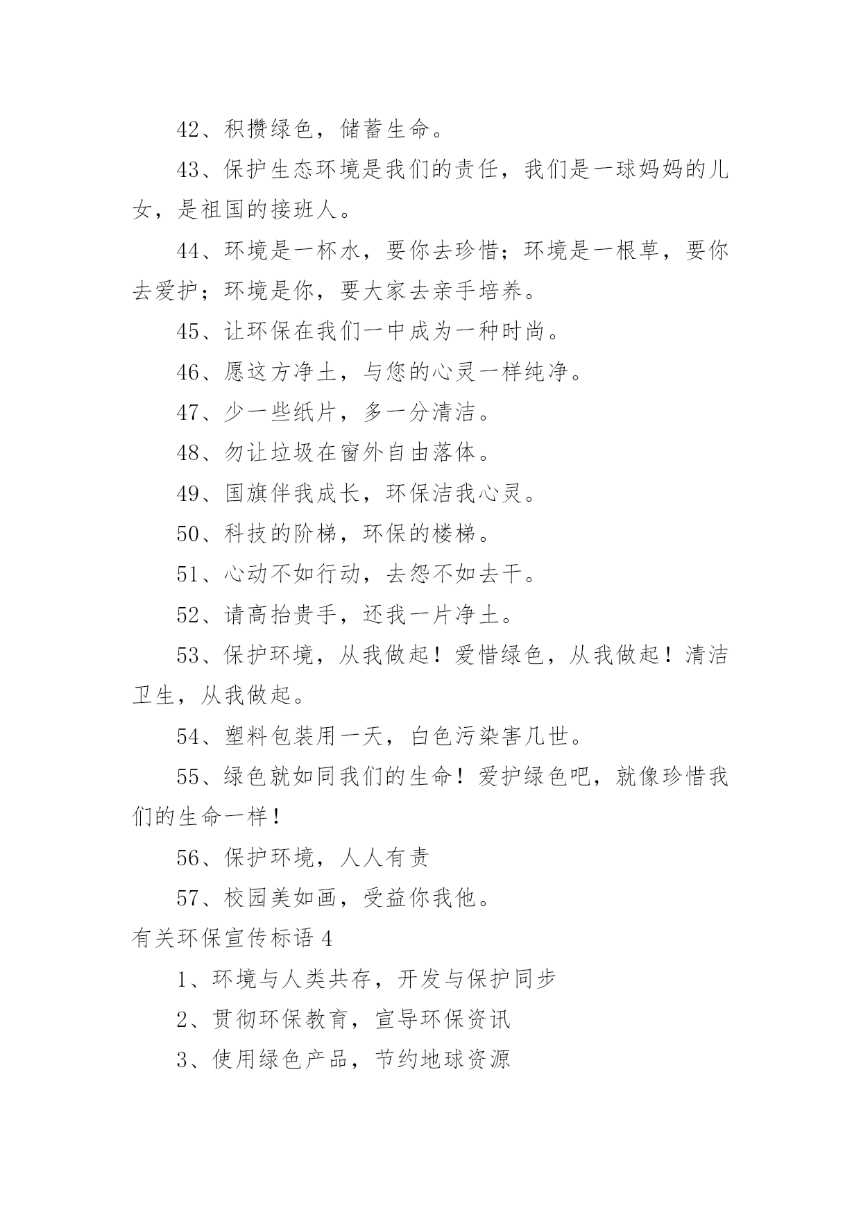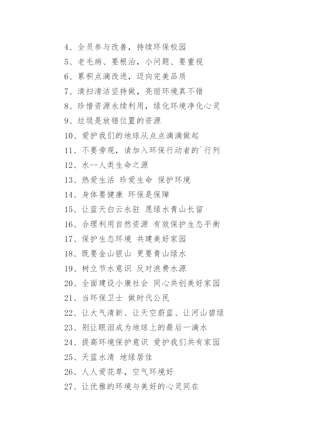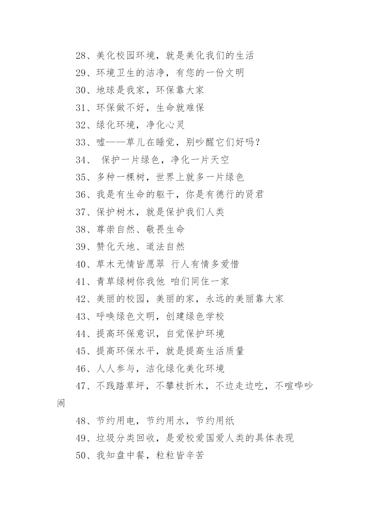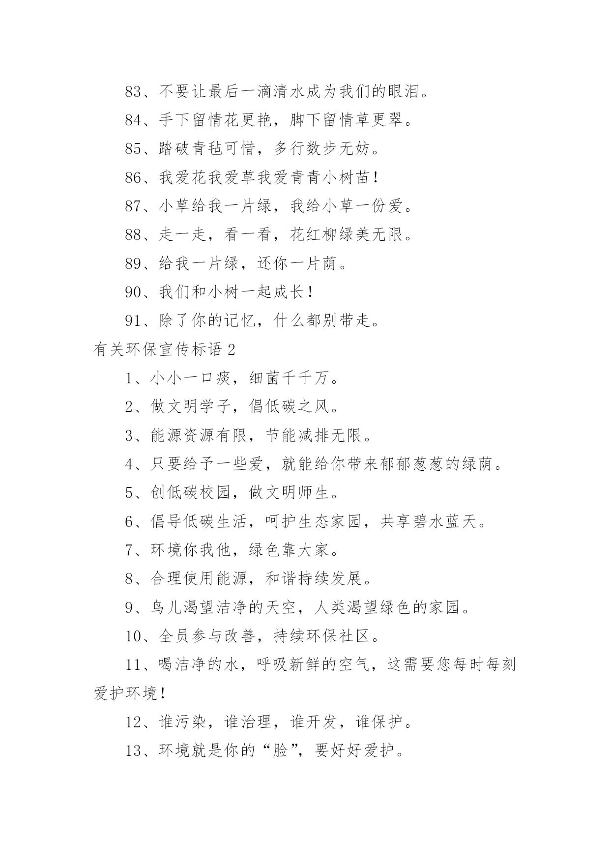 环保宣传标语有关环保宣传标语在学习、工作乃至生活中,大家总少不了接触一些耳熟能详的标语吧,标语以其时间性、阶段性和空间性的特色,表示着不同时代和不同地区人们的生活重点。你还在找寻优秀经典的标语吗?以下是小编为大家整理的有关环保宣传标语,欢迎大家分享。有关环保宣传标语11、花草诚美丽,手脚要留情。2、为了你我的健康,请爱护树木。3、花木有情报春晖,同学爱护喜心扉。4、请爱护花草树木吧,它将给你绿色的生命!5、爱护花草树木,保护环境。6、爱心给绿色,树木更树人。7、不要让最后一片绿色成为我们的梦想。8、绿草茵茵,踏之可惜。9、用心爱护每一片绿色。10、请你别踩我,我怕你的脚。11、绿色无处不在,人类无比可爱。12、天更蓝草更绿花更艳。13、手下留情,脚下留青。14、森林是氧气的制造工厂。15、我很怕羞,请别碰我!16、让草更嫩绿,让心灵更美丽。17、绿色的植物就是我们的宝贝,宝贝需要我们爱护它。18、少一串脚印,多一份绿意。19、文物见证历史,划痕留下不齿。20、欲揽春色入自家,无可奈何成落花。21、花香迷人,需要您的呵护。22、愿君莫伸折枝手,鲜花亦自有泪滴。23、芳草依依,大家怜惜。24、爱护花草树木,不攀折,不伤害。25、编织爱心,保护环境。26、保护树木,就是保护自己。27、我口渴了,请帮我浇下水吧!28、绿化家园,文明人心。29、踏破青毡可惜,多行数步何妨。30、谈吐不凡人人夸,随地吐痰惹人烦。31、除了你的笑脸,什么都别留下。32、一花一世界,一草一段情,万物皆有灵!33、青青绿草地,悠悠关我心。34、爱护花草树木,人人有责。35、绿色——生命之源。36、可爱小草有生命,人们践踏多可惜。37、保护绿色,绿色伴我一生。38、除了相片,什么都不要带走;除了脚印,什么都不要留下。39、请您绕一绕,小草笑一笑。40、城市属于你,绿茵属于你。41、不摘花不踏草不折树枝不乱摇!42、小草正在生长,踏入请想一想。43、爱护花草,从我做起。44、小花多可爱,请你别伤害。45、请您爱护绿色,绿是生命之源。46、种一棵树,绿一片天。47、小脚不乱跑,小草微微笑。48、小草在成长,请勿打扰。49、让花更红草更绿心灵更美。50、请高抬贵脚,饶了你脚下的小花小草。51、多种一棵绿树,多添一份希望。52、草木亦通灵,踏之何忍?53、环境与人类共存,开发与保护同步。54、用我们的双手栽下漫天的绿色用我们的心灵守望五彩的家园。55、绿色草坪,无须纸化点缀。56、天是蓝的,草是绿的,心是纯粹的。57、请让我们的腰杆永远挺直!58、让小树和我们一起快乐成长!59、一花一草皆生命,一枝一叶总关情。60、天更蓝,树更绿,水更清,居更佳。61、手边留情花似锦,脚下留情草如茵。62、植一树绿荫,让鸟雀不再离乡背井。63、山水美如画,咱是画中人。64、爱青山绿水,爱蓝天白云。65、花开堪赏直须赏,莫要折花空赏枝。66、当你不要我时,请把我送回家。67、绿色家园,伴我成长。68、红花绿草满园栽,风送花香碟时来。69、从前森林树,今日变秃木,环境需保护,重把家园组。70、爱护花草,爱护生灵。71、护一河绿水,让鱼儿重返故里家园。72、守护一片绿?,增添一份美?73、小草对你笑一笑,请你把路绕一绕!74、树木拥有了绿色,地球才能有脉搏。75、让话草有一片宁静的土地。76、花草丛中笑,园外赏其貌。77、让我们当环保小卫士,让我们的家园更美丽。78、我爱花,我爱草,我爱青青小树苗。79、绿色是暖色,多增添几片暖色,就会少一片冷色。80、一花一草皆生命,一枝一叶总关情。81、我也是生命,请脚下留情。82、我需要阳光水分,更需要你的关心和爱护。83、不要让最后一滴清水成为我们的眼泪。84、手下留情花更艳,脚下留情草更翠。85、踏破青毡可惜,多行数步无妨。86、我爱花我爱草我爱青青小树苗!87、小草给我一片绿,我给小草一份爱。88、走一走,看一看,花红柳绿美无限。89、给我一片绿,还你一片荫。90、我们和小树一起成长!91、除了你的记忆,什么都别带走。有关环保宣传标语21、小小一口痰,细菌千千万。2、做文明学子,倡低碳之风。3、能源资源有限,节能减排无限。4、只要给予一些爱,就能给你带来郁郁葱葱的绿荫。5、创低碳校园,做文明师生。6、倡导低碳生活,呵护生态家园,共享碧水蓝天。7、环境你我他,绿色靠大家。8、合理使用能源,和谐持续发展。9、鸟儿渴望洁净的天空,人类渴望绿色的家园。10、全员参与改善,持续环保社区。11、喝洁净的水,呼吸新鲜的空气,这需要您每时每刻爱护环境!12、谁污染,谁治理,谁开发,谁保护。13、环境就是你的“脸”,要好好爱护。14、节约眼前一度电,点亮后代一盏灯。15、做节约能源资源表率,建节约型机关。16、保护生态环境,造福子孙后代。17、保护环境是责任,
