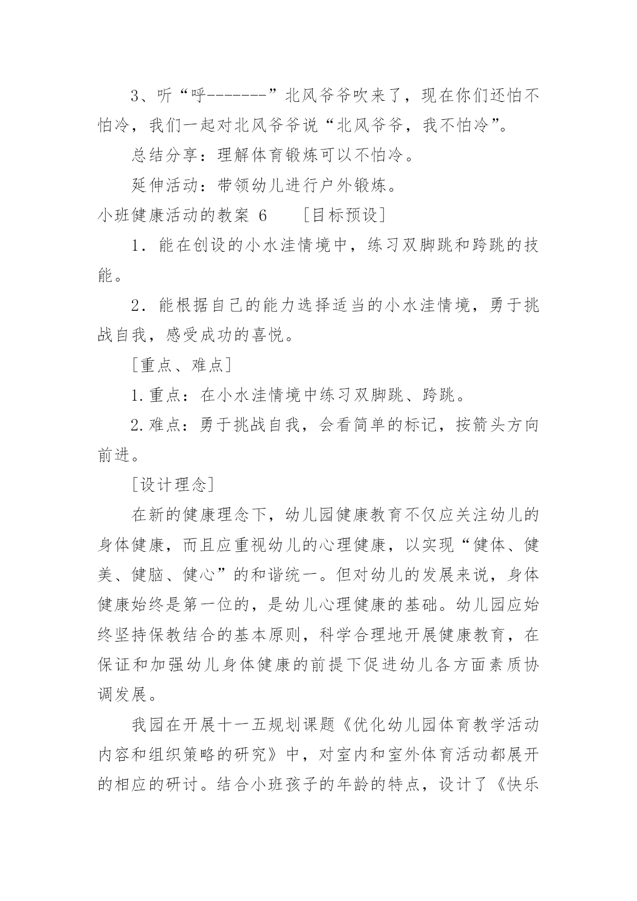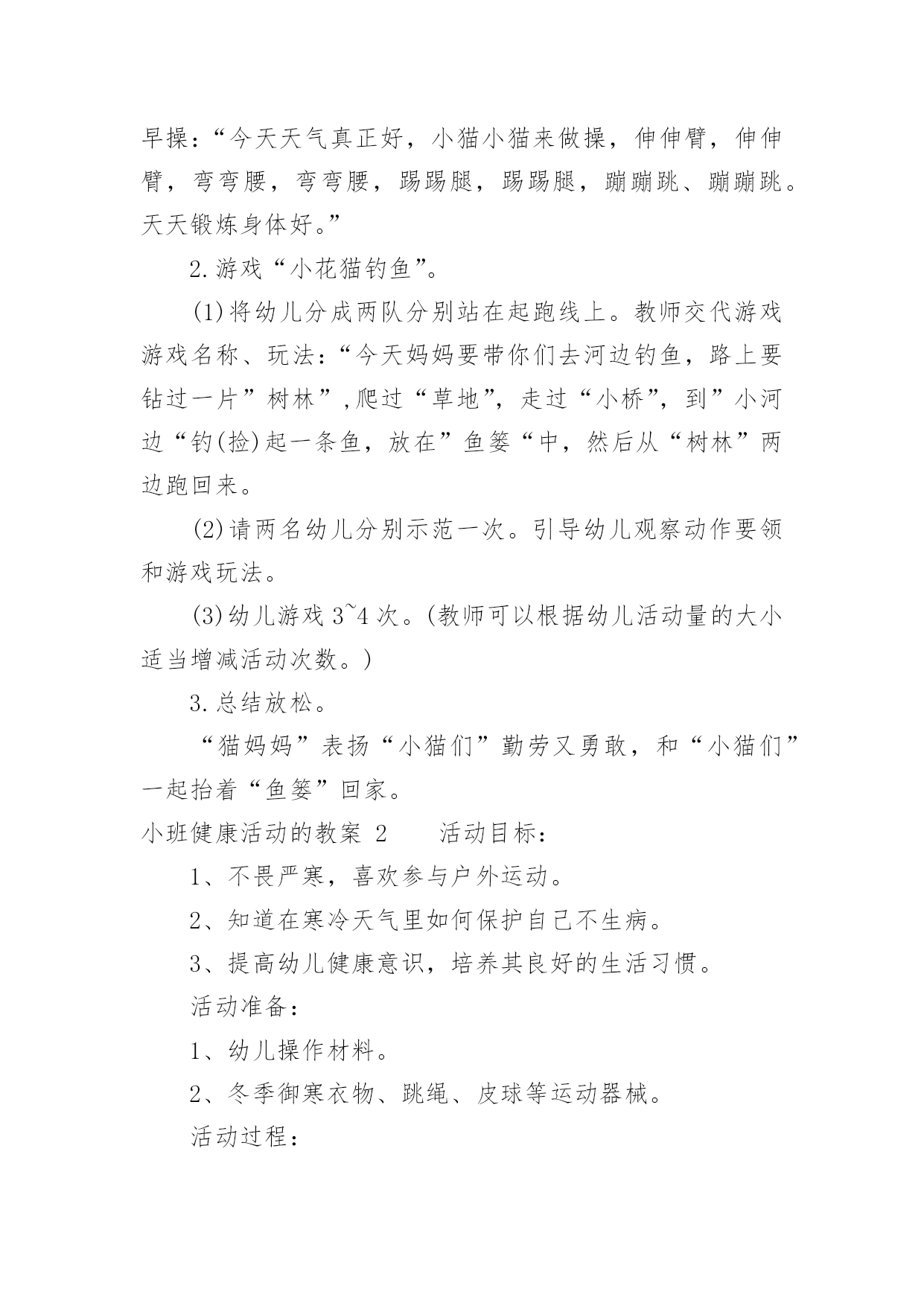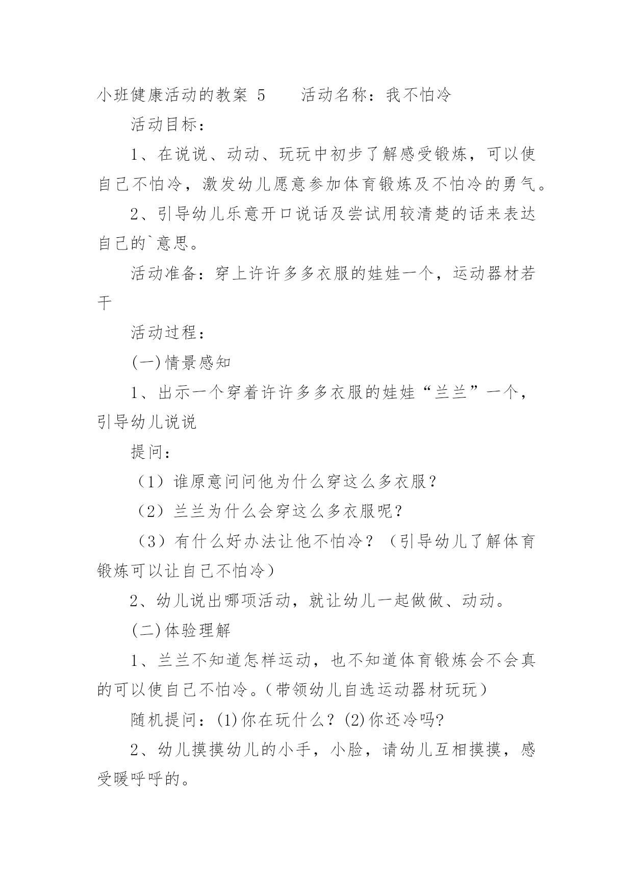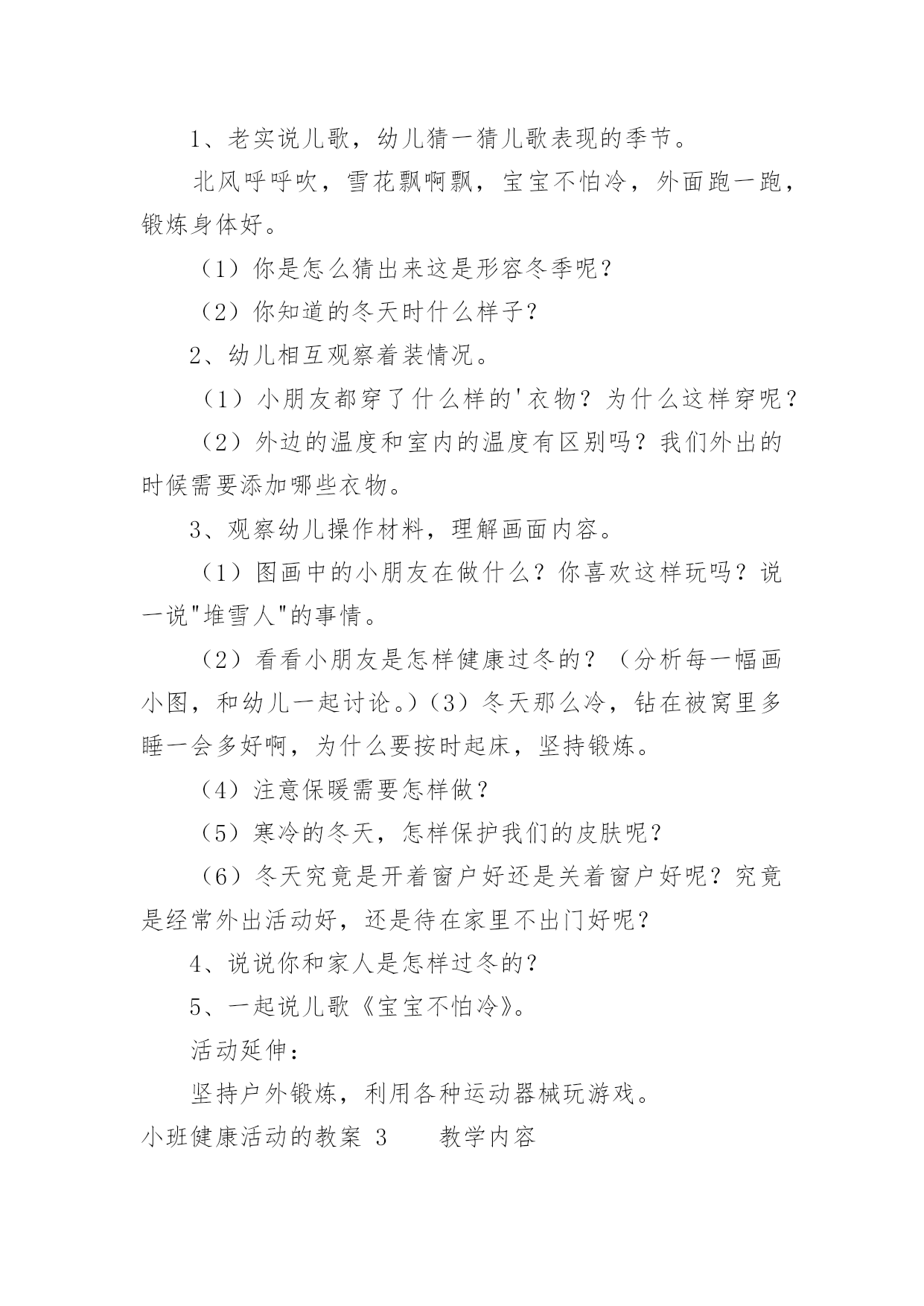 小班健康活动的教案小班健康活动的教案作为一位无私奉献的人民教师,常常要写一份优秀的教案,教案是教学蓝图,可以有效提高教学效率。那么大家知道正规的教案是怎么写的吗?下面是小编为大家整理的小班健康活动的教案,仅供参考,大家一起来看看吧。小班健康活动的教案1活动目标1.练习钻的动作,能够钻过70厘米高的障碍物。2.愿意参加体育活动,体验游戏的快乐。3.培养幼儿乐意在众人面前大胆发言的'习惯,学说普通话。4.促进幼儿的创新思维与动作协调发展。活动准备1.利用一条长皮筋(挂上绿色纸树叶)设置70厘米高的障碍物,小猫头饰每人一个2.若干小鱼图片四散放在场地一端,“鱼篓”两只。3.地垫、平衡木。4.音乐《早操歌模仿操》。活动过程1.教师扮演“猫妈妈”,带领幼儿做准备活动。(1)教师扮“猫妈妈”,幼儿扮“小猫”,一边喵喵叫一边走入活动场地。(2)“小猫”在“猫妈妈”带领下边念儿歌边愉快地做早操:“今天天气真正好,小猫小猫来做操,伸伸臂,伸伸臂,弯弯腰,弯弯腰,踢踢腿,踢踢腿,蹦蹦跳、蹦蹦跳。天天锻炼身体好。”2.游戏“小花猫钓鱼”。(1)将幼儿分成两队分别站在起跑线上。教师交代游戏游戏名称、玩法:“今天妈妈要带你们去河边钓鱼,路上要钻过一片”树林”,爬过“草地”,走过“小桥”,到”小河边“钓(捡)起一条鱼,放在”鱼篓“中,然后从“树林”两边跑回来。(2)请两名幼儿分别示范一次。引导幼儿观察动作要领和游戏玩法。(3)幼儿游戏3~4次。(教师可以根据幼儿活动量的大小适当增减活动次数。)3.总结放松。“猫妈妈”表扬“小猫们”勤劳又勇敢,和“小猫们”一起抬着“鱼篓”回家。小班健康活动的教案2活动目标:1、不畏严寒,喜欢参与户外运动。2、知道在寒冷天气里如何保护自己不生病。3、提高幼儿健康意识,培养其良好的生活习惯。活动准备:1、幼儿操作材料。2、冬季御寒衣物、跳绳、皮球等运动器械。活动过程:1、老实说儿歌,幼儿猜一猜儿歌表现的季节。北风呼呼吹,雪花飘啊飘,宝宝不怕冷,外面跑一跑,锻炼身体好。(1)你是怎么猜出来这是形容冬季呢?(2)你知道的冬天时什么样子?2、幼儿相互观察着装情况。(1)小朋友都穿了什么样的'衣物?为什么这样穿呢?(2)外边的温度和室内的温度有区别吗?我们外出的时候需要添加哪些衣物。3、观察幼儿操作材料,理解画面内容。(1)图画中的小朋友在做什么?你喜欢这样玩吗?说一说"堆雪人"的事情。(2)看看小朋友是怎样健康过冬的?(分析每一幅画小图,和幼儿一起讨论。)(3)冬天那么冷,钻在被窝里多睡一会多好啊,为什么要按时起床,坚持锻炼。(4)注意保暖需要怎样做?(5)寒冷的冬天,怎样保护我们的皮肤呢?(6)冬天究竟是开着窗户好还是关着窗户好呢?究竟是经常外出活动好,还是待在家里不出门好呢?4、说说你和家人是怎样过冬的?5、一起说儿歌《宝宝不怕冷》。活动延伸:坚持户外锻炼,利用各种运动器械玩游戏。小班健康活动的教案3教学内容小班健康活动:《亮眼看世界》教学目标1.了解眼睛的外观结构并指导眼睛看同一物体近大远小。2.学会保护眼睛的基本方法。3.乐于参与眼睛的小游戏。教学准备1.百宝箱:里面盛有不同的物体,如:梳子、钱包、书、糖果等。2.幼儿人手一面镜子。教学重点与难点重点:了解眼睛的外观结构和保护眼睛的基本方法。难点:初步懂得眼睛看同一物体近大远小。教学方法与手段观察法、讲述法、游戏法。设计意图请幼儿观察周围环境。(师:小朋友们,你们都看到了什么啊?)一、了解眼睛的结构,学会保护眼睛的基本方法。1.教师:你们刚才是用什么发现这些物体的呢?2.师:那现在我们就和小眼睛见面吧。请小朋友将自己小椅子下的小镜子拿出来,看看小眼睛是什么样的?3.幼儿观察眼睛,并说出眼白、眼睫毛、眼珠、眼皮、眼角、眼尾等。4.放下镜子,问幼儿平时都是怎么保护自己可爱的小眼睛的。幼儿边看边将看到的告诉老师。讲出:我们是用眼睛来看东西的。小朋友将自己小椅子下的小镜子拿出来,看看小眼睛是什么样的?讲讲怎么保护自己可爱的小眼睛的。通过用眼看一看、照一照让幼儿初步了解眼睛的外观结构。二、教师和幼儿共同玩游戏“亮亮的世界”,调整距离让幼儿知道同一物体近大远小。1.教师出示百宝箱,讲清游戏规则:幼儿站在原地,教师从百宝箱中取出物体,请幼儿观看,并请幼儿说出是什么物体。2.教师有意识得调整自己和幼儿之间的距离,让幼儿感受远近与物体观察到的大小的关系。从百宝箱中取出物体,并说出物体的名称。感受在近的地方看起来比较大,在远的地方看起来比较小。通过师幼共同玩游戏“亮亮的世界”,调整距离让幼儿了解同一物体近大远小。三、教师与幼儿共同玩游戏“听音乐找椅子”,培养幼儿对环境、物体的观察力。1.教师请幼儿认亲自己的小椅子上的标记,并讲清游戏规则:幼儿听音乐,当音乐停止后能迅速找到自己的椅子。2.教师