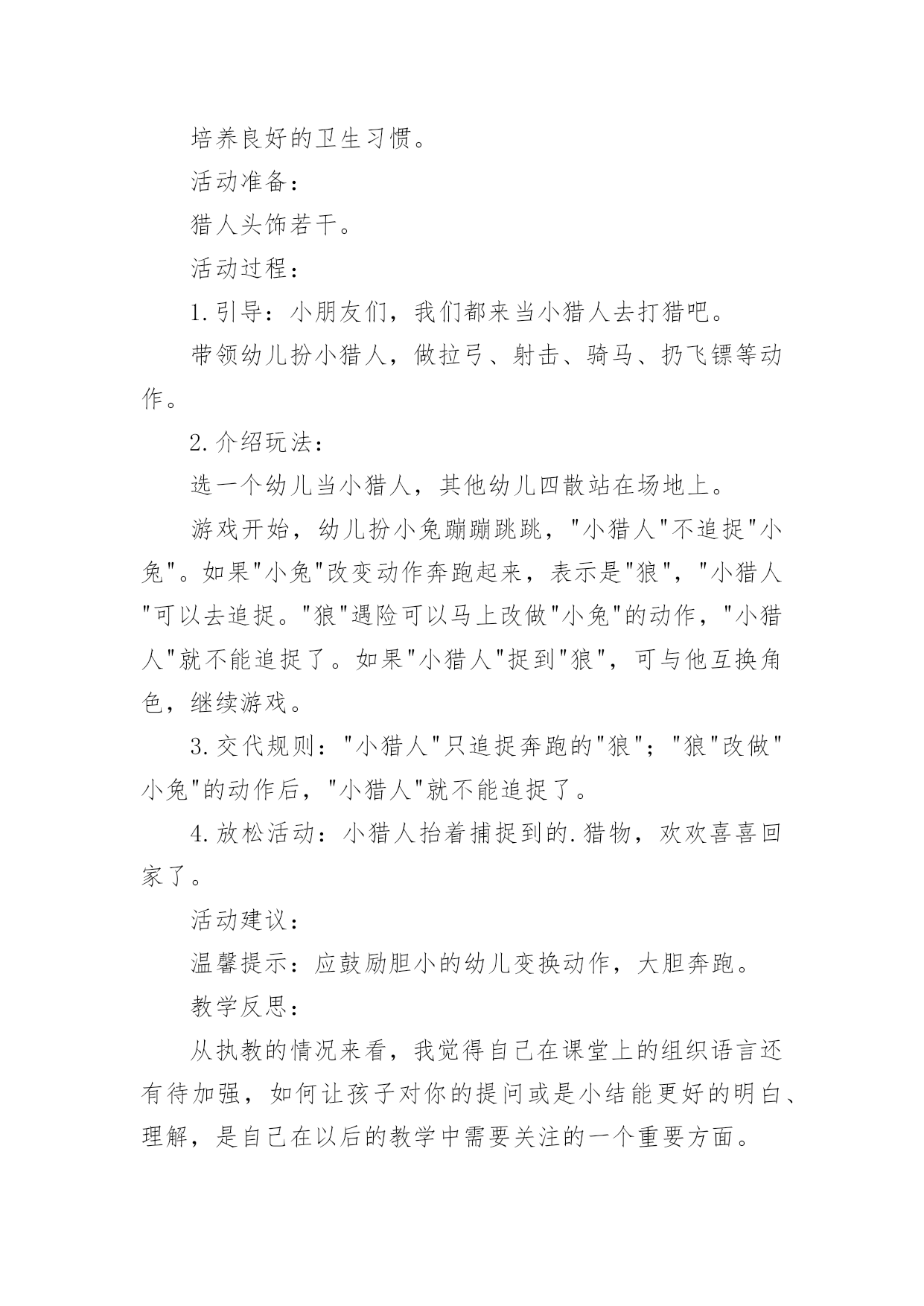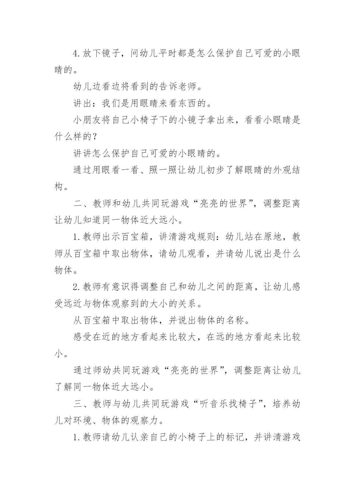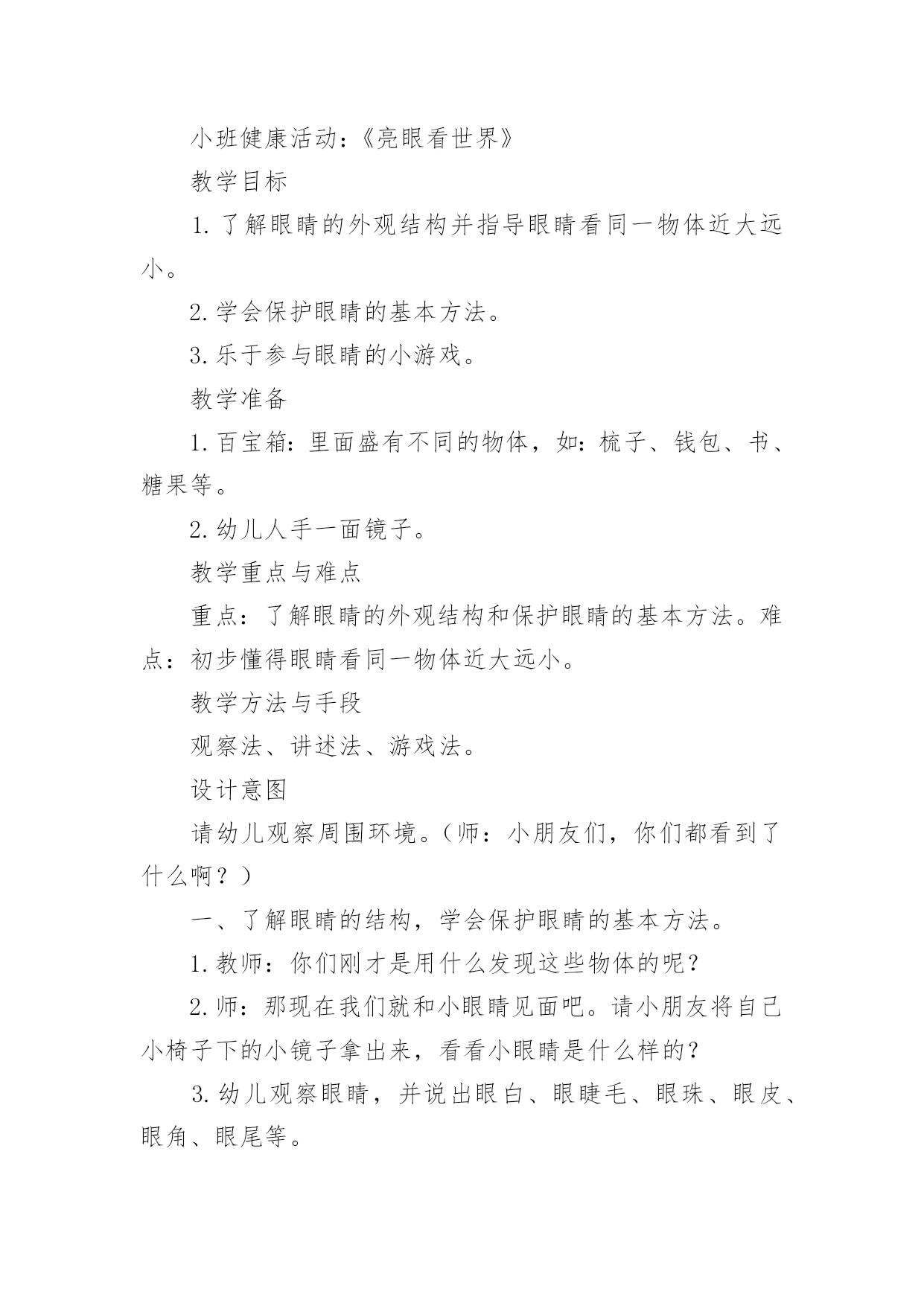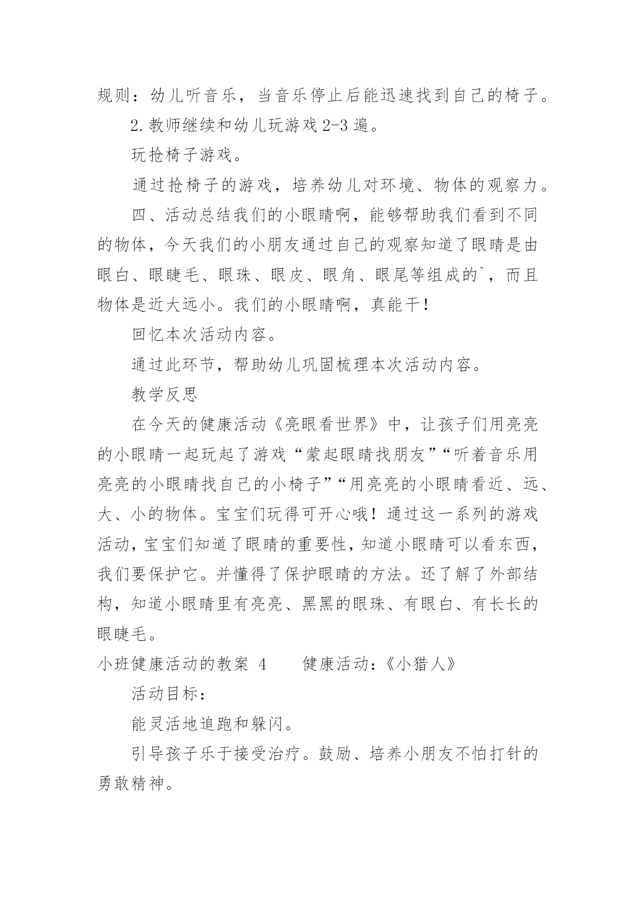 小班健康活动的教案小班健康活动的教案作为一位无私奉献的人民教师,常常要写一份优秀的教案,教案是教学蓝图,可以有效提高教学效率。那么大家知道正规的教案是怎么写的吗?下面是小编为大家整理的小班健康活动的教案,仅供参考,大家一起来看看吧。小班健康活动的教案1活动目标1.练习钻的动作,能够钻过70厘米高的障碍物。2.愿意参加体育活动,体验游戏的快乐。3.培养幼儿乐意在众人面前大胆发言的'习惯,学说普通话。4.促进幼儿的创新思维与动作协调发展。活动准备1.利用一条长皮筋(挂上绿色纸树叶)设置70厘米高的障碍物,小猫头饰每人一个2.若干小鱼图片四散放在场地一端,“鱼篓”两只。3.地垫、平衡木。4.音乐《早操歌模仿操》。活动过程1.教师扮演“猫妈妈”,带领幼儿做准备活动。(1)教师扮“猫妈妈”,幼儿扮“小猫”,一边喵喵叫一边走入活动场地。(2)“小猫”在“猫妈妈”带领下边念儿歌边愉快地做早操:“今天天气真正好,小猫小猫来做操,伸伸臂,伸伸臂,弯弯腰,弯弯腰,踢踢腿,踢踢腿,蹦蹦跳、蹦蹦跳。天天锻炼身体好。”2.游戏“小花猫钓鱼”。(1)将幼儿分成两队分别站在起跑线上。教师交代游戏游戏名称、玩法:“今天妈妈要带你们去河边钓鱼,路上要钻过一片”树林”,爬过“草地”,走过“小桥”,到”小河边“钓(捡)起一条鱼,放在”鱼篓“中,然后从“树林”两边跑回来。(2)请两名幼儿分别示范一次。引导幼儿观察动作要领和游戏玩法。(3)幼儿游戏3~4次。(教师可以根据幼儿活动量的大小适当增减活动次数。)3.总结放松。“猫妈妈”表扬“小猫们”勤劳又勇敢,和“小猫们”一起抬着“鱼篓”回家。小班健康活动的教案2活动目标:1、不畏严寒,喜欢参与户外运动。2、知道在寒冷天气里如何保护自己不生病。3、提高幼儿健康意识,培养其良好的生活习惯。活动准备:1、幼儿操作材料。2、冬季御寒衣物、跳绳、皮球等运动器械。活动过程:1、老实说儿歌,幼儿猜一猜儿歌表现的季节。北风呼呼吹,雪花飘啊飘,宝宝不怕冷,外面跑一跑,锻炼身体好。(1)你是怎么猜出来这是形容冬季呢?(2)你知道的冬天时什么样子?2、幼儿相互观察着装情况。(1)小朋友都穿了什么样的'衣物?为什么这样穿呢?(2)外边的温度和室内的温度有区别吗?我们外出的时候需要添加哪些衣物。3、观察幼儿操作材料,理解画面内容。(1)图画中的小朋友在做什么?你喜欢这样玩吗?说一说"堆雪人"的事情。(2)看看小朋友是怎样健康过冬的?(分析每一幅画小图,和幼儿一起讨论。)(3)冬天那么冷,钻在被窝里多睡一会多好啊,为什么要按时起床,坚持锻炼。(4)注意保暖需要怎样做?(5)寒冷的冬天,怎样保护我们的皮肤呢?(6)冬天究竟是开着窗户好还是关着窗户好呢?究竟是经常外出活动好,还是待在家里不出门好呢?4、说说你和家人是怎样过冬的?5、一起说儿歌《宝宝不怕冷》。活动延伸:坚持户外锻炼,利用各种运动器械玩游戏。小班健康活动的教案3教学内容小班健康活动:《亮眼看世界》教学目标1.了解眼睛的外观结构并指导眼睛看同一物体近大远小。2.学会保护眼睛的基本方法。3.乐于参与眼睛的小游戏。教学准备1.百宝箱:里面盛有不同的物体,如:梳子、钱包、书、糖果等。2.幼儿人手一面镜子。教学重点与难点重点:了解眼睛的外观结构和保护眼睛的基本方法。难点:初步懂得眼睛看同一物体近大远小。教学方法与手段观察法、讲述法、游戏法。设计意图请幼儿观察周围环境。(师:小朋友们,你们都看到了什么啊?)一、了解眼睛的结构,学会保护眼睛的基本方法。1.教师:你们刚才是用什么发现这些物体的呢?2.师:那现在我们就和小眼睛见面吧。请小朋友将自己小椅子下的小镜子拿出来,看看小眼睛是什么样的?3.幼儿观察眼睛,并说出眼白、眼睫毛、眼珠、眼皮、眼角、眼尾等。4.放下镜子,问幼儿平时都是怎么保护自己可爱的小眼睛的。幼儿边看边将看到的告诉老师。讲出:我们是用眼睛来看东西的。小朋友将自己小椅子下的小镜子拿出来,看看小眼睛是什么样的?讲讲怎么保护自己可爱的小眼睛的。通过用眼看一看、照一照让幼儿初步了解眼睛的外观结构。二、教师和幼儿共同玩游戏“亮亮的世界”,调整距离让幼儿知道同一物体近大远小。1.教师出示百宝箱,讲清游戏规则:幼儿站在原地,教师从百宝箱中取出物体,请幼儿观看,并请幼儿说出是什么物体。2.教师有意识得调整自己和幼儿之间的距离,让幼儿感受远近与物体观察到的大小的关系。从百宝箱中取出物体,并说出物体的名称。感受在近的地方看起来比较大,在远的地方看起来比较小。通过师幼共同玩游戏“亮亮的世界”,调整距离让幼儿了解同一物体近大远小。三、教师与幼儿共同玩游戏“听音乐找椅子”,培养幼儿对环境、物体的观察力。1.教师请幼儿认亲自己的小椅子上的标记,并讲清游戏规则:幼儿听音乐,当音乐停止后能迅速找到自己的椅子。2.教师