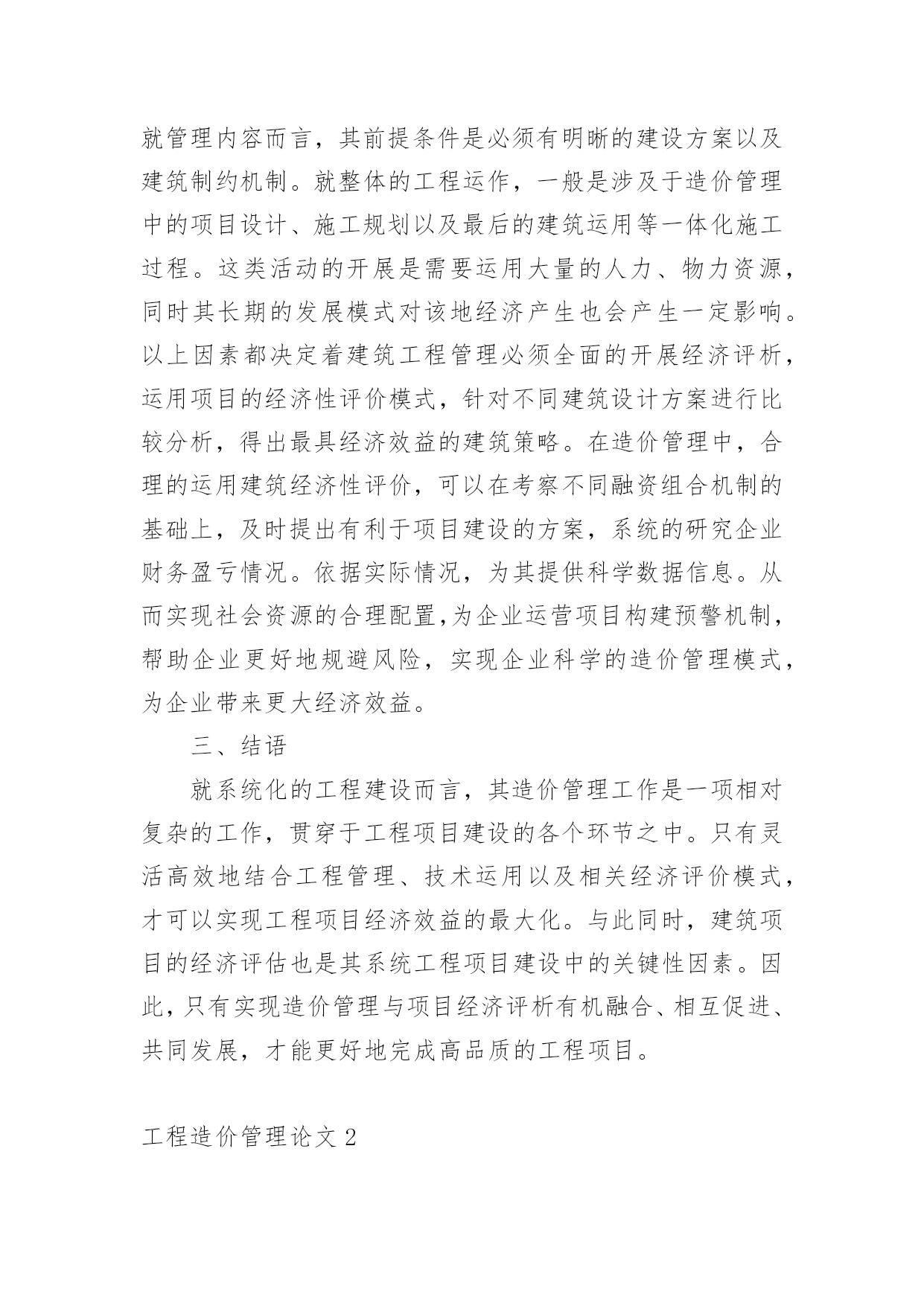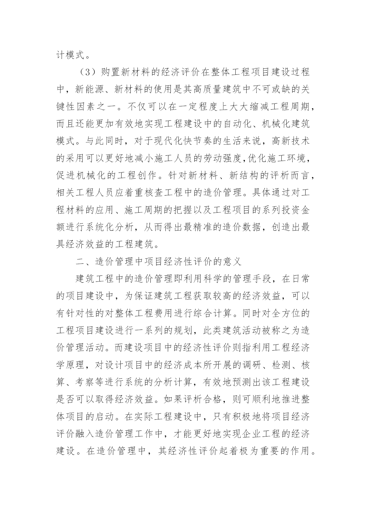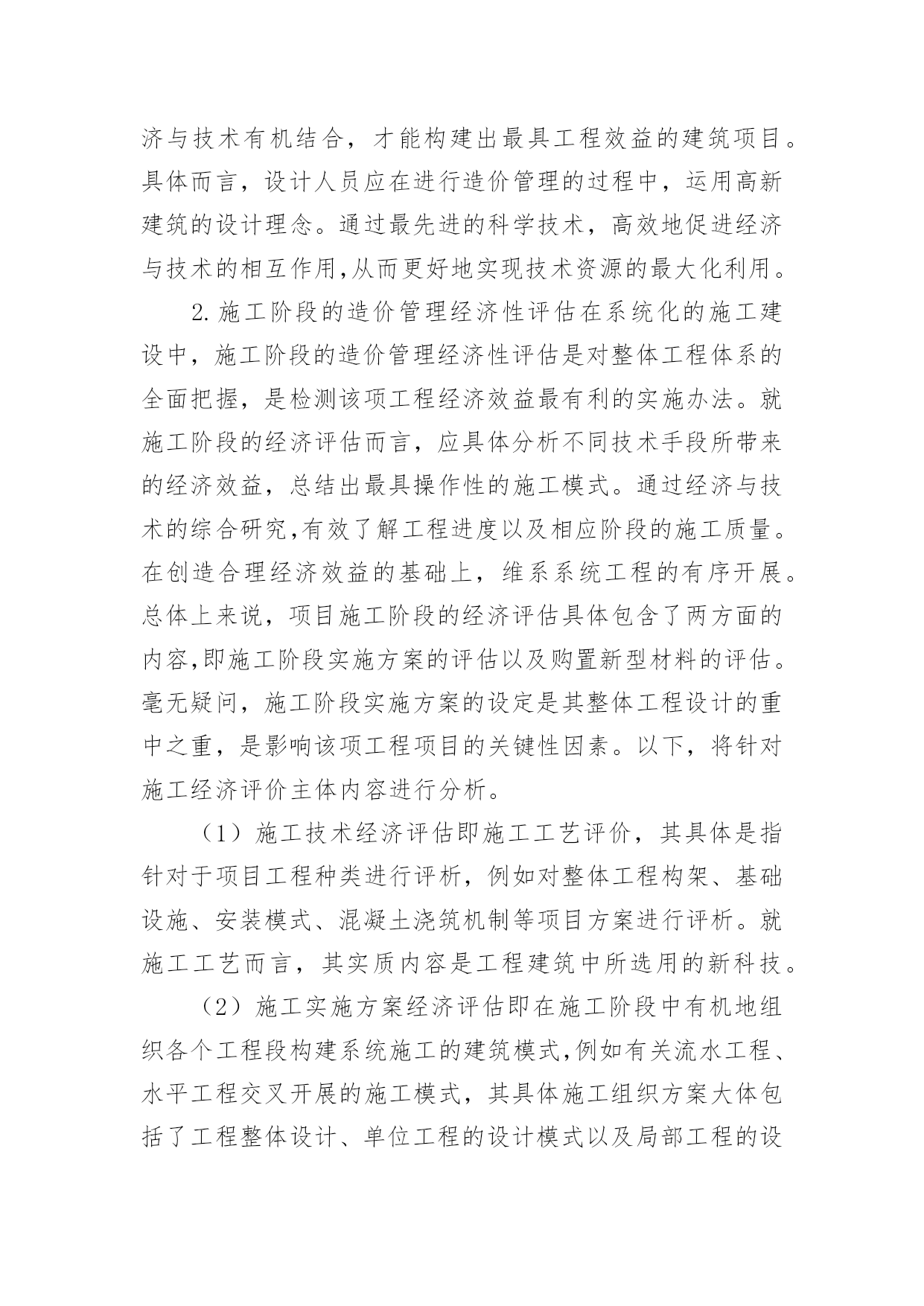 工程造价管理论文在平平淡淡的日常中,大家都有写论文的经历,对论文很是熟悉吧,论文是探讨问题进行学术研究的一种手段。那么,怎么去写论文呢?以下是小编精心整理的工程造价管理论文,欢迎阅读与收藏。工程造价管理论文1一、建筑工程经济评估1.设计阶段的造价管理经济性评估在建筑项目工程设计活动开展前,应在着重维系系统工程经济效益的前提下,切实保证整体工程项目的完成质量。运用科学的施工模式,实现建筑资源的高效利用。在节省施工成本的基础上,创造最为可观的经济收入。简而言之,即在相同外部条件下,获取最好的施工质量,实现建筑技术的经济化发展。就目前情况来说,在建筑模式中制约经济增长的有机因子大体上包括:第一,阻断外界环境的干扰,开展自我调节机制,就建筑设计阶段的疏漏进行片面地自我修正;第二,在建筑设计阶段,单纯寻求创新与独特而无视建筑物的实质用途以及其相关经济效益;第三,在建筑人员的设计理念中,通常会出现忽视经济效益的情况,其仅仅从单一技术层面出发往往是不够的。就目前情况而言,我国很多建筑工程在实施过程中通常只会思考该项技术是否具有可操作性,而不考虑其所能带来的经济效益,从而使得整个工程项目架空。因此,只有将经济与技术有机结合,才能构建出最具工程效益的建筑项目。具体而言,设计人员应在进行造价管理的过程中,运用高新建筑的设计理念。通过最先进的科学技术,高效地促进经济与技术的相互作用,从而更好地实现技术资源的最大化利用。2.施工阶段的造价管理经济性评估在系统化的施工建设中,施工阶段的造价管理经济性评估是对整体工程体系的全面把握,是检测该项工程经济效益最有利的实施办法。就施工阶段的经济评估而言,应具体分析不同技术手段所带来的经济效益,总结出最具操作性的施工模式。通过经济与技术的综合研究,有效了解工程进度以及相应阶段的施工质量。在创造合理经济效益的基础上,维系系统工程的有序开展。总体上来说,项目施工阶段的经济评估具体包含了两方面的内容,即施工阶段实施方案的评估以及购置新型材料的评估。毫无疑问,施工阶段实施方案的设定是其整体工程设计的重中之重,是影响该项工程项目的关键性因素。以下,将针对施工经济评价主体内容进行分析。(1)施工技术经济评估即施工工艺评价,其具体是指针对于项目工程种类进行评析,例如对整体工程构架、基础设施、安装模式、混凝土浇筑机制等项目方案进行评析。就施工工艺而言,其实质内容是工程建筑中所选用的新科技。(2)施工实施方案经济评估即在施工阶段中有机地组织各个工程段构建系统施工的建筑模式,例如有关流水工程、水平工程交叉开展的施工模式,其具体施工组织方案大体包括了工程整体设计、单位工程的设计模式以及局部工程的设计模式。(3)购置新材料的经济评价在整体工程项目建设过程中,新能源、新材料的使用是其高质量建筑中不可或缺的关键性因素之一。不仅可以在一定程度上大大缩减工程周期,而且还能更加有效地实现工程建设中的自动化、机械化建筑模式。与此同时,对于现代化快节奏的生活来说,高新技术的采用可以更好地减小施工人员的劳动强度,优化施工环境,促进机械化的工程创作。针对新材料、新结构的评析而言,相关工程人员应着重核查工程中的造价管理。具体通过对工程材料的应用、施工周期的把握以及工程项目的系列投资金额进行系统化分析,从而得出最精准的造价数据,创造出最具经济效益的工程建筑。二、造价管理中项目经济性评价的意义建筑工程中的造价管理即利用科学的管理手段,在日常的项目建设中,为保证建筑工程获取较高的经济效益,可以有针对性的对整体工程费用进行综合计算。同时对全方位的工程项目建设进行一系列的规划,此类建筑活动被称之为造价管理活动。而建设项目中的经济性评价则指利用工程经济学原理,对设计项目中的经济成本所开展的调研、检测、核算、考察等进行系统的分析计算,有效地预测出该工程建设是否可以取得经济效益。如果评析合格,则可顺利地推进整体项目的启动。在实际工程建设中,只有积极地将项目经济评价融入造价管理工作中,才能更好地实现企业工程的经济建设。在造价管理中,其经济性评价起着极为重要的作用。就管理内容而言,其前提条件是必须有明晰的建设方案以及建筑制约机制。就整体的工程运作,一般是涉及于造价管理中的项目设计、施工规划以及最后的建筑运用等一体化施工过程。这类活动的开展是需要运用大量的人力、物力资源,同时其长期的发展模式对该地经济产生也会产生一定影响。以上因素都决定着建筑工程管理必须全面的开展经济评析,运用项目的经济性评价模式,针对不同建筑设计方案进行比较分析,得出最具经济效益的建筑策略。在造价管理中,合理的运用建筑经济性评价,可以在考察不同融资组合机制的基础上,及时提出有利于项目建设的方案,系统的研究企业财务盈亏情况。依据实际情况,为其提供科学数据信息。从而实现社会资源的合理配置,为企业运营项目构建预