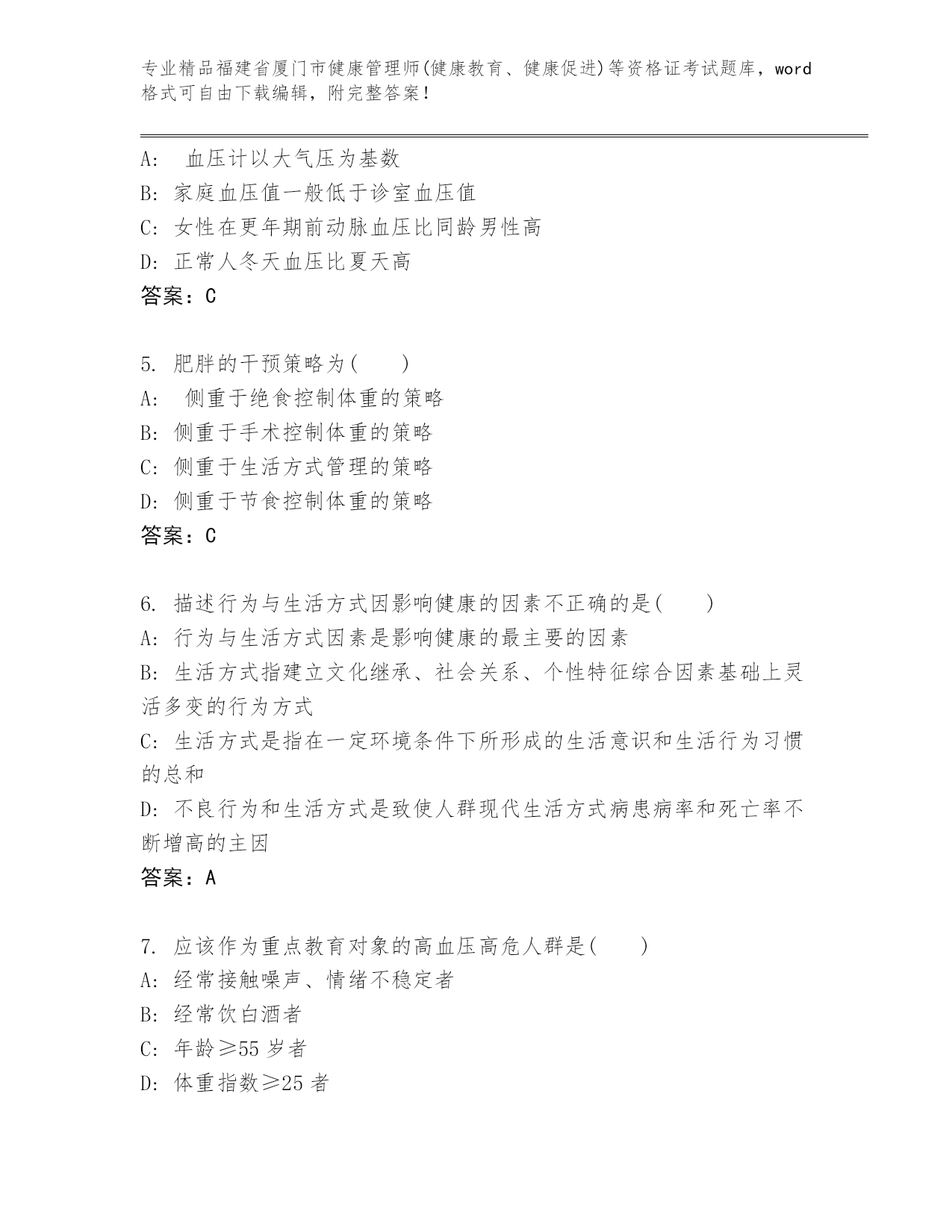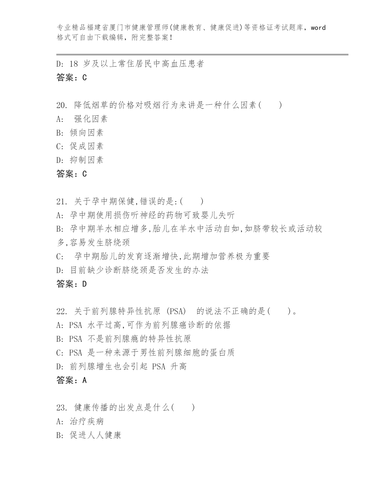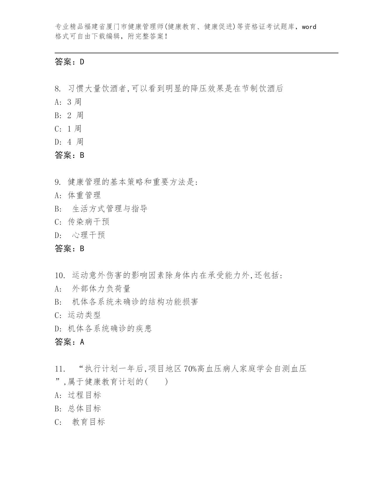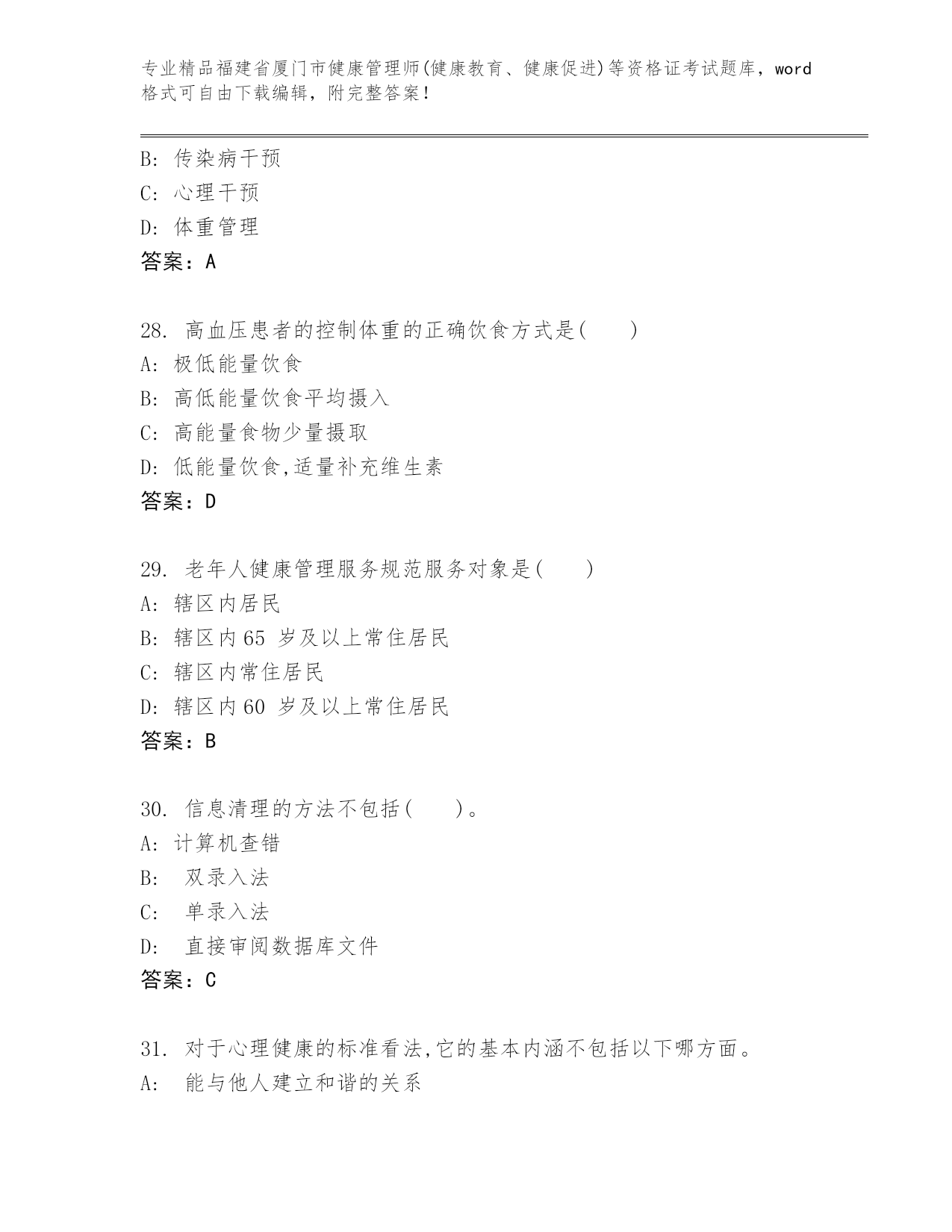 福建省厦门市健康管理师(健康教育、健康促进)等资格证考试附答案(考试直接用)