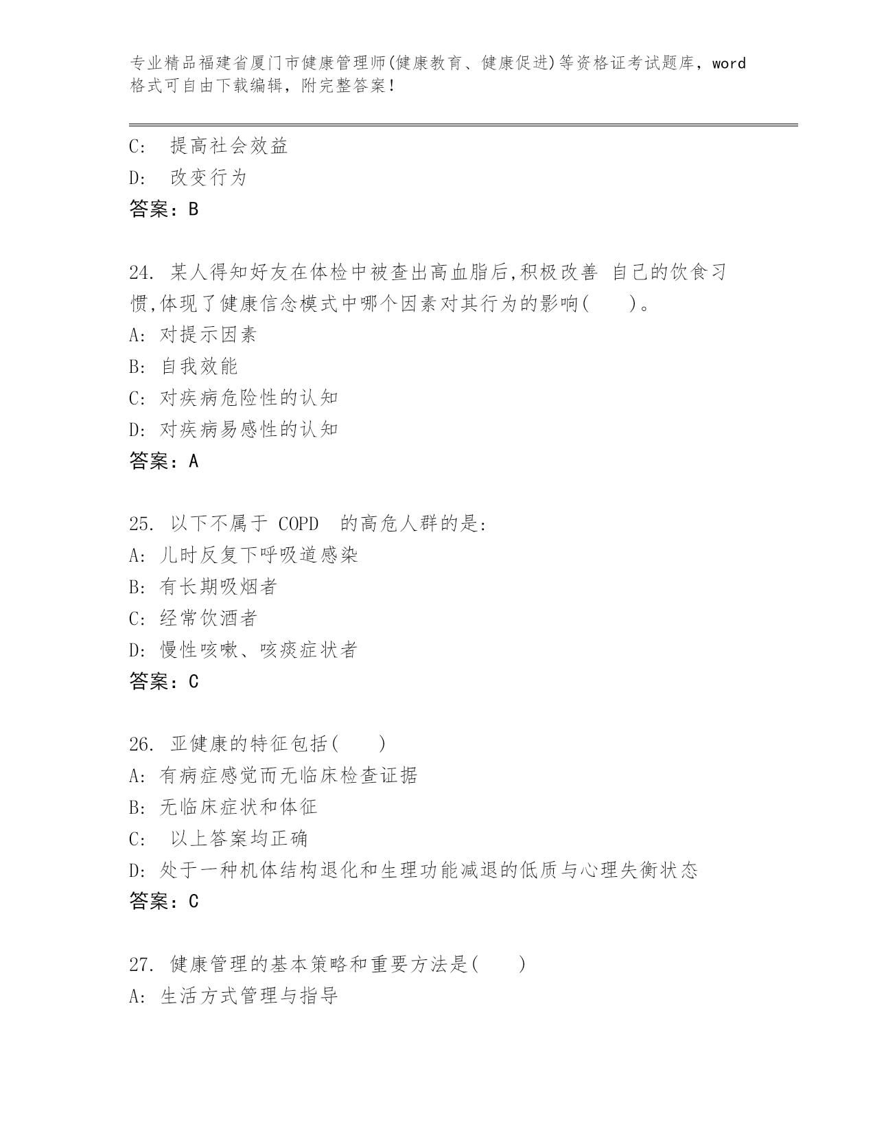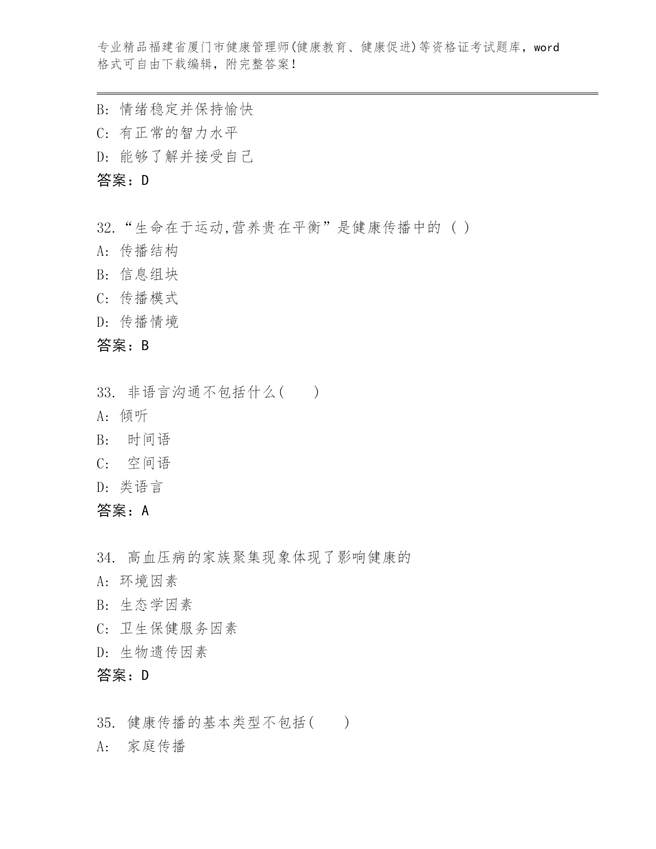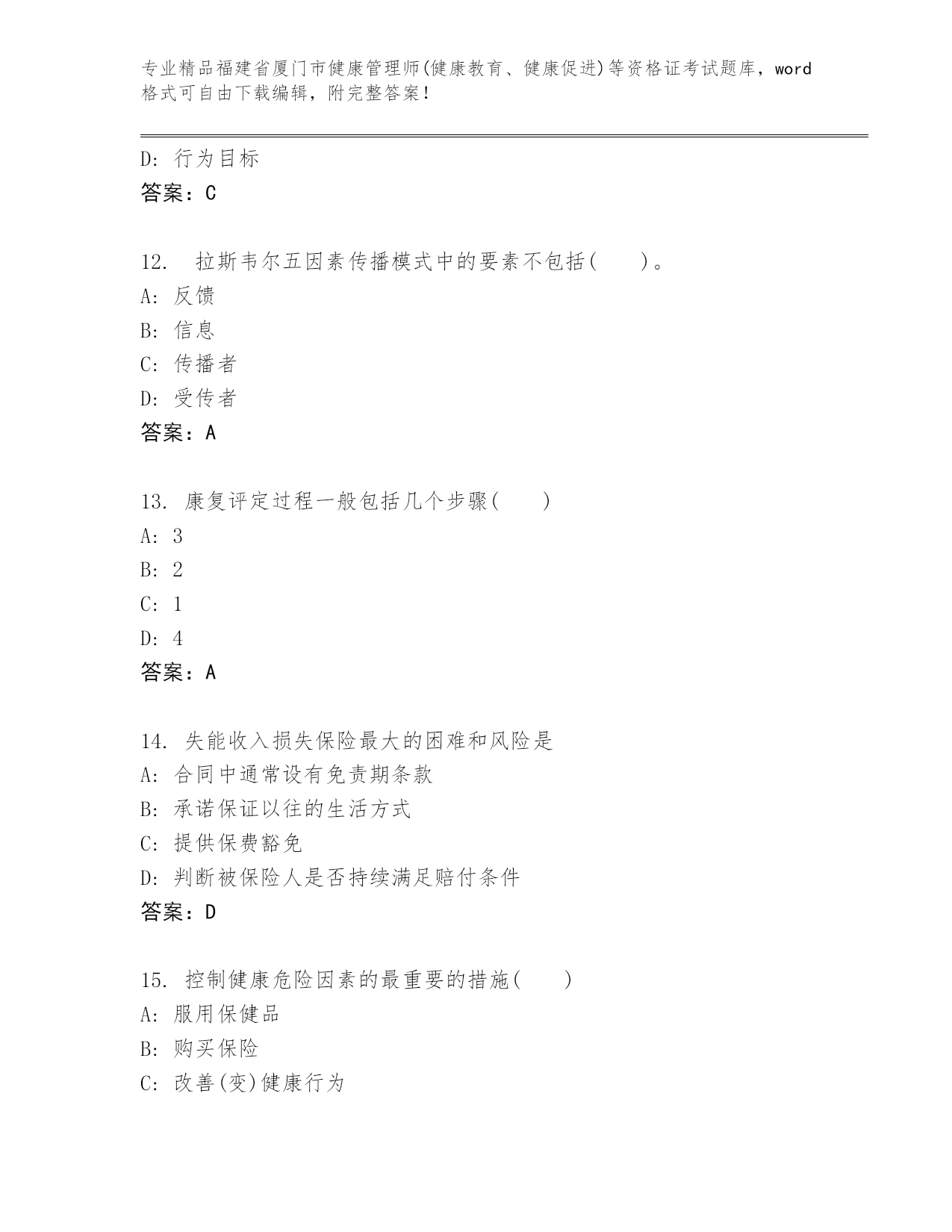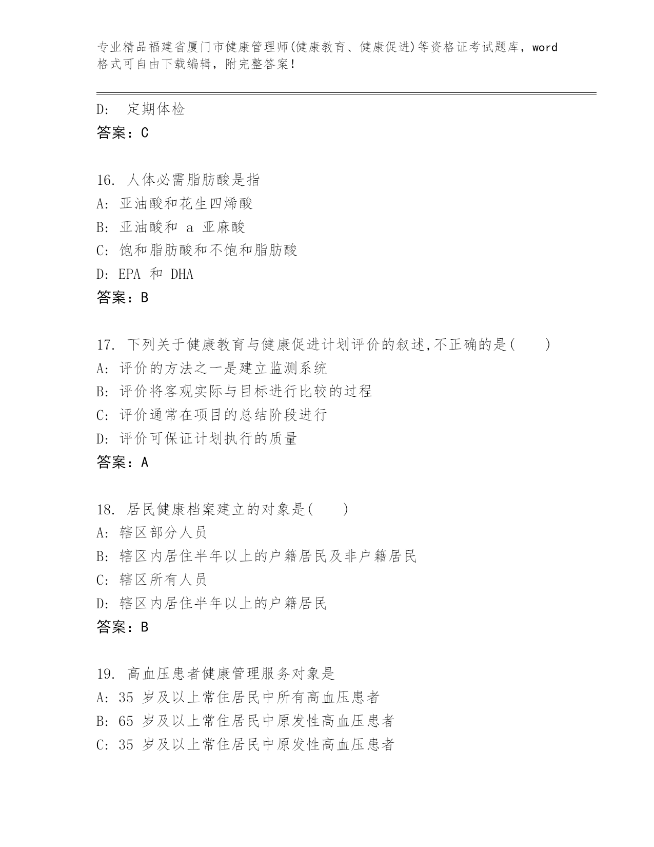 福建省厦门市健康管理师(健康教育、健康促进)等资格证考试附答案(考试直接用)