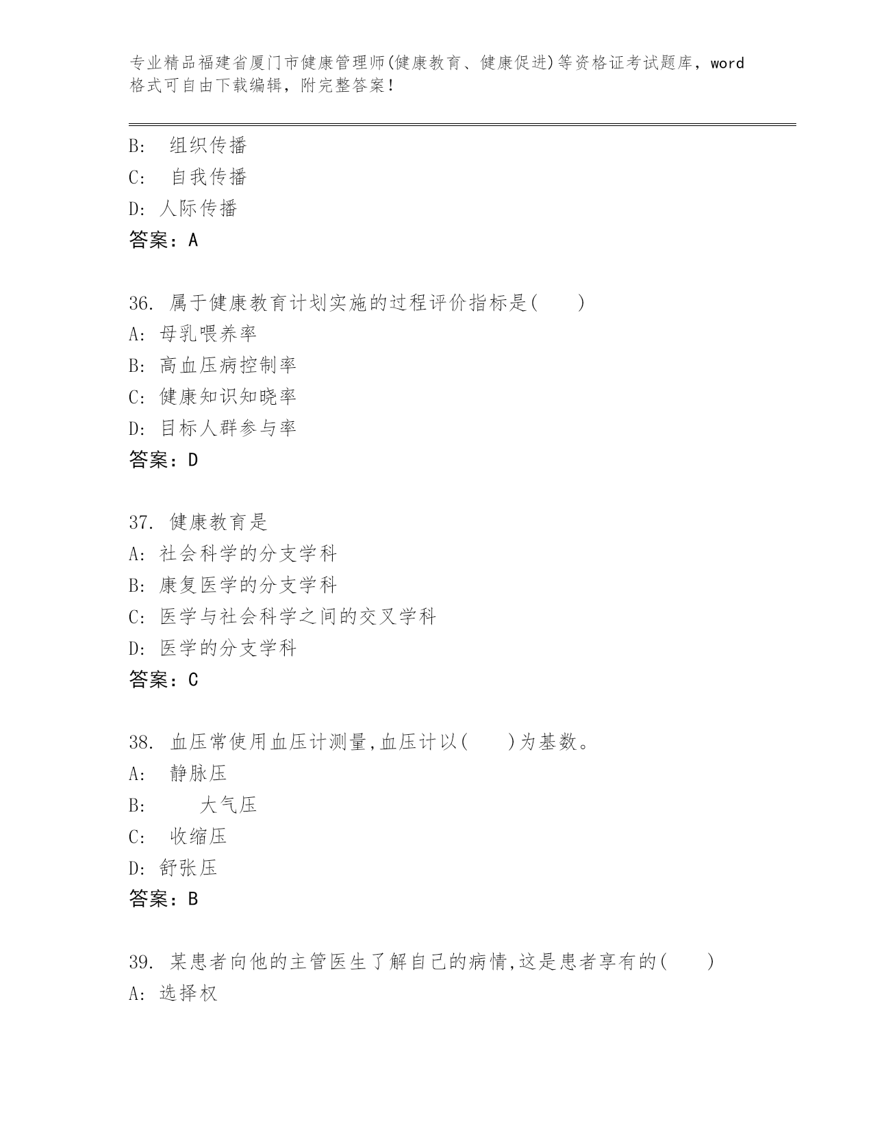 福建省厦门市健康管理师(健康教育、健康促进)等资格证考试附答案(考试直接用).docx