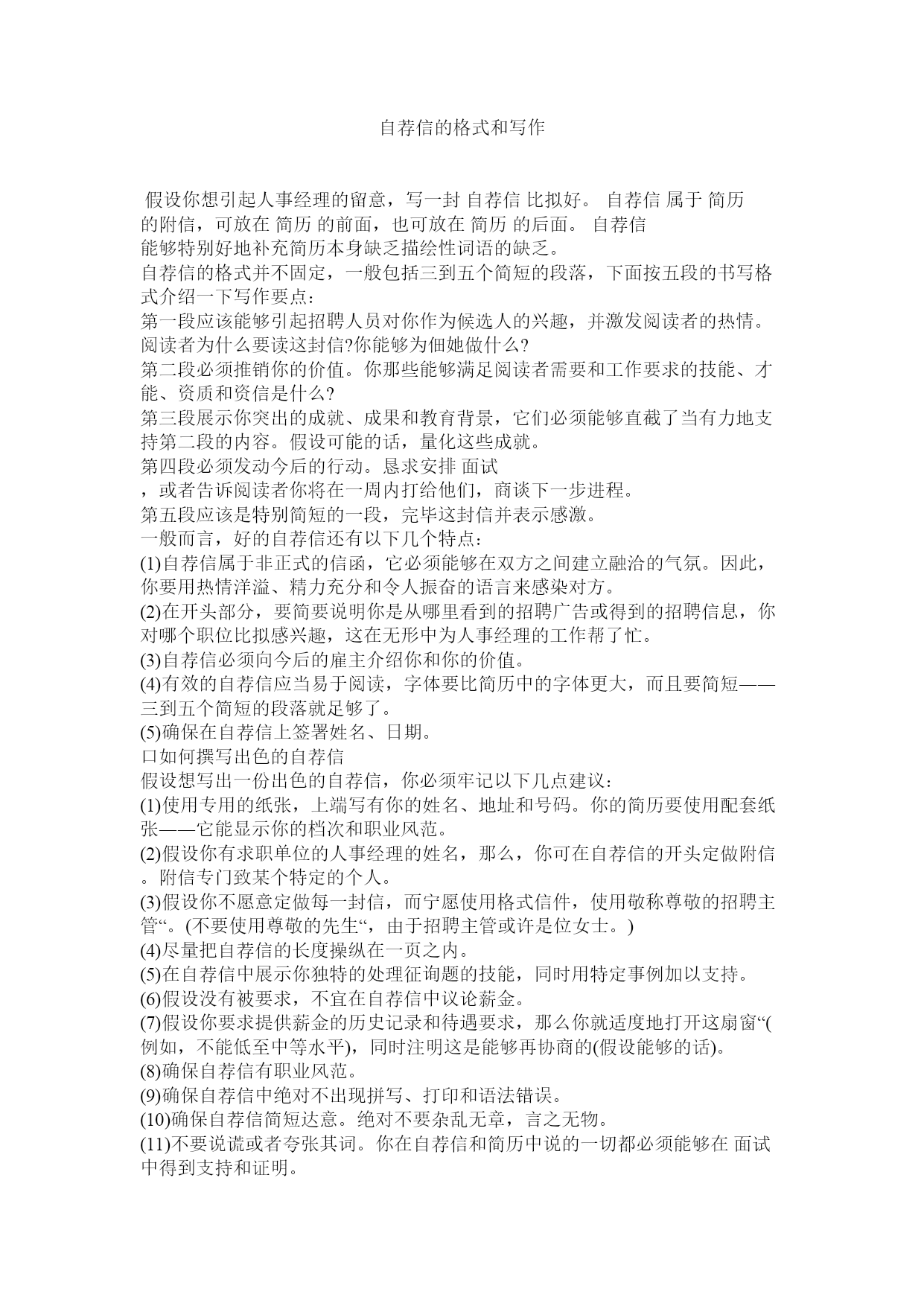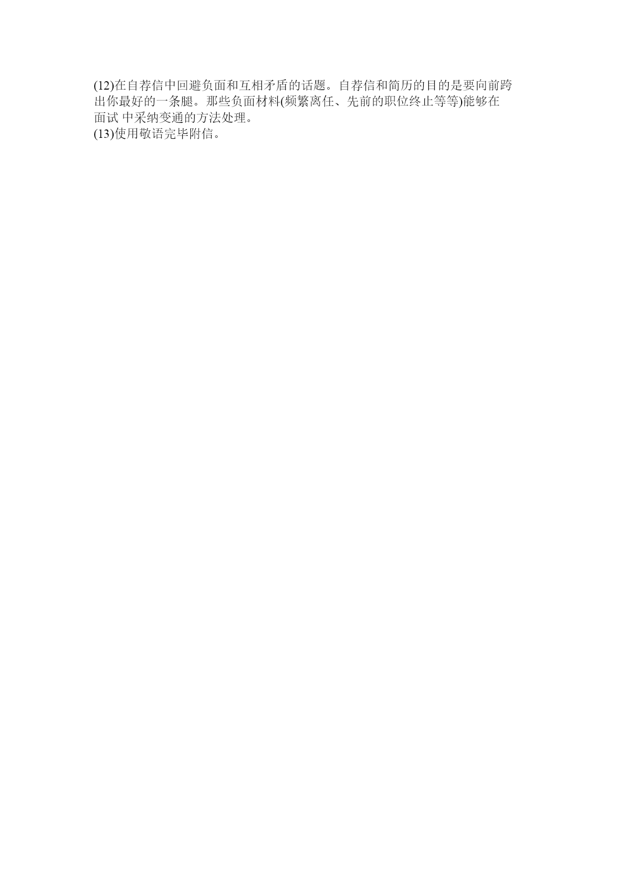 自荐信的格式和写作假设你想引起人事经理的留意,写一封自荐信比拟好。自荐信属于简历的附信,可放在简历的前面,也可放在简历的后面。自荐信能够特别好地补充简历本身缺乏描绘性词语的缺乏。自荐信的格式并不固定,一般包括三到五个简短的段落,下面按五段的书写格式介绍一下写作要点:第一段应该能够引起招聘人员对你作为候选人的兴趣,并激发阅读者的热情。阅读者为什么要读这封信?你能够为佃她做什么?第二段必须推销你的价值。你那些能够满足阅读者需要和工作要求的技能、才能、资质和资信是什么?第三段展示你突出的成就、成果和教育背景,它们必须能够直截了当有力地支持第二段的内容。假设可能的话,量化这些成就。第四段必须发动今后的行动。恳求安排面试,或者告诉阅读者你将在一周内打给他们,商谈下一步进程。第五段应该是特别简短的一段,完毕这封信并表示感激。一般而言,好的自荐信还有以下几个特点:(1)自荐信属于非正式的信函,它必须能够在双方之间建立融洽的气氛。因此,你要用热情洋溢、精力充分和令人振奋的语言来感染对方。(2)在开头部分,要简要说明你是从哪里看到的招聘广告或得到的招聘信息,你对哪个职位比拟感兴趣,这在无形中为人事经理的工作帮了忙。(3)自荐信必须向今后的雇主介绍你和你的价值。(4)有效的自荐信应当易于阅读,字体要比简历中的字体更大,而且要简短――三到五个简短的段落就足够了。(5)确保在自荐信上签署姓名、日期。口如何撰写出色的自荐信假设想写出一份出色的自荐信,你必须牢记以下几点建议:(1)使用专用的纸张,上端写有你的姓名、地址和号码。你的简历要使用配套纸张――它能显示你的档次和职业风范。(2)假设你有求职单位的人事经理的姓名,那么,你可在自荐信的开头定做附信。附信专门致某个特定的个人。(3)假设你不愿意定做每一封信,而宁愿使用格式信件,使用敬称尊敬的招聘主管“。(不要使用尊敬的先生“,由于招聘主管或许是位女士。)(4)尽量把自荐信的长度操纵在一页之内。(5)在自荐信中展示你独特的处理征询题的技能,同时用特定事例加以支持。(6)假设没有被要求,不宜在自荐信中议论薪金。(7)假设你要求提供薪金的历史记录和待遇要求,那么你就适度地打开这扇窗“(例如,不能低至中等水平),同时注明这是能够再协商的(假设能够的话)。(8)确保自荐信有职业风范。(9)确保自荐信中绝对不出现拼写、打印和语法错误。(10)确保自荐信简短达意。绝对不要杂乱无章,言之无物。(11)不要说谎或者夸张其词。你在自荐信和简历中说的一切都必须能够在面试中得到支持和证明。(12)在自荐信中回避负面和互相矛盾的话题。自荐信和简历的目的是要向前跨出你最好的一条腿。那些负面材料(频繁离任、先前的职位终止等等)能够在面试中采纳变通的方法处理。(13)使用敬语完毕附信。