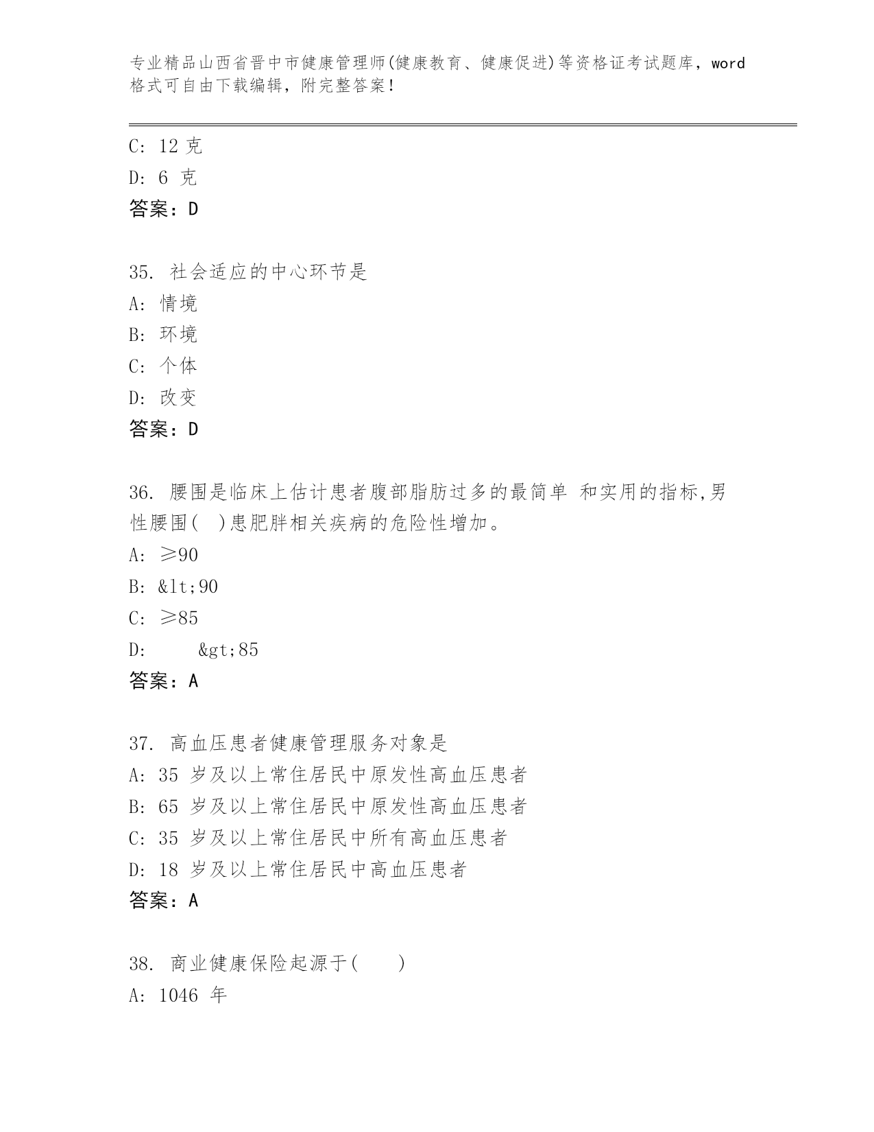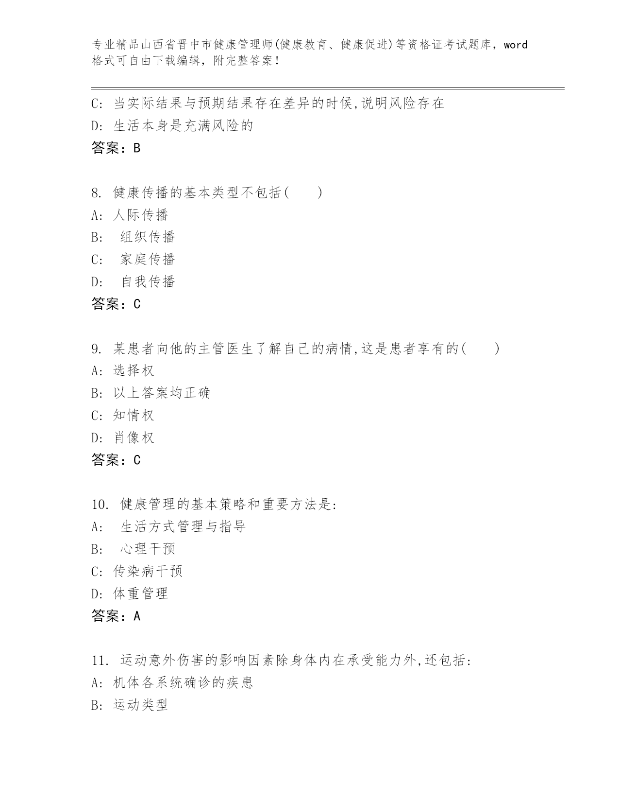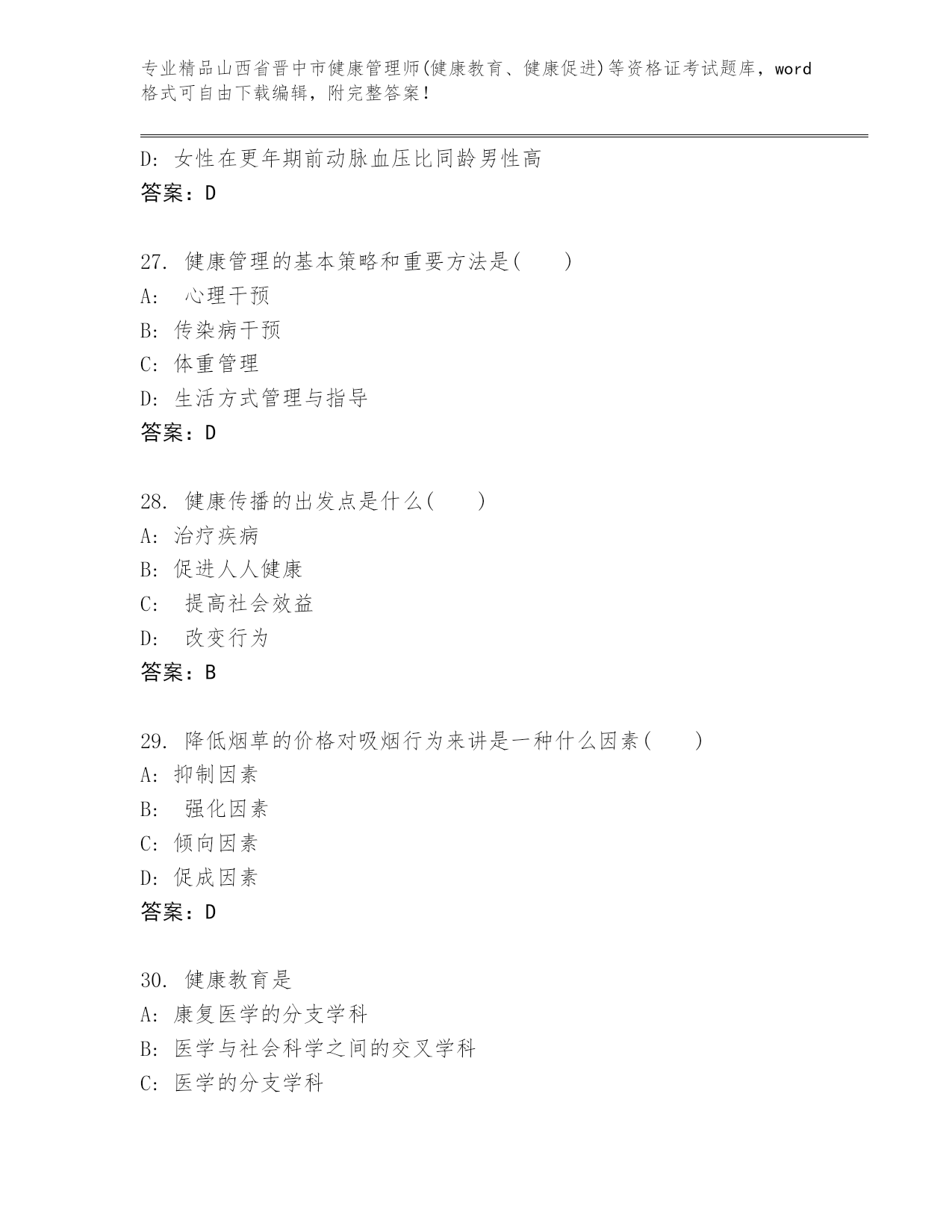 精编山西省晋中市健康管理师(健康教育、健康促进)等资格证考试(预热题).docx