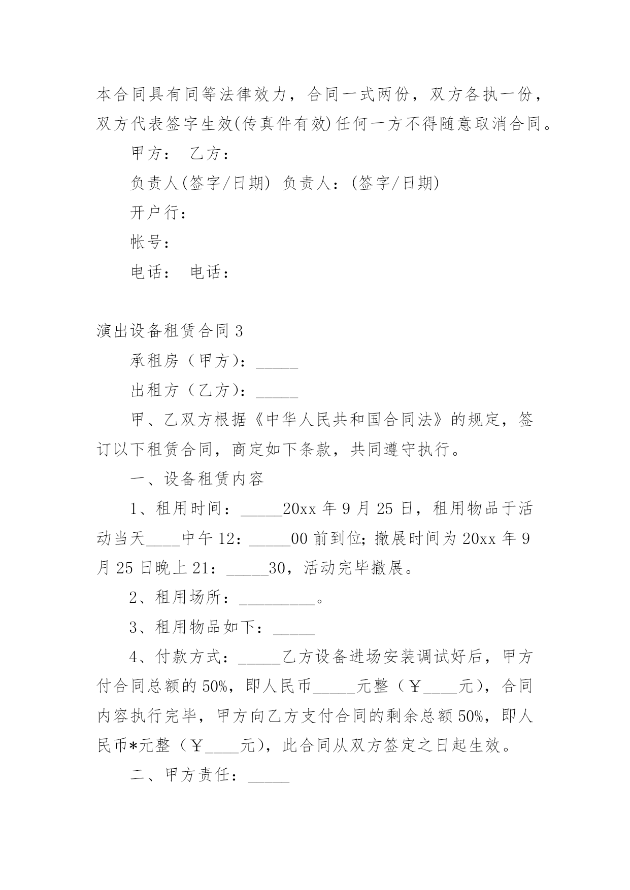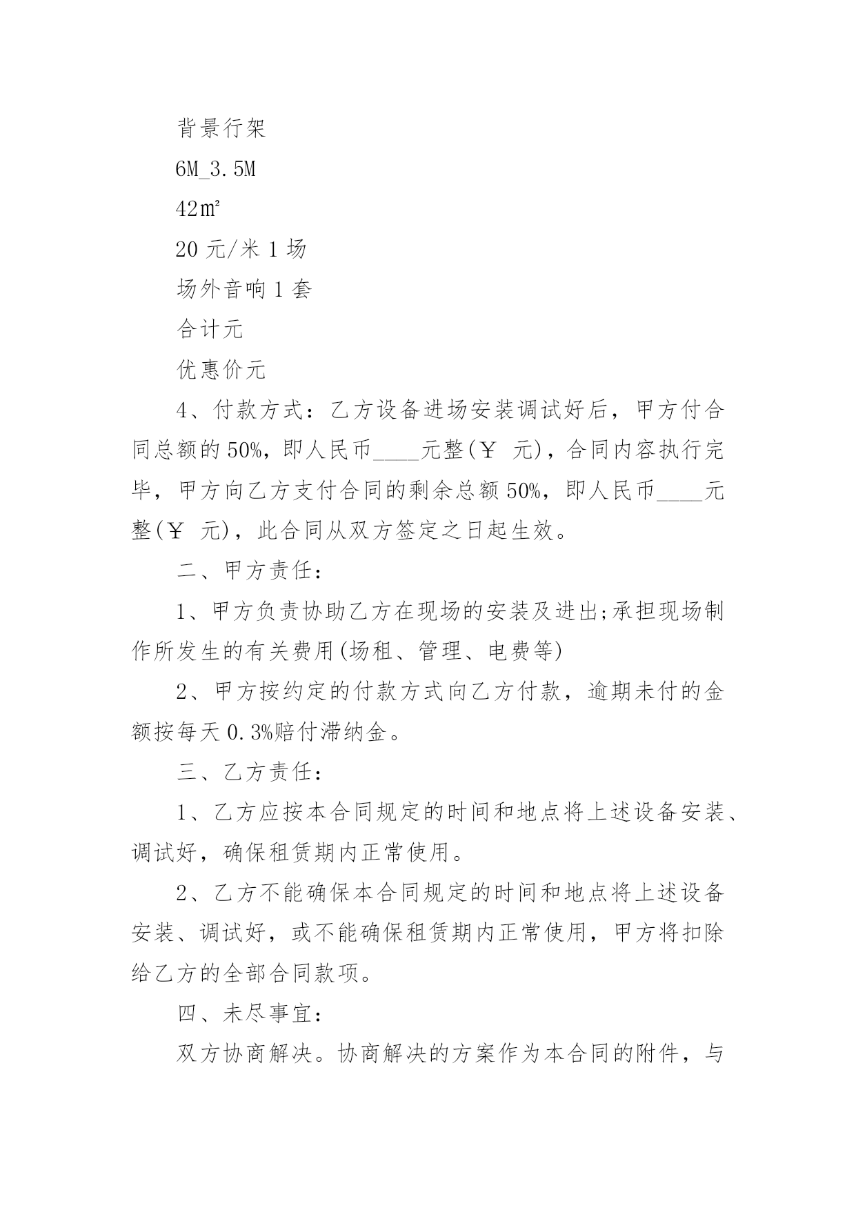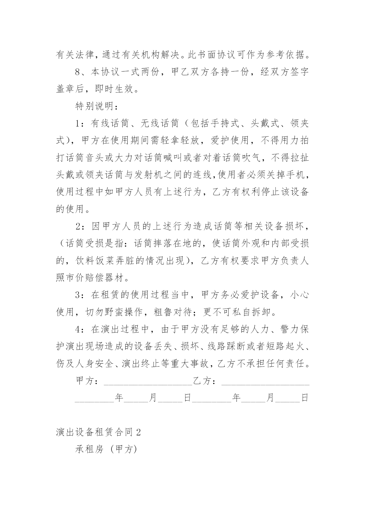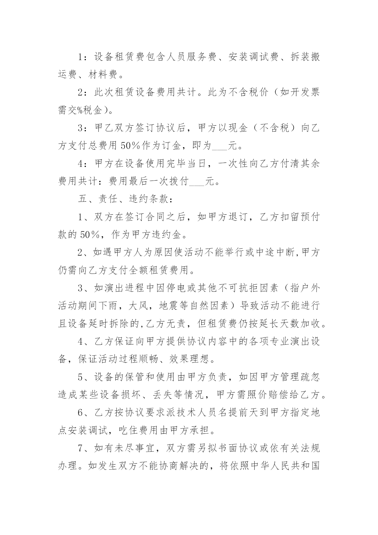 演出设备租赁合同演出设备租赁合同(14篇)随着法治精神地不断发扬,人们愈发重视合同,越来越多事情需要用到合同,合同协调着人与人,人与事之间的关系。你知道合同的主要内容是什么吗?下面是小编为大家整理的演出设备租赁合同,供大家参考借鉴,希望可以帮助到有需要的朋友。演出设备租赁合同1甲方:__________________乙方:__________________________年_____月_____日________年_____月_____日经甲、乙双方友好协商,乙方受甲方委托,提供各项服务事宜如下:一、设备清单:(见附表)(如所需设备较多,乙方所列设备清单为合同的有效附件)。电源、场地等请甲方准备。二、租用时间:自_______年_____月_____日起至_______年_____月_____日时止。1、乙方按甲方的要求于_______年_____月_____日时,将上述设备由甲方派车拉到指定的地点,并协助乙方在安装调试完毕后,甲方投入使用。在甲方使用设备过程中,根据甲方要求,乙方可增派工程师到现场进行技术指导。四、设备租金及相关费用和预付款1:设备租赁费包含人员服务费、安装调试费、拆装搬运费、材料费。2:此次租赁设备费用共计。此为不含税价(如开发票需交%税金)。3:甲乙双方签订协议后,甲方以现金(不含税)向乙方支付总费用50%作为订金,即为___元。4:甲方在设备使用完毕当日,一次性向乙方付清其余费用共计:费用最后一次拨付___元。五、责任、违约条款:1、双方在签订合同之后,如甲方退订,乙方扣留预付款的50%,作为甲方违约金。2、如遇甲方人为原因使活动不能举行或中途中断,甲方仍需向乙方支付全额租赁费用。3、如演出进程中因停电或其他不可抗拒因素(指户外活动期间下雨,大风,地震等自然因素)导致活动不能进行且设备延时拆除的,乙方无责,但租赁费仍按延长天数加收。4、乙方保证向甲方提供协议内容中的各项专业演出设备,保证活动过程顺畅、效果理想。5、设备的保管和使用由甲方负责,如因甲方管理疏忽造成某些设备损坏、丢失等情况,甲方需照价赔偿给乙方。6、乙方按协议要求派技术人员名提前天到甲方指定地点安装调试,吃住费用由甲方承担。7、如有未尽事宜,双方需另拟书面协议或依有关法规办理。如发生双方不能协商解决的,将依照中华人民共和国有关法律,通过有关机构解决。此书面协议可作为参考依据。8、本协议一式两份,甲乙双方各持一份,经双方签字盖章后,即时生效。特别说明:1:有线话筒、无线话筒(包括手持式、头戴式、领夹式),甲方在使用期间需轻拿轻放,爱护使用,不得用力拍打话筒音头或大力对话筒喊叫或者对着话筒吹气,不得拉扯头戴或领夹话筒与发射机之间的连线,使用者必须关掉手机,使用过程中如甲方人员有上述行为,乙方有权利停止该设备的使用。2:因甲方人员的上述行为造成话筒等相关设备损坏,(话筒受损是指:话筒摔落在地的,使话筒外观和内部受损的,饮料饭菜弄脏的情况出现),乙方有权要求甲方负责人照市价赔偿器材。3:在租赁的使用过程当中,甲方务必爱护设备,小心使用,切勿野蛮操作,粗鲁对待;更不可私自拆卸。4:在演出过程中,由于甲方没有足够的人力、警力保护演出现场造成的设备丢失、损坏、线路踩断或者短路起火、伤及人身安全、演出终止等重大事故,乙方不承担任何责任。甲方:__________________乙方:__________________________年_____月_____日________年_____月_____日演出设备租赁合同2承租房(甲方)出租方(乙方)甲、乙双方根据《中华人民共和国合同法》的规定,签订以下租赁合同,商定如下条款,共同遵守执行。一、设备租赁内容1、租用时间:20_年9月25日,租用物品于活动当天中午12:00前到位;撤展时间为20_年9月25日晚上21:30,活动完毕撤展。2、租用场所:.3、租用物品如下:物料名称备注数量单价(元)/场时间总价舞台6M_3.6M_0.6M(高)含旧地毯22㎡30元/㎡1场背景画6M_3M18㎡9元/㎡背景行架6M_3.5M42㎡20元/米1场场外音响1套合计元优惠价元4、付款方式:乙方设备进场安装调试好后,甲方付合同总额的50%,即人民币____元整(¥元),合同内容执行完毕,甲方向乙方支付合同的剩余总额50%,即人民币____元整(¥元),此合同从双方签定之日起生效。二、甲方责任:1、甲方负责协助乙方在现场的安装及进出;承担现场制作所发生的有关费用(场租、管理、电费等)2、甲方按约定的付款方式向乙方付款,逾期未付的金额按每天0.3%赔付滞纳金。三、乙方责任:1、乙方应按本合同规定的时间和地点将上述设备安装、调试好,确保租赁期内正常使用。2、乙方不能确保本合同规定的时间和地点将上述设备安装、调试好,或不能确