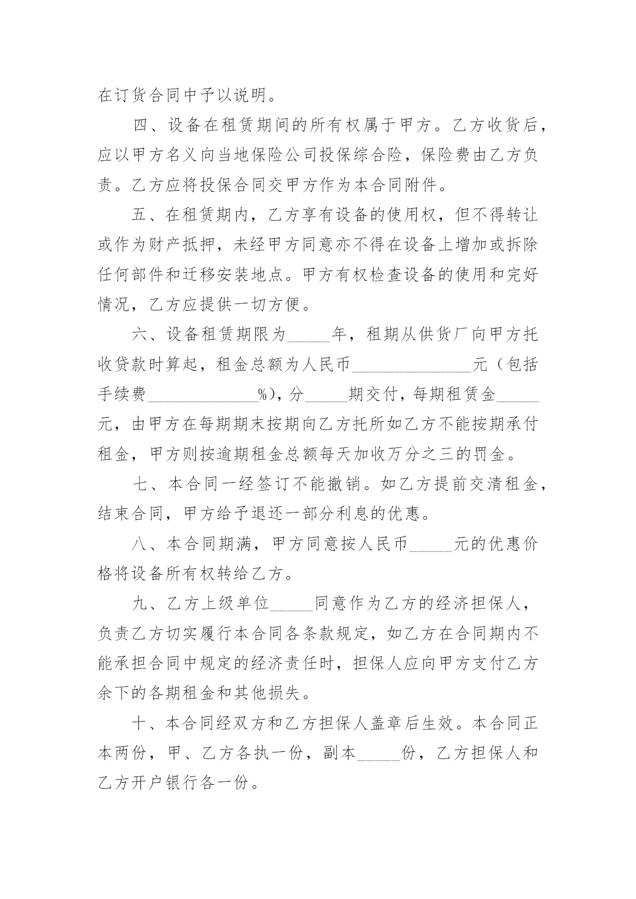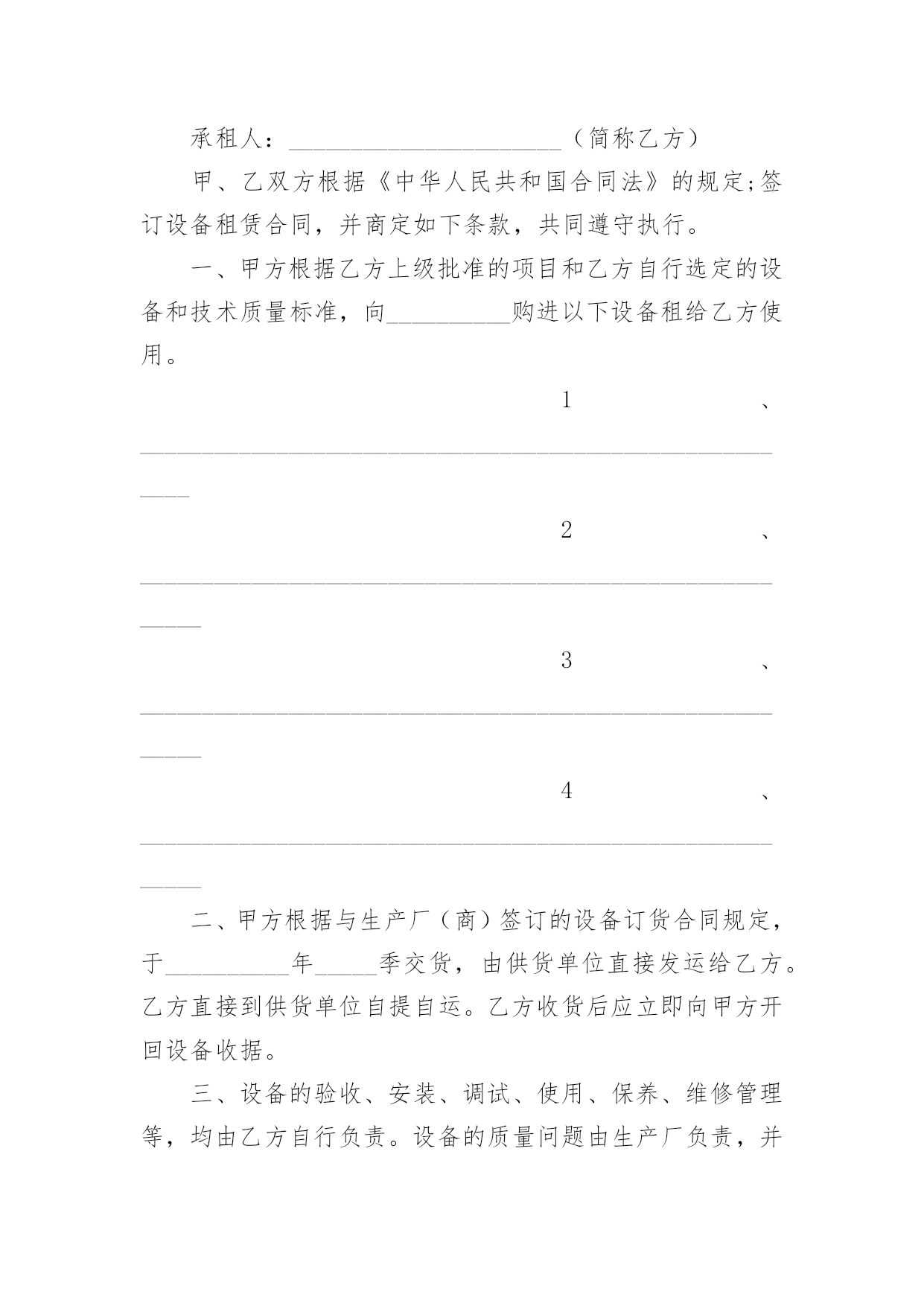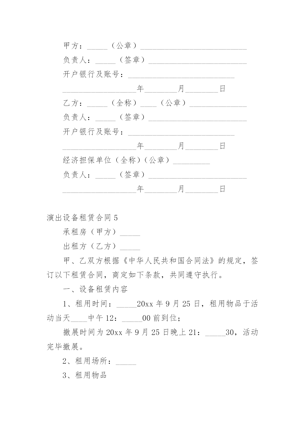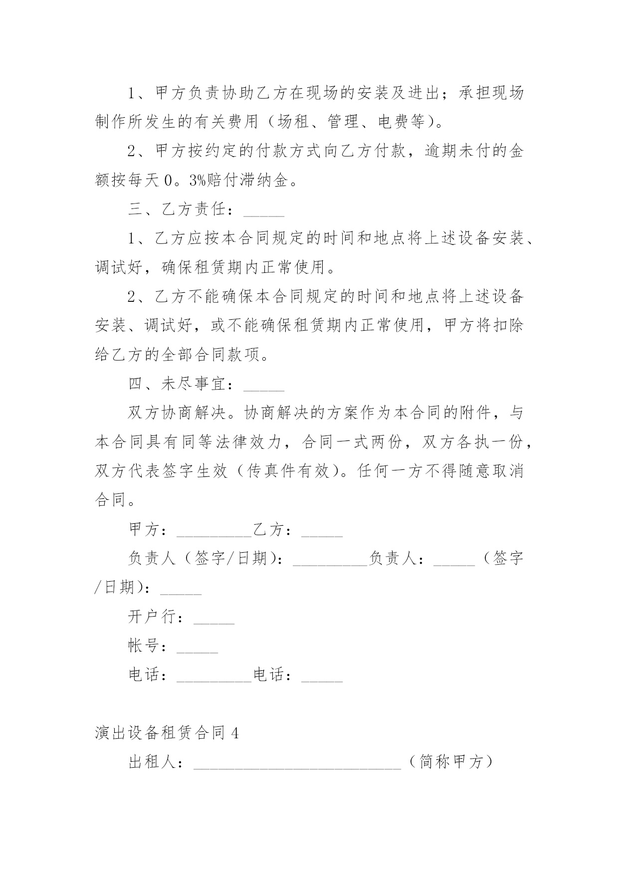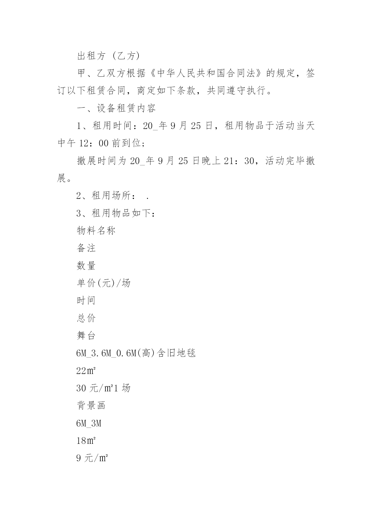 演出设备租赁合同演出设备租赁合同(14篇)随着法治精神地不断发扬,人们愈发重视合同,越来越多事情需要用到合同,合同协调着人与人,人与事之间的关系。你知道合同的主要内容是什么吗?下面是小编为大家整理的演出设备租赁合同,供大家参考借鉴,希望可以帮助到有需要的朋友。演出设备租赁合同1甲方:__________________乙方:__________________________年_____月_____日________年_____月_____日经甲、乙双方友好协商,乙方受甲方委托,提供各项服务事宜如下:一、设备清单:(见附表)(如所需设备较多,乙方所列设备清单为合同的有效附件)。电源、场地等请甲方准备。二、租用时间:自_______年_____月_____日起至_______年_____月_____日时止。1、乙方按甲方的要求于_______年_____月_____日时,将上述设备由甲方派车拉到指定的地点,并协助乙方在安装调试完毕后,甲方投入使用。在甲方使用设备过程中,根据甲方要求,乙方可增派工程师到现场进行技术指导。四、设备租金及相关费用和预付款1:设备租赁费包含人员服务费、安装调试费、拆装搬运费、材料费。2:此次租赁设备费用共计。此为不含税价(如开发票需交%税金)。3:甲乙双方签订协议后,甲方以现金(不含税)向乙方支付总费用50%作为订金,即为___元。4:甲方在设备使用完毕当日,一次性向乙方付清其余费用共计:费用最后一次拨付___元。五、责任、违约条款:1、双方在签订合同之后,如甲方退订,乙方扣留预付款的50%,作为甲方违约金。2、如遇甲方人为原因使活动不能举行或中途中断,甲方仍需向乙方支付全额租赁费用。3、如演出进程中因停电或其他不可抗拒因素(指户外活动期间下雨,大风,地震等自然因素)导致活动不能进行且设备延时拆除的,乙方无责,但租赁费仍按延长天数加收。4、乙方保证向甲方提供协议内容中的各项专业演出设备,保证活动过程顺畅、效果理想。5、设备的保管和使用由甲方负责,如因甲方管理疏忽造成某些设备损坏、丢失等情况,甲方需照价赔偿给乙方。6、乙方按协议要求派技术人员名提前天到甲方指定地点安装调试,吃住费用由甲方承担。7、如有未尽事宜,双方需另拟书面协议或依有关法规办理。如发生双方不能协商解决的,将依照中华人民共和国有关法律,通过有关机构解决。此书面协议可作为参考依据。8、本协议一式两份,甲乙双方各持一份,经双方签字盖章后,即时生效。特别说明:1:有线话筒、无线话筒(包括手持式、头戴式、领夹式),甲方在使用期间需轻拿轻放,爱护使用,不得用力拍打话筒音头或大力对话筒喊叫或者对着话筒吹气,不得拉扯头戴或领夹话筒与发射机之间的连线,使用者必须关掉手机,使用过程中如甲方人员有上述行为,乙方有权利停止该设备的使用。2:因甲方人员的上述行为造成话筒等相关设备损坏,(话筒受损是指:话筒摔落在地的,使话筒外观和内部受损的,饮料饭菜弄脏的情况出现),乙方有权要求甲方负责人照市价赔偿器材。3:在租赁的使用过程当中,甲方务必爱护设备,小心使用,切勿野蛮操作,粗鲁对待;更不可私自拆卸。4:在演出过程中,由于甲方没有足够的人力、警力保护演出现场造成的设备丢失、损坏、线路踩断或者短路起火、伤及人身安全、演出终止等重大事故,乙方不承担任何责任。甲方:__________________乙方:__________________________年_____月_____日________年_____月_____日演出设备租赁合同2承租房(甲方)出租方(乙方)甲、乙双方根据《中华人民共和国合同法》的规定,签订以下租赁合同,商定如下条款,共同遵守执行。一、设备租赁内容1、租用时间:20_年9月25日,租用物品于活动当天中午12:00前到位;撤展时间为20_年9月25日晚上21:30,活动完毕撤展。2、租用场所:.3、租用物品如下:物料名称备注数量单价(元)/场时间总价舞台6M_3.6M_0.6M(高)含旧地毯22㎡30元/㎡1场背景画6M_3M18㎡9元/㎡背景行架6M_3.5M42㎡20元/米1场场外音响1套合计元优惠价元4、付款方式:乙方设备进场安装调试好后,甲方付合同总额的50%,即人民币____元整(¥元),合同内容执行完毕,甲方向乙方支付合同的剩余总额50%,即人民币____元整(¥元),此合同从双方签定之日起生效。二、甲方责任:1、甲方负责协助乙方在现场的安装及进出;承担现场制作所发生的有关费用(场租、管理、电费等)2、甲方按约定的付款方式向乙方付款,逾期未付的金额按每天0.3%赔付滞纳金。三、乙方责任:1、乙方应按本合同规定的时间和地点将上述设备安装、调试好,确保租赁期内正常使用。2、乙方不能确保本合同规定的时间和地点将上述设备安装、调试好,或不能确