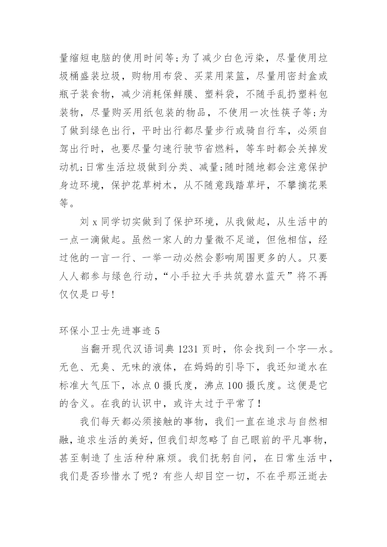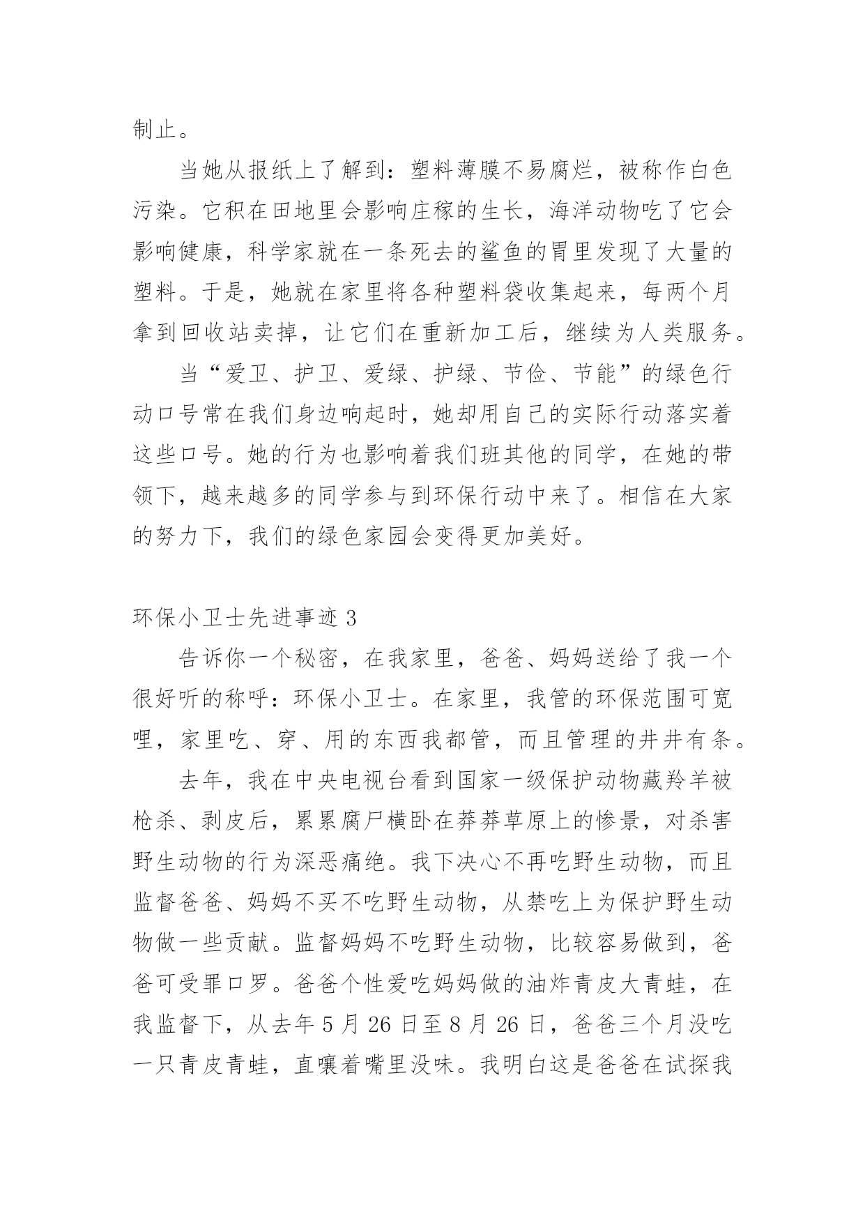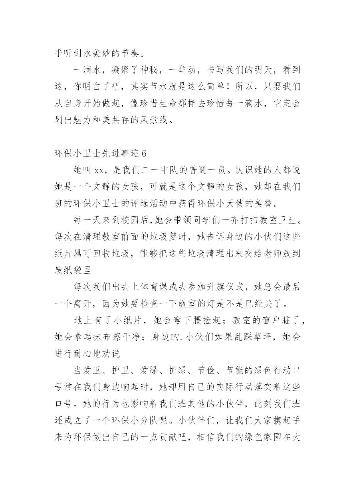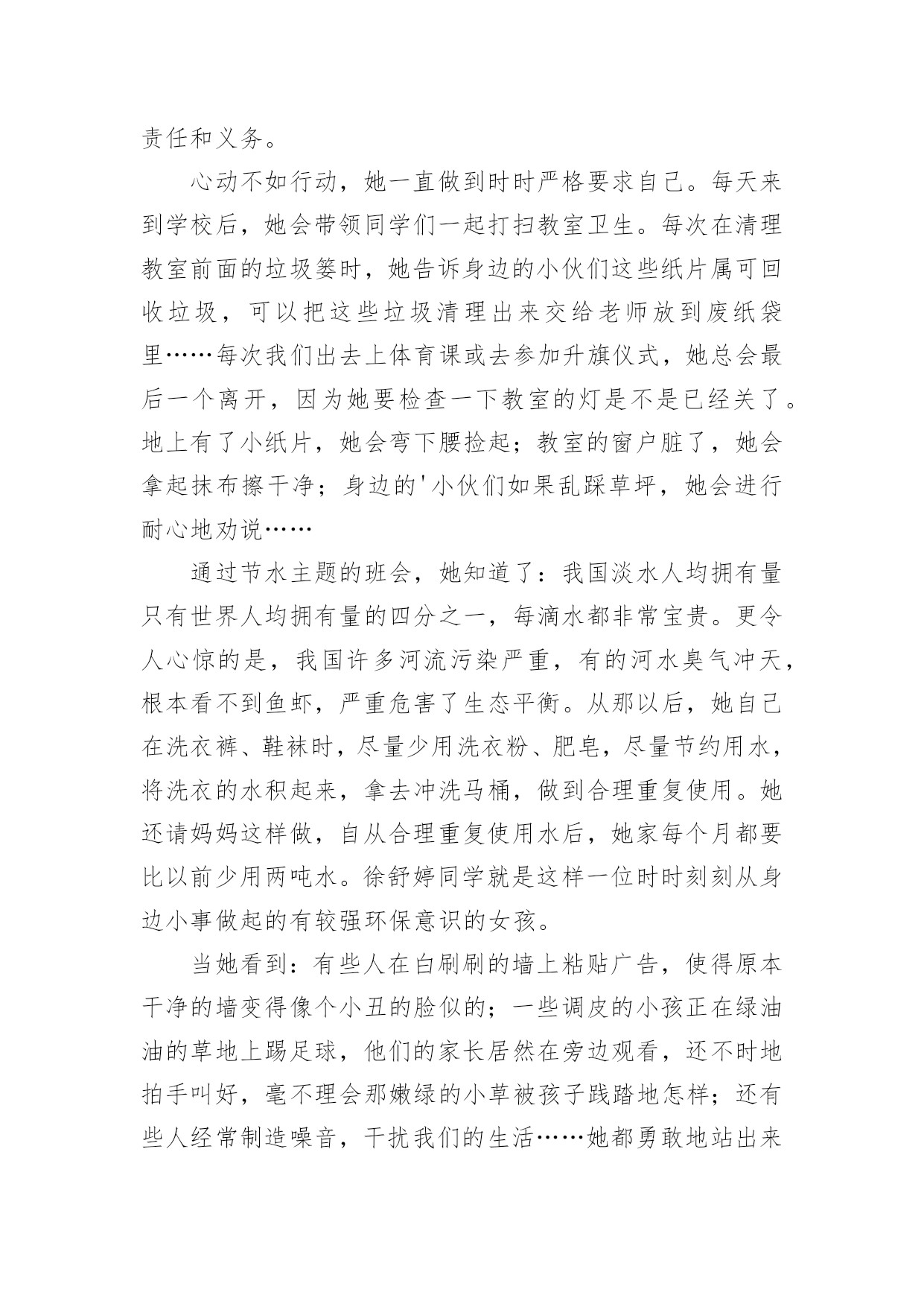 环保小卫士先进事迹环保小卫士先进事迹(汇编9篇)在平平淡淡的学习、工作、生活中,要用到事迹的地方还是很多的,根据事迹的性质,可分为正面典型材料和反面典型材料。拟起事迹来就毫无头绪?以下是小编精心整理的环保小卫士先进事迹,欢迎大家借鉴与参考,希望对大家有所帮助。环保小卫士先进事迹1我虽然是一名普通的小学生,但在环境保护方面,我很喜欢动脑筋的,我的脑子里有许多的金点子,带着朋友们开展了许多有好处的环保活动,产生了很大的影响。7岁时,我读书了。成了一名学生,能够用笔写字,用纸做作业了,我很高兴!我是一个喜欢想问题的孩子。一天,我发现有一个同学写字的纸用了一面,背面一个字也没有写就把这张纸当成了一张废纸了,还有一个同学撕下能够做作业的.纸叠飞机,扔得到处都是。我明白,我们用的纸是用大树的身体做成的。如果一个人浪费一张,我校有20xx多人,那一个星期就等于浪费了15000多张纸。我听大人们说,一棵3米高的大树,只能够造5000张纸,如果浪费了15000张纸不就等于杀死了三棵大树吗?节约用纸也是等于保护了环境,这个想法让我兴奋极了。我把要救救大树的想法跟我的这几个伙伴商量了一下,他们都表示同意。我们推荐一个环保小队的想法告诉了妈妈,妈妈也同意了。就这样环保小队成立了。小队的任务:就是把同学们丢弃的纸张收集起来。我还给小队取了一个不起眼的名字,叫一张纸小队,因为不管节约多少纸,都是从节约一张纸开始的。一张纸小队从号照大家两面用纸,节纸护树开始,用心参与环保活动。很快一张纸小队就得到了同学老师和同学响应,纷纷加入到一张纸小队活动中来。此刻,一纸小队已回收利用废纸700000多张纸,相当于保护了3米高的大树140棵。这项活动我在网上发布了还得到了许多城市的孩子们的支持,此刻全国就有600多个一张纸小队一年下来回收利用废纸600多万张,相当于保护了1200棵大树。环保小卫士先进事迹2她叫xxx,是我们四(3)班的副班长。认识她的人都说她是一个文静乖巧的女孩,是老师的得力小助手,是同学的好伙伴,同时也是我们班的的“环保小卫士”。每当她置身于美丽校园的时候,看见有同学从小卖部出来就将手上的包装纸随手乱扔,她会非常生气,非常难受。她生气的是个别同学不讲卫生,不讲文明;难受的是美丽的校园被污染了。她决心做“环保小卫士”。记得有一次,她看见一位小同学随地乱扔纸屑时,便走过去,严肃地制止了他,让他把纸屑捡起来丢在垃圾桶里。这时,有同学却认为她是多管闲事,可是做一个环保小卫士却在她心里扎了根。在她心目中,学校是她的家,保持学校的环境清洁就是她的责任和义务。心动不如行动,她一直做到时时严格要求自己。每天来到学校后,她会带领同学们一起打扫教室卫生。每次在清理教室前面的垃圾篓时,她告诉身边的小伙们这些纸片属可回收垃圾,可以把这些垃圾清理出来交给老师放到废纸袋里……每次我们出去上体育课或去参加升旗仪式,她总会最后一个离开,因为她要检查一下教室的灯是不是已经关了。地上有了小纸片,她会弯下腰捡起;教室的窗户脏了,她会拿起抹布擦干净;身边的'小伙们如果乱踩草坪,她会进行耐心地劝说……通过节水主题的班会,她知道了:我国淡水人均拥有量只有世界人均拥有量的四分之一,每滴水都非常宝贵。更令人心惊的是,我国许多河流污染严重,有的河水臭气冲天,根本看不到鱼虾,严重危害了生态平衡。从那以后,她自己在洗衣裤、鞋袜时,尽量少用洗衣粉、肥皂,尽量节约用水,将洗衣的水积起来,拿去冲洗马桶,做到合理重复使用。她还请妈妈这样做,自从合理重复使用水后,她家每个月都要比以前少用两吨水。徐舒婷同学就是这样一位时时刻刻从身边小事做起的有较强环保意识的女孩。当她看到:有些人在白刷刷的墙上粘贴广告,使得原本干净的墙变得像个小丑的脸似的;一些调皮的小孩正在绿油油的草地上踢足球,他们的家长居然在旁边观看,还不时地拍手叫好,毫不理会那嫩绿的小草被孩子践踏地怎样;还有些人经常制造噪音,干扰我们的生活……她都勇敢地站出来制止。当她从报纸上了解到:塑料薄膜不易腐烂,被称作白色污染。它积在田地里会影响庄稼的生长,海洋动物吃了它会影响健康,科学家就在一条死去的鲨鱼的胃里发现了大量的塑料。于是,她就在家里将各种塑料袋收集起来,每两个月拿到回收站卖掉,让它们在重新加工后,继续为人类服务。当“爱卫、护卫、爱绿、护绿、节俭、节能”的绿色行动口号常在我们身边响起时,她却用自己的实际行动落实着这些口号。她的行为也影响着我们班其他的同学,在她的带领下,越来越多的同学参与到环保行动中来了。相信在大家的努力下,我们的绿色家园会变得更加美好。环保小卫士先进事迹3告诉你一个秘密,在我家里,爸爸、妈妈送给了我一个很好听的称呼:环保小卫士。在家里,我管的环保范围可宽哩,家里吃、穿、用的东西我都管,而且管理的井井有条。去年,我在中央电视台看到国家一级