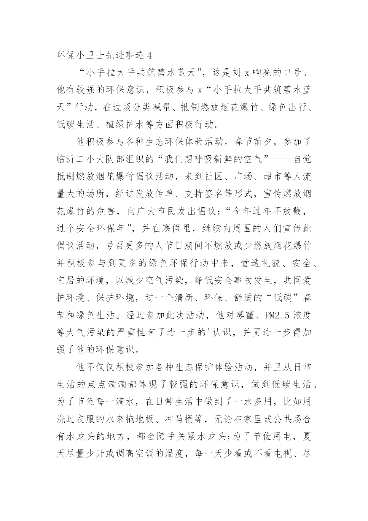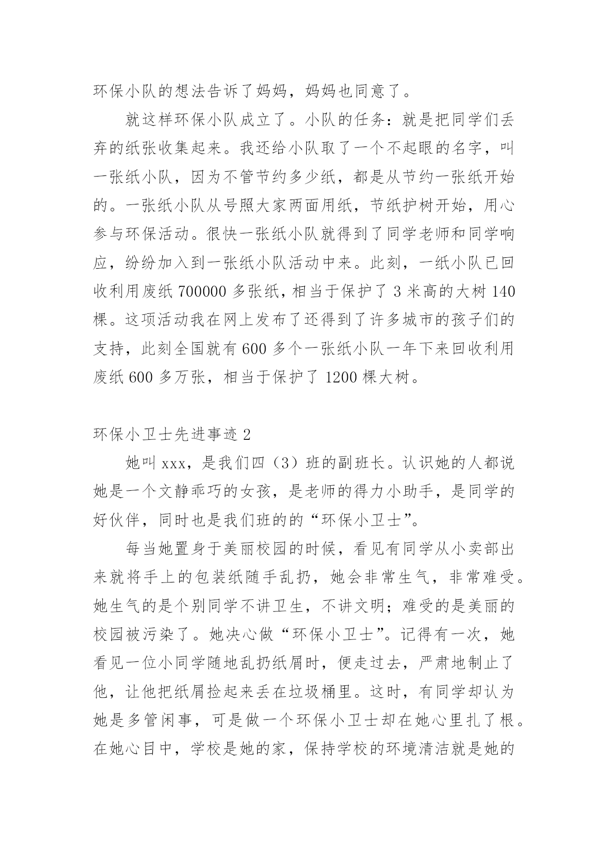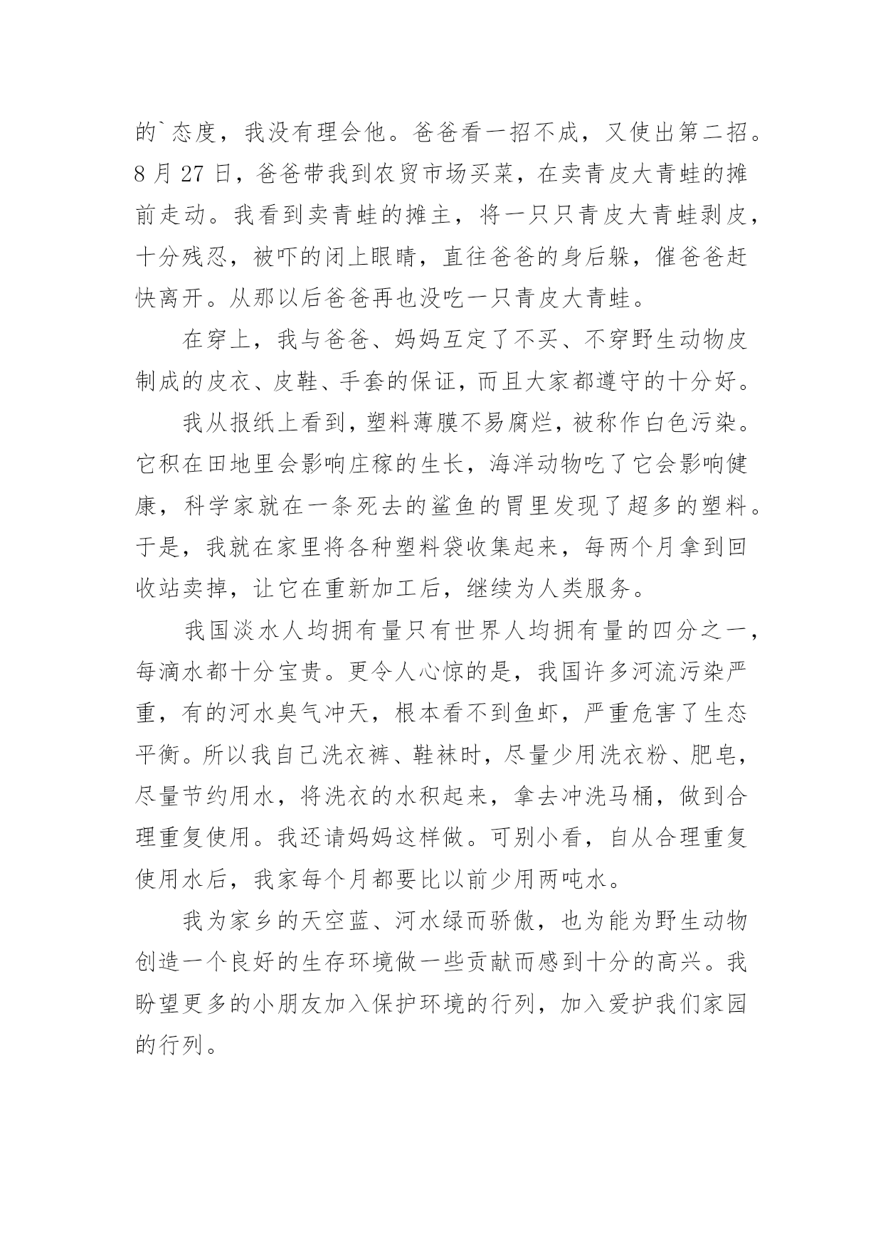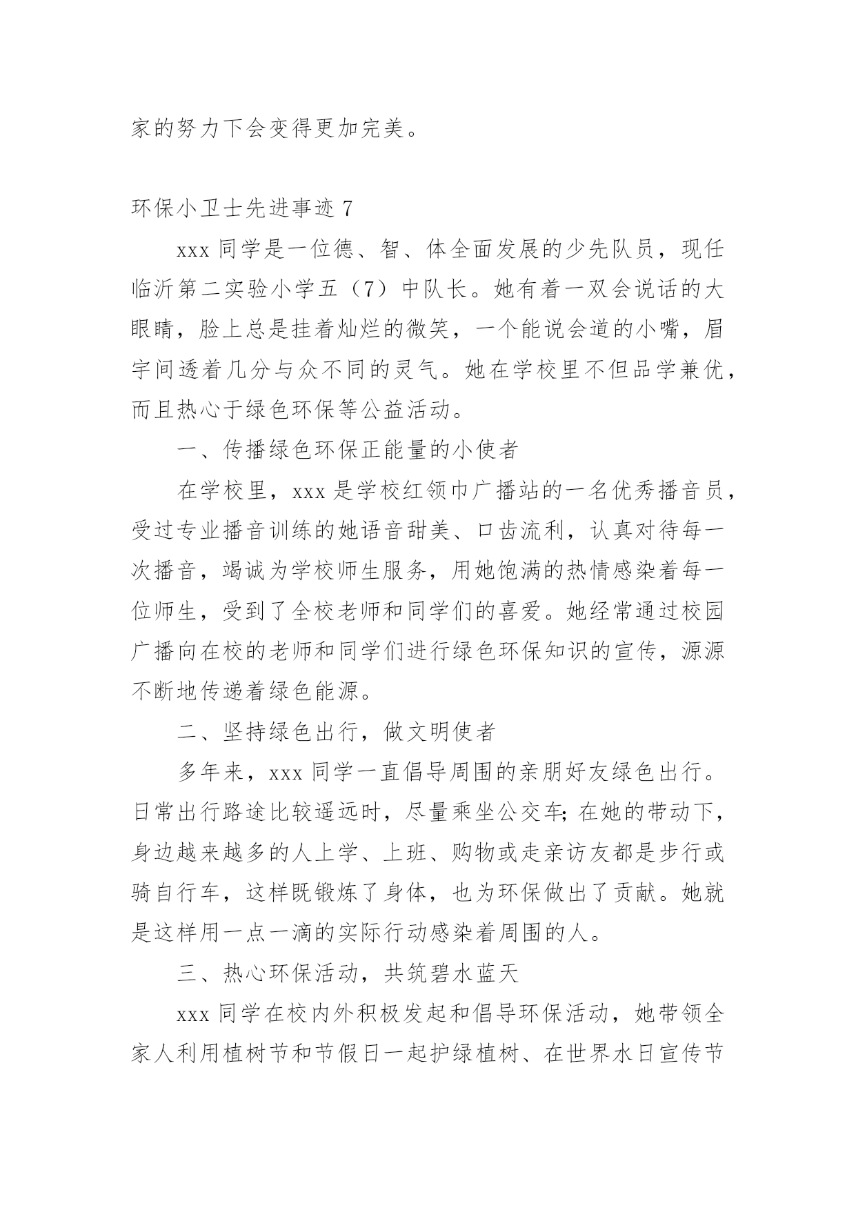 环保小卫士先进事迹环保小卫士先进事迹(汇编9篇)在平平淡淡的学习、工作、生活中,要用到事迹的地方还是很多的,根据事迹的性质,可分为正面典型材料和反面典型材料。拟起事迹来就毫无头绪?以下是小编精心整理的环保小卫士先进事迹,欢迎大家借鉴与参考,希望对大家有所帮助。环保小卫士先进事迹1我虽然是一名普通的小学生,但在环境保护方面,我很喜欢动脑筋的,我的脑子里有许多的金点子,带着朋友们开展了许多有好处的环保活动,产生了很大的影响。7岁时,我读书了。成了一名学生,能够用笔写字,用纸做作业了,我很高兴!我是一个喜欢想问题的孩子。一天,我发现有一个同学写字的纸用了一面,背面一个字也没有写就把这张纸当成了一张废纸了,还有一个同学撕下能够做作业的.纸叠飞机,扔得到处都是。我明白,我们用的纸是用大树的身体做成的。如果一个人浪费一张,我校有20xx多人,那一个星期就等于浪费了15000多张纸。我听大人们说,一棵3米高的大树,只能够造5000张纸,如果浪费了15000张纸不就等于杀死了三棵大树吗?节约用纸也是等于保护了环境,这个想法让我兴奋极了。我把要救救大树的想法跟我的这几个伙伴商量了一下,他们都表示同意。我们推荐一个环保小队的想法告诉了妈妈,妈妈也同意了。就这样环保小队成立了。小队的任务:就是把同学们丢弃的纸张收集起来。我还给小队取了一个不起眼的名字,叫一张纸小队,因为不管节约多少纸,都是从节约一张纸开始的。一张纸小队从号照大家两面用纸,节纸护树开始,用心参与环保活动。很快一张纸小队就得到了同学老师和同学响应,纷纷加入到一张纸小队活动中来。此刻,一纸小队已回收利用废纸700000多张纸,相当于保护了3米高的大树140棵。这项活动我在网上发布了还得到了许多城市的孩子们的支持,此刻全国就有600多个一张纸小队一年下来回收利用废纸600多万张,相当于保护了1200棵大树。环保小卫士先进事迹2她叫xxx,是我们四(3)班的副班长。认识她的人都说她是一个文静乖巧的女孩,是老师的得力小助手,是同学的好伙伴,同时也是我们班的的“环保小卫士”。每当她置身于美丽校园的时候,看见有同学从小卖部出来就将手上的包装纸随手乱扔,她会非常生气,非常难受。她生气的是个别同学不讲卫生,不讲文明;难受的是美丽的校园被污染了。她决心做“环保小卫士”。记得有一次,她看见一位小同学随地乱扔纸屑时,便走过去,严肃地制止了他,让他把纸屑捡起来丢在垃圾桶里。这时,有同学却认为她是多管闲事,可是做一个环保小卫士却在她心里扎了根。在她心目中,学校是她的家,保持学校的环境清洁就是她的责任和义务。心动不如行动,她一直做到时时严格要求自己。每天来到学校后,她会带领同学们一起打扫教室卫生。每次在清理教室前面的垃圾篓时,她告诉身边的小伙们这些纸片属可回收垃圾,可以把这些垃圾清理出来交给老师放到废纸袋里……每次我们出去上体育课或去参加升旗仪式,她总会最后一个离开,因为她要检查一下教室的灯是不是已经关了。地上有了小纸片,她会弯下腰捡起;教室的窗户脏了,她会拿起抹布擦干净;身边的'小伙们如果乱踩草坪,她会进行耐心地劝说……通过节水主题的班会,她知道了:我国淡水人均拥有量只有世界人均拥有量的四分之一,每滴水都非常宝贵。更令人心惊的是,我国许多河流污染严重,有的河水臭气冲天,根本看不到鱼虾,严重危害了生态平衡。从那以后,她自己在洗衣裤、鞋袜时,尽量少用洗衣粉、肥皂,尽量节约用水,将洗衣的水积起来,拿去冲洗马桶,做到合理重复使用。她还请妈妈这样做,自从合理重复使用水后,她家每个月都要比以前少用两吨水。徐舒婷同学就是这样一位时时刻刻从身边小事做起的有较强环保意识的女孩。当她看到:有些人在白刷刷的墙上粘贴广告,使得原本干净的墙变得像个小丑的脸似的;一些调皮的小孩正在绿油油的草地上踢足球,他们的家长居然在旁边观看,还不时地拍手叫好,毫不理会那嫩绿的小草被孩子践踏地怎样;还有些人经常制造噪音,干扰我们的生活……她都勇敢地站出来制止。当她从报纸上了解到:塑料薄膜不易腐烂,被称作白色污染。它积在田地里会影响庄稼的生长,海洋动物吃了它会影响健康,科学家就在一条死去的鲨鱼的胃里发现了大量的塑料。于是,她就在家里将各种塑料袋收集起来,每两个月拿到回收站卖掉,让它们在重新加工后,继续为人类服务。当“爱卫、护卫、爱绿、护绿、节俭、节能”的绿色行动口号常在我们身边响起时,她却用自己的实际行动落实着这些口号。她的行为也影响着我们班其他的同学,在她的带领下,越来越多的同学参与到环保行动中来了。相信在大家的努力下,我们的绿色家园会变得更加美好。环保小卫士先进事迹3告诉你一个秘密,在我家里,爸爸、妈妈送给了我一个很好听的称呼:环保小卫士。在家里,我管的环保范围可宽哩,家里吃、穿、用的东西我都管,而且管理的井井有条。去年,我在中央电视台看到国家一级