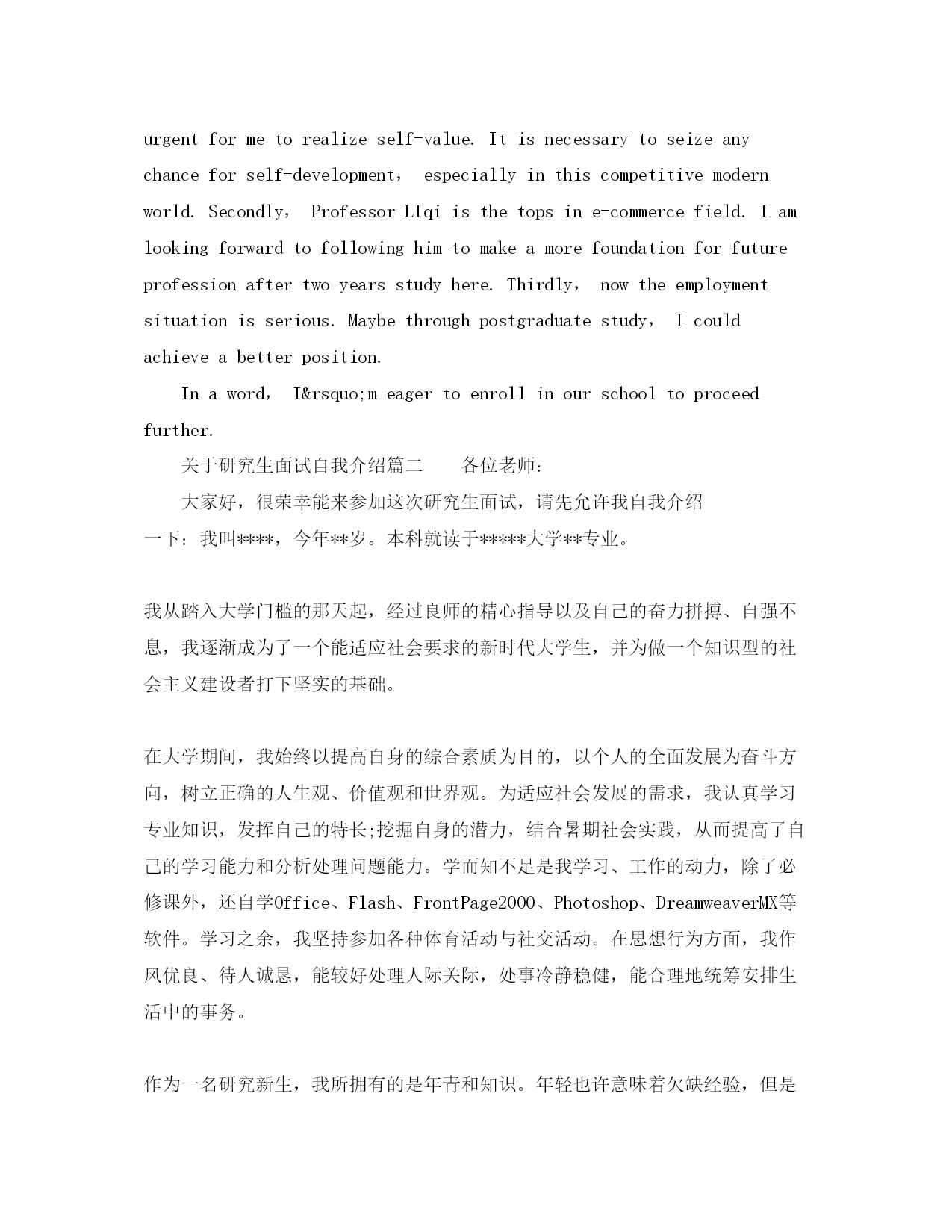 此资料由网络收集而来,如有侵权请告知上传者立即删除。资料共分享,我们负责传递知识。关于研究生面试自我介绍研究生面试时,一份出色的自我介绍绝对来自于事前的准备与操练。研究生面试自我介绍如何分段进击,事先架构一个完整内容?下面小编为你带来研究生面试自我介绍的内容,希望你们喜欢。关于研究生面试自我介绍篇一Goodmorning,everyteacher.It’sreallyagreathonortohavethisopportunityforaninterview.AndIhopeIcanmakeagoodperformancetoday,eventuallyenrollinthisprestigiousuniversityinSeptember.First,letmeintroducemyselfbriefly.Mynameis,whichisGuoxueliinChinese.Iam22yearsold,borninZichangcountry,ShaanxiProvince.I’mstudyingatXi’anjiaotongUniversity.Imajorine-commercewithaminorinlaw.InordertoimprovemyEnglishandmasterfundamentalknowledgeofcomputerapplication,IhavepassedCET6,theC++languageexaminationintheNationalcomputerRankExaminationLevel2andthedatabaseexaminationintheNationalcomputerRankExaminationLevel3withaease.Ialwaysbelievethatonewilleasilylagbehindunlesshekeepsonlearning.ThescholarshipsIhavewonduringtheseyearscouldcertificatethatIworkhard.Iamveryeasytogetonwith,soIhavelotsoffriends.AndIamoptimisticforthatIbelieveintheendthingwillmend.SometimesIpreferstayingalone,reading,watchingmovies,listeningtomusicorsurfingtheInternet.AsforwhyIchoosetoengageinpostgraduatestudy,thereareseveralreasonsasfollow.Firstly,Ithinkfurtherstudyisstillurgentformetorealizeself-value.Itisnecessarytoseizeanychanceforself-development,especiallyinthiscompetitivemodernworld.Secondly,ProfessorLIqiisthetopsine-commercefield.Iamlookingforwardtofollowinghimtomakeamorefoundationforfutureprofessionaftertwoyearsstudyhere.Thirdly,nowtheemploymentsituationisserious.Maybethroughpostgraduatestudy,Icouldachieveabetterposition.Inaword,I’meagertoenrollinourschooltoproceedfurther.关于研究生面试自我介绍篇二各位老师:大家好,很荣幸能来参加这次研究生面试,请先允许我自我介绍一下:我叫****,今年**岁。本科就读于*****大学**专业。我从踏入大学门槛的那天起,经过良师的精心指导以及自己的奋力拼搏、自强不息,我逐渐成为了一个能适应社会要求的新时代大学生,并为做一个知识型的社会主义建设者打下坚实的基础。在大学期间,我始终以提高自身的综合素质为目的,以个人的全面发展为奋斗方向,树立正确的人生观、价值观和世界观。为适应社会发展的需求,我认真学习专业知识,发挥自己的特长;挖掘自身的潜力,结合暑期社会实践,从而提高了自己的学习能力和分析处理问题能力。学而知不足是我学习、工作的动力,除了必修课外,还自学Office、Flash、FrontPage2000、Photoshop、DreamweaverMX等软件。学习之余,我坚