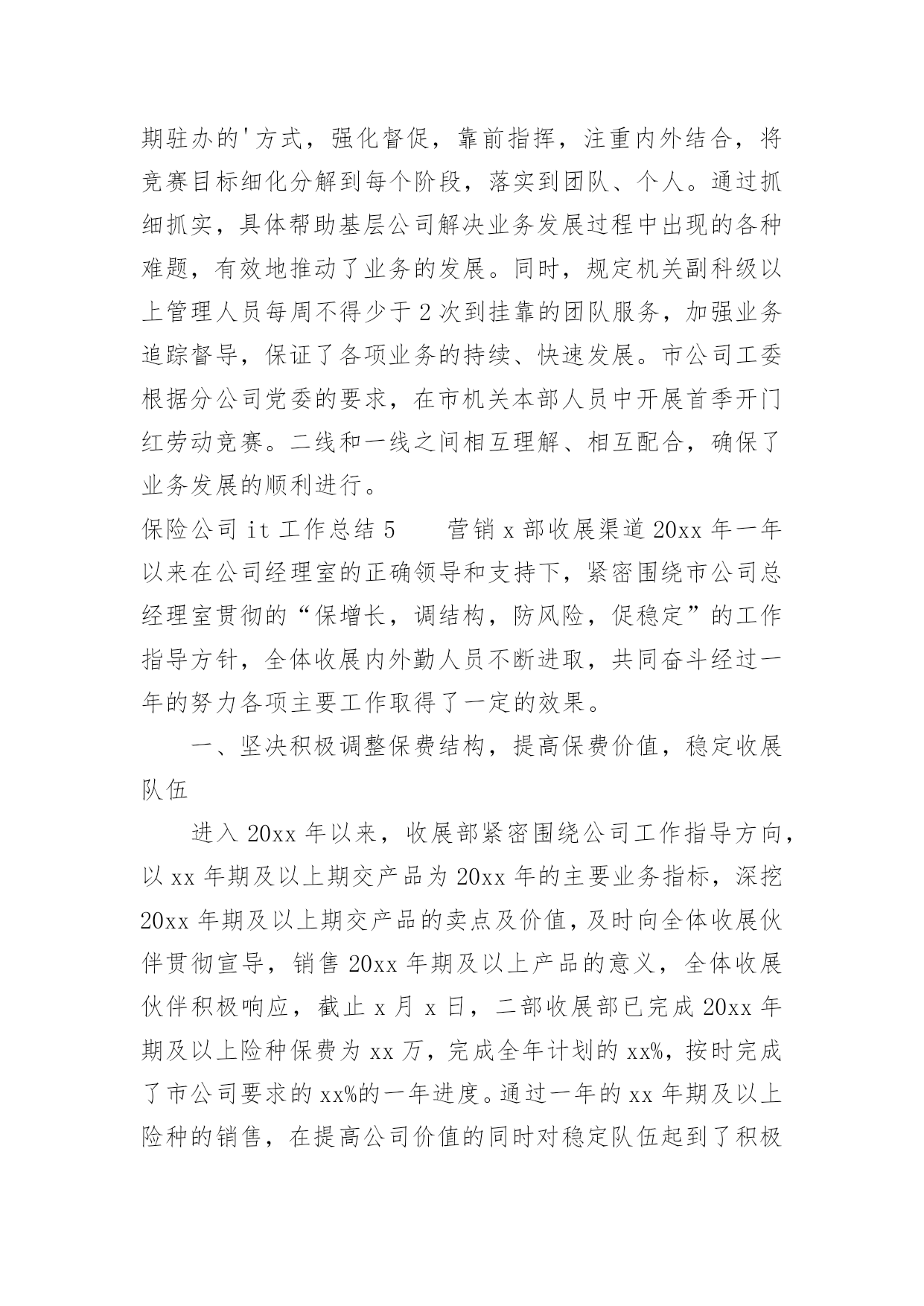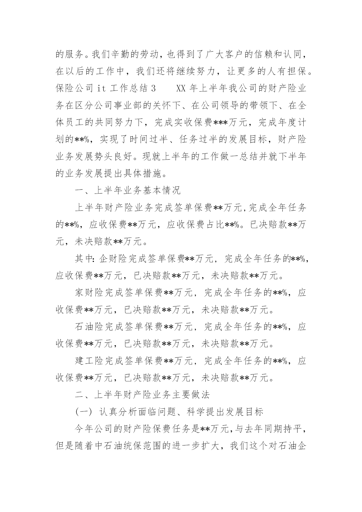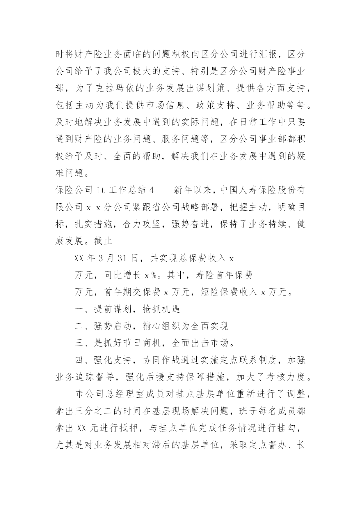 保险公司it工作总结保险公司it工作总结10篇总结就是把一个时段的学习、工作或其完成情况进行一次全面系统的总结,它可以给我们下一阶段的学习和工作生活做指导,因此好好准备一份总结吧。我们该怎么去写总结呢?下面是小编帮大家整理的保险公司it工作总结,供大家参考借鉴,希望可以帮助到有需要的朋友。保险公司it工作总结1总结是事后对某一阶段的学习、工作或其完成情况加以回顾和分析的一种书面材料,它可以帮助我们总结以往思想,发扬成绩,我想我们需要写一份总结了吧。你所见过的总结应该是什么样的?下面是小编整理的保险理赔年度个人工作总结,欢迎阅读与收藏。车险是我国国内保险市场上规模最大的单险种业务,是我国财产保险业务的骨干险种。其业务量占财产保险的一半以上。xx年,全国产险保费收入达892.4亿元,有544.6亿元来自车险,下面是保险理赔年度个人工作总结。xx年,我国产险公司中,车险已决赔案件数高达766万多起,赔付率高达60.87%,车险查勘、理算工程量大、成本高。在我国目前保险市场手续费高、费用率高、资金利用率低的状况下,车险在xx年的经营中已出现了全行业亏损的严峻局面。我国的理赔服务模式由于机动车辆具有流动性的`特点,要求保险公司在经营,特别是在提供服务方面要建立和完善与机动车辆特点相适应的服务体系或者服务机制,做好机动车辆出险后的处理工作。这种服务体系或机制主要是围绕在保险车辆出险后及时的援救、查勘、定损和修复方面,同时,还包括处理涉及第三者责任的案件。目前,我国较为成熟和流行的模式是以保险公司自主理赔为主导的理赔服务模式,其特点为:1、各自建立自己的服务热线,对被保险人实行全天候、全方位的服务,通过热线接受报案。2、各自建立自己的查勘队伍,自身配备齐全的查勘车辆和相应设备,接受自身客户服务中心的调度和现场查勘定损。3、各自建立自己的车辆零配件报价中心,针对车险赔付项目所占比重高,对车险赔付率和经营利润影响大,同时又是最容易产生暴利的零配件赔款,各家保险公司都非常重视,组织专人从事汽车配件价格的收集、报价和核价工作。4、查勘定损的某个环节或服务辐射不到的某个领域才交由公估公司、物价部门、修理厂、调查公司等外部机构去完成。有效地改变目前我国的车险理赔服务模式,挤压理赔水分,降低理赔服务成本,已成为改变目前我国车险经营亏损局面的重大课题之一。保险公司it工作总结2从近几年的自然灾害、全球金融危机的爆发,无一不给人们的生活带来了巨大的影响,此时保险的多种样式被更多的人所热捧。我做一份保险销售工作总结,来系统性的给大家展示保险销售的具体业务流程及近期的发展。公司在复杂多变的环境下,在各职能部门的密切支持和配合下,通过全体员工的奋力拼搏,勇于进取,业务取得了长足发展,业务规模创造了历史最高纪录,回顾一年的工作,既有成功的经验,也暴露了一些不足。一、个人业务取得突破性发展业务的迅猛发展,一定要有一支强有力的核心队伍作为支撑。公司加大了队伍建设力度,重金聘请北京专家进行增员指导,把展业和增员结合起来,通过增员来推动业务发展,通过业务发展带来的实惠来带动增员。主管也付出了辛勤的劳动,他们时刻关注着自己的组员,帮其解困、助其成长,让我们的员工感觉到了公司的温暖,做到了有爱留人。个人业务是我们的核心业务,是公司持续经营、稳健发展的基础。我公司根据自身实际情况制订了相应的激励措施,利用“客户答谢会”、“产说会”等多种销售模式,抓住多个新险种强势上市的有利契机,全体员工斗志昂扬,经过辛勤的耕耘,终于取得了丰硕的果实。二、奋勇拼搏,团体业务稳中有升团体业务是公司经营成效体现的重要指标,也是产、寿险两类保险的交集市场,因此,竞争尤其激烈。在与多个竞争主体的交锋中,我司以全年团体业务共收取保险费266万元。四季度经营指标重新下达后,我司只用了一个月的时间就率先超额完成了任务目标。一年来,我们除了维护好已有的渠道外,还积极寻找新的业务增长点,努力打破前期业务发展低迷的状况,同时积极加强与有关部门的沟通与协作,争取得到最大的'支持和帮助,加大宣传力度,扩大影响面,从而赢得市场。三、服务社会主义新农村公司全面落实“巩固城市、拓展两乡”战略,积极响应中央关于建设社会主义新农村的号召,我公司加深了对“两乡强则县域强,县域强则全省兴”的理解和认识,增强了发展农村市场的责任感、使命感和紧迫感。四、雄踞市场主导今年上半年,公司发出全年目标上半年完成的号召,面对巨大的挑战,我们并没有退缩,我们积极联系各代理机构和网点,加强业务指导和促成。通过全司员工和各代理机构的共同努力,我司上半年共实现保费500万元,虽然这一成绩同州公司下达的任务目标还有一定的差距,但这一成绩已经创造出历史新高。五、以人为本,诚信服务服务质量的好坏不仅关系到公司业务的发展,还关系到公司的声誉以及未来。我们坚持“