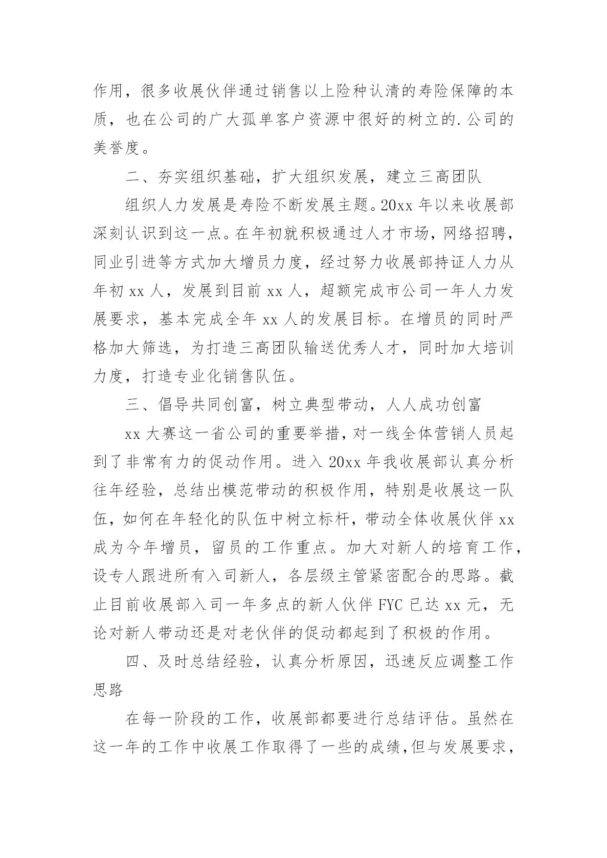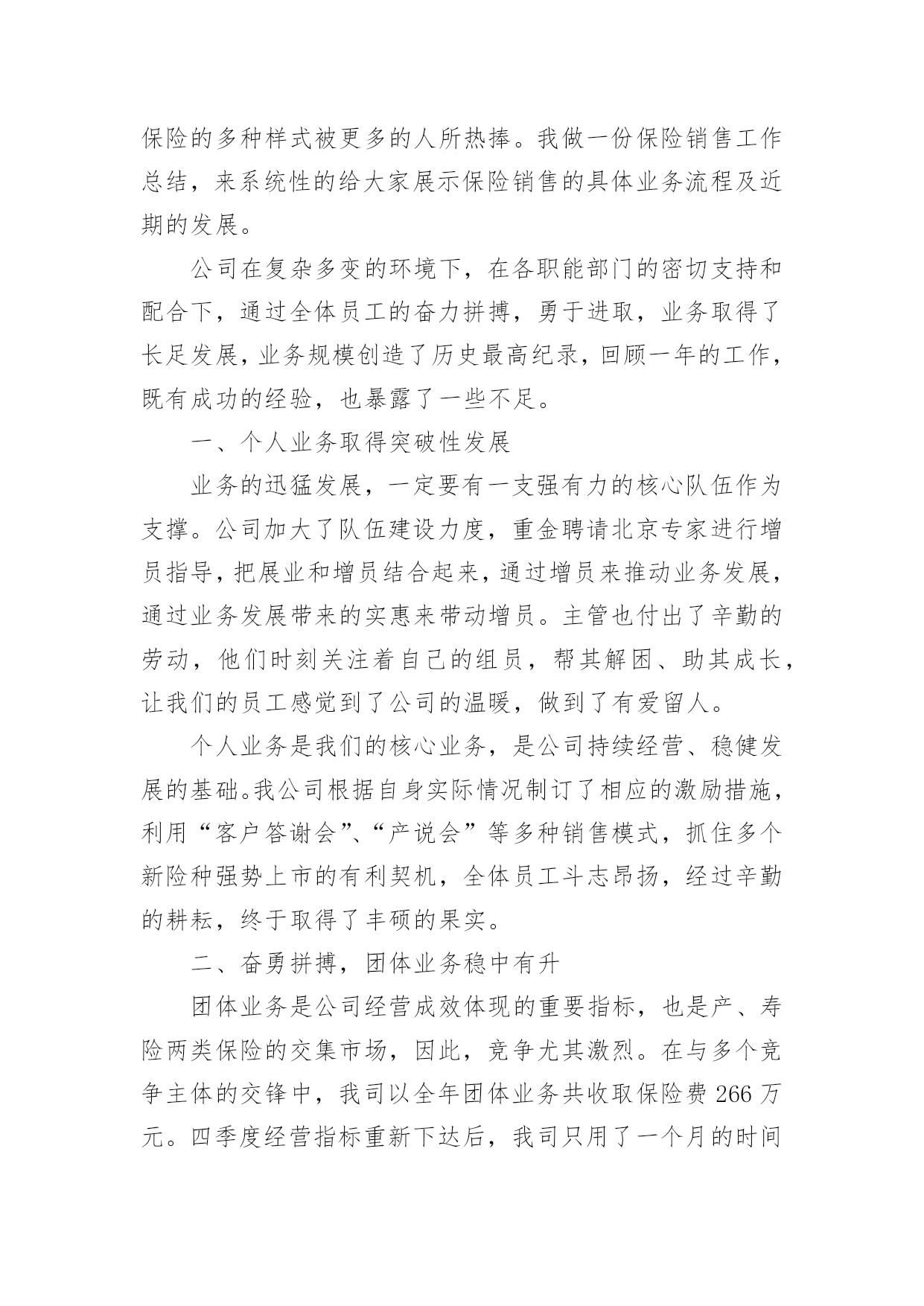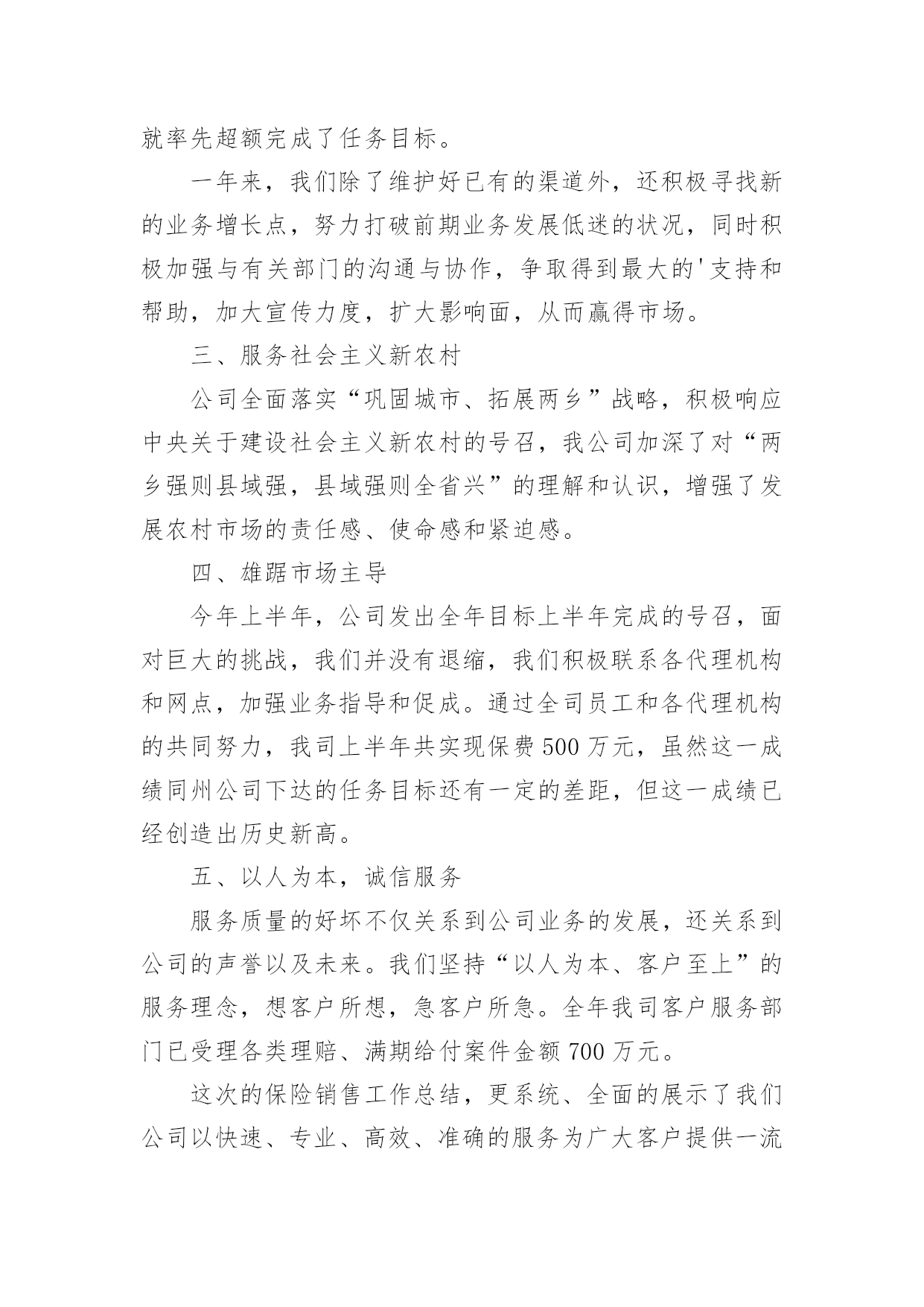 保险公司it工作总结保险公司it工作总结10篇总结就是把一个时段的学习、工作或其完成情况进行一次全面系统的总结,它可以给我们下一阶段的学习和工作生活做指导,因此好好准备一份总结吧。我们该怎么去写总结呢?下面是小编帮大家整理的保险公司it工作总结,供大家参考借鉴,希望可以帮助到有需要的朋友。保险公司it工作总结1总结是事后对某一阶段的学习、工作或其完成情况加以回顾和分析的一种书面材料,它可以帮助我们总结以往思想,发扬成绩,我想我们需要写一份总结了吧。你所见过的总结应该是什么样的?下面是小编整理的保险理赔年度个人工作总结,欢迎阅读与收藏。车险是我国国内保险市场上规模最大的单险种业务,是我国财产保险业务的骨干险种。其业务量占财产保险的一半以上。xx年,全国产险保费收入达892.4亿元,有544.6亿元来自车险,下面是保险理赔年度个人工作总结。xx年,我国产险公司中,车险已决赔案件数高达766万多起,赔付率高达60.87%,车险查勘、理算工程量大、成本高。在我国目前保险市场手续费高、费用率高、资金利用率低的状况下,车险在xx年的经营中已出现了全行业亏损的严峻局面。我国的理赔服务模式由于机动车辆具有流动性的`特点,要求保险公司在经营,特别是在提供服务方面要建立和完善与机动车辆特点相适应的服务体系或者服务机制,做好机动车辆出险后的处理工作。这种服务体系或机制主要是围绕在保险车辆出险后及时的援救、查勘、定损和修复方面,同时,还包括处理涉及第三者责任的案件。目前,我国较为成熟和流行的模式是以保险公司自主理赔为主导的理赔服务模式,其特点为:1、各自建立自己的服务热线,对被保险人实行全天候、全方位的服务,通过热线接受报案。2、各自建立自己的查勘队伍,自身配备齐全的查勘车辆和相应设备,接受自身客户服务中心的调度和现场查勘定损。3、各自建立自己的车辆零配件报价中心,针对车险赔付项目所占比重高,对车险赔付率和经营利润影响大,同时又是最容易产生暴利的零配件赔款,各家保险公司都非常重视,组织专人从事汽车配件价格的收集、报价和核价工作。4、查勘定损的某个环节或服务辐射不到的某个领域才交由公估公司、物价部门、修理厂、调查公司等外部机构去完成。有效地改变目前我国的车险理赔服务模式,挤压理赔水分,降低理赔服务成本,已成为改变目前我国车险经营亏损局面的重大课题之一。保险公司it工作总结2从近几年的自然灾害、全球金融危机的爆发,无一不给人们的生活带来了巨大的影响,此时保险的多种样式被更多的人所热捧。我做一份保险销售工作总结,来系统性的给大家展示保险销售的具体业务流程及近期的发展。公司在复杂多变的环境下,在各职能部门的密切支持和配合下,通过全体员工的奋力拼搏,勇于进取,业务取得了长足发展,业务规模创造了历史最高纪录,回顾一年的工作,既有成功的经验,也暴露了一些不足。一、个人业务取得突破性发展业务的迅猛发展,一定要有一支强有力的核心队伍作为支撑。公司加大了队伍建设力度,重金聘请北京专家进行增员指导,把展业和增员结合起来,通过增员来推动业务发展,通过业务发展带来的实惠来带动增员。主管也付出了辛勤的劳动,他们时刻关注着自己的组员,帮其解困、助其成长,让我们的员工感觉到了公司的温暖,做到了有爱留人。个人业务是我们的核心业务,是公司持续经营、稳健发展的基础。我公司根据自身实际情况制订了相应的激励措施,利用“客户答谢会”、“产说会”等多种销售模式,抓住多个新险种强势上市的有利契机,全体员工斗志昂扬,经过辛勤的耕耘,终于取得了丰硕的果实。二、奋勇拼搏,团体业务稳中有升团体业务是公司经营成效体现的重要指标,也是产、寿险两类保险的交集市场,因此,竞争尤其激烈。在与多个竞争主体的交锋中,我司以全年团体业务共收取保险费266万元。四季度经营指标重新下达后,我司只用了一个月的时间就率先超额完成了任务目标。一年来,我们除了维护好已有的渠道外,还积极寻找新的业务增长点,努力打破前期业务发展低迷的状况,同时积极加强与有关部门的沟通与协作,争取得到最大的'支持和帮助,加大宣传力度,扩大影响面,从而赢得市场。三、服务社会主义新农村公司全面落实“巩固城市、拓展两乡”战略,积极响应中央关于建设社会主义新农村的号召,我公司加深了对“两乡强则县域强,县域强则全省兴”的理解和认识,增强了发展农村市场的责任感、使命感和紧迫感。四、雄踞市场主导今年上半年,公司发出全年目标上半年完成的号召,面对巨大的挑战,我们并没有退缩,我们积极联系各代理机构和网点,加强业务指导和促成。通过全司员工和各代理机构的共同努力,我司上半年共实现保费500万元,虽然这一成绩同州公司下达的任务目标还有一定的差距,但这一成绩已经创造出历史新高。五、以人为本,诚信服务服务质量的好坏不仅关系到公司业务的发展,还关系到公司的声誉以及未来。我们坚持“