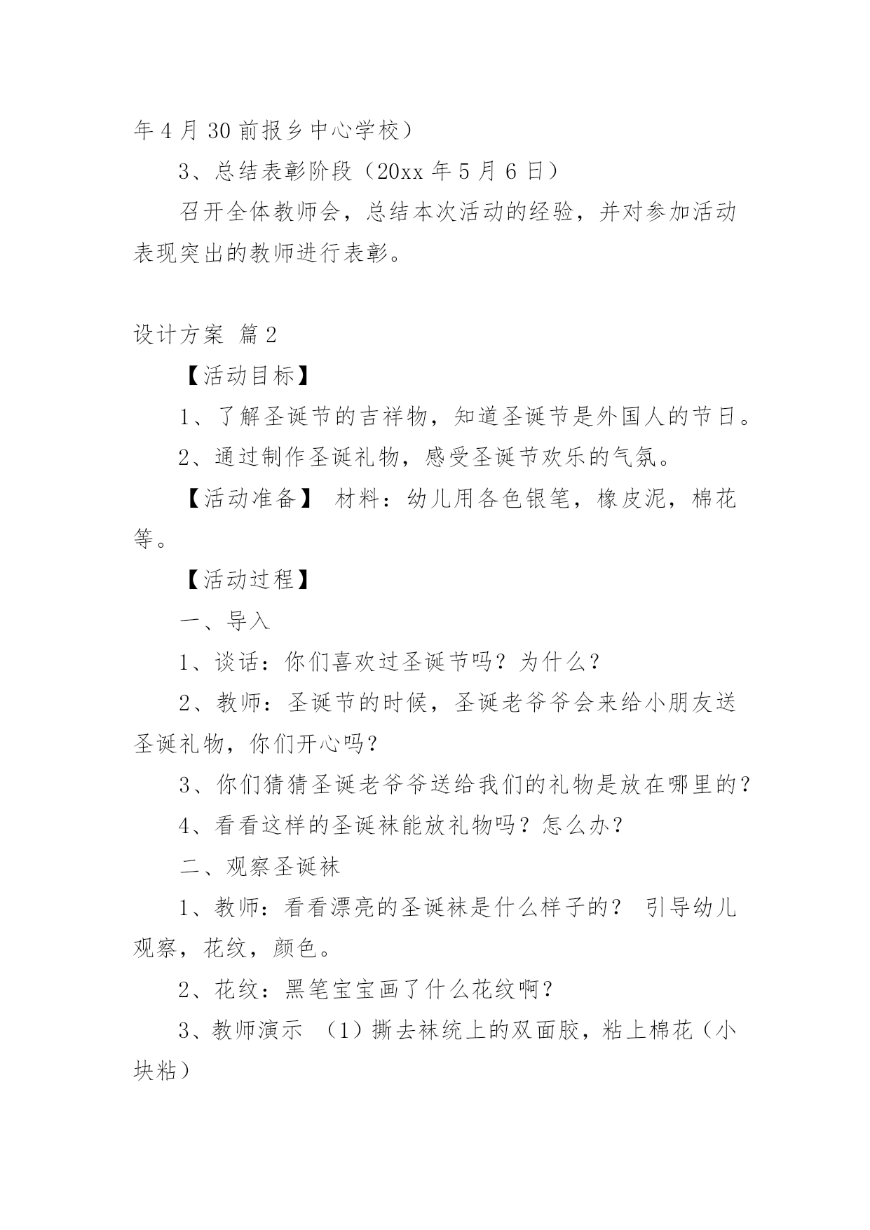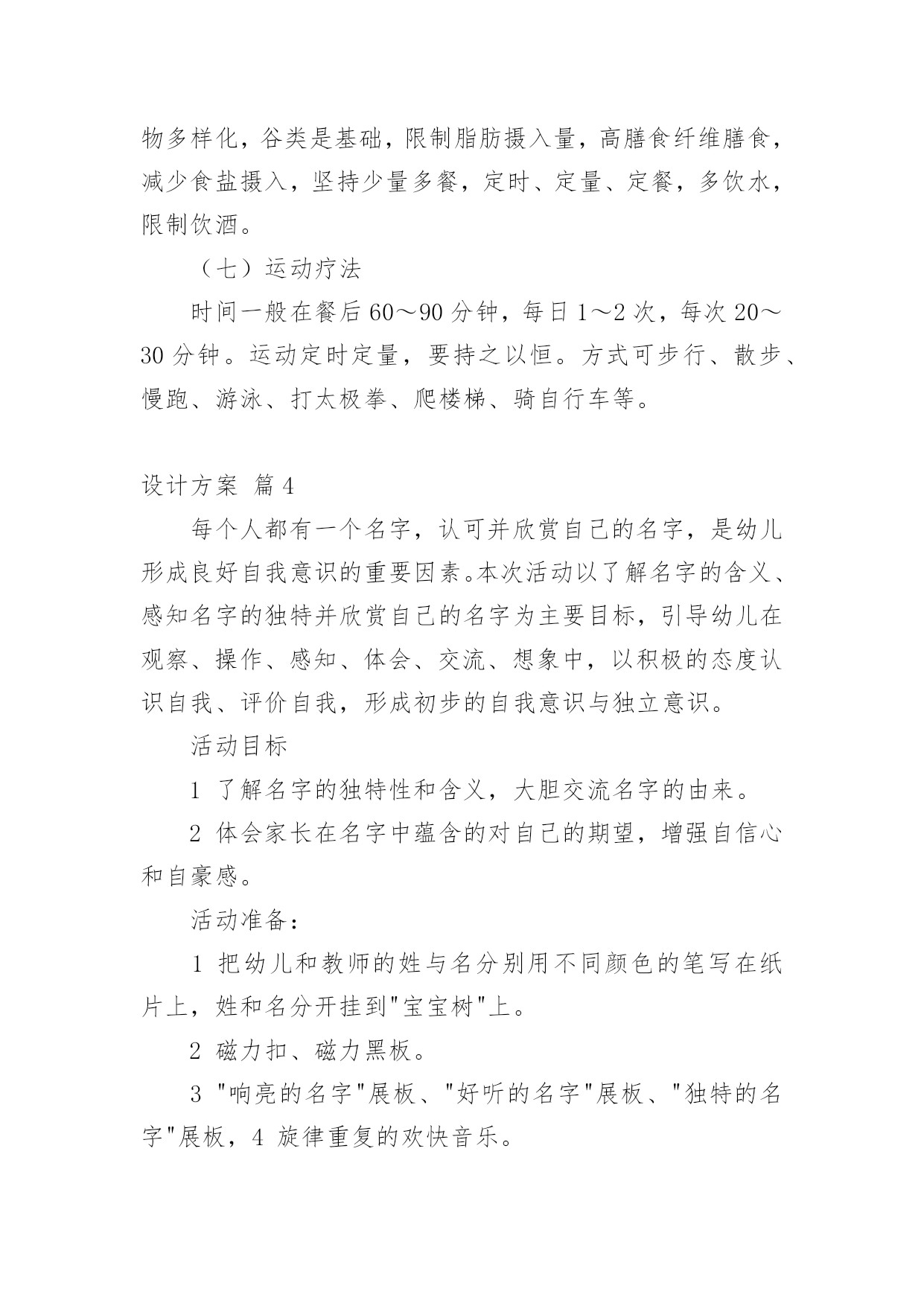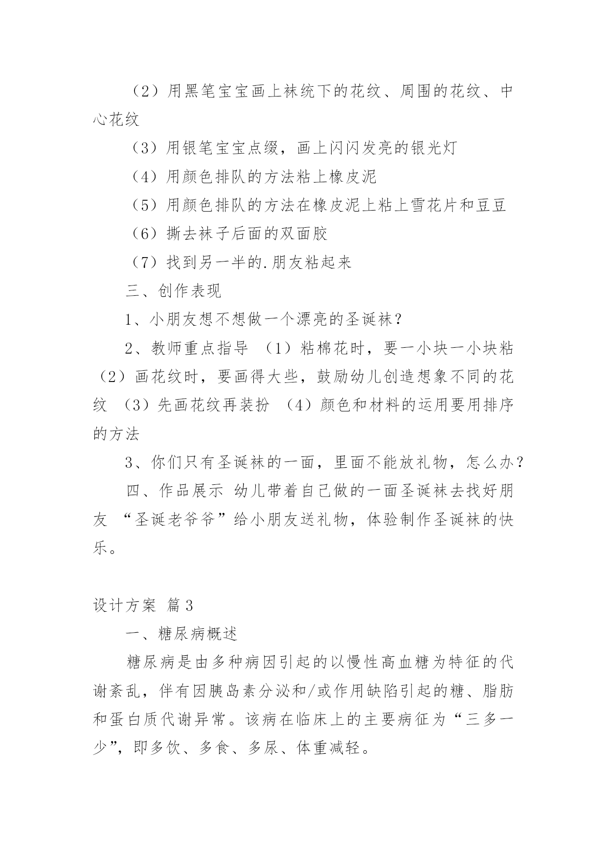 设计方案设计方案[优选]为了确保我们的努力取得实效,常常需要提前进行细致的方案准备工作,方案指的是为某一次行动所制定的计划类文书。我们应该怎么制定方案呢?以下是小编帮大家整理的设计方案9篇,仅供参考,欢迎大家阅读。设计方案篇1一、指导思想认真贯彻执行《国家中长期教育改革和发展规划纲要》和《国家教育信息化十年发展规划》,充分发挥现代信息技术优势,将信息技术与教育教学深度融合,促进教师利用现代教育技术提高课堂教学质量,不断提升教师信息化教学水平和综合能力,让教师的信息化教学和学生的信息化学习成为常态。二、活动目标每位教师都能应用现代信息技术手段进行教学,促进教育信息化规模应用,提升教师信息素养,深入推进教法创新,实现教与学方式变革,提高课堂教学效率,促进信息技术与教育教学深度融合。三、活动范围学科范围:小学阶段当前所开设的所有学科人员范围:全体任课教师四、组织领导机构及成员职责学校成立‘一师一优课、一课一名师’活动领导小组”,负责活动的组织领导和实施开展工作,具体分工和责任情况如下:组长:赵先明(负责活动的动员工作)副组长:严俊(负责活动的开展工作)成员:汤爱军江兰朱少安赵亚东(听课评课活动)参与人员:全体教师五、活动具体安排1、宣传、培训阶段(20xx年3月上旬)(1)召开全体教师会,学习“区教育局关于在全区中小学开展‘一师一优课、一课一名师’活动的`通知”精神。(20xx年11月20日下午,董得志负责)(2)召开全体教师会,学习‘一师一优课、一课一名师’活动方案”,让全体教师了解我校的活动开展步骤及本人在活动中所承担的任务。(3)“统一思想,端正态度,克服畏难情绪”思想政治工作。(4)“电子白板使用、PPT制作”指导2、活动实施阶段(20xx年3月——20xx年4月)(1)参加活动的教师自行开展选课、备课、收集整理材料工作。(2)开展听评课活动。(20xx年3月16日——4月30日,具体时间及人员安排见附表)(3)评选推存参加乡“一课一名师”优质课活动。(20xx年4月30前报乡中心学校)3、总结表彰阶段(20xx年5月6日)召开全体教师会,总结本次活动的经验,并对参加活动表现突出的教师进行表彰。设计方案篇2【活动目标】1、了解圣诞节的吉祥物,知道圣诞节是外国人的节日。2、通过制作圣诞礼物,感受圣诞节欢乐的气氛。【活动准备】材料:幼儿用各色银笔,橡皮泥,棉花等。【活动过程】一、导入1、谈话:你们喜欢过圣诞节吗?为什么?2、教师:圣诞节的时候,圣诞老爷爷会来给小朋友送圣诞礼物,你们开心吗?3、你们猜猜圣诞老爷爷送给我们的礼物是放在哪里的?4、看看这样的圣诞袜能放礼物吗?怎么办?二、观察圣诞袜1、教师:看看漂亮的圣诞袜是什么样子的?引导幼儿观察,花纹,颜色。2、花纹:黑笔宝宝画了什么花纹啊?3、教师演示(1)撕去袜统上的双面胶,粘上棉花(小块粘)(2)用黑笔宝宝画上袜统下的花纹、周围的花纹、中心花纹(3)用银笔宝宝点缀,画上闪闪发亮的银光灯(4)用颜色排队的方法粘上橡皮泥(5)用颜色排队的方法在橡皮泥上粘上雪花片和豆豆(6)撕去袜子后面的双面胶(7)找到另一半的.朋友粘起来三、创作表现1、小朋友想不想做一个漂亮的圣诞袜?2、教师重点指导(1)粘棉花时,要一小块一小块粘(2)画花纹时,要画得大些,鼓励幼儿创造想象不同的花纹(3)先画花纹再装扮(4)颜色和材料的运用要用排序的方法3、你们只有圣诞袜的一面,里面不能放礼物,怎么办?四、作品展示幼儿带着自己做的一面圣诞袜去找好朋友“圣诞老爷爷”给小朋友送礼物,体验制作圣诞袜的快乐。设计方案篇3一、糖尿病概述糖尿病是由多种病因引起的以慢性高血糖为特征的代谢紊乱,伴有因胰岛素分泌和/或作用缺陷引起的糖、脂肪和蛋白质代谢异常。该病在临床上的主要病征为“三多一少”,即多饮、多食、多尿、体重减轻。糖尿病分1型糖尿病、2型糖尿病、妊娠糖尿病及其他特殊类型糖尿病。在糖尿病患者中,2型糖尿病所占比例约90%,以胰岛素抵抗为主,伴胰岛素分泌不足。也叫成人发病型糖尿病,多在35~40岁之后发病。就中医而言,我国最早的医书《黄帝内经·素问》及《灵枢》中就记载“消渴症”病名。汉代名医张仲景《金匮要略》之消渴篇对“三多”症状亦有记载。唐朝初年,我国著名医家甄立言首先指出,消渴症患者的`小便是甜的。二、糖尿病诊断新标准1.糖尿病症状*+任意时间血浆葡萄糖水平≥11.1mmol/L(200mg/dl)2.空腹血浆葡萄糖(FPG**)水平≥7.0mmol/L(126mg/dl)3.葡萄糖耐量试验(OGTT***)中,2h血糖值(PG)水平≥11.1mmol/L(200mg/dl)三、糖尿病的危害1.糖尿病引起病痛和治疗措施给患者带来不便。2.糖尿病并发症造成残废或者早亡。3.用于糖尿病治疗的费用可能给其本人、家庭、工