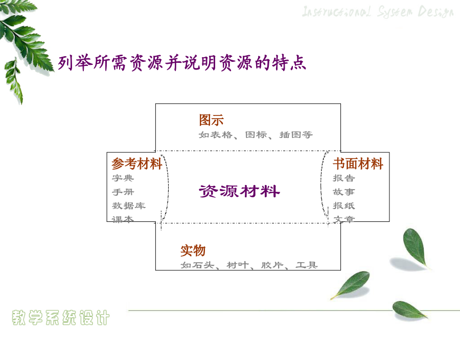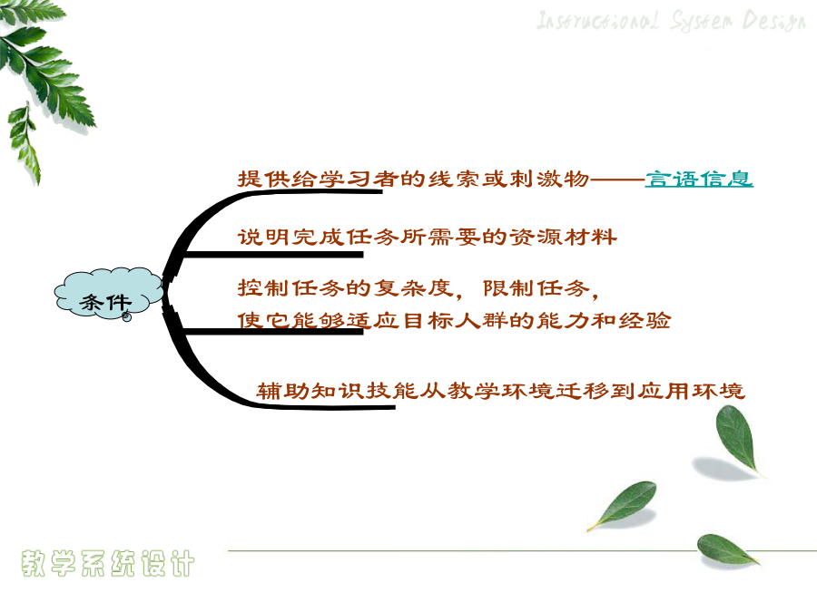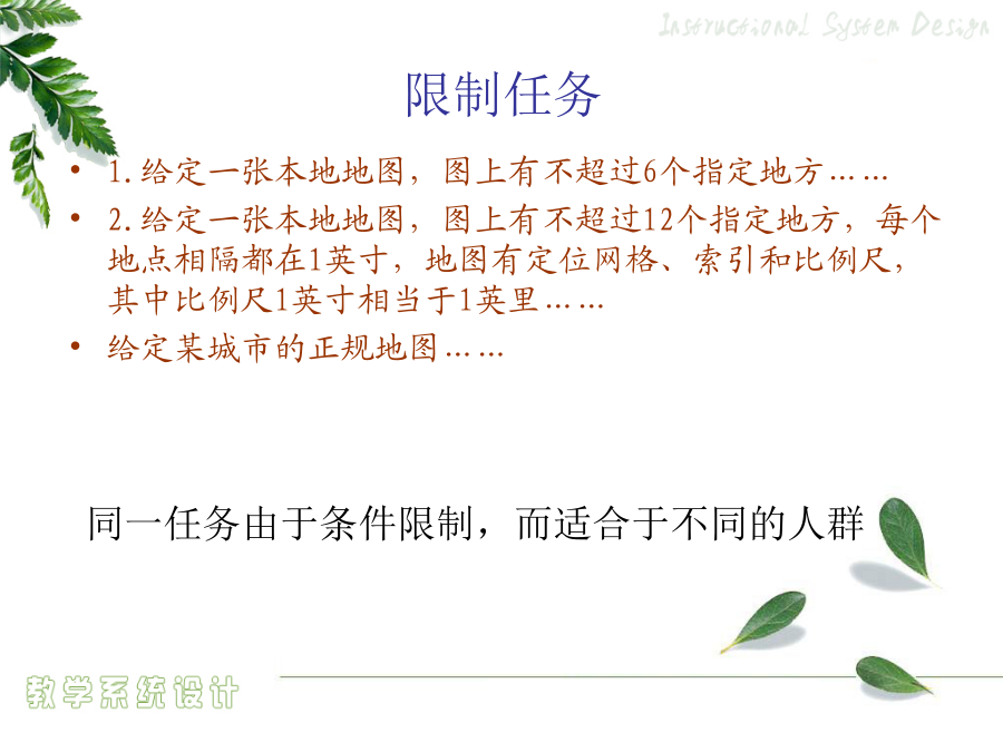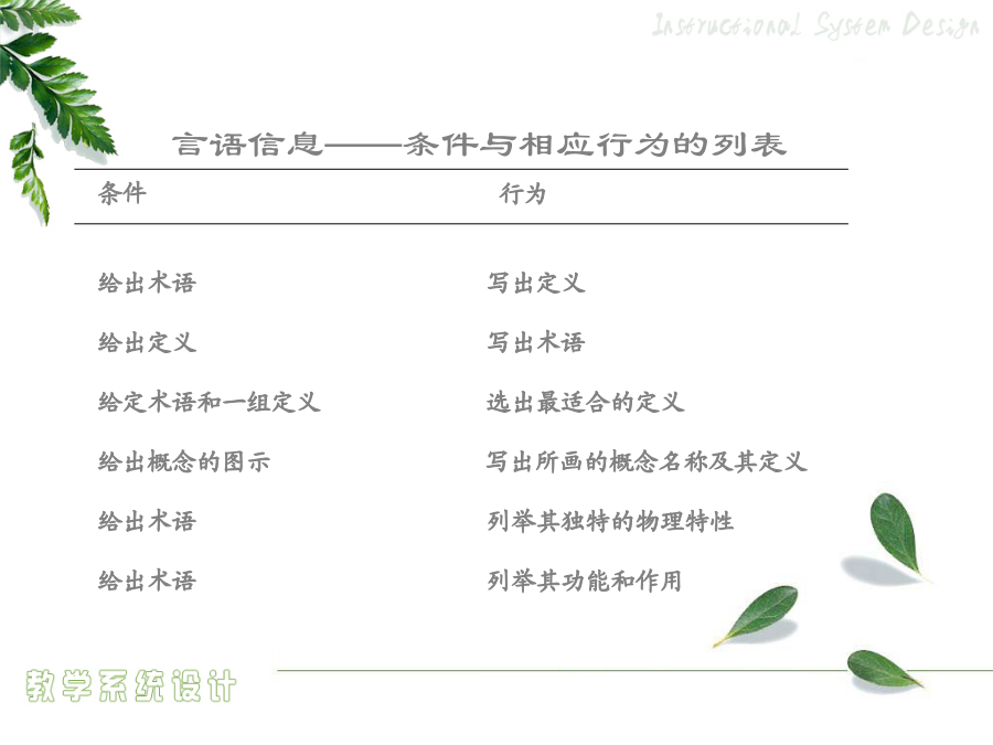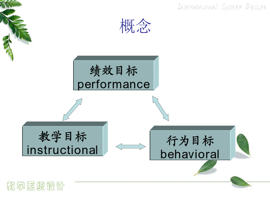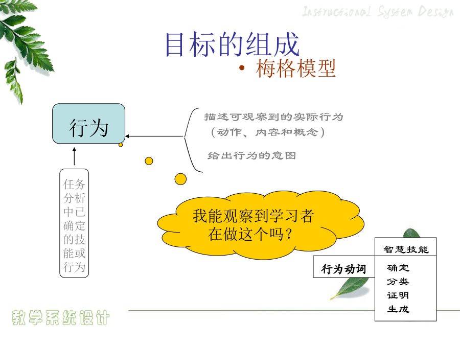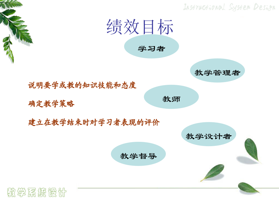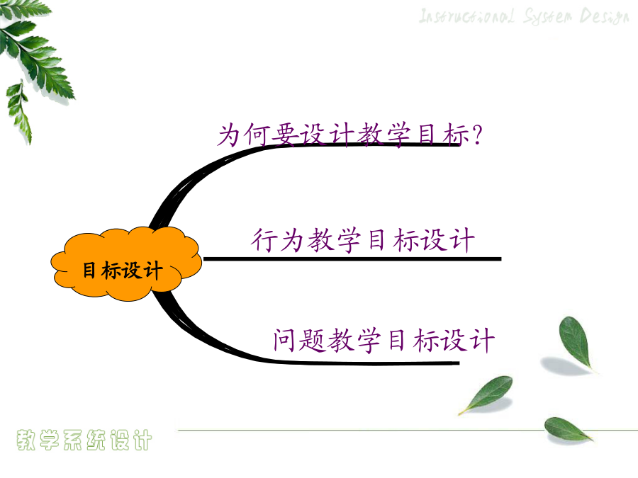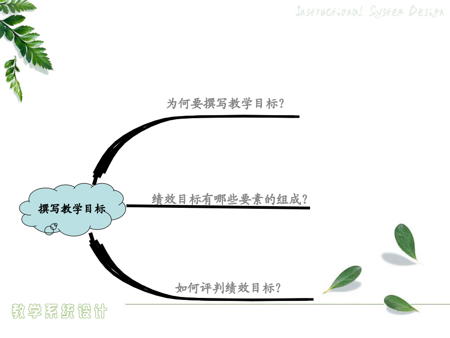 4.1教学目标设计绩效目标概念目标的组成提供给学习者的线索或刺激物——言语信息言语信息——条件与相应行为的列表资源材料限制任务假设要评测学习者的驾驶技术……态度学习怎样评判学习者的答案、作品和表现?1956版布鲁姆教育目标分类学:认知领域2001年版认知领域教育目标分类——认知过程维度2.2举例3.应用——在给定的情境中执行或者利用一种程序5.评价——基于标准做出判断怎样评判学习者的答案、作品和表现?撰写绩效目标的步骤学期目标示例(引导旨在解决问题的小组讨论)言语信息和智慧技能任务的绩效目标示例注意:关键术语作为学习者定位记忆中所存储的相关信息和线索,一定要出现在考试题中。如,促进协作交流的成员行为心智运动技能和对应的绩效目标示例态度和对应的绩效目标示例可管理的态度和对应的绩效目标示例目标评价用于判断教学目标的工作检查表核心概念行为目标behavioral教育目的——国家培养人的总目标或称终极教育目标(终极性)(教育方针)培养目标——各级各类学校的教育目标(时代性)(新课程的培养目标)课程目标(学科)(学科性)——各个学科、各门课程、各个领域的教育目标(课程标准)教学目标——教学活动要达成的教育目标(活动性)(学期、章、单元、课时)(教学计划、设计或教案)教学目标意义教学目标的设计行为目标的优点与局限性课程标准的分析与描述《NeedsandDirections》三维教学目标知识技能目标的分析描述方法“理解”学习业绩的描述举例“基本技能掌握”学习业绩的描述举例学科学科学科“过程与方法”目标的分析描述方法“过程与方法”目标的描述易犯错误易犯错误“过程与方法”目标的描述方法“过程与方法”目标的描述举例态度情感、价值观目标的分析描述方法态度情感、价值观目标的描述方法三维课程目标的和谐统一初中物理“密度”教学任务分析表问题的普遍性基本问题的概念基本问题的特点基于单元问题的教学目标设计学习类型认知领域动作技能领域情感领域基本问题与单元问题一位美国历史教师的教学数学教学案例DeborahBall自述行为教学目标条件言语信息——条件与相应行为的列表资源材料限制任务假设要评测学习者的驾驶技术……态度学习例子思考问题教学目标问题教学目标设计的关键基础教育课堂教学目标设计设计的方法企业培训目标的设计企业绩效目标撰写的程序教学目标排序排序的方式教学目标排序法则流程图检查合适的排序过程,以便做到沟通口头信息…考虑对教学目标进行排序的方法,以便在激励学员在做任何事情之前,就明白教学对他们和组织的重要性按照学习任务或学员特点对教学终极目标或最基本的子目标进行排序必须为变化创造一种推动力否则教学内容就无法在工作环境中得到转化,从而使教学活动本身变得毫无效果。决定教学目标的排序,考虑各种排序的备选方式确定这些方面的优先顺序以掌握排序的决定权,并且不要限制选择,以便找到最适合的排序方法决定教学终极目标或最基本的子目标的排序,从下面的方法中进行选择:按时间顺序按主题内容排序按全部到部分排序按部分到全部排序从已知到未知排序按循序渐进排序按部分到部分再到部分排序按一般到具体排序教学目标排序检测表(第一部分:条件)教学目标排序检测表(第一部分:决定)