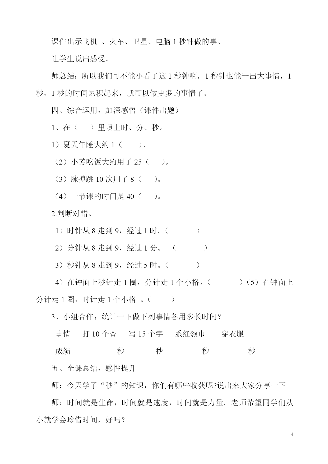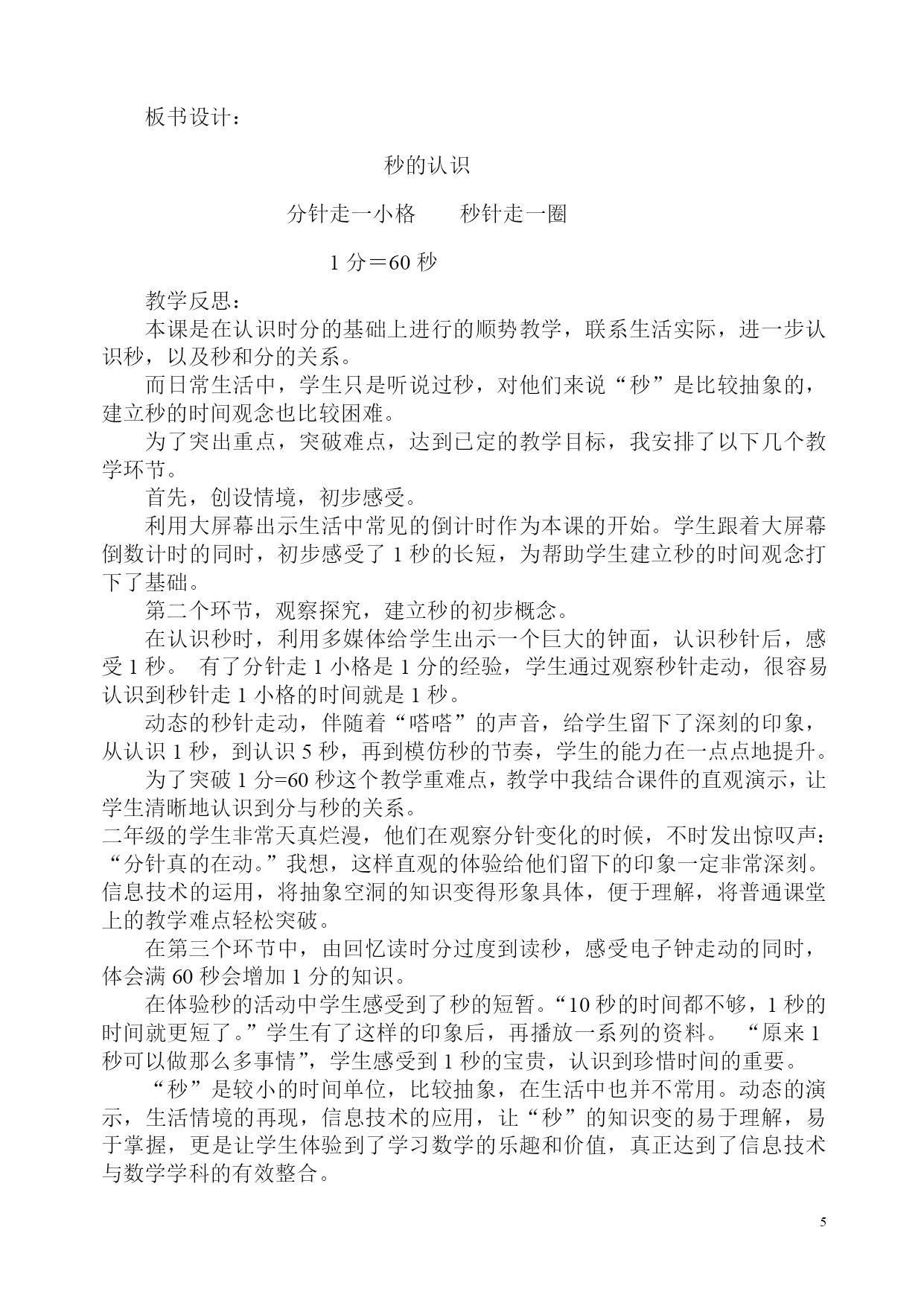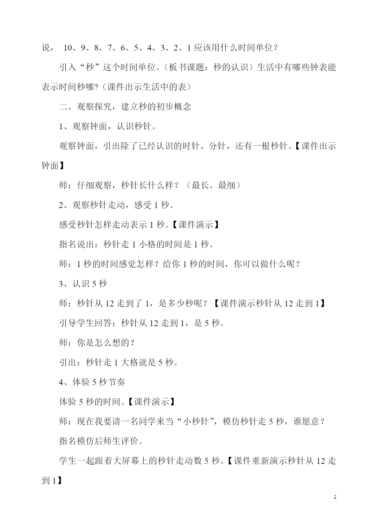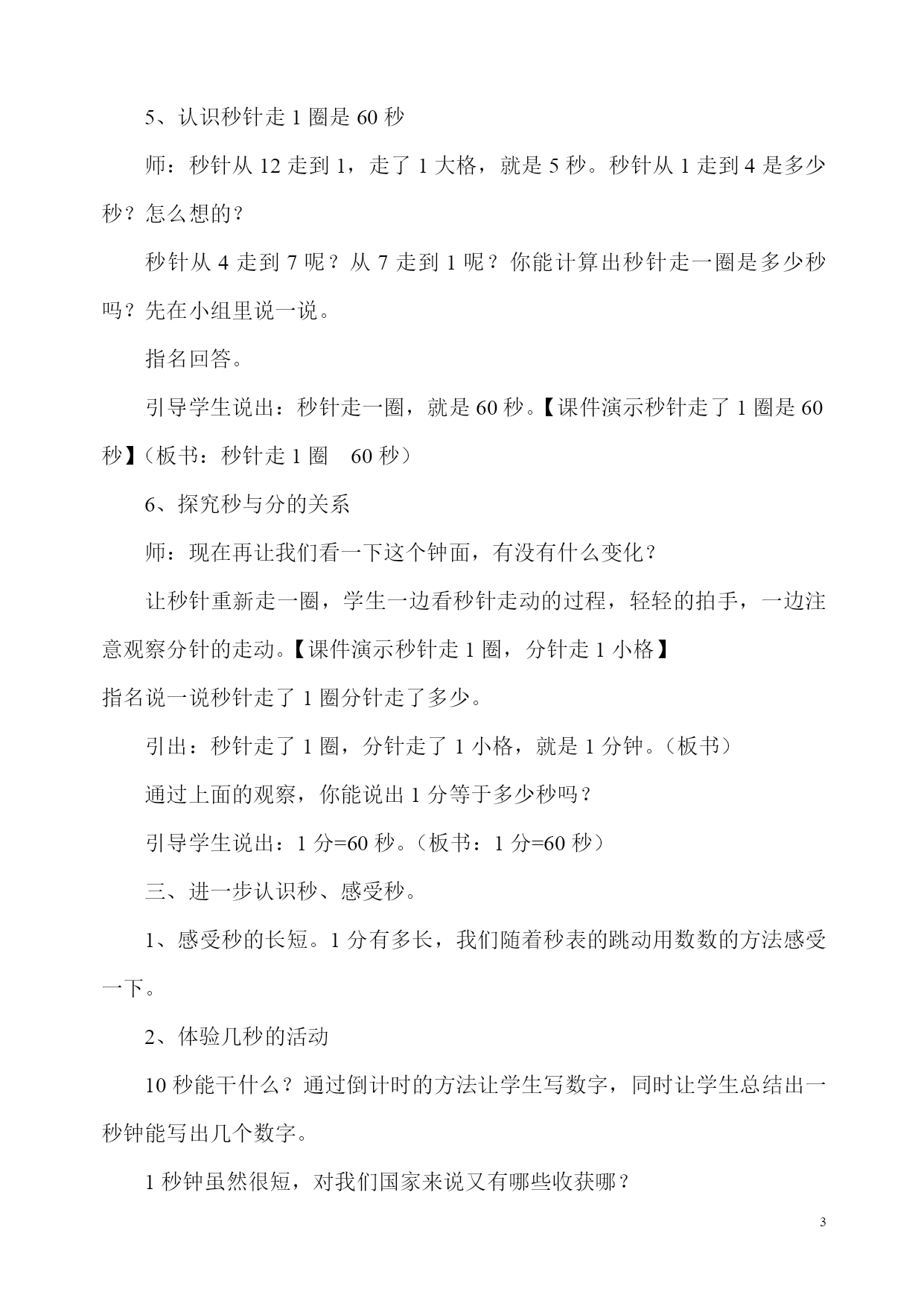 秒的认识教学设计台前县城关镇小学李庆杰教学内容:课标实验教材第五册第59-61页,练习十四1、6题。教学目标:知识与技能:认识秒,知道1分=60秒,初步建立秒的时间观念。过程与方法:在学生观察钟面的过程中认识秒,在认识秒的过程中,培养学生的观察能力、探索能力。情感态度与价值观:体验数学与生活的联系,养成遵守和爱惜时间的良好习惯,培养学生积极的学习情感与态度。教学重点:认识秒,知道1分=60秒,初步建立秒的时间观念。探究秒与分的关系。教学用具:教学课件、电子表、钟表若干教学过程:一、创设情境,初步感受同学们,看——放映课件(新年到,鞭炮声声,小孩子欢天喜地,午夜将要到来,春节联欢会上新年钟声敲响前全体倒计时的情景,让我们用倒计时来迎接新年的到来)10、9、8、7、6、5、……师:跟随着时间的脚步,我们又倾听了一次新年的钟声。那么,谁能说说,10、9、8、7、6、5、4、3、2、1应该用什么时间单位?引入“秒”这个时间单位。(板书课题:秒的认识)生活中有哪些钟表能表示时间秒哪?(课件出示生活中的表)二、观察探究,建立秒的初步概念1、观察钟面,认识秒针。观察钟面,引出除了已经认识的时针、分针,还有一根秒针。【课件出示钟面】师:仔细观察,秒针长什么样?(最长、最细)2、观察秒针走动,感受1秒。感受秒针怎样走动表示1秒。【课件演示】指名说出:秒针走1小格的时间是1秒。师:1秒的时间感觉怎样?给你1秒的时间,你可以做什么呢?3、认识5秒师:秒针从12走到了1,是多少秒呢?【课件演示秒针从12走到1】引导学生回答:秒针从12走到1,是5秒。师:你是怎么想的?引出:秒针走1大格就是5秒。4、体验5秒节奏体验5秒的时间。【课件演示】师:现在我要请一名同学来当“小秒针”,模仿秒针走5秒,谁愿意?指名模仿后师生评价。学生一起跟着大屏幕上的秒针走动数5秒。【课件重新演示秒针从12走到1】5、认识秒针走1圈是60秒师:秒针从12走到1,走了1大格,就是5秒。秒针从1走到4是多少秒?怎么想的?秒针从4走到7呢?从7走到1呢?你能计算出秒针走一圈是多少秒吗?先在小组里说一说。指名回答。引导学生说出:秒针走一圈,就是60秒。【课件演示秒针走了1圈是60秒】(板书:秒针走1圈60秒)6、探究秒与分的关系师:现在再让我们看一下这个钟面,有没有什么变化?让秒针重新走一圈,学生一边看秒针走动的过程,轻轻的拍手,一边注意观察分针的走动。【课件演示秒针走1圈,分针走1小格】指名说一说秒针走了1圈分针走了多少。引出:秒针走了1圈,分针走了1小格,就是1分钟。(板书)通过上面的观察,你能说出1分等于多少秒吗?引导学生说出:1分=60秒。(板书:1分=60秒)三、进一步认识秒、感受秒。1、感受秒的长短。1分有多长,我们随着秒表的跳动用数数的方法感受一下。2、体验几秒的活动10秒能干什么?通过倒计时的方法让学生写数字,同时让学生总结出一秒钟能写出几个数字。1秒钟虽然很短,对我们国家来说又有哪些收获哪?课件出示飞机、火车、卫星、电脑1秒钟做的事。让学生说出感受。师总结:所以我们可不能小看了这1秒钟啊,1秒钟也能干出大事情,1秒、1秒的时间累积起来,就可以做更多的事情了。四、综合运用,加深感悟(课件出题)1、在()里填上时、分、秒。1)夏天午睡大约1()。(2)小芳吃饭大约用了25()。(3)脉搏跳10次用了8()。(4)一节课的时间是40()。2.判断对错。1)时针从8走到9,经过1时。()2)分针从8走到9,经过1分。()3)秒针从8走到9,经过5时。()4)在钟面上秒针走1圈,分针走1个小格。()(5)在钟面上分针走1圈,时针走1个小格。()3、小组合作;统计一下做下列事情各用多长时间?事情打10个☆写15个字系红领巾穿衣服成绩秒秒秒秒五、全课总结,感性提升师:今天学了“秒”的知识,你们有哪些收获呢?说出来大家分享一下师:时间就是生命,时间就是速度,时间就是力量。老师希望同学们从小就学会珍惜时间,好吗?板书设计:秒的认识分针走一小格秒针走一圈1分=60秒教学反思:本课是在认识时分的基础上进行的顺势教学,联系生活实际,进一步认识秒,以及秒和分的关系。而日常生活中,学生只是听说过秒,对他们来说“秒”是比较抽象的,建立秒的时间观念也比较困难。为了突出重点,突破难点,达到已定的教学目标,我安排了以下几个教学环节。首先,创设情境,初步感受。利用大屏幕出示生活中常见的倒计时作为本课的开始。学生跟着大屏幕倒数计时的同时,初步感受了1秒的长短,为帮助学生建立秒的时间观念打下了基础。第二个环节,观察探
