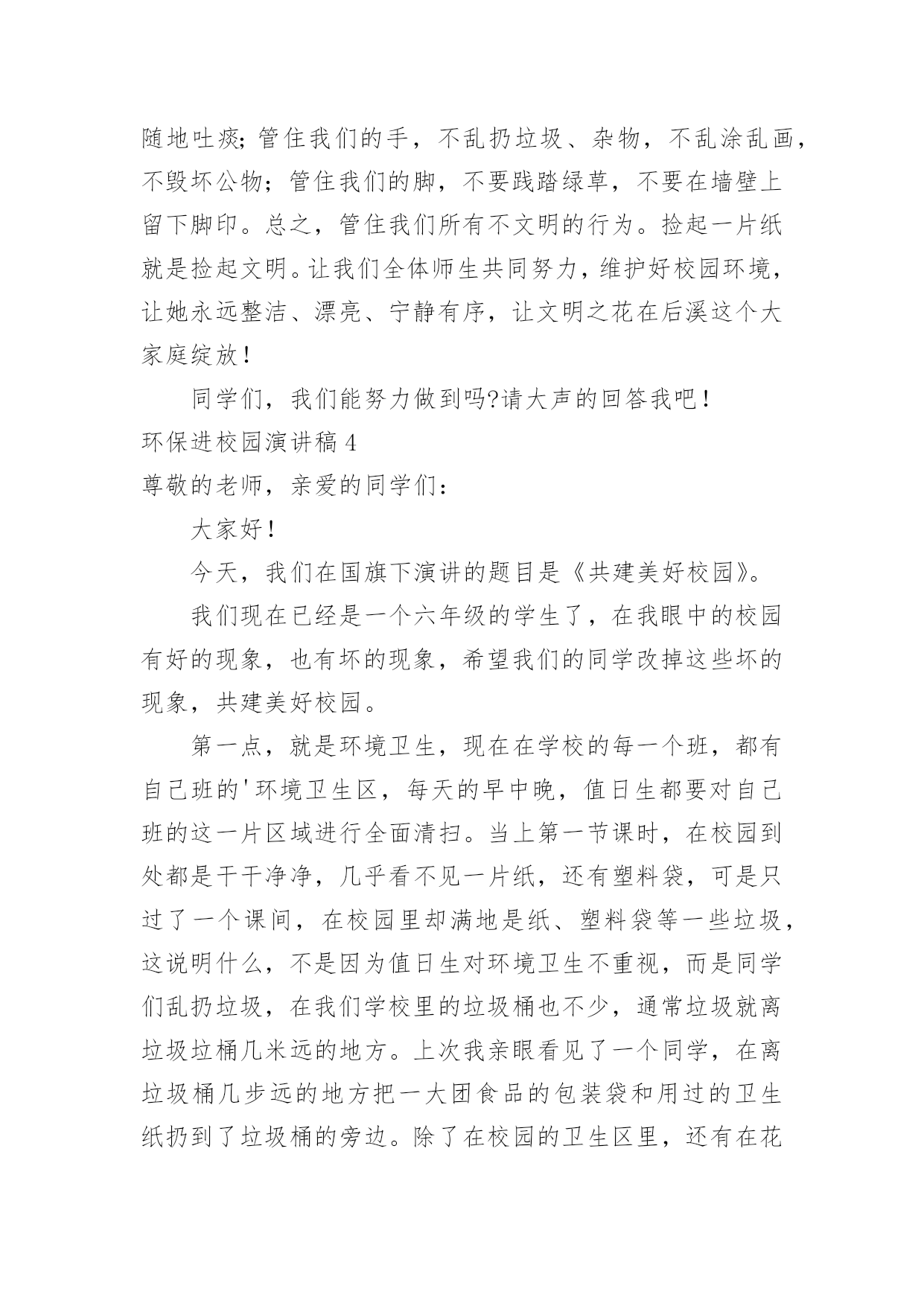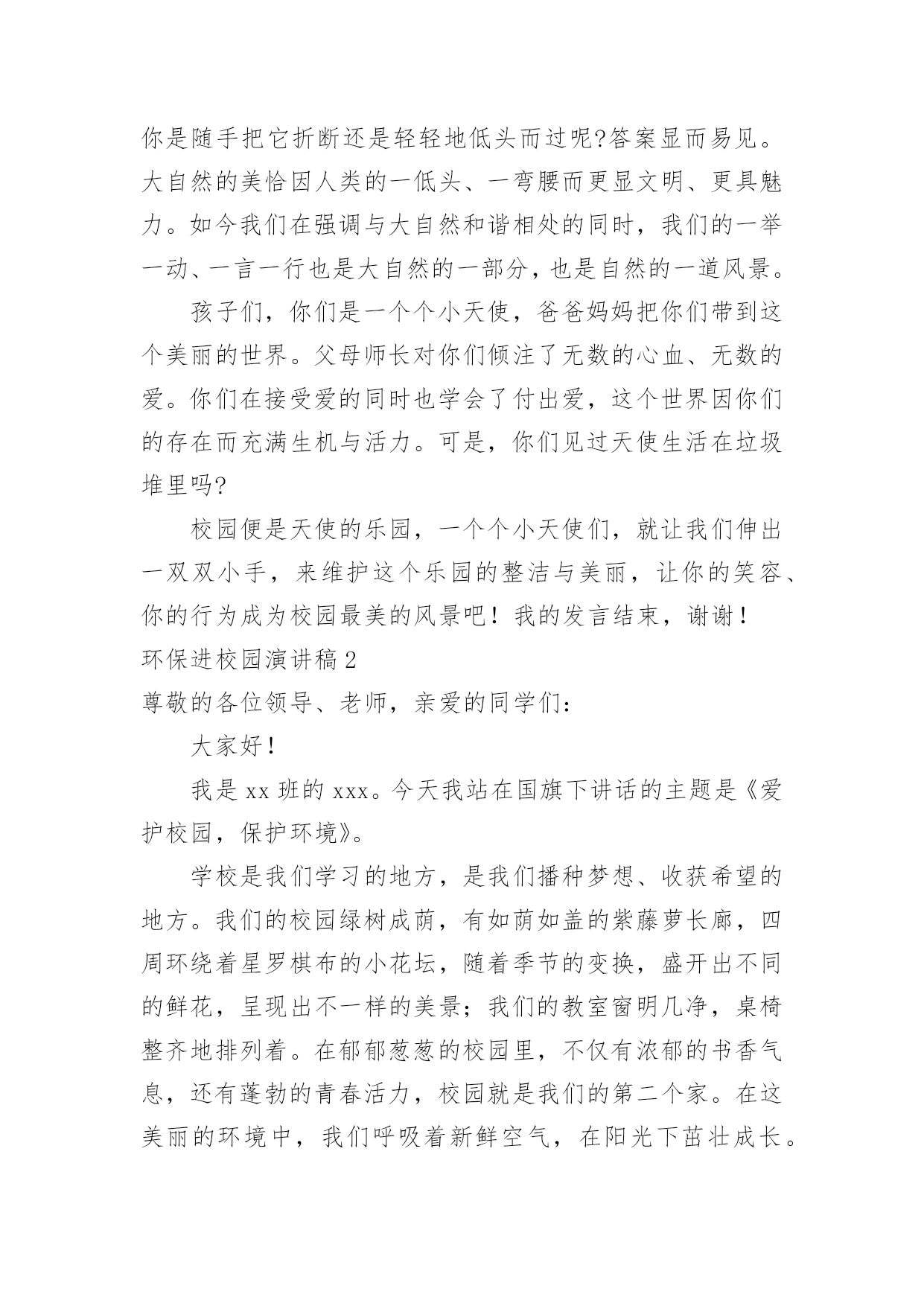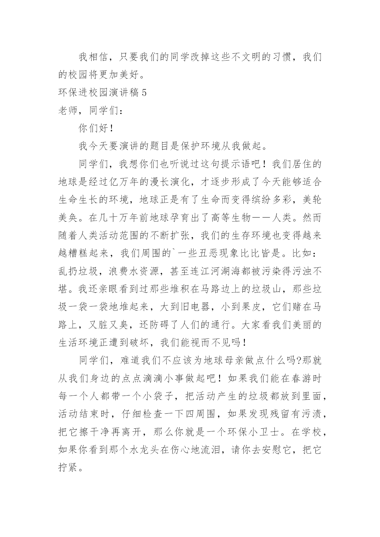 环保进校园演讲稿环保进校园演讲稿演讲稿具有观点鲜明,内容具有鼓动性的特点。在学习、工作生活中,演讲稿对我们的作用越来越大,在写之前,可以先参考范文,以下是小编帮大家整理的环保进校园演讲稿,仅供参考,大家一起来看看吧。环保进校园演讲稿1同学们:每一个清晨踏进美丽的校园,看着鲜艳的五星红旗,享受缕缕阳光,你可否有一种幸福的感觉。校园以他的洁净、以他独特的文化氛围给每一个走进他的人带来一种愉悦的心情、积极进取的心态。难怪一个又一个教育家、一所有一所的知名院校都十分重视环境的育人功能。可是,美丽、整洁的校园环境从哪儿来,如何保持他的整洁与美丽呢?有一句话说天下兴亡,匹夫有责,每一个人的责任,首先就是我自己的'责任,我想把它改为:校园的整洁与美丽,我的责任。因为每一个人的责任更是我的责任,以此与老师、同学们共勉。同学们,当你们走在路上看到一个被随意丢弃的纸团,你会如何去做呢?是一脚把它踢开,还是用手捡起它,再扔进垃圾箱呢?当你出去散步时,一根柳枝挡住了你的视线,你是随手把它折断还是轻轻地低头而过呢?答案显而易见。大自然的美恰因人类的一低头、一弯腰而更显文明、更具魅力。如今我们在强调与大自然和谐相处的同时,我们的一举一动、一言一行也是大自然的一部分,也是自然的一道风景。孩子们,你们是一个个小天使,爸爸妈妈把你们带到这个美丽的世界。父母师长对你们倾注了无数的心血、无数的爱。你们在接受爱的同时也学会了付出爱,这个世界因你们的存在而充满生机与活力。可是,你们见过天使生活在垃圾堆里吗?校园便是天使的乐园,一个个小天使们,就让我们伸出一双双小手,来维护这个乐园的整洁与美丽,让你的笑容、你的行为成为校园最美的风景吧!我的发言结束,谢谢!环保进校园演讲稿2尊敬的各位领导、老师,亲爱的同学们:大家好!我是xx班的xxx。今天我站在国旗下讲话的主题是《爱护校园,保护环境》。学校是我们学习的地方,是我们播种梦想、收获希望的地方。我们的校园绿树成荫,有如荫如盖的紫藤萝长廊,四周环绕着星罗棋布的小花坛,随着季节的变换,盛开出不同的鲜花,呈现出不一样的美景;我们的教室窗明几净,桌椅整齐地排列着。在郁郁葱葱的校园里,不仅有浓郁的书香气息,还有蓬勃的青春活力,校园就是我们的第二个家。在这美丽的环境中,我们呼吸着新鲜空气,在阳光下茁壮成长。但是,有一些同学却不能好好爱护自己的这个家。总有几个袋子、纸屑、易拉罐被随意的抛出,掉在某个角落里、小路边;总有不安分的手要去采摘花坛的鲜花、有不安分的脚去践踏草地的小草;吃完串串后的竹签扎在了树上;倒垃圾的同学将垃圾漏出到路上,却并不随手去捡起来。还有其他类似的行为,虽然只是一个不经意的动作,但却破坏了校园的环境,破坏了同学们学习的心情。而那几片零星的垃圾,又要有多少同学花多少时间去捡拾,原本只是一个微小的动作,却给其他人带来了莫大的影响,我们为什么就不能让自己的行为更文明些,更得体些呢?记得曾经听过这样一个故事,一个外国人走在中国的大街上,正好看见一位中国青年随手扔了一个塑料空瓶,外国人赶忙走上前去捡起来丢进了垃圾桶。这一扔一捡之间,将国人的道德素养体现得淋漓尽致。我们不能像故事中的青年那样,把垃圾随手乱扔,那样,我们丢掉的是文明,失去的是品德。作为当代青少年,我们应该多做有益于环境的`事,有益于国家的事,做一个美好校园的守护者。合肥是全国文明城市,作为一名小市民,我们也应该为我们城市的今天和明天添砖加瓦。各位同学,在我们的日常生活中,不能仅靠老师的提醒,同学的监督来规范自己的行为,更应该做到自觉遵守规章制度,提高我们的环保意识,从自己做起,从点滴做起,爱护我们的校园环境,共同营造更美好的校园!谢谢大家!环保进校园演讲稿3尊敬的各位老师,亲爱的同学们:大家早上好!我们都知道,校园环境是一个学校的窗口,直观地反映了学校的精神风貌,体现了学校的文化氛围。洁净、舒适、安全的校园环境不仅是我们学习生活的需要,而且是陶冶情操的需要,营造优良的校园环境是我们每个人的神圣职责。为此,我们学校在第五周在初一、初二、高一、高二级开展了爱我校园,美化校园献花活动,四个年级的同学积极响应,怀着对学校的爱心,为学校的美化绿化贡献自己的一份力量。同学们有的把家里平时培育的盆栽献给母校,有的拿出自己积攒的零花钱购买鲜花带到学校,更令我们感动的是我们的家长带着孩子把家里培养的漂亮盆栽送到学校。几天的时间,上百盆品种各异的绿色植物,摆放在教学楼各楼层的各个角落,校貌顿时焕然一新,到处生机盎然。绿色是生命的象征,绿色代表了希望。小小的一盆植物,为全校师生的工作、学习、生活增添了色彩,给我们带来愉悦的心情。与此同时,在上一周我们开展了全校性的清洁校园大行动的公益劳动,掀起了创建美丽校园的又一个高潮。一个星期来,我们各班同学在班主任老师的带领下,对教室和负责哪里;