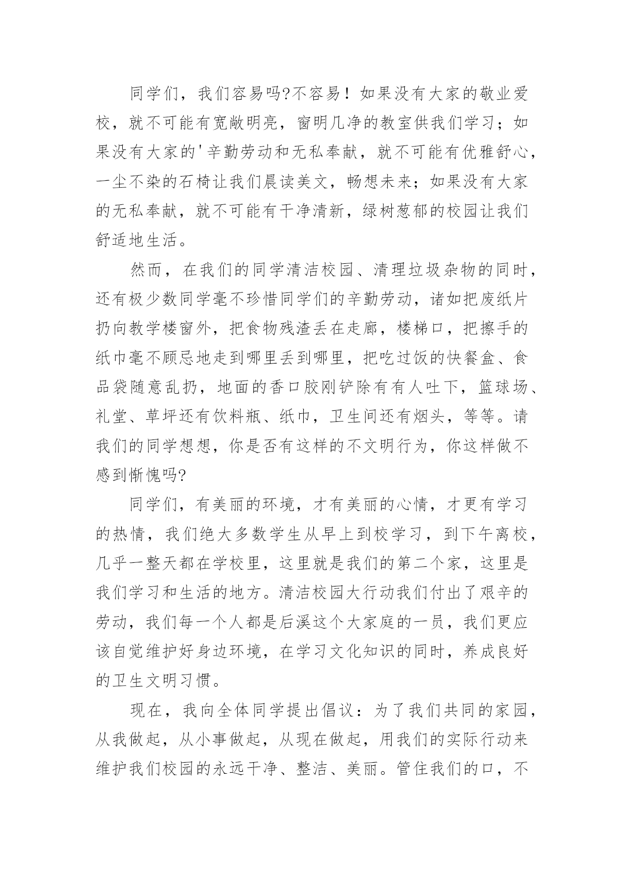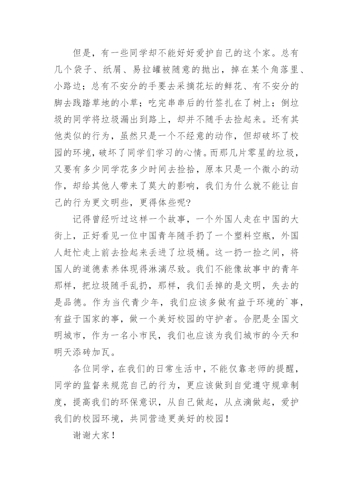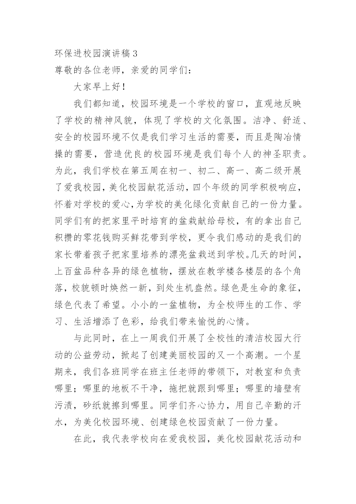 环保进校园演讲稿环保进校园演讲稿演讲稿具有观点鲜明,内容具有鼓动性的特点。在学习、工作生活中,演讲稿对我们的作用越来越大,在写之前,可以先参考范文,以下是小编帮大家整理的环保进校园演讲稿,仅供参考,大家一起来看看吧。环保进校园演讲稿1同学们:每一个清晨踏进美丽的校园,看着鲜艳的五星红旗,享受缕缕阳光,你可否有一种幸福的感觉。校园以他的洁净、以他独特的文化氛围给每一个走进他的人带来一种愉悦的心情、积极进取的心态。难怪一个又一个教育家、一所有一所的知名院校都十分重视环境的育人功能。可是,美丽、整洁的校园环境从哪儿来,如何保持他的整洁与美丽呢?有一句话说天下兴亡,匹夫有责,每一个人的责任,首先就是我自己的'责任,我想把它改为:校园的整洁与美丽,我的责任。因为每一个人的责任更是我的责任,以此与老师、同学们共勉。同学们,当你们走在路上看到一个被随意丢弃的纸团,你会如何去做呢?是一脚把它踢开,还是用手捡起它,再扔进垃圾箱呢?当你出去散步时,一根柳枝挡住了你的视线,你是随手把它折断还是轻轻地低头而过呢?答案显而易见。大自然的美恰因人类的一低头、一弯腰而更显文明、更具魅力。如今我们在强调与大自然和谐相处的同时,我们的一举一动、一言一行也是大自然的一部分,也是自然的一道风景。孩子们,你们是一个个小天使,爸爸妈妈把你们带到这个美丽的世界。父母师长对你们倾注了无数的心血、无数的爱。你们在接受爱的同时也学会了付出爱,这个世界因你们的存在而充满生机与活力。可是,你们见过天使生活在垃圾堆里吗?校园便是天使的乐园,一个个小天使们,就让我们伸出一双双小手,来维护这个乐园的整洁与美丽,让你的笑容、你的行为成为校园最美的风景吧!我的发言结束,谢谢!环保进校园演讲稿2尊敬的各位领导、老师,亲爱的同学们:大家好!我是xx班的xxx。今天我站在国旗下讲话的主题是《爱护校园,保护环境》。学校是我们学习的地方,是我们播种梦想、收获希望的地方。我们的校园绿树成荫,有如荫如盖的紫藤萝长廊,四周环绕着星罗棋布的小花坛,随着季节的变换,盛开出不同的鲜花,呈现出不一样的美景;我们的教室窗明几净,桌椅整齐地排列着。在郁郁葱葱的校园里,不仅有浓郁的书香气息,还有蓬勃的青春活力,校园就是我们的第二个家。在这美丽的环境中,我们呼吸着新鲜空气,在阳光下茁壮成长。但是,有一些同学却不能好好爱护自己的这个家。总有几个袋子、纸屑、易拉罐被随意的抛出,掉在某个角落里、小路边;总有不安分的手要去采摘花坛的鲜花、有不安分的脚去践踏草地的小草;吃完串串后的竹签扎在了树上;倒垃圾的同学将垃圾漏出到路上,却并不随手去捡起来。还有其他类似的行为,虽然只是一个不经意的动作,但却破坏了校园的环境,破坏了同学们学习的心情。而那几片零星的垃圾,又要有多少同学花多少时间去捡拾,原本只是一个微小的动作,却给其他人带来了莫大的影响,我们为什么就不能让自己的行为更文明些,更得体些呢?记得曾经听过这样一个故事,一个外国人走在中国的大街上,正好看见一位中国青年随手扔了一个塑料空瓶,外国人赶忙走上前去捡起来丢进了垃圾桶。这一扔一捡之间,将国人的道德素养体现得淋漓尽致。我们不能像故事中的青年那样,把垃圾随手乱扔,那样,我们丢掉的是文明,失去的是品德。作为当代青少年,我们应该多做有益于环境的`事,有益于国家的事,做一个美好校园的守护者。合肥是全国文明城市,作为一名小市民,我们也应该为我们城市的今天和明天添砖加瓦。各位同学,在我们的日常生活中,不能仅靠老师的提醒,同学的监督来规范自己的行为,更应该做到自觉遵守规章制度,提高我们的环保意识,从自己做起,从点滴做起,爱护我们的校园环境,共同营造更美好的校园!谢谢大家!环保进校园演讲稿3尊敬的各位老师,亲爱的同学们:大家早上好!我们都知道,校园环境是一个学校的窗口,直观地反映了学校的精神风貌,体现了学校的文化氛围。洁净、舒适、安全的校园环境不仅是我们学习生活的需要,而且是陶冶情操的需要,营造优良的校园环境是我们每个人的神圣职责。为此,我们学校在第五周在初一、初二、高一、高二级开展了爱我校园,美化校园献花活动,四个年级的同学积极响应,怀着对学校的爱心,为学校的美化绿化贡献自己的一份力量。同学们有的把家里平时培育的盆栽献给母校,有的拿出自己积攒的零花钱购买鲜花带到学校,更令我们感动的是我们的家长带着孩子把家里培养的漂亮盆栽送到学校。几天的时间,上百盆品种各异的绿色植物,摆放在教学楼各楼层的各个角落,校貌顿时焕然一新,到处生机盎然。绿色是生命的象征,绿色代表了希望。小小的一盆植物,为全校师生的工作、学习、生活增添了色彩,给我们带来愉悦的心情。与此同时,在上一周我们开展了全校性的清洁校园大行动的公益劳动,掀起了创建美丽校园的又一个高潮。一个星期来,我们各班同学在班主任老师的带领下,对教室和负责哪里;