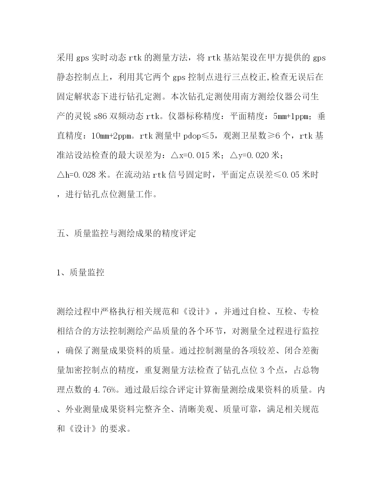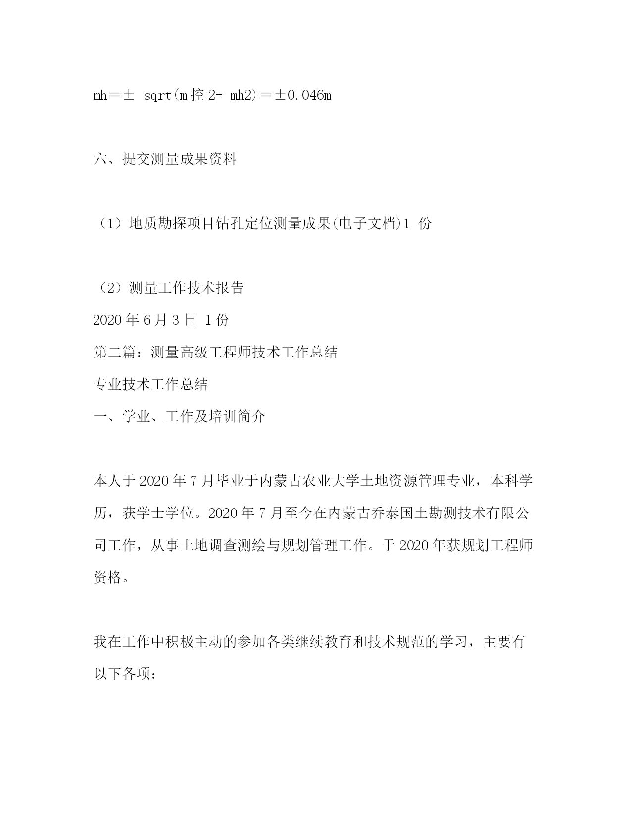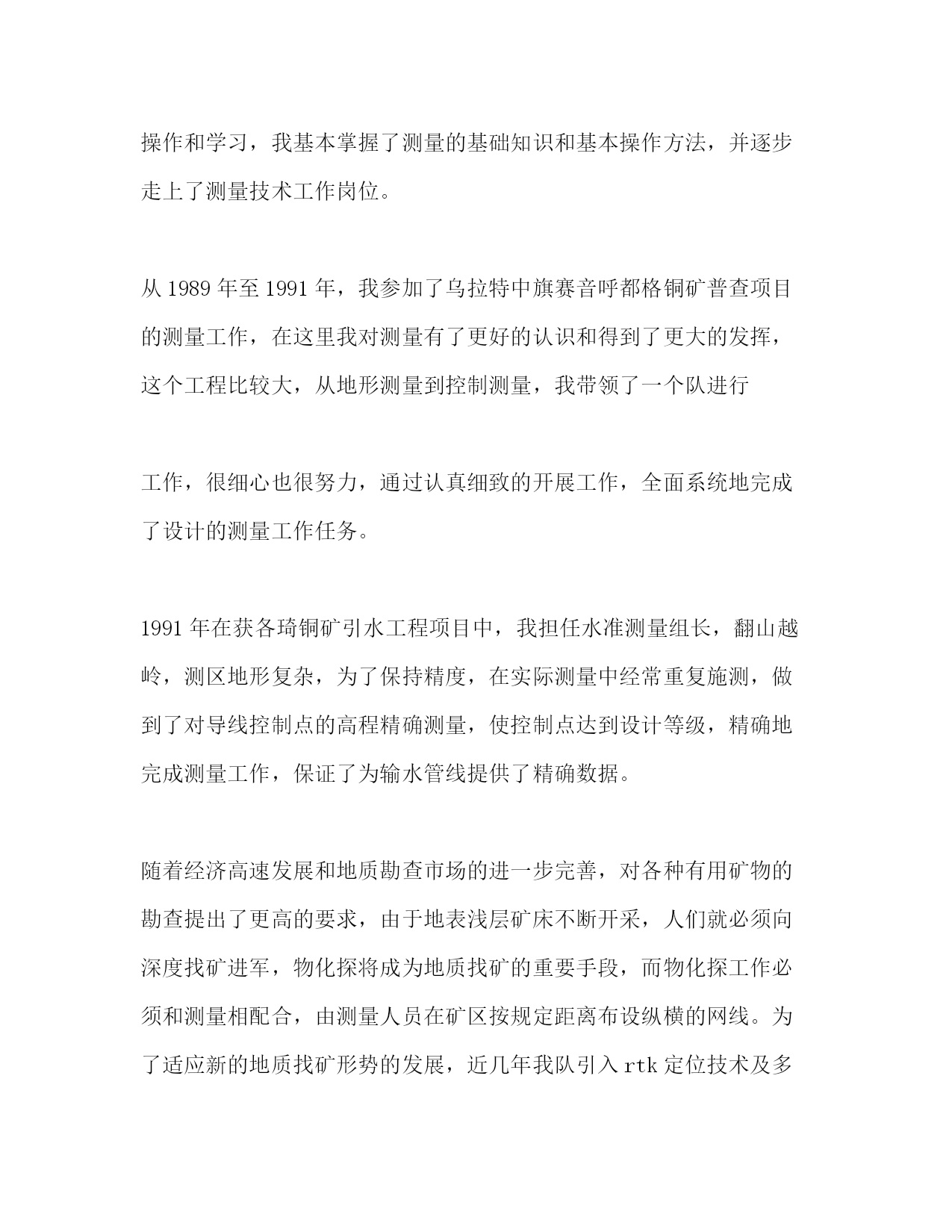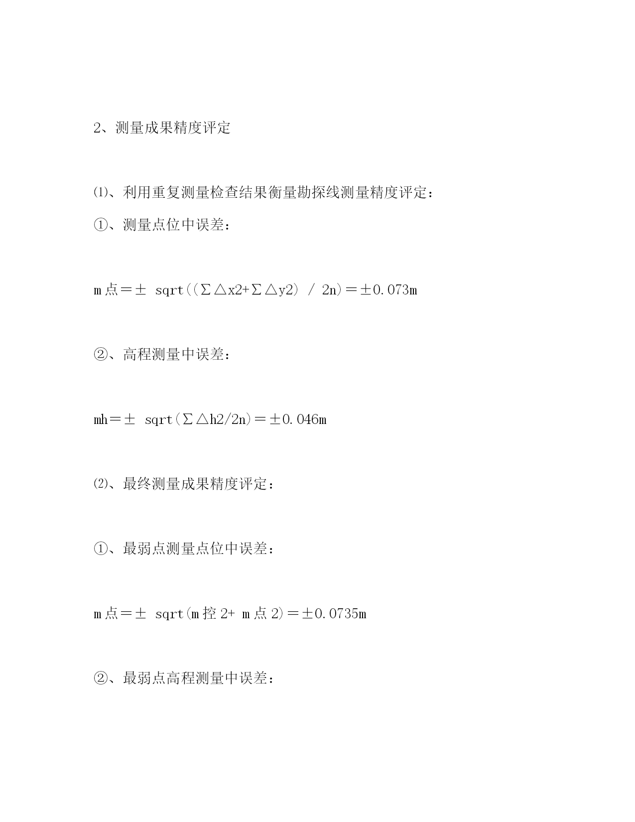 PAGE此资料由网络收集而来,如有侵权请告知上传者立即删除。资料共分享,我们负责传递知识。测量教师技术工作总结(精选多篇)第一篇:测量工作技术总结新疆和什托洛盖煤田沙吉海三井田地质勘探项目钻孔定位测量技术总结一、测量工作任务概述为顺利完成新疆和什托洛盖煤田沙吉海勘查区三井田地质勘探项目钻孔定位测量工作,我单位组织工作力强的测绘队伍,其中项目测量组配备测量技术人员3名,南方测绘仪器公司生产的灵锐s86双频动态rtk接收机二台、以及相应的测绘软件等必要仪器设备。项目测量组于2020年7月9日奔赴野外一线对63个钻孔进行精密测绘,于2020年7月11日顺利完成野外测量任务。二、已有资料的分析利用利用甲方提供在该区布设的gps静态控制点,作为新疆和什托洛盖煤田沙吉海三井田地质勘探项目钻孔定位测量的依据。三、坐标系统本次地质勘探项目钻孔定位测量坐标系统,平面采用1954北京坐标系,87°中央子午线3度带高斯投影直角坐标;高程采用1956年黄海高程系。四、测量工作的依据和技术方法1、测量工作中执行的技术标准和规范:(1)中华人民共和国测绘行业标准gb/t18314—2020《全球定位系统gps测量规范》;(2)《地质矿产工作测量规范》(gb/t18341-2020);(3)煤炭部1987年制定《煤炭资源勘探工程测量规程》;(4)本区技术测量设计书及审查意见。2、测量工作作业技术方法及精度评述采用gps实时动态rtk的测量方法,将rtk基站架设在甲方提供的gps静态控制点上,利用其它两个gps控制点进行三点校正,检查无误后在固定解状态下进行钻孔定测。本次钻孔定测使用南方测绘仪器公司生产的灵锐s86双频动态rtk。仪器标称精度:平面精度:5mm+1ppm;垂直精度:10mm+2ppm。rtk测量中pdop≤5,观测卫星数≥6个,rtk基准站设站检查的最大误差为:△x=0.015米;△y=0.020米;△h=0.028米。在流动站rtk信号固定时,平面定点误差≤0.05米时,进行钻孔点位测量工作。五、质量监控与测绘成果的精度评定1、质量监控测绘过程中严格执行相关规范和《设计》,并通过自检、互检、专检相结合的方法控制测绘产品质量的各个环节,对测量全过程进行监控,确保了测量成果资料的质量。通过控制测量的各项较差、闭合差衡量加密控制点的精度,重复测量方法检查了钻孔点位3个点,占总物理点数的4.76%。通过最后综合评定计算衡量测绘成果资料的质量。内、外业测量成果资料完整齐全、清晰美观、质量可靠,满足相关规范和《设计》的要求。2、测量成果精度评定⑴、利用重复测量检查结果衡量勘探线测量精度评定:①、测量点位中误差:m点=±sqrt((∑△x2+∑△y2)/2n)=±0.073m②、高程测量中误差:mh=±sqrt(∑△h2/2n)=±0.046m⑵、最终测量成果精度评定:①、最弱点测量点位中误差:m点=±sqrt(m控2+m点2)=±0.0735m②、最弱点高程测量中误差:mh=±sqrt(m控2+mh2)=±0.046m六、提交测量成果资料(1)地质勘探项目钻孔定位测量成果(电子文档)1份(2)测量工作技术报告2020年6月3日1份第二篇:测量高级工程师技术工作总结专业技术工作总结一、学业、工作及培训简介本人于2020年7月毕业于内蒙古农业大学土地资源管理专业,本科学历,获学士学位。2020年7月至今在内蒙古乔泰国土勘测技术有限公司工作,从事土地调查测绘与规划管理工作。于2020年获规划工程师资格。我在工作中积极主动的参加各类继续教育和技术规范的学习,主要有以下各项:全国第二次土地调查培训,学习cass软件、mapgis软件、arcgis软件的使用培训。苍穹软件建库培训、中天软件建库培训。2020年航测软件内业培训、三维城市建模培训、制图培训。2020年农用地统一年产值培训。通过这些培训学习为我这些年的工作打下坚实的技术基础。05年任公司测绘组长,05年9月任公司测绘部门负责人,09年任公司锡林浩特市分公司经理,11年任公司副总工程师。随着时间的增加,本人的知识结构、业务素质、实际工作能力,管理能力等方面得到了极大的提高。二、主要工作内容和工作业绩1、主要工作内容:(一)土地调查与测绘工作。地籍调查与测绘是土地产权产籍管理的前置性工作,是一项专业性、政策性很强,精确度要求很高的工作,关系到国家、土地产权属单位和土地权利人的切身利益,因此土地测绘必须做到标识规范、数据准确。土地面积作为衡量土地价值的重要指标之一,其测绘成果的准确、公平、合理与否,在业主中成为敏感性问题,所附带的责任亦