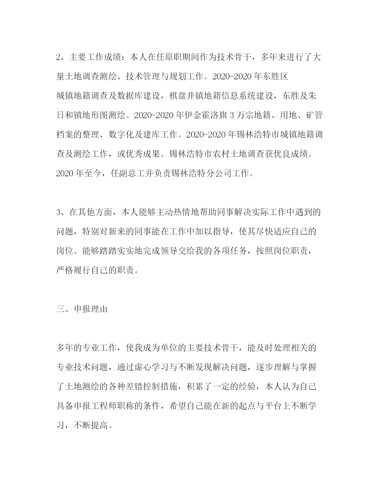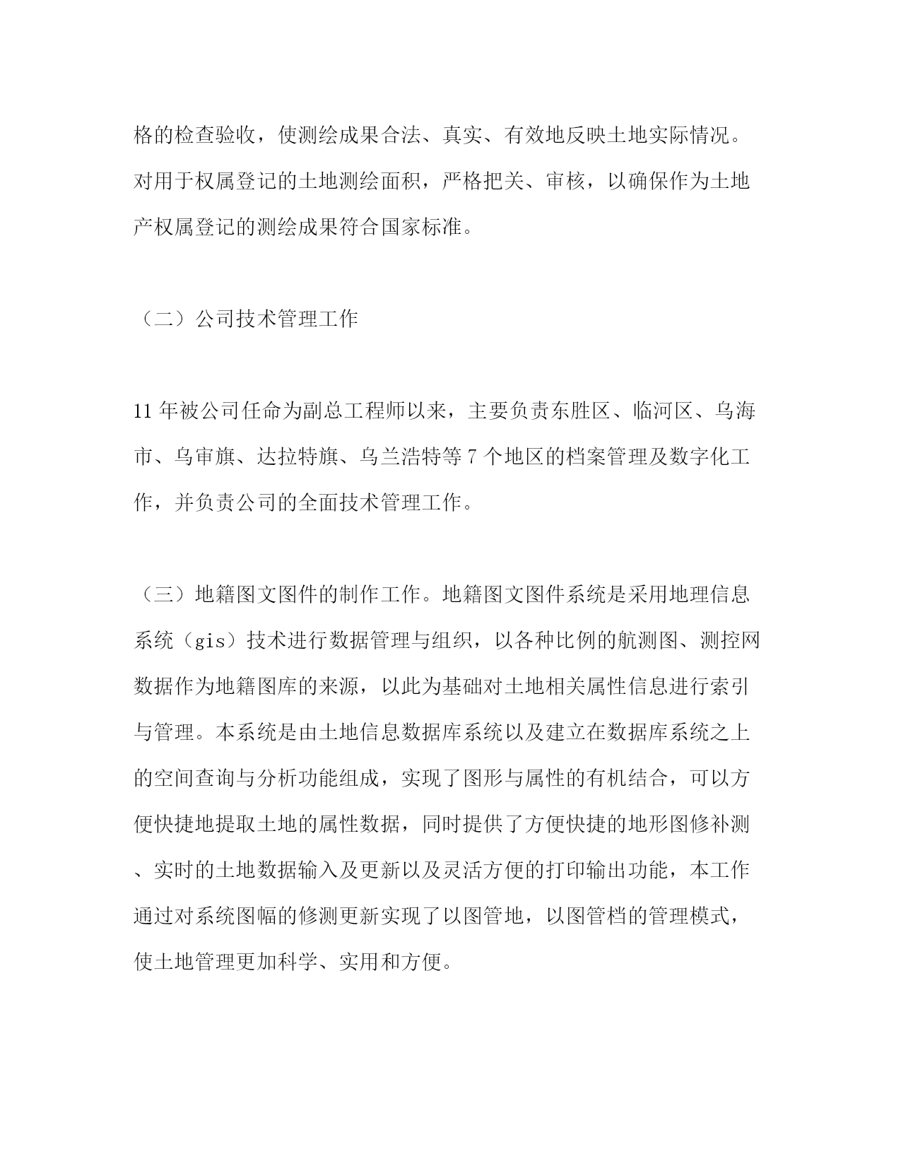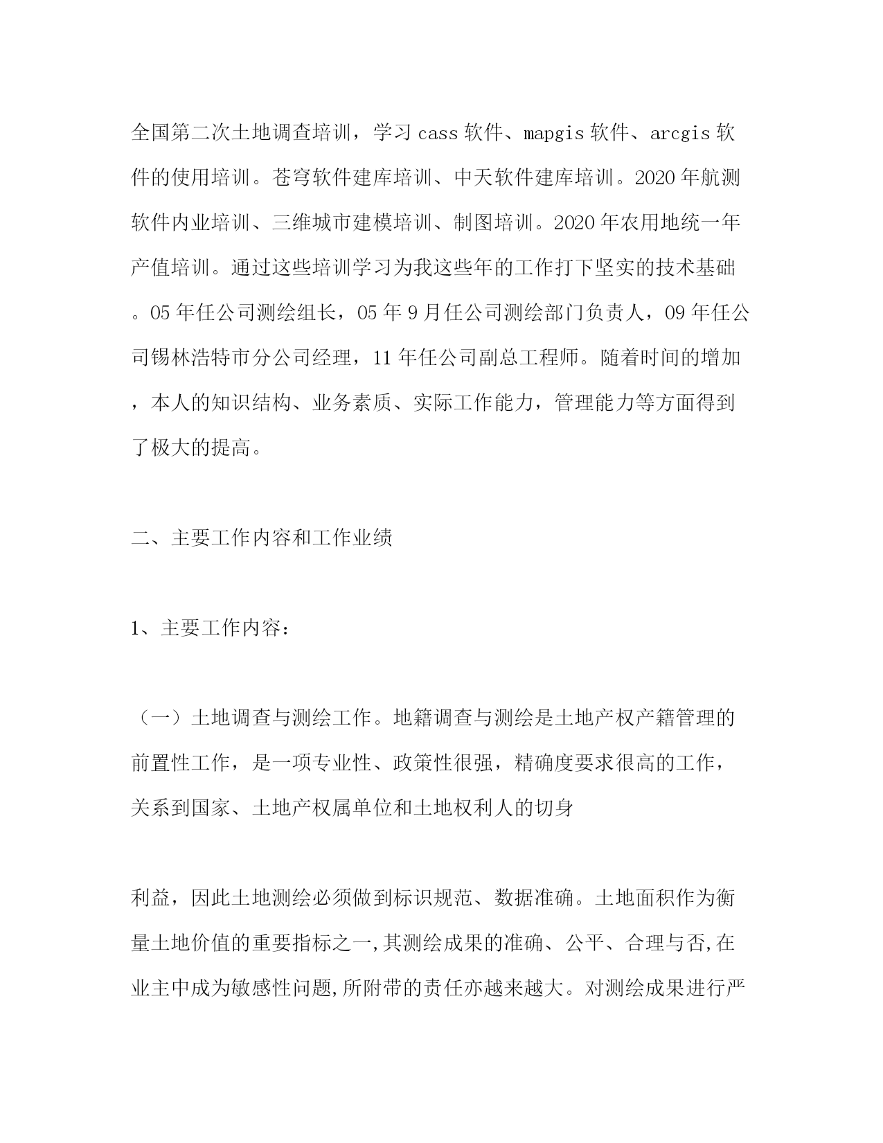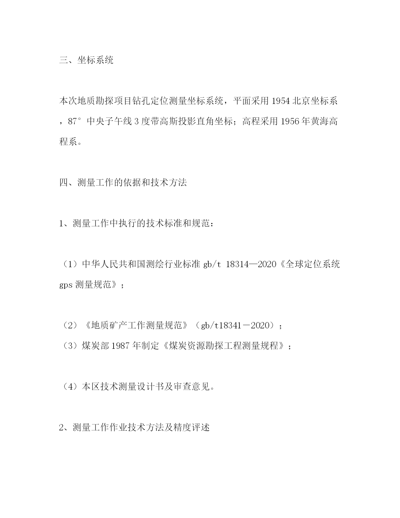 PAGE此资料由网络收集而来,如有侵权请告知上传者立即删除。资料共分享,我们负责传递知识。测量教师技术工作总结(精选多篇)第一篇:测量工作技术总结新疆和什托洛盖煤田沙吉海三井田地质勘探项目钻孔定位测量技术总结一、测量工作任务概述为顺利完成新疆和什托洛盖煤田沙吉海勘查区三井田地质勘探项目钻孔定位测量工作,我单位组织工作力强的测绘队伍,其中项目测量组配备测量技术人员3名,南方测绘仪器公司生产的灵锐s86双频动态rtk接收机二台、以及相应的测绘软件等必要仪器设备。项目测量组于2020年7月9日奔赴野外一线对63个钻孔进行精密测绘,于2020年7月11日顺利完成野外测量任务。二、已有资料的分析利用利用甲方提供在该区布设的gps静态控制点,作为新疆和什托洛盖煤田沙吉海三井田地质勘探项目钻孔定位测量的依据。三、坐标系统本次地质勘探项目钻孔定位测量坐标系统,平面采用1954北京坐标系,87°中央子午线3度带高斯投影直角坐标;高程采用1956年黄海高程系。四、测量工作的依据和技术方法1、测量工作中执行的技术标准和规范:(1)中华人民共和国测绘行业标准gb/t18314—2020《全球定位系统gps测量规范》;(2)《地质矿产工作测量规范》(gb/t18341-2020);(3)煤炭部1987年制定《煤炭资源勘探工程测量规程》;(4)本区技术测量设计书及审查意见。2、测量工作作业技术方法及精度评述采用gps实时动态rtk的测量方法,将rtk基站架设在甲方提供的gps静态控制点上,利用其它两个gps控制点进行三点校正,检查无误后在固定解状态下进行钻孔定测。本次钻孔定测使用南方测绘仪器公司生产的灵锐s86双频动态rtk。仪器标称精度:平面精度:5mm+1ppm;垂直精度:10mm+2ppm。rtk测量中pdop≤5,观测卫星数≥6个,rtk基准站设站检查的最大误差为:△x=0.015米;△y=0.020米;△h=0.028米。在流动站rtk信号固定时,平面定点误差≤0.05米时,进行钻孔点位测量工作。五、质量监控与测绘成果的精度评定1、质量监控测绘过程中严格执行相关规范和《设计》,并通过自检、互检、专检相结合的方法控制测绘产品质量的各个环节,对测量全过程进行监控,确保了测量成果资料的质量。通过控制测量的各项较差、闭合差衡量加密控制点的精度,重复测量方法检查了钻孔点位3个点,占总物理点数的4.76%。通过最后综合评定计算衡量测绘成果资料的质量。内、外业测量成果资料完整齐全、清晰美观、质量可靠,满足相关规范和《设计》的要求。2、测量成果精度评定⑴、利用重复测量检查结果衡量勘探线测量精度评定:①、测量点位中误差:m点=±sqrt((∑△x2+∑△y2)/2n)=±0.073m②、高程测量中误差:mh=±sqrt(∑△h2/2n)=±0.046m⑵、最终测量成果精度评定:①、最弱点测量点位中误差:m点=±sqrt(m控2+m点2)=±0.0735m②、最弱点高程测量中误差:mh=±sqrt(m控2+mh2)=±0.046m六、提交测量成果资料(1)地质勘探项目钻孔定位测量成果(电子文档)1份(2)测量工作技术报告2020年6月3日1份第二篇:测量高级工程师技术工作总结专业技术工作总结一、学业、工作及培训简介本人于2020年7月毕业于内蒙古农业大学土地资源管理专业,本科学历,获学士学位。2020年7月至今在内蒙古乔泰国土勘测技术有限公司工作,从事土地调查测绘与规划管理工作。于2020年获规划工程师资格。我在工作中积极主动的参加各类继续教育和技术规范的学习,主要有以下各项:全国第二次土地调查培训,学习cass软件、mapgis软件、arcgis软件的使用培训。苍穹软件建库培训、中天软件建库培训。2020年航测软件内业培训、三维城市建模培训、制图培训。2020年农用地统一年产值培训。通过这些培训学习为我这些年的工作打下坚实的技术基础。05年任公司测绘组长,05年9月任公司测绘部门负责人,09年任公司锡林浩特市分公司经理,11年任公司副总工程师。随着时间的增加,本人的知识结构、业务素质、实际工作能力,管理能力等方面得到了极大的提高。二、主要工作内容和工作业绩1、主要工作内容:(一)土地调查与测绘工作。地籍调查与测绘是土地产权产籍管理的前置性工作,是一项专业性、政策性很强,精确度要求很高的工作,关系到国家、土地产权属单位和土地权利人的切身利益,因此土地测绘必须做到标识规范、数据准确。土地面积作为衡量土地价值的重要指标之一,其测绘成果的准确、公平、合理与否,在业主中成为敏感性问题,所附带的责任亦