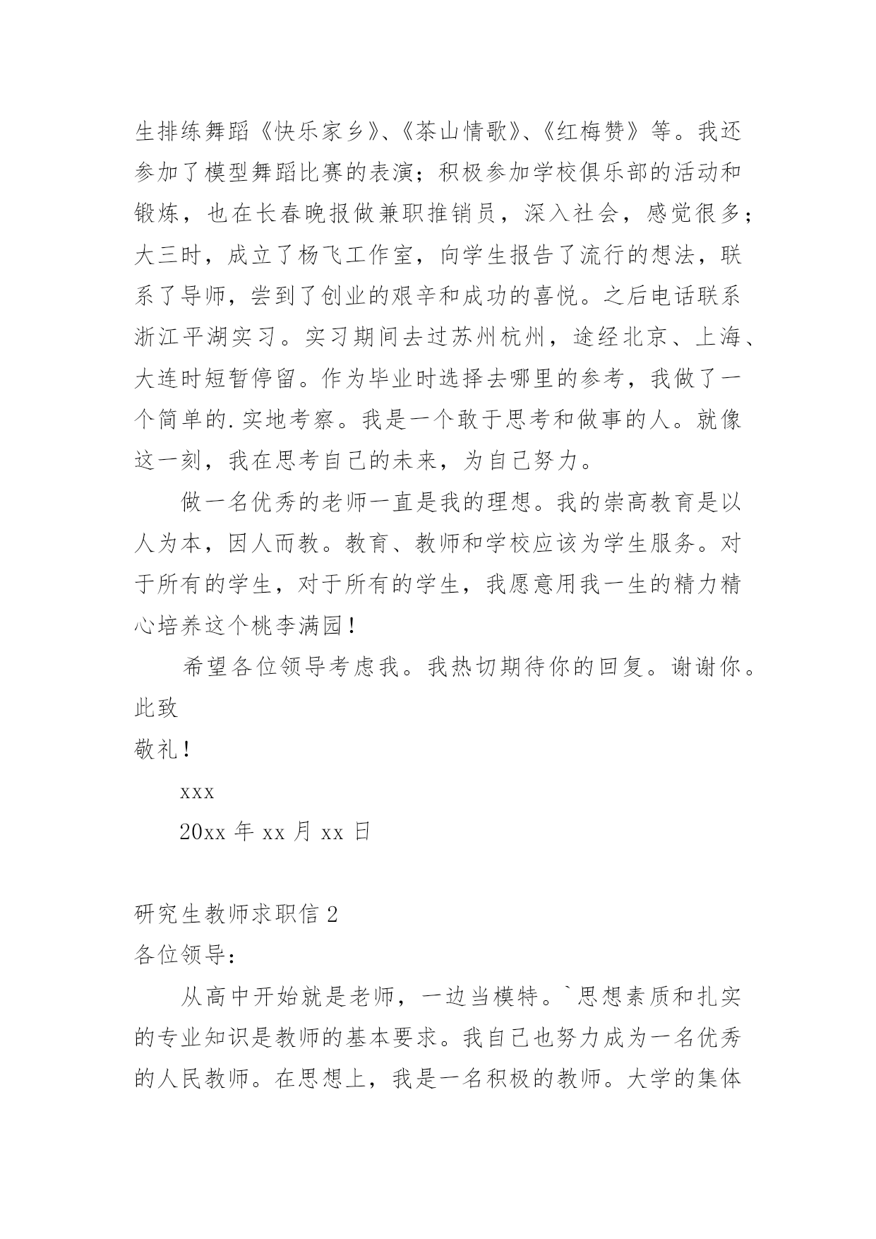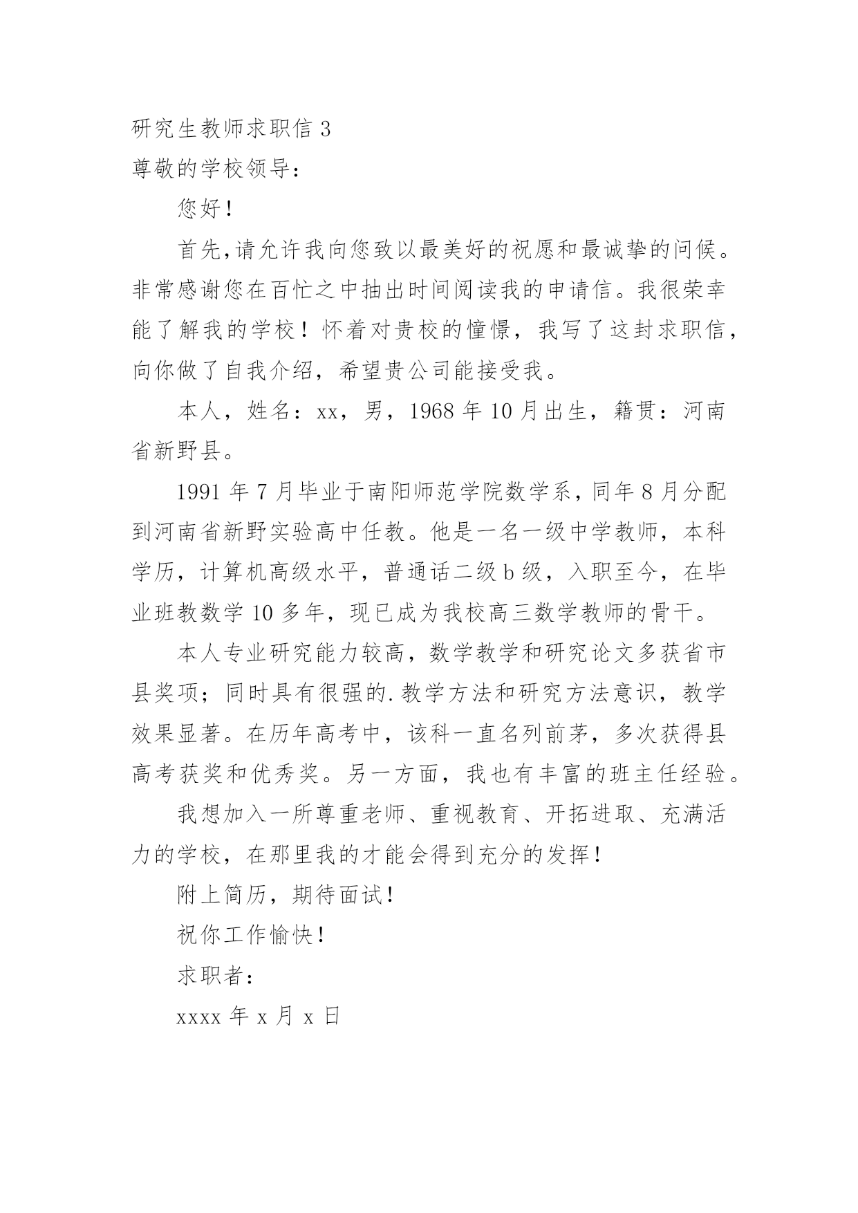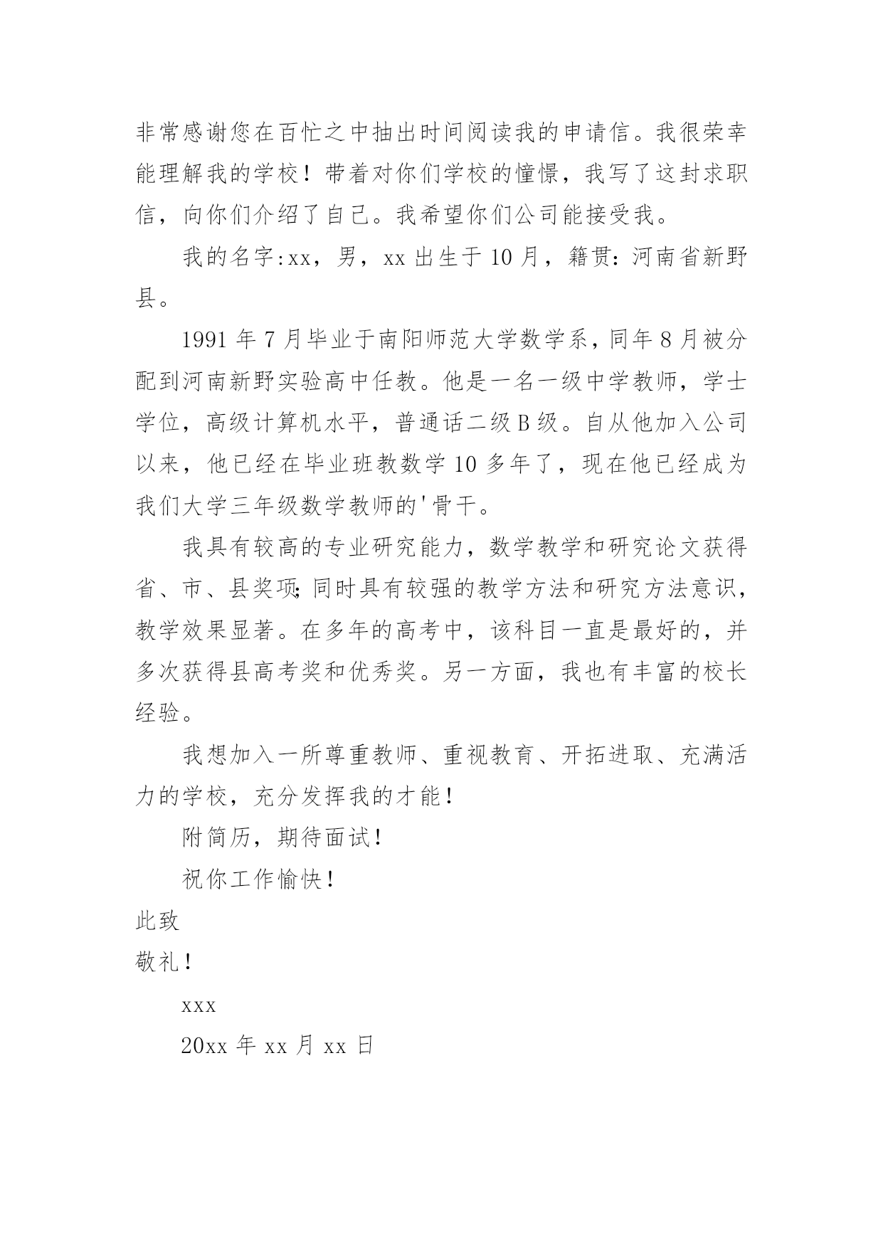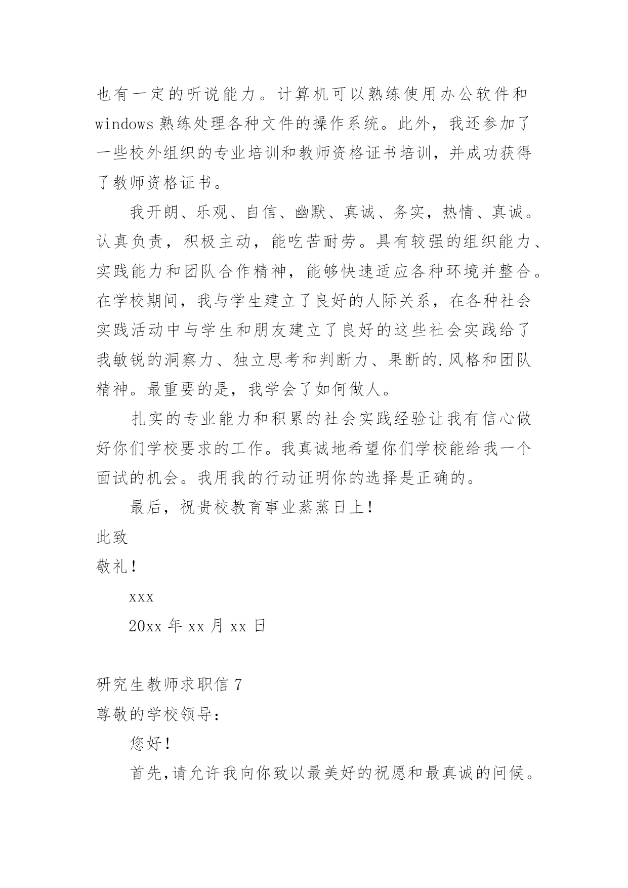 研究生教师求职信研究生教师求职信9篇时间就如同白驹过隙般的流逝,迎接我们的将是新的工作机会,新的挑战,是时候静下心来写一封求职信了哦。那么优秀的求职信都是怎么写的呢?以下是小编精心整理的研究生教师求职信,欢迎阅读,希望大家能够喜欢。研究生教师求职信1亲爱的xx先生:您好!真心希望在贵校任教,在你的指挥下工作。我是xx年xx化学学院应届毕业生。我各方面都有充分的准备,有足够的信心和能力从事化学教学和研究。我性格开朗直爽。平时爱说话,爱笑,爱玩,但责任心强,思维活跃,创新意识强,能力强。在学校期间,我主修与化学和化学教学相关的课程和实验,以及教育学、心理学、哲学、法律基础等课程。我努力学习,取得了优异的成绩。在教学实践中,我积极深入课堂,认真研究教学方法,谦虚地咨询老师。我在教学方面进步很快,受到了老师和学生的高度赞扬,实践效果也很好。我对自己的能力很有信心。我写过,导演过,主演过散文《在青春的梦里飞翔》和戏剧《青春的记忆》。还组织学生排练舞蹈《快乐家乡》、《茶山情歌》、《红梅赞》等。我还参加了模型舞蹈比赛的表演;积极参加学校俱乐部的活动和锻炼,也在长春晚报做兼职推销员,深入社会,感觉很多;大三时,成立了杨飞工作室,向学生报告了流行的想法,联系了导师,尝到了创业的艰辛和成功的喜悦。之后电话联系浙江平湖实习。实习期间去过苏州杭州,途经北京、上海、大连时短暂停留。作为毕业时选择去哪里的参考,我做了一个简单的.实地考察。我是一个敢于思考和做事的人。就像这一刻,我在思考自己的未来,为自己努力。做一名优秀的老师一直是我的理想。我的崇高教育是以人为本,因人而教。教育、教师和学校应该为学生服务。对于所有的学生,对于所有的学生,我愿意用我一生的精力精心培养这个桃李满园!希望各位领导考虑我。我热切期待你的回复。谢谢你。此致敬礼!xxx20xx年xx月xx日研究生教师求职信2各位领导:从高中开始就是老师,一边当模特。`思想素质和扎实的专业知识是教师的基本要求。我自己也努力成为一名优秀的人民教师。在思想上,我是一名积极的教师。大学的集体生活培养了我的'诚信和无私,培养了我尊重他人、真诚对待他人的品质。我的教学实践培养了我对教育的热爱和对学生的无私关怀。在学习方面,每门专业课都学得很好,成绩也很好。进入基地班,提高教学素养。我还选修了与中学数学教学密切相关的课程,如试讲》、《初等数论》、《心理学与教育学》等与中学数学教学密切相关的课程。另外,英语四级以后,还修了专业英语、六级选修等课程,阅读翻译能力强。所有这些努力和进步都给了我满足挑战的信心。根据本学期的教学实践xx师范大学附属中学生的特点,精心备课,准确掌握和处理教材,良好的课堂教学效果受到导师和学生的高度赞扬。同时,自学辅导、考试组织、班级管理也取得了良好的效果。从小就对教师职业充满尊重和热爱。长大后终于变成了你。现在,我终于走上了讲台。我相信我会配得上人类灵魂工程师的光荣称号。好鸟栖身于树上,给我一个机会。我会努力奋进,为学校的蓬勃发展做出自己的贡献,用汗水证明你明智的选择。最后,祝贵校多才多艺,成就更加辉煌!此致敬礼!xxx20xx年xx月xx日研究生教师求职信3尊敬的学校领导:您好!首先,请允许我向您致以最美好的祝愿和最诚挚的问候。非常感谢您在百忙之中抽出时间阅读我的申请信。我很荣幸能了解我的学校!怀着对贵校的憧憬,我写了这封求职信,向你做了自我介绍,希望贵公司能接受我。本人,姓名:xx,男,1968年10月出生,籍贯:河南省新野县。1991年7月毕业于南阳师范学院数学系,同年8月分配到河南省新野实验高中任教。他是一名一级中学教师,本科学历,计算机高级水平,普通话二级b级,入职至今,在毕业班教数学10多年,现已成为我校高三数学教师的骨干。本人专业研究能力较高,数学教学和研究论文多获省市县奖项;同时具有很强的.教学方法和研究方法意识,教学效果显著。在历年高考中,该科一直名列前茅,多次获得县高考获奖和优秀奖。另一方面,我也有丰富的班主任经验。我想加入一所尊重老师、重视教育、开拓进取、充满活力的学校,在那里我的才能会得到充分的发挥!附上简历,期待面试!祝你工作愉快!求职者:xxxx年x月x日研究生教师求职信4各位领导:从高中开始学就是老师,一边当模特。优秀的思想素质和扎实的专业知识是对教师的基本要求。为了成为一名优秀的人民教师,我自己也努力过。思想上,我积极进取,为人师表。大学的集体生活培养了我的正直无私,培养了我尊重他人、真诚待人的品质。我的教学实践培养了我对教育的`热爱和对学生的无私关怀。学习方面,每门专业课都学的很好,成绩优异。进了基地班,提高了教学素养。我还选修了与中学数学教学密切相关的课程,如《中学数学高起点》、《教材分析与试讲》、《初等数论》、《心理学与教育学》。另外英语四级过了,还