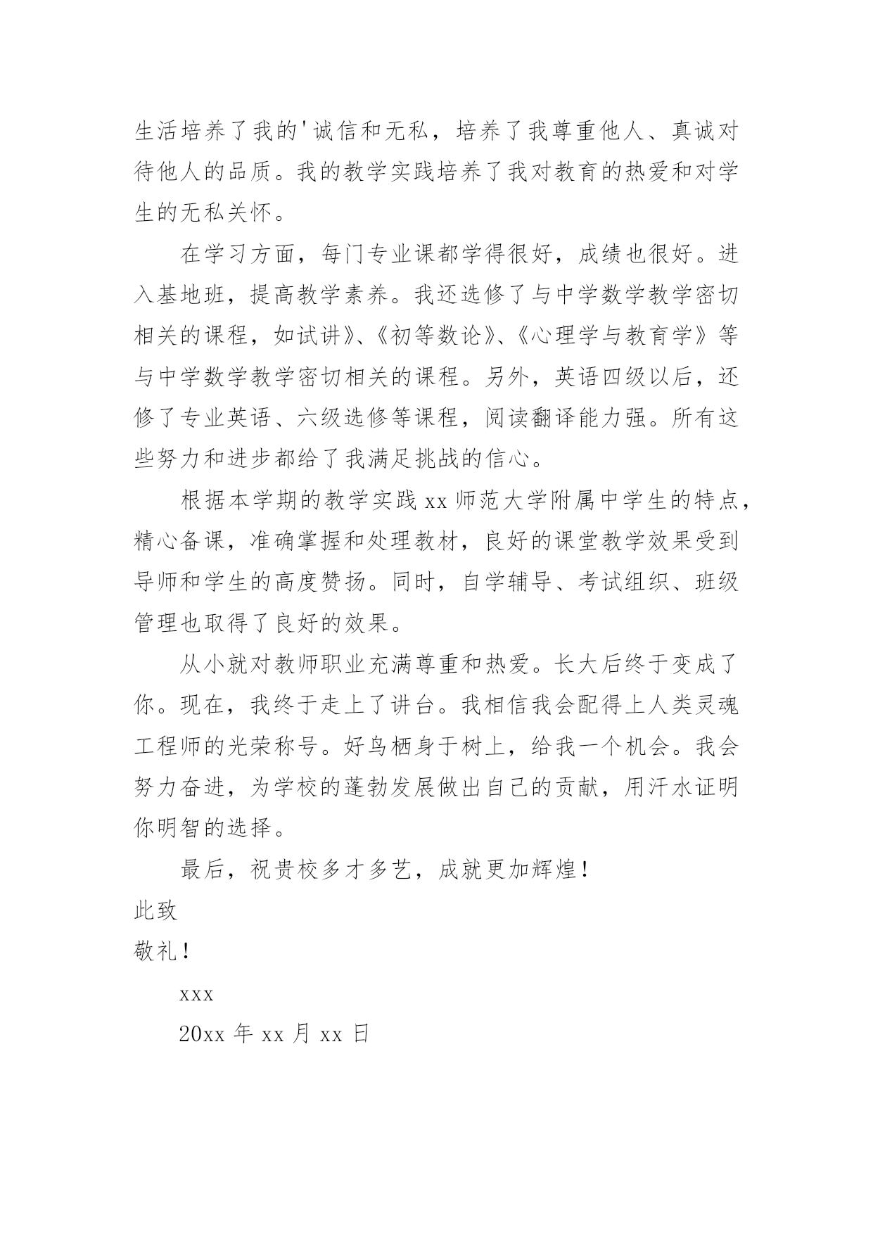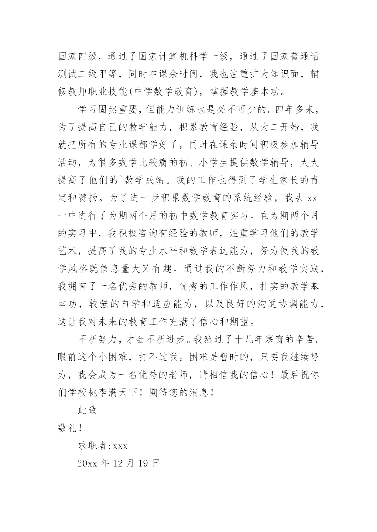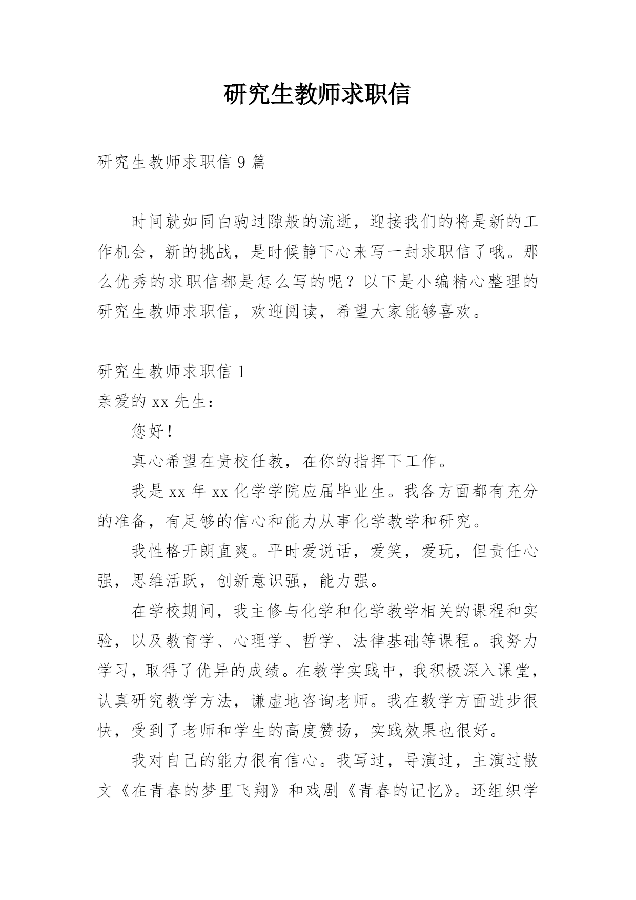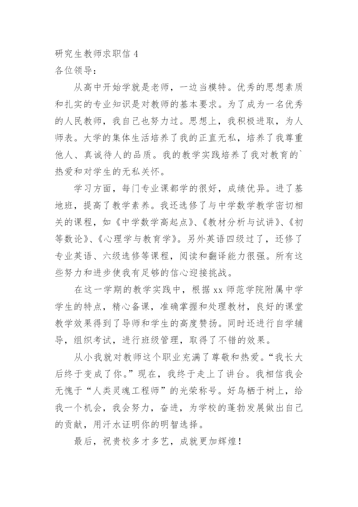 研究生教师求职信研究生教师求职信9篇时间就如同白驹过隙般的流逝,迎接我们的将是新的工作机会,新的挑战,是时候静下心来写一封求职信了哦。那么优秀的求职信都是怎么写的呢?以下是小编精心整理的研究生教师求职信,欢迎阅读,希望大家能够喜欢。研究生教师求职信1亲爱的xx先生:您好!真心希望在贵校任教,在你的指挥下工作。我是xx年xx化学学院应届毕业生。我各方面都有充分的准备,有足够的信心和能力从事化学教学和研究。我性格开朗直爽。平时爱说话,爱笑,爱玩,但责任心强,思维活跃,创新意识强,能力强。在学校期间,我主修与化学和化学教学相关的课程和实验,以及教育学、心理学、哲学、法律基础等课程。我努力学习,取得了优异的成绩。在教学实践中,我积极深入课堂,认真研究教学方法,谦虚地咨询老师。我在教学方面进步很快,受到了老师和学生的高度赞扬,实践效果也很好。我对自己的能力很有信心。我写过,导演过,主演过散文《在青春的梦里飞翔》和戏剧《青春的记忆》。还组织学生排练舞蹈《快乐家乡》、《茶山情歌》、《红梅赞》等。我还参加了模型舞蹈比赛的表演;积极参加学校俱乐部的活动和锻炼,也在长春晚报做兼职推销员,深入社会,感觉很多;大三时,成立了杨飞工作室,向学生报告了流行的想法,联系了导师,尝到了创业的艰辛和成功的喜悦。之后电话联系浙江平湖实习。实习期间去过苏州杭州,途经北京、上海、大连时短暂停留。作为毕业时选择去哪里的参考,我做了一个简单的.实地考察。我是一个敢于思考和做事的人。就像这一刻,我在思考自己的未来,为自己努力。做一名优秀的老师一直是我的理想。我的崇高教育是以人为本,因人而教。教育、教师和学校应该为学生服务。对于所有的学生,对于所有的学生,我愿意用我一生的精力精心培养这个桃李满园!希望各位领导考虑我。我热切期待你的回复。谢谢你。此致敬礼!xxx20xx年xx月xx日研究生教师求职信2各位领导:从高中开始就是老师,一边当模特。`思想素质和扎实的专业知识是教师的基本要求。我自己也努力成为一名优秀的人民教师。在思想上,我是一名积极的教师。大学的集体生活培养了我的'诚信和无私,培养了我尊重他人、真诚对待他人的品质。我的教学实践培养了我对教育的热爱和对学生的无私关怀。在学习方面,每门专业课都学得很好,成绩也很好。进入基地班,提高教学素养。我还选修了与中学数学教学密切相关的课程,如试讲》、《初等数论》、《心理学与教育学》等与中学数学教学密切相关的课程。另外,英语四级以后,还修了专业英语、六级选修等课程,阅读翻译能力强。所有这些努力和进步都给了我满足挑战的信心。根据本学期的教学实践xx师范大学附属中学生的特点,精心备课,准确掌握和处理教材,良好的课堂教学效果受到导师和学生的高度赞扬。同时,自学辅导、考试组织、班级管理也取得了良好的效果。从小就对教师职业充满尊重和热爱。长大后终于变成了你。现在,我终于走上了讲台。我相信我会配得上人类灵魂工程师的光荣称号。好鸟栖身于树上,给我一个机会。我会努力奋进,为学校的蓬勃发展做出自己的贡献,用汗水证明你明智的选择。最后,祝贵校多才多艺,成就更加辉煌!此致敬礼!xxx20xx年xx月xx日研究生教师求职信3尊敬的学校领导:您好!首先,请允许我向您致以最美好的祝愿和最诚挚的问候。非常感谢您在百忙之中抽出时间阅读我的申请信。我很荣幸能了解我的学校!怀着对贵校的憧憬,我写了这封求职信,向你做了自我介绍,希望贵公司能接受我。本人,姓名:xx,男,1968年10月出生,籍贯:河南省新野县。1991年7月毕业于南阳师范学院数学系,同年8月分配到河南省新野实验高中任教。他是一名一级中学教师,本科学历,计算机高级水平,普通话二级b级,入职至今,在毕业班教数学10多年,现已成为我校高三数学教师的骨干。本人专业研究能力较高,数学教学和研究论文多获省市县奖项;同时具有很强的.教学方法和研究方法意识,教学效果显著。在历年高考中,该科一直名列前茅,多次获得县高考获奖和优秀奖。另一方面,我也有丰富的班主任经验。我想加入一所尊重老师、重视教育、开拓进取、充满活力的学校,在那里我的才能会得到充分的发挥!附上简历,期待面试!祝你工作愉快!求职者:xxxx年x月x日研究生教师求职信4各位领导:从高中开始学就是老师,一边当模特。优秀的思想素质和扎实的专业知识是对教师的基本要求。为了成为一名优秀的人民教师,我自己也努力过。思想上,我积极进取,为人师表。大学的集体生活培养了我的正直无私,培养了我尊重他人、真诚待人的品质。我的教学实践培养了我对教育的`热爱和对学生的无私关怀。学习方面,每门专业课都学的很好,成绩优异。进了基地班,提高了教学素养。我还选修了与中学数学教学密切相关的课程,如《中学数学高起点》、《教材分析与试讲》、《初等数论》、《心理学与教育学》。另外英语四级过了,还