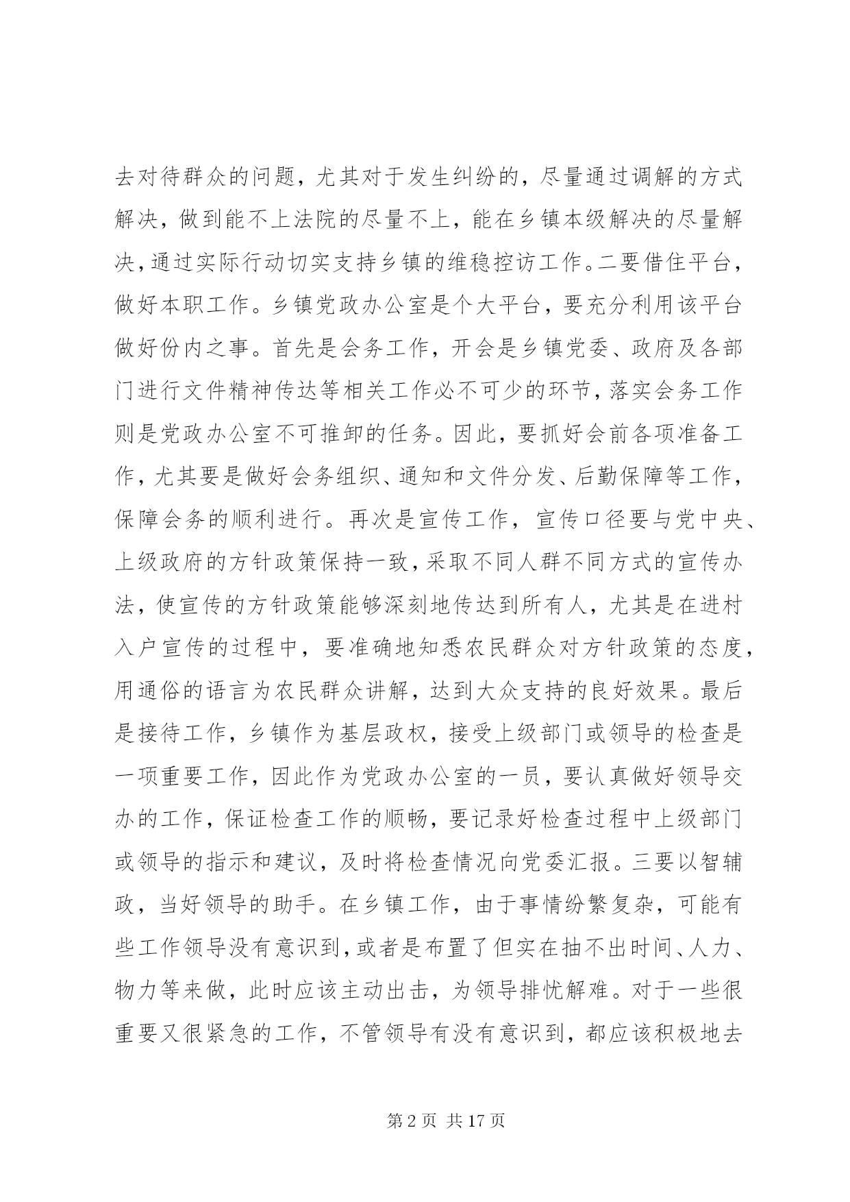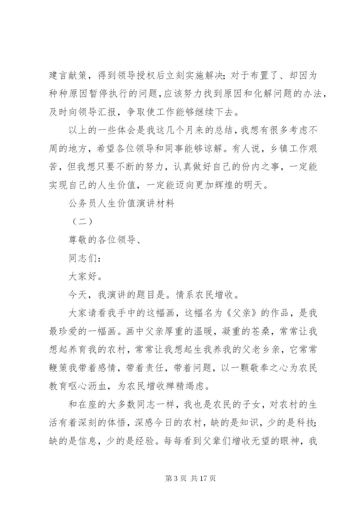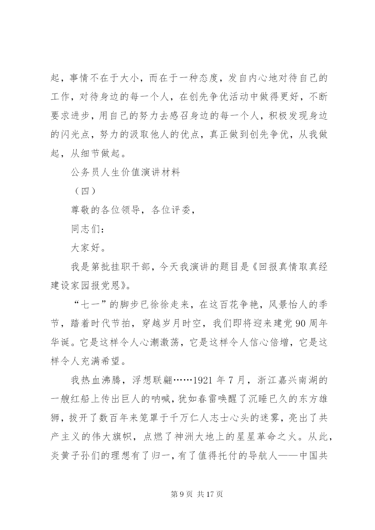 第PAGE\*Arabic\*MERGEFORMAT17页共NUMPAGES\*MERGEFORMAT17页公务员人生价值演讲材料5篇公务员人生价值演讲材料(一)各位领导,各位同事:大家好。在我演讲之前,首先感谢组织部的各位领导能组织这次演讲比赛,谢谢他们对我们新录用公务员的关心和支持。俗话说。少小离家老大回。在外地求学、工作数年之后,在家乡赶超发展战略的号召之下,我毅然决定回到自己的家乡,以一名公务员的身份实实在在为家乡人民做出自己应有的贡献。光阴似箭,到乡镇工作已有数月,然而这几个月的宝贵经历却使我的思想观、人生观有了很大转变,它使我更加深刻认识到一名基层公务员工作的重要性。在这里,借此机会,我想把这数月以来的工作体会和大家一起分享。乡镇党政办公室要承载许多纷繁复杂的工作,我认为作为办公室成员之一,要通过以下几个方面,才能顺利承担起党政办公室一员应有的责任和义务。一要履行职能,协调好各方面关系。乡镇是我国最基层的行政机关,直接面对农民群众,工作的难度可想而知;而乡镇政府又是一个五脏俱全的机关,民生对口部门较多,妥善协调好政府和群众、各部门之间的关系,是乡镇党政办公室成员的一项必然使命。要本着以人为本、服务人民的心态去对待群众的问题,尤其对于发生纠纷的,尽量通过调解的方式解决,做到能不上法院的尽量不上,能在乡镇本级解决的尽量解决,通过实际行动切实支持乡镇的维稳控访工作。二要借住平台,做好本职工作。乡镇党政办公室是个大平台,要充分利用该平台做好份内之事。首先是会务工作,开会是乡镇党委、政府及各部门进行文件精神传达等相关工作必不可少的环节,落实会务工作则是党政办公室不可推卸的任务。因此,要抓好会前各项准备工作,尤其要是做好会务组织、通知和文件分发、后勤保障等工作,保障会务的顺利进行。再次是宣传工作,宣传口径要与党中央、上级政府的方针政策保持一致,采取不同人群不同方式的宣传办法,使宣传的方针政策能够深刻地传达到所有人,尤其是在进村入户宣传的过程中,要准确地知悉农民群众对方针政策的态度,用通俗的语言为农民群众讲解,达到大众支持的良好效果。最后是接待工作,乡镇作为基层政权,接受上级部门或领导的检查是一项重要工作,因此作为党政办公室的一员,要认真做好领导交办的工作,保证检查工作的顺畅,要记录好检查过程中上级部门或领导的指示和建议,及时将检查情况向党委汇报。三要以智辅政,当好领导的助手。在乡镇工作,由于事情纷繁复杂,可能有些工作领导没有意识到,或者是布置了但实在抽不出时间、人力、物力等来做,此时应该主动出击,为领导排忧解难。对于一些很重要又很紧急的工作,不管领导有没有意识到,都应该积极地去建言献策,得到领导授权后立刻实施解决;对于布置了、却因为种种原因暂停执行的问题,应该努力找到原因和化解问题的办法,及时向领导汇报,争取使工作能够继续下去。以上的一些体会是我这几个月来的总结,我想有很多考虑不周的地方,希望各位领导和同事能够谅解。有人说,乡镇工作艰苦,但我想只要不断的努力,认真做好自己的份内之事,一定能实现自己的人生价值,一定能迈向更加辉煌的明天。公务员人生价值演讲材料(二)尊敬的各位领导、同志们:大家好。今天,我演讲的题目是。情系农民增收。大家请看我手中的这幅画,这幅名为《父亲》的作品,是我最珍爱的一幅画。画中父亲厚重的温暖,凝重的苍桑,常常让我想起养育我的农村,常常让我想起生我养我的父老乡亲,它常常鞭策我带着感情,带着责任,带着问题,以一颗敬奉之心为农民教育呕心沥血,为农民增收殚精竭虑。和在座的大多数同志一样,我也是农民的子女,对农村的生活有着深刻的体悟,深感今日的农村,缺的是知识,少的是科技;缺的是信息,少的是经验。每每看到父辈们增收无望的眼神,我立志用一颗淡泊心,服一片真情务;用一种赤子情,传一本增收经;用点滴寸草心,报无限三春晖。荣幸的是,领导委以重任,让我担任科技培训组组长。经过反复调查研究,我们开办了马村、尖咀两个村级教学班,送科技进村入户,帮农民发家致富,出现了“夫妻二人同时学,兄弟几人争着学,外嫁妹子回家学”的喜人场面。群众高兴地说:农广校的科技培训犹如一场及时雨,还敲锣打鼓送来锦旗。多少次,学生早已放学,吃饭时间也早已过了,而群众却久久不愿离去。特别令我感动的是,有一次培训,天下着大雨,教室里坐得满满的,窗外的人们,举着雨伞,一听就是几个钟头。看到此情此景,我心潮澎湃,想不到为群众做了这么一点点,群众却给予我们那么高的荣誉,那么大的支持,那么多的回报。蓦然回首,多少亲身感触,多少酸甜苦辣,点点滴滴,历历在目。忘不了,课堂上老师与学员的亲切交谈、田间地头的激烈争论,村民们喜获丰收、盛赞科技培训的情景。忘不了,多少个日日夜夜,我们辛勤工作,哪里需要科技,我们就出现在哪里。当尖咀村小尾寒羊出现疫情后,