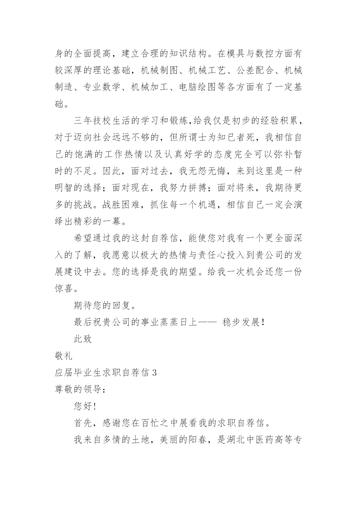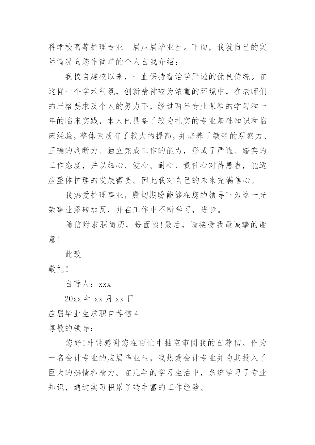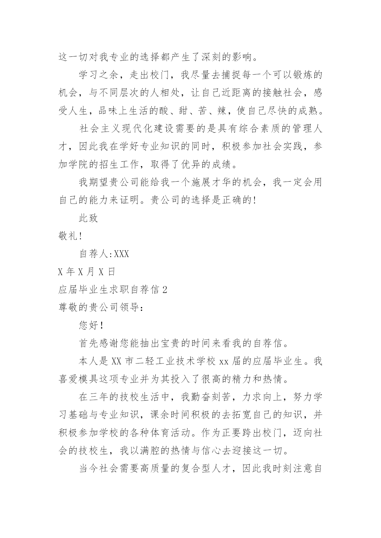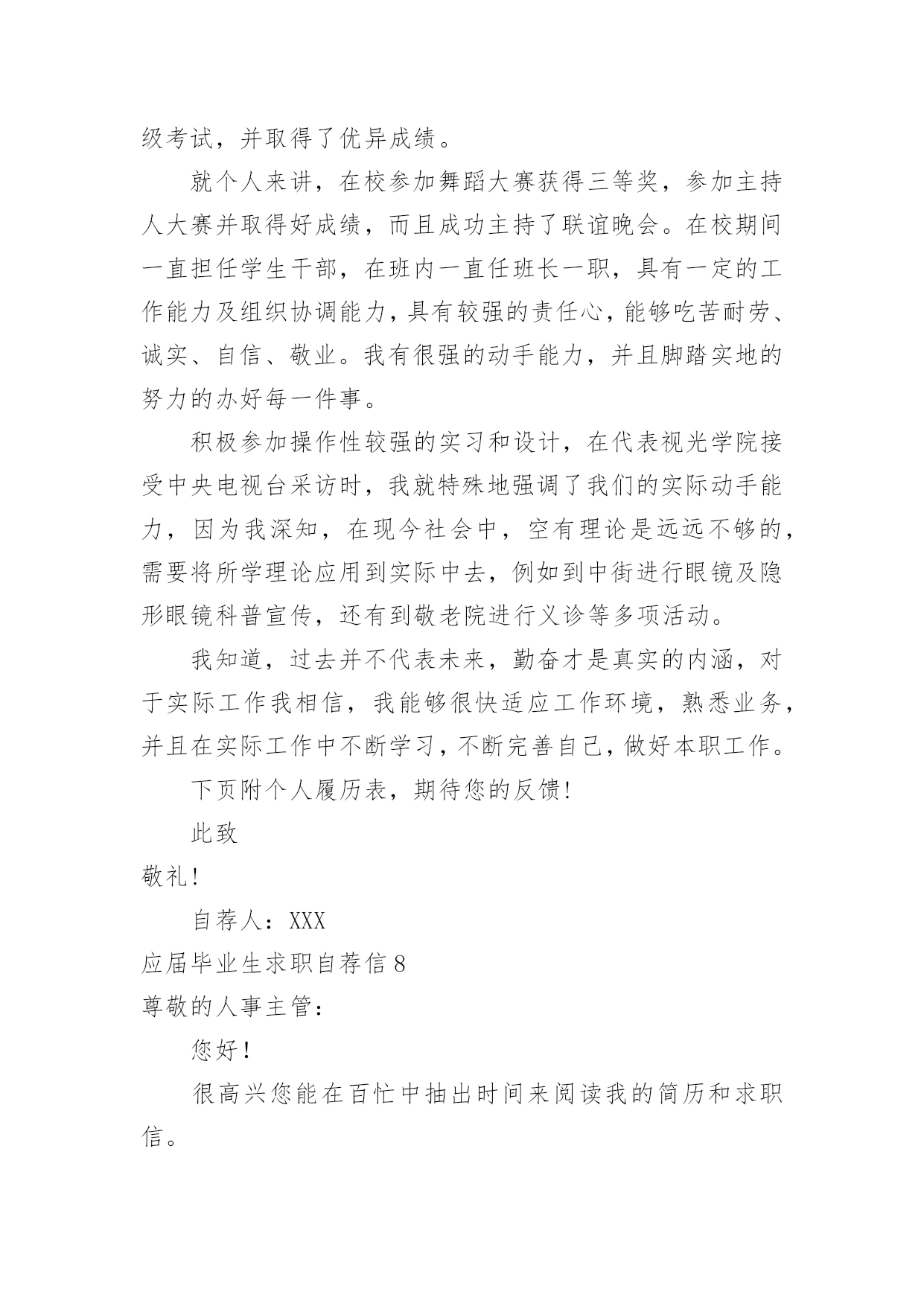 应届毕业生求职自荐信应届毕业生求职自荐信在当今社会中,大家逐渐认识到自荐信的重要性,自荐信根据用途的不同也有着不同的类型。你所见过的自荐信是什么样的呢?以下是小编整理的应届毕业生求职自荐信,欢迎阅读与收藏。应届毕业生求职自荐信1尊敬的领导:您好!我是XX学院的一名应届毕业生,专业是会计电算化,即将踏入社会的我对未来充满着期待,带着一份自信心,写了这份自荐信,冒昧向您自荐自己!大学三年,我即注重基础课的学习,又重视对能力的培养。在校期间,我抓紧时间,刻苦学习,以优异的成绩完成了基础理论课的学习。同时我也有计划的抽出时间去阅读各种书刊,杂志,力求尽可能的扩大知识面。我还参加了会计电算化的学习,掌握了会计软件的基本应用,现已取得会计电算化合格证书,还考取了会计从业资格证书。在校期间,我一直担任学院公寓管理委员会副主席。繁忙的工作不仅培养和锻炼了我的工作能力,更加锻炼了我解决问题的能力,和形形色色的人打交道,为人处事能力有极大提高,使我面临问题的时候能够冷静分析,缜密思考,而这一切对我专业的选择都产生了深刻的影响。学习之余,走出校门,我尽量去捕捉每一个可以锻炼的机会,与不同层次的人相处,让自己近距离的接触社会,感受人生,品味上生活的酸、甜、苦、辣,使自己尽快的成熟。社会主义现代化建设需要的是具有综合素质的管理人才,因此我在学好专业知识的同时,积极参加社会实践,参加学院的招生工作,取得了优异的成绩。我期望贵公司能给我一个施展才华的机会,我一定会用自己的能力来证明。贵公司的选择是正确的!此致敬礼!自荐人:XXXX年X月X日应届毕业生求职自荐信2尊敬的贵公司领导:您好!首先感谢您能抽出宝贵的时间来看我的自荐信。本人是XX市二轻工业技术学校xx届的应届毕业生。我喜爱模具这项专业并为其投入了很高的精力和热情。在三年的技校生活中,我勤奋刻苦,力求向上,努力学习基础与专业知识,课余时间积极的去拓宽自己的知识,并积极参加学校的各种体育活动。作为正要跨出校门,迈向社会的技校生,我以满腔的热情与信心去迎接这一切。当今社会需要高质量的复合型人才,因此我时刻注意自身的全面提高,建立合理的知识结构。在模具与数控方面有较深厚的理论基础,机械制图、机械工艺、公差配合、机械制造、专业数学、机械加工、电脑绘图等各方面有了一定基础。三年技校生活的学习和锻炼,给我仅是初步的经验积累,对于迈向社会远远不够的,但所谓士为知已者死,我相信自己的饱满的工作热情以及认真好学的态度完全可以弥补暂时的不足。因此,面对过去,我无怨无悔,来到这里是一种明智的选择;面对现在,我努力拼搏;面对将来,我期待更多的挑战。战胜困难,抓住每一个机遇,相信自己一定会演绎出精彩的一幕。希望通过我的这封自荐信,能使您对我有一个更全面深入的了解,我愿意以极大的热情与责任心投入到贵公司的发展建设中去。您的选择是我的期望。给我一次机会还您一份惊喜。期待您的回复。最后祝贵公司的事业蒸蒸日上——稳步发展!此致敬礼应届毕业生求职自荐信3尊敬的领导:您好!首先,感谢您在百忙之中展看我的求职自荐信。我来自多情的土地,美丽的阳春,是湖北中医药高等专科学校高等护理专业__届应届毕业生。下面,我就自己的实际情况向您作简单的个人自我介绍:我校自建校以来,一直保持着治学严谨的优良传统。在这样一个学术气氛,创新精神较为浓重的环境中,在老师们的严格要求及个人的努力下,经过两年专业课程的学习和一年的临床实践,本人已具备了较为扎实的专业基础知识和临床经验,整体素质有了较大的提高,并培养了敏锐的观察力、正确的判断力、独立完成工作的能力,形成了严谨、踏实的工作态度,并以细心、爱心、耐心、责任心对待患者,能适应整体护理的发展需要。因此我对自己的未来充满信心。我热爱护理事业,殷切期盼能够在您的领导下为这一光荣事业添砖加瓦,并在工作中不断学习,进步。随信附求职简历,盼面谈!最后,请接受我最诚挚的谢意!此致敬礼!自荐人:xxx20xx年xx月xx日应届毕业生求职自荐信4尊敬的领导:您好!非常感谢您在百忙中抽空审阅我的自荐信。作为一名会计专业的应届毕业生,我热爱会计专业并为其投入了巨大的热情和精力。在几年的学习生活中,系统学习了专业知识,通过实习积累了转丰富的工作经验。大学期间,本人始终积极向上、奋发进取,在各方面都取得长足的发展,全面提高了自己的综合素质。曾担任过校学生会主席和团委书记等职。在工作上我能做到勤勤恳恳,认真负责,精心组织,力求做到最好。多次被评为“校级优秀学生干部”、“校级优秀团干”,学习成绩优秀,连续四年获得一等奖学金,并被评为校级优秀毕业生。一系列的组织工作让我积累了宝贵的社会工作经验,使我学会了思考,学会了做人,学会了如何与人共事,锻炼了组织能力和沟通、协调能力,培养了吃苦耐劳、乐于奉献、关心集体、务实求进的思想。沉甸甸的过去,