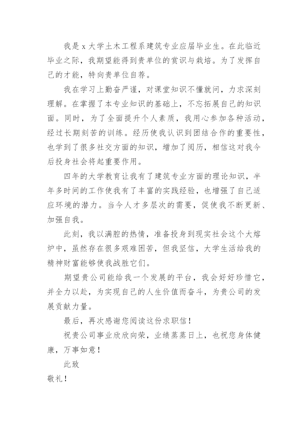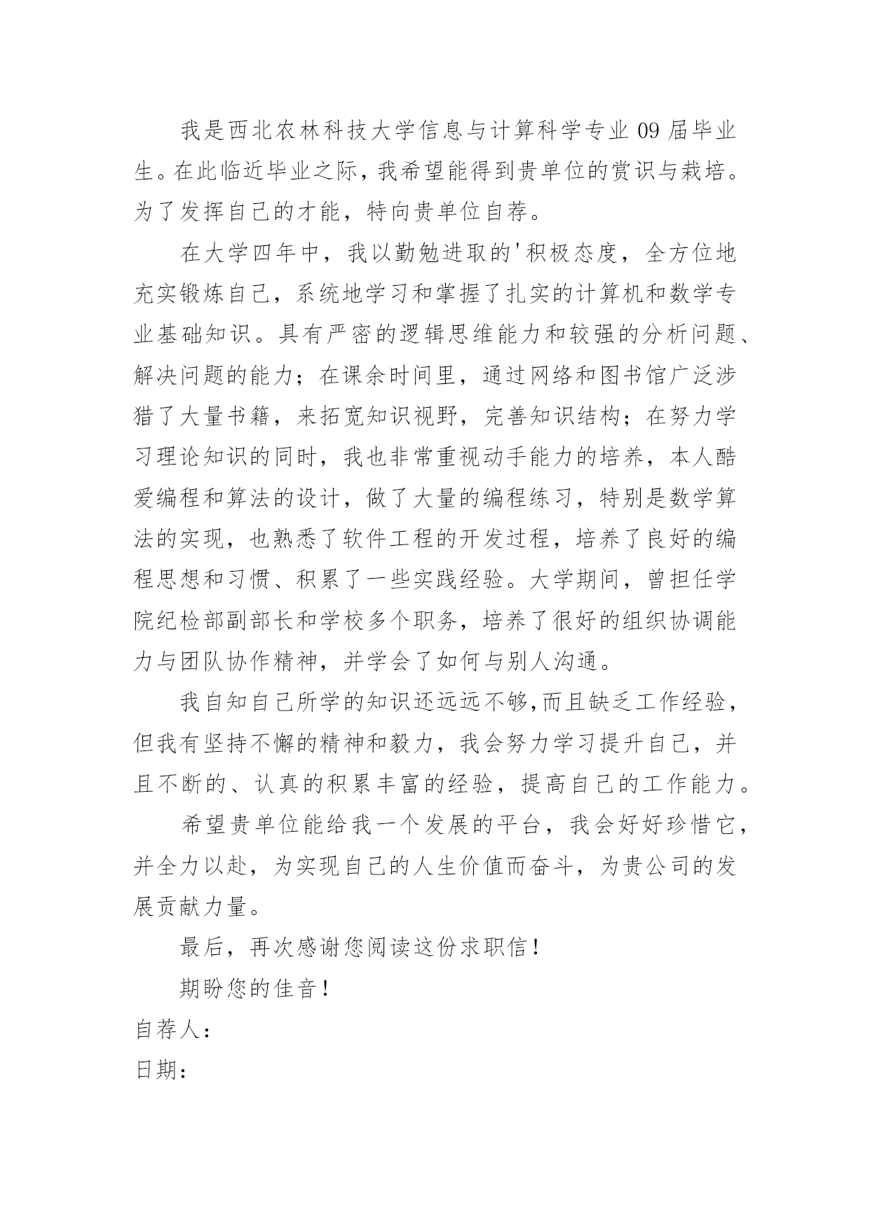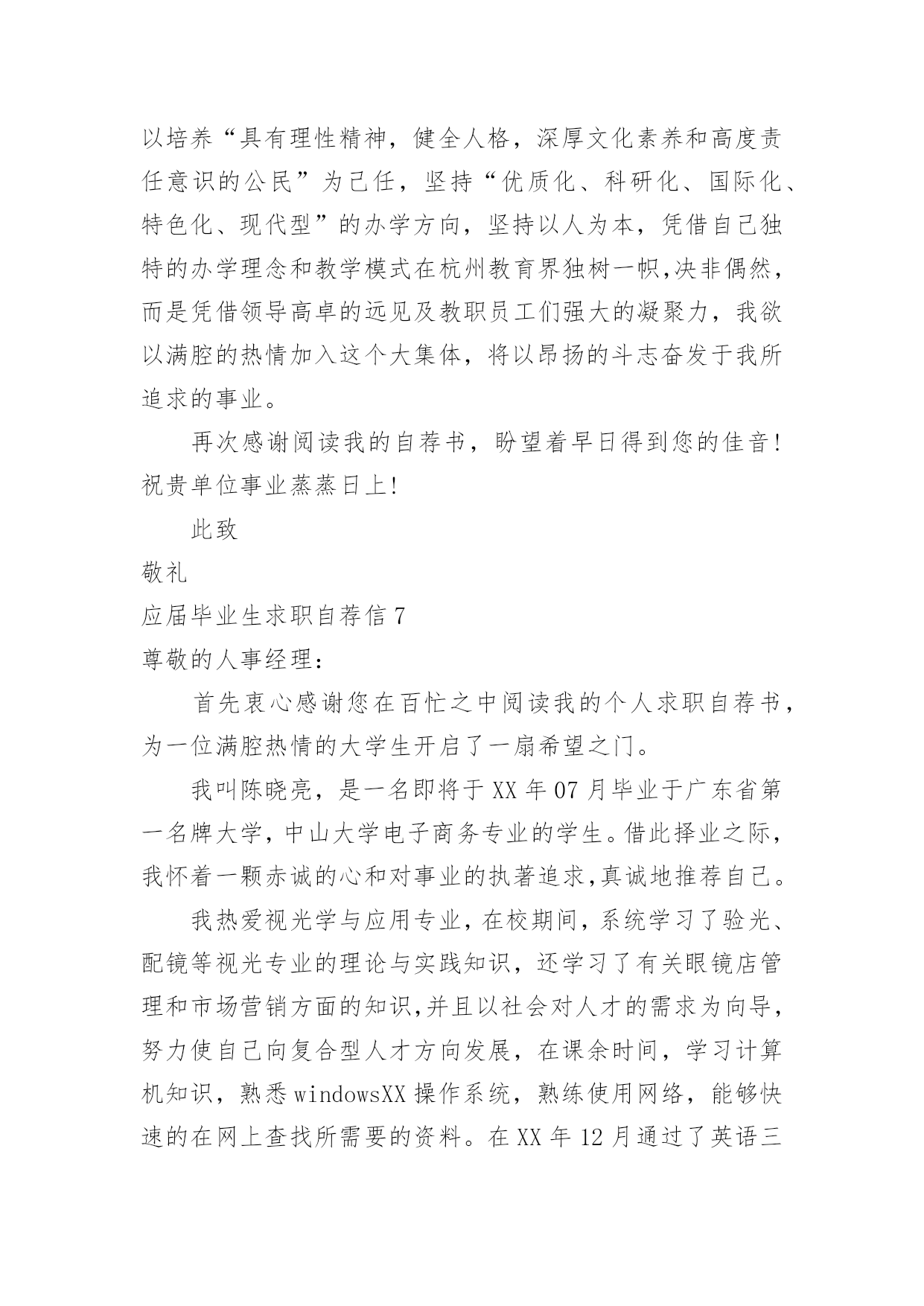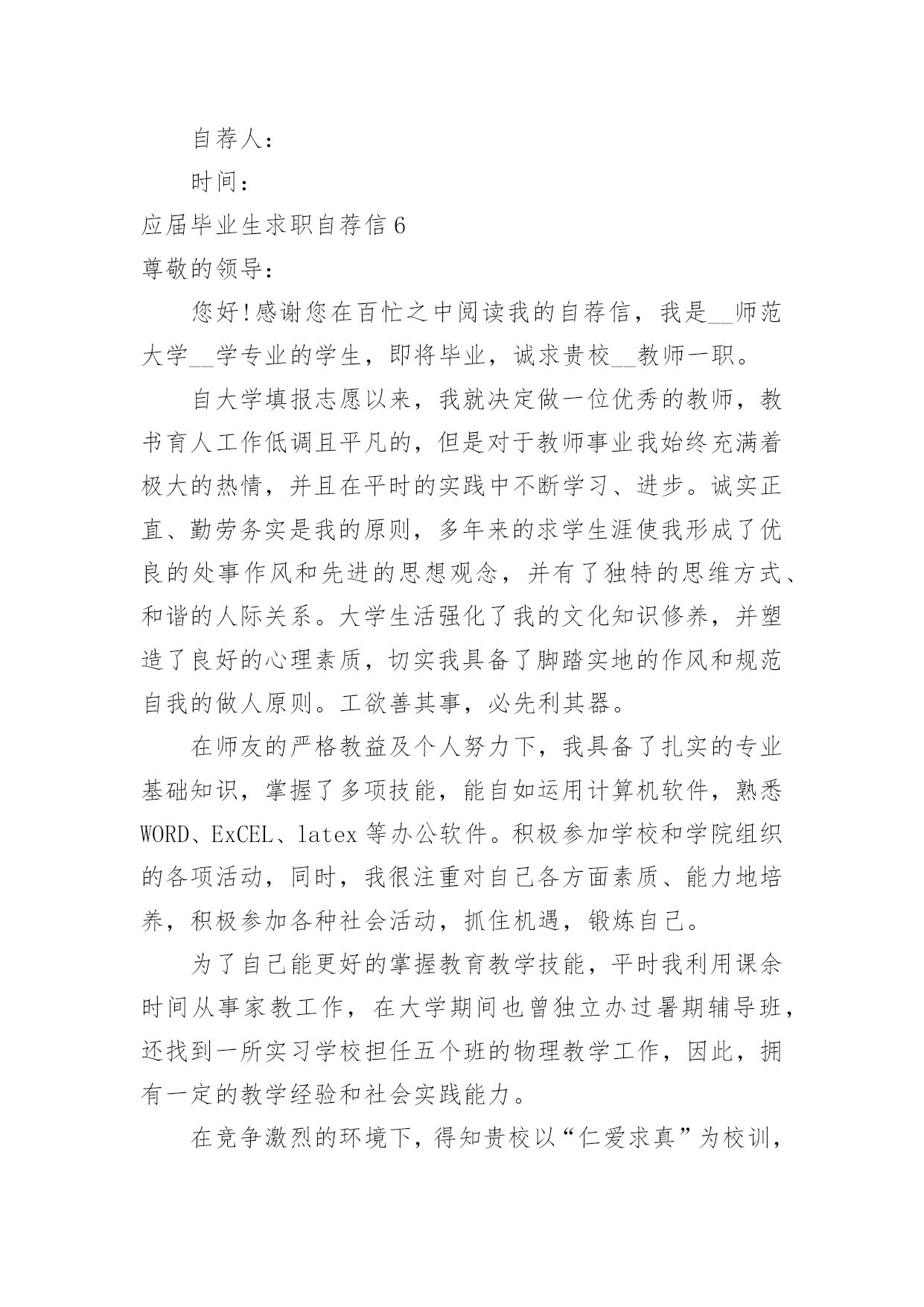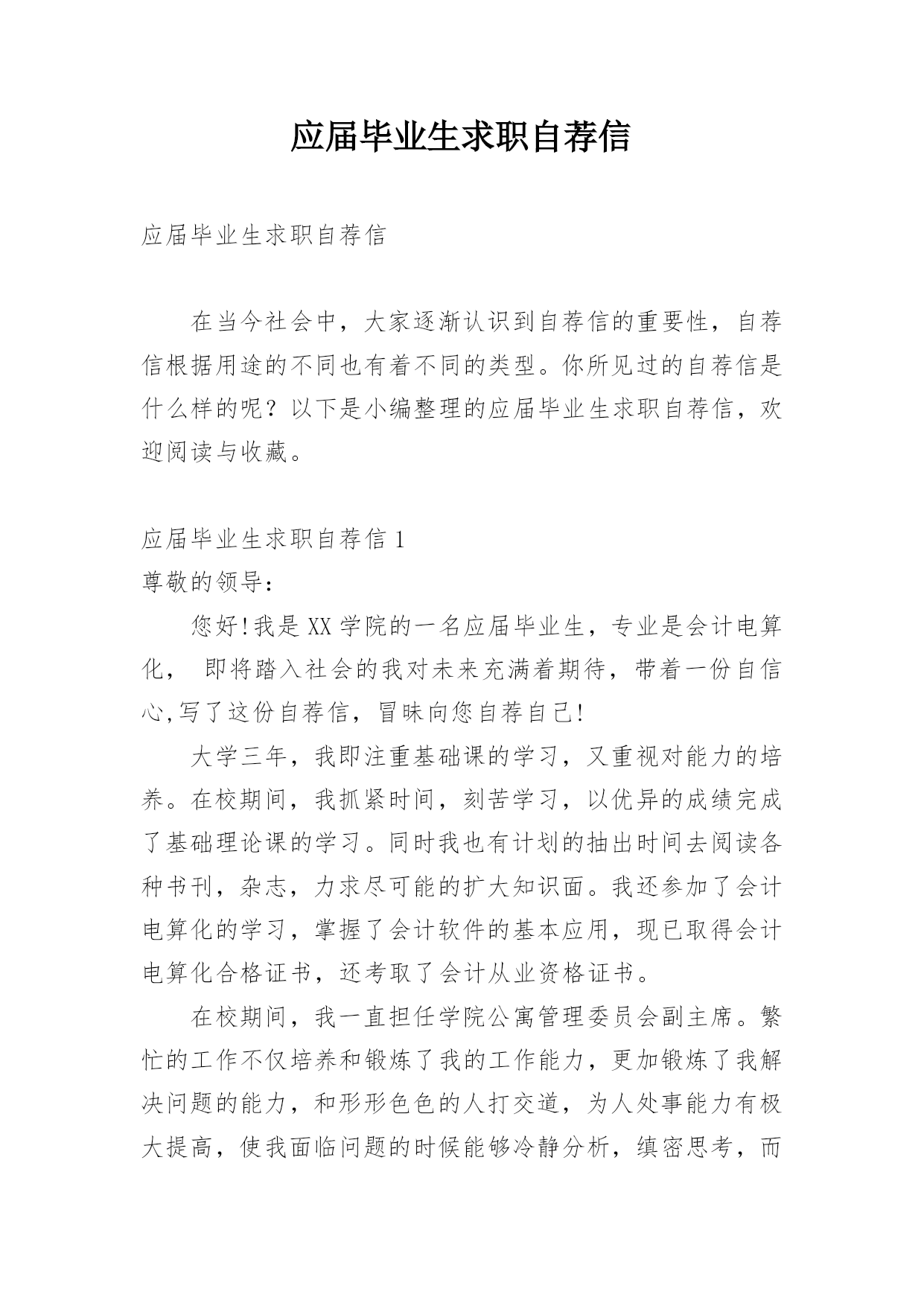应届毕业生求职自荐信应届毕业生求职自荐信在当今社会中,大家逐渐认识到自荐信的重要性,自荐信根据用途的不同也有着不同的类型。你所见过的自荐信是什么样的呢?以下是小编整理的应届毕业生求职自荐信,欢迎阅读与收藏。应届毕业生求职自荐信1尊敬的领导:您好!我是XX学院的一名应届毕业生,专业是会计电算化,即将踏入社会的我对未来充满着期待,带着一份自信心,写了这份自荐信,冒昧向您自荐自己!大学三年,我即注重基础课的学习,又重视对能力的培养。在校期间,我抓紧时间,刻苦学习,以优异的成绩完成了基础理论课的学习。同时我也有计划的抽出时间去阅读各种书刊,杂志,力求尽可能的扩大知识面。我还参加了会计电算化的学习,掌握了会计软件的基本应用,现已取得会计电算化合格证书,还考取了会计从业资格证书。在校期间,我一直担任学院公寓管理委员会副主席。繁忙的工作不仅培养和锻炼了我的工作能力,更加锻炼了我解决问题的能力,和形形色色的人打交道,为人处事能力有极大提高,使我面临问题的时候能够冷静分析,缜密思考,而这一切对我专业的选择都产生了深刻的影响。学习之余,走出校门,我尽量去捕捉每一个可以锻炼的机会,与不同层次的人相处,让自己近距离的接触社会,感受人生,品味上生活的酸、甜、苦、辣,使自己尽快的成熟。社会主义现代化建设需要的是具有综合素质的管理人才,因此我在学好专业知识的同时,积极参加社会实践,参加学院的招生工作,取得了优异的成绩。我期望贵公司能给我一个施展才华的机会,我一定会用自己的能力来证明。贵公司的选择是正确的!此致敬礼!自荐人:XXXX年X月X日应届毕业生求职自荐信2尊敬的贵公司领导:您好!首先感谢您能抽出宝贵的时间来看我的自荐信。本人是XX市二轻工业技术学校xx届的应届毕业生。我喜爱模具这项专业并为其投入了很高的精力和热情。在三年的技校生活中,我勤奋刻苦,力求向上,努力学习基础与专业知识,课余时间积极的去拓宽自己的知识,并积极参加学校的各种体育活动。作为正要跨出校门,迈向社会的技校生,我以满腔的热情与信心去迎接这一切。当今社会需要高质量的复合型人才,因此我时刻注意自身的全面提高,建立合理的知识结构。在模具与数控方面有较深厚的理论基础,机械制图、机械工艺、公差配合、机械制造、专业数学、机械加工、电脑绘图等各方面有了一定基础。三年技校生活的学习和锻炼,给我仅是初步的经验积累,对于迈向社会远远不够的,但所谓士为知已者死,我相信自己的饱满的工作热情以及认真好学的态度完全可以弥补暂时的不足。因此,面对过去,我无怨无悔,来到这里是一种明智的选择;面对现在,我努力拼搏;面对将来,我期待更多的挑战。战胜困难,抓住每一个机遇,相信自己一定会演绎出精彩的一幕。希望通过我的这封自荐信,能使您对我有一个更全面深入的了解,我愿意以极大的热情与责任心投入到贵公司的发展建设中去。您的选择是我的期望。给我一次机会还您一份惊喜。期待您的回复。最后祝贵公司的事业蒸蒸日上——稳步发展!此致敬礼应届毕业生求职自荐信3尊敬的领导:您好!首先,感谢您在百忙之中展看我的求职自荐信。我来自多情的土地,美丽的阳春,是湖北中医药高等专科学校高等护理专业__届应届毕业生。下面,我就自己的实际情况向您作简单的个人自我介绍:我校自建校以来,一直保持着治学严谨的优良传统。在这样一个学术气氛,创新精神较为浓重的环境中,在老师们的严格要求及个人的努力下,经过两年专业课程的学习和一年的临床实践,本人已具备了较为扎实的专业基础知识和临床经验,整体素质有了较大的提高,并培养了敏锐的观察力、正确的判断力、独立完成工作的能力,形成了严谨、踏实的工作态度,并以细心、爱心、耐心、责任心对待患者,能适应整体护理的发展需要。因此我对自己的未来充满信心。我热爱护理事业,殷切期盼能够在您的领导下为这一光荣事业添砖加瓦,并在工作中不断学习,进步。随信附求职简历,盼面谈!最后,请接受我最诚挚的谢意!此致敬礼!自荐人:xxx20xx年xx月xx日应届毕业生求职自荐信4尊敬的领导:您好!非常感谢您在百忙中抽空审阅我的自荐信。作为一名会计专业的应届毕业生,我热爱会计专业并为其投入了巨大的热情和精力。在几年的学习生活中,系统学习了专业知识,通过实习积累了转丰富的工作经验。大学期间,本人始终积极向上、奋发进取,在各方面都取得长足的发展,全面提高了自己的综合素质。曾担任过校学生会主席和团委书记等职。在工作上我能做到勤勤恳恳,认真负责,精心组织,力求做到最好。多次被评为“校级优秀学生干部”、“校级优秀团干”,学习成绩优秀,连续四年获得一等奖学金,并被评为校级优秀毕业生。一系列的组织工作让我积累了宝贵的社会工作经验,使我学会了思考,学会了做人,学会了如何与人共事,锻炼了组织能力和沟通、协调能力,培养了吃苦耐劳、乐于奉献、关心集体、务实求进的思想。沉甸甸的过去,
