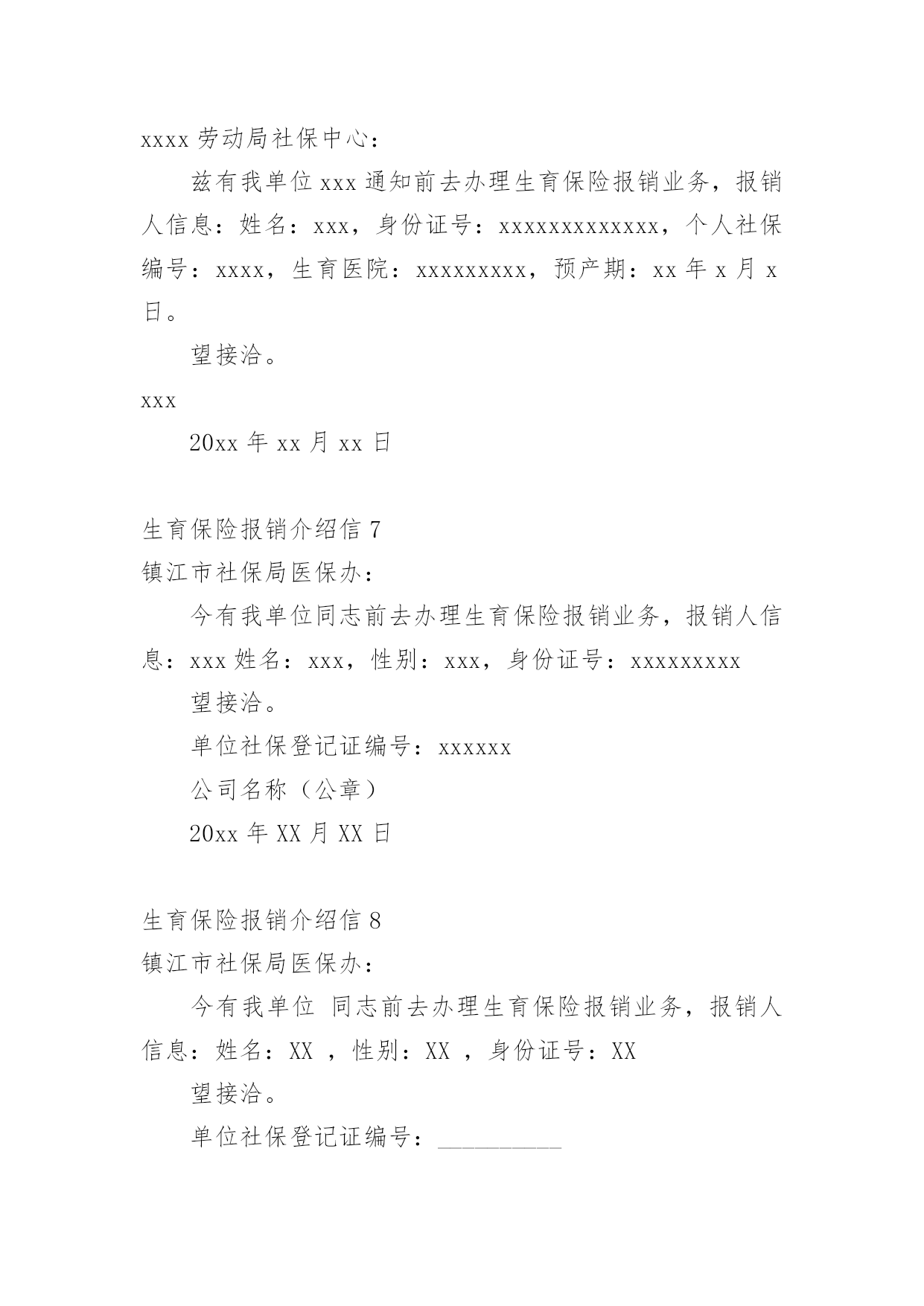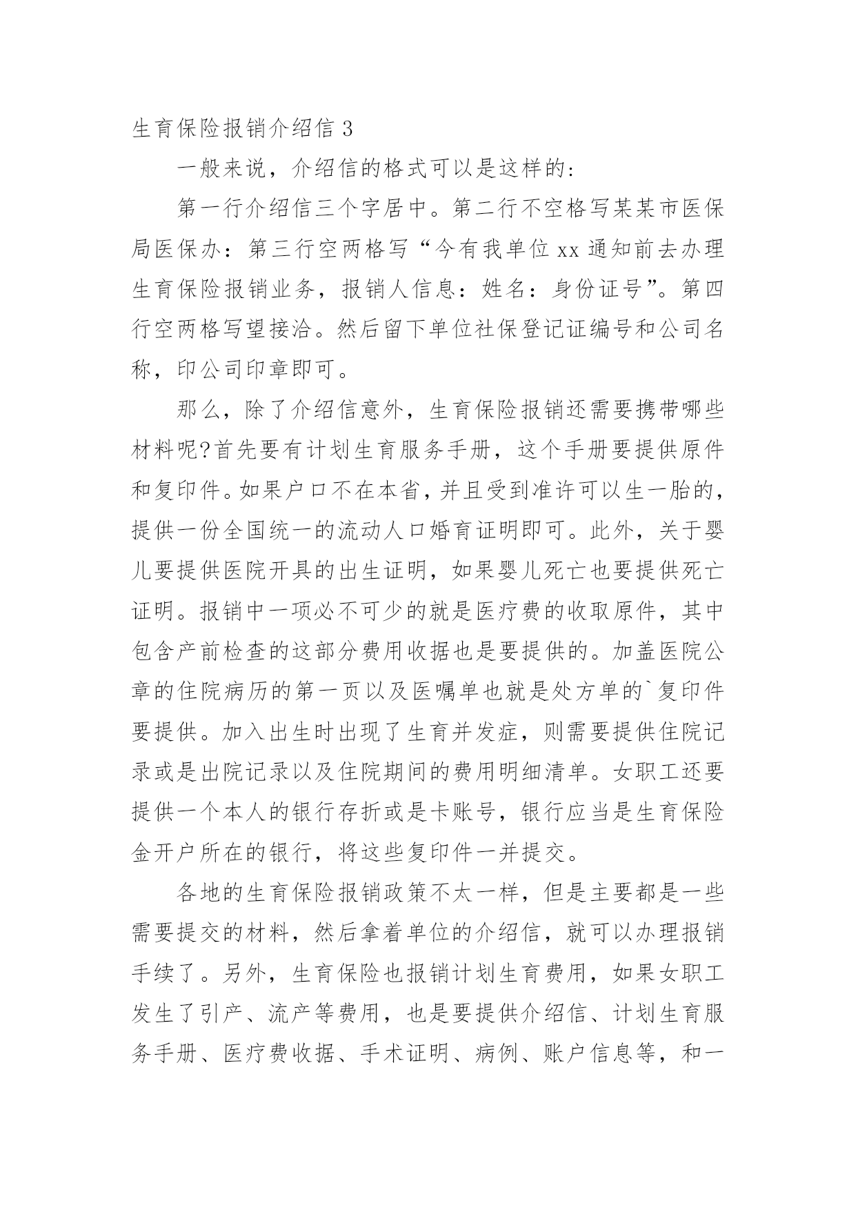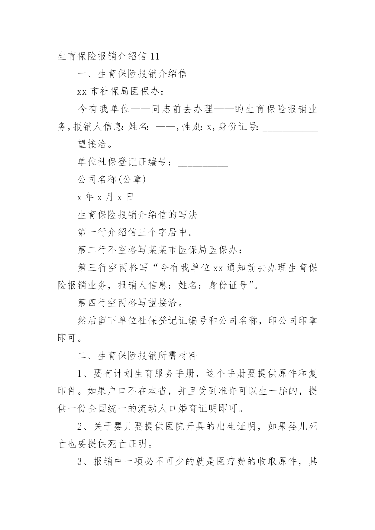 生育保险报销介绍信在学习、工作生活中,越来越多地方需要用到介绍信,借助介绍信我们可以同有关单位或个人联系,商量洽谈一些具体事宜。那么,怎么去写介绍信呢?下面是小编为大家收集的生育保险报销介绍信,欢迎大家分享。生育保险报销介绍信1xx县社保局:兹有我单位同志(性别:女;身份证号:xxxxxx)前去办理生育保险报销业务,请予接洽为盼。单位社保登记证编号:xxxxxxxxxxxxxx县x乡中心学校20xx年x月x日生育保险报销介绍信2xx镇江市社保局医保办:今有我单位xx前去办理生育保险报销业务,报销人信息:姓名:xx,性别:xx,身份证号:xxxxxxxxxxxx。望接洽。单位社保登记证编号:xxxxxx公司名称(公章)xxxxxxx年xx月xx日生育保险报销介绍信3一般来说,介绍信的格式可以是这样的:第一行介绍信三个字居中。第二行不空格写某某市医保局医保办:第三行空两格写“今有我单位xx通知前去办理生育保险报销业务,报销人信息:姓名:身份证号”。第四行空两格写望接洽。然后留下单位社保登记证编号和公司名称,印公司印章即可。那么,除了介绍信意外,生育保险报销还需要携带哪些材料呢?首先要有计划生育服务手册,这个手册要提供原件和复印件。如果户口不在本省,并且受到准许可以生一胎的,提供一份全国统一的流动人口婚育证明即可。此外,关于婴儿要提供医院开具的出生证明,如果婴儿死亡也要提供死亡证明。报销中一项必不可少的就是医疗费的收取原件,其中包含产前检查的这部分费用收据也是要提供的。加盖医院公章的住院病历的第一页以及医嘱单也就是处方单的`复印件要提供。加入出生时出现了生育并发症,则需要提供住院记录或是出院记录以及住院期间的费用明细清单。女职工还要提供一个本人的银行存折或是卡账号,银行应当是生育保险金开户所在的银行,将这些复印件一并提交。各地的生育保险报销政策不太一样,但是主要都是一些需要提交的材料,然后拿着单位的介绍信,就可以办理报销手续了。另外,生育保险也报销计划生育费用,如果女职工发生了引产、流产等费用,也是要提供介绍信、计划生育服务手册、医疗费收据、手术证明、病例、账户信息等,和一样的流程报销计划生育的费用。做节育手术的,提供介绍信、检查手术费收据、病例、手术证明、帐号等信息。生育保险报销介绍信4xxxxxxxx医保办:现有我单位xxxxxx等同志前去办理生育保险保险业务。报销人信息:性别:xxxxxxxx身份证号:xxxxxxxx望接洽。单位社保登记证编号:xxxxxxxx公司名称20xx年xx月xx日生育保险报销介绍信5xxxx市社保局医保办:今有我单位xx前去办理xx的生育保险报销业务,报销人信息:姓名:xx,性别:xx,身份证号:xxxxxxxxxxx,望接洽。单位社保登记证编号:xxxxxxxxxxx公司(公章)20xx年xx月xx日生育保险报销介绍信6xxxx劳动局社保中心:兹有我单位xxx通知前去办理生育保险报销业务,报销人信息:姓名:xxx,身份证号:xxxxxxxxxxxxx,个人社保编号:xxxx,生育医院:xxxxxxxxx,预产期:xx年x月x日。望接洽。xxx20xx年xx月xx日生育保险报销介绍信7镇江市社保局医保办:今有我单位同志前去办理生育保险报销业务,报销人信息:xxx姓名:xxx,性别:xxx,身份证号:xxxxxxxxx望接洽。单位社保登记证编号:xxxxxx公司名称(公章)20xx年XX月XX日生育保险报销介绍信8镇江市社保局医保办:今有我单位同志前去办理生育保险报销业务,报销人信息:姓名:XX,性别:XX,身份证号:XX望接洽。单位社保登记证编号:__________公司名称(公章)年月日生育保险报销介绍信9xxx劳动局社保中心:兹有我单位xxx通知前去办理生育保险报销业务,报销人信息:姓名:xxxx,身份证号:xxxxxxxxxxxxxxxxxxx,个人社保编号:xxxxx,生育医院:xxxxxx,预产期:xx年x月x日。望接洽。社保登记证编号:xxxx(这项可不写)单位名称(盖章)20xx年x月x日生育保险报销介绍信10xxxx劳动局社保中心:兹有我单位xxx通知前去办理生育保险报销业务,报销人信息:姓名:xxx,身份证号:xxxxxxxxxxxxx,个人社保编号:xxxx,生育医院:xxxxxxxxx,预产期:20xx年x月x日。望接洽。社保登记证编号:xxx(这项可不写)20xx年x月x日生育保险报销介绍信11一、生育保险报销介绍信xx市社保局医保办:今有我单位——同志前去办理——的生育保险报销业务,报销人信息:姓名:——,性别:x,身份证号:___________望接洽。单位社保登记证编号:__________公司名称(公章)x年x月x日生育保险报销介绍信的写法第一行介绍信三个字居中。
