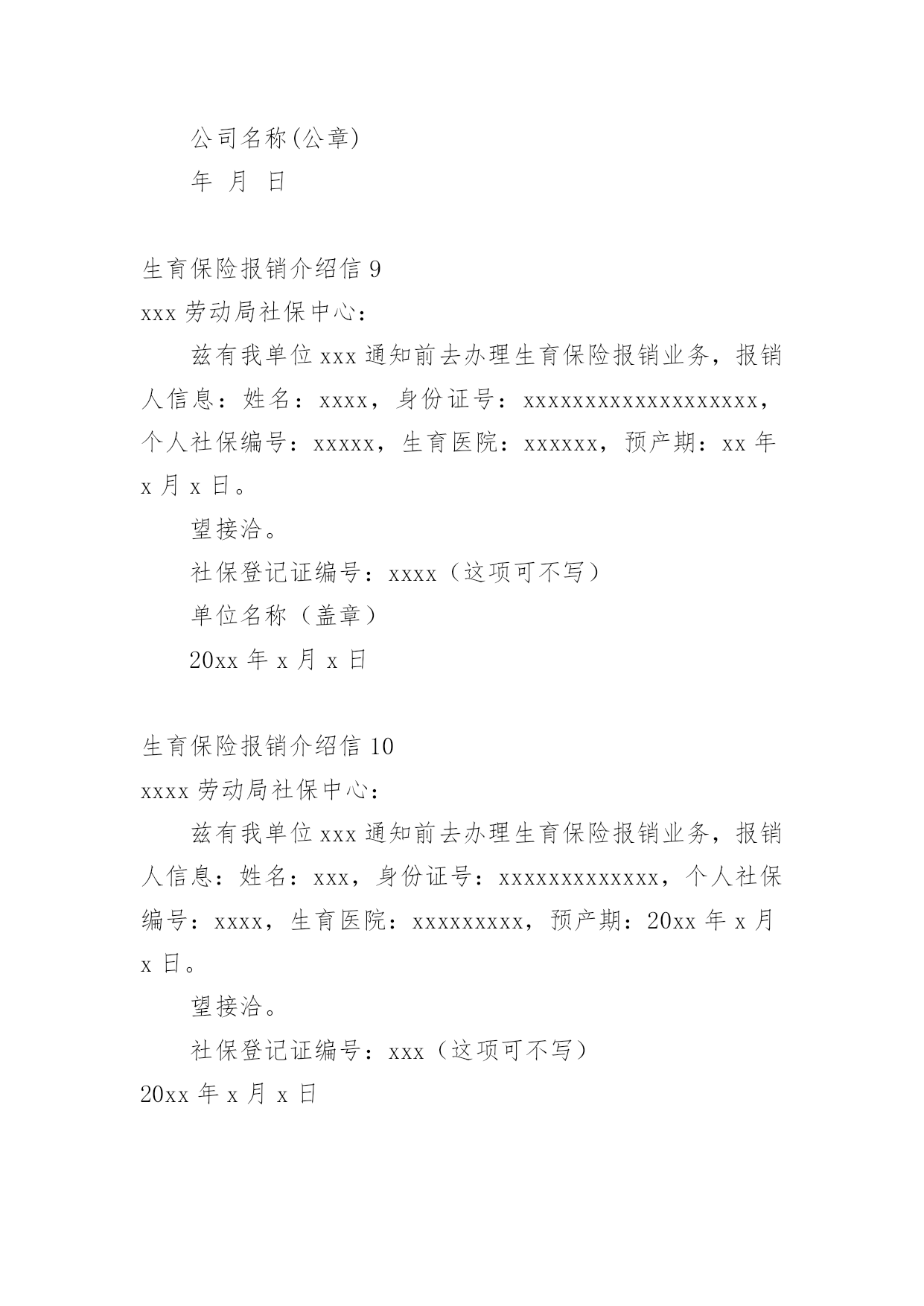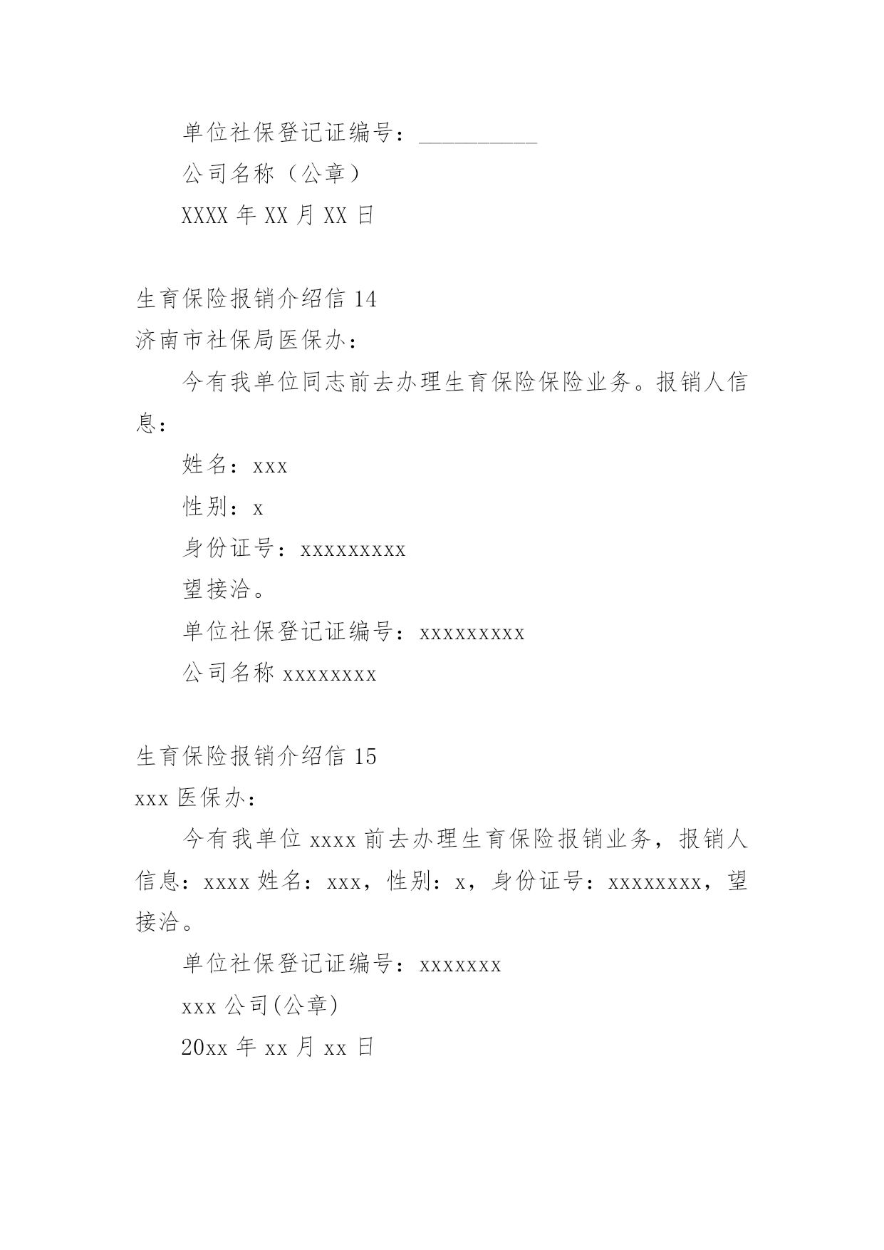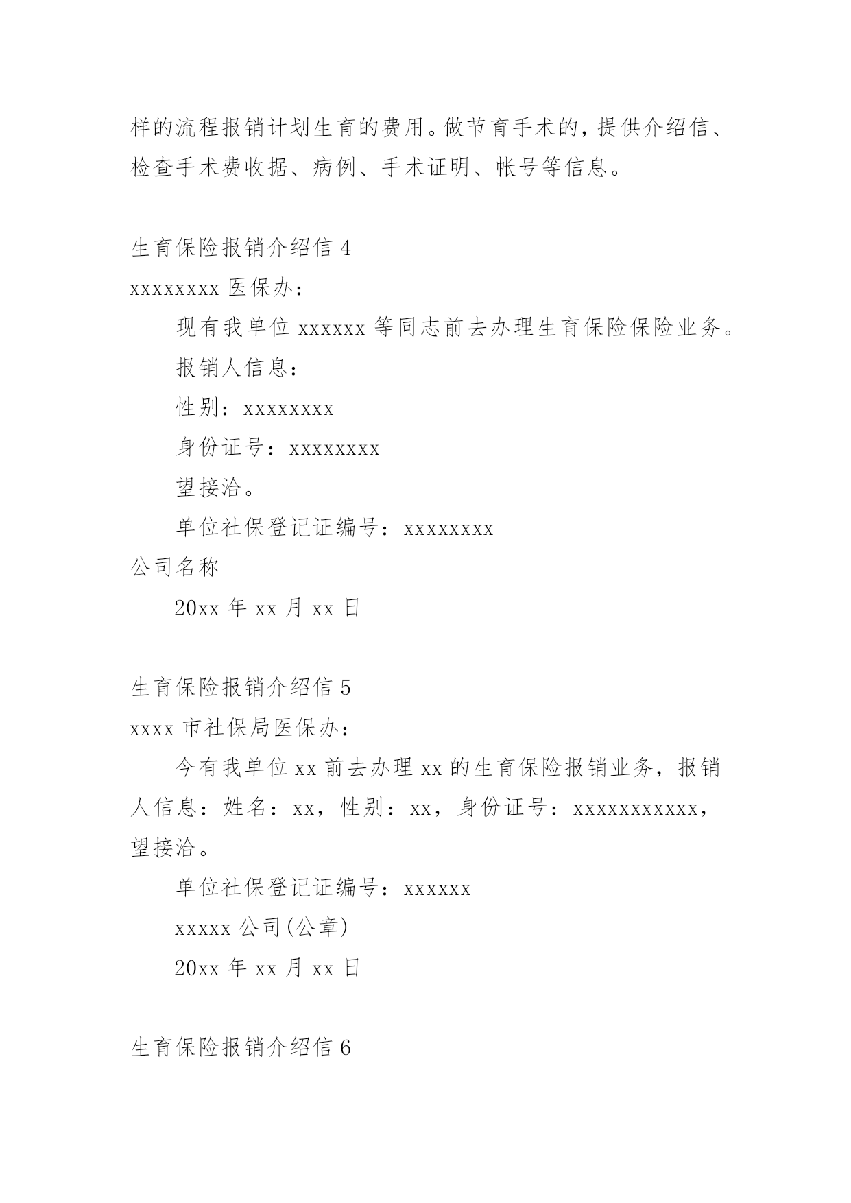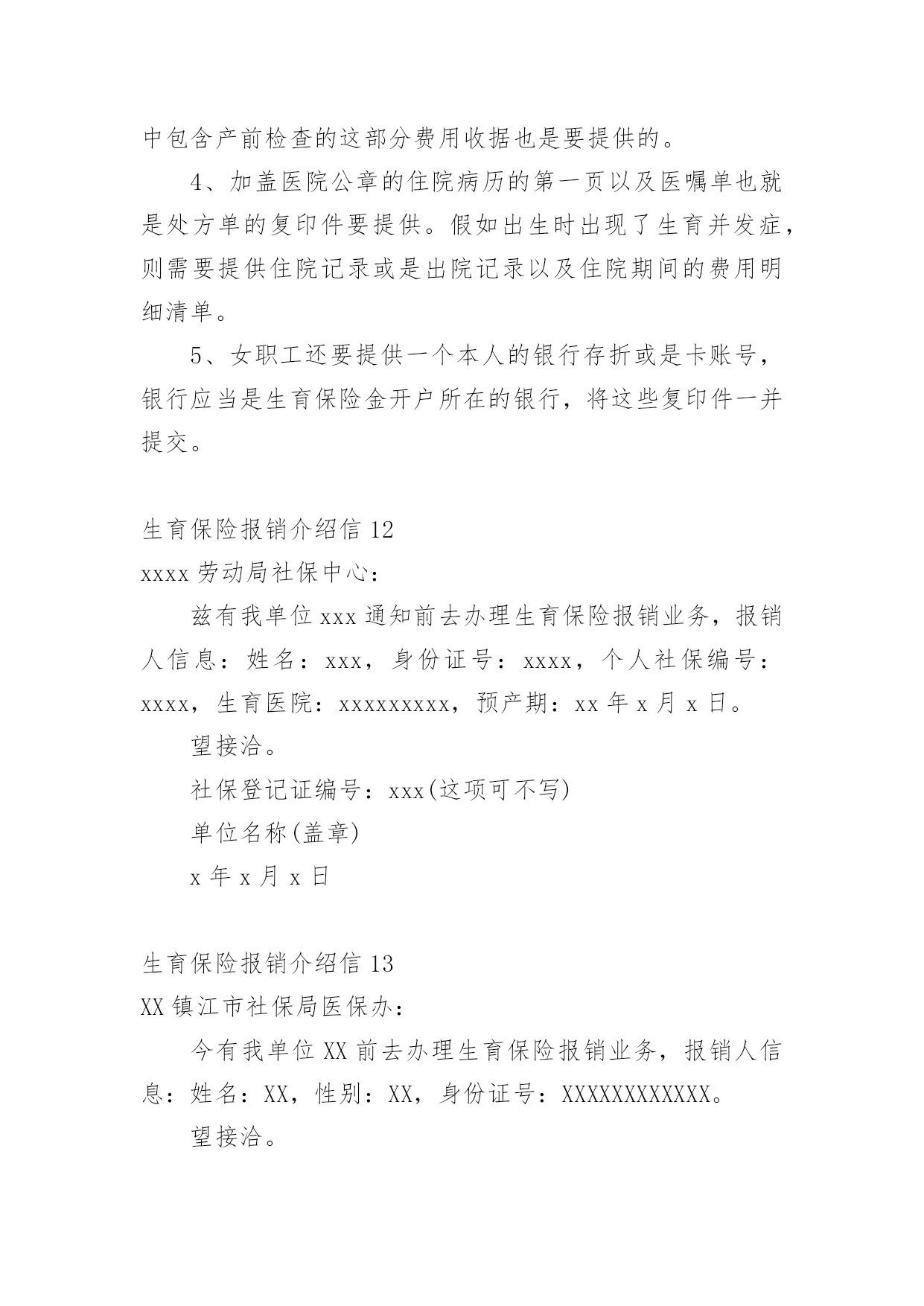 生育保险报销介绍信在学习、工作生活中,越来越多地方需要用到介绍信,借助介绍信我们可以同有关单位或个人联系,商量洽谈一些具体事宜。那么,怎么去写介绍信呢?下面是小编为大家收集的生育保险报销介绍信,欢迎大家分享。生育保险报销介绍信1xx县社保局:兹有我单位同志(性别:女;身份证号:xxxxxx)前去办理生育保险报销业务,请予接洽为盼。单位社保登记证编号:xxxxxxxxxxxxxx县x乡中心学校20xx年x月x日生育保险报销介绍信2xx镇江市社保局医保办:今有我单位xx前去办理生育保险报销业务,报销人信息:姓名:xx,性别:xx,身份证号:xxxxxxxxxxxx。望接洽。单位社保登记证编号:xxxxxx公司名称(公章)xxxxxxx年xx月xx日生育保险报销介绍信3一般来说,介绍信的格式可以是这样的:第一行介绍信三个字居中。第二行不空格写某某市医保局医保办:第三行空两格写“今有我单位xx通知前去办理生育保险报销业务,报销人信息:姓名:身份证号”。第四行空两格写望接洽。然后留下单位社保登记证编号和公司名称,印公司印章即可。那么,除了介绍信意外,生育保险报销还需要携带哪些材料呢?首先要有计划生育服务手册,这个手册要提供原件和复印件。如果户口不在本省,并且受到准许可以生一胎的,提供一份全国统一的流动人口婚育证明即可。此外,关于婴儿要提供医院开具的出生证明,如果婴儿死亡也要提供死亡证明。报销中一项必不可少的就是医疗费的收取原件,其中包含产前检查的这部分费用收据也是要提供的。加盖医院公章的住院病历的第一页以及医嘱单也就是处方单的`复印件要提供。加入出生时出现了生育并发症,则需要提供住院记录或是出院记录以及住院期间的费用明细清单。女职工还要提供一个本人的银行存折或是卡账号,银行应当是生育保险金开户所在的银行,将这些复印件一并提交。各地的生育保险报销政策不太一样,但是主要都是一些需要提交的材料,然后拿着单位的介绍信,就可以办理报销手续了。另外,生育保险也报销计划生育费用,如果女职工发生了引产、流产等费用,也是要提供介绍信、计划生育服务手册、医疗费收据、手术证明、病例、账户信息等,和一样的流程报销计划生育的费用。做节育手术的,提供介绍信、检查手术费收据、病例、手术证明、帐号等信息。生育保险报销介绍信4xxxxxxxx医保办:现有我单位xxxxxx等同志前去办理生育保险保险业务。报销人信息:性别:xxxxxxxx身份证号:xxxxxxxx望接洽。单位社保登记证编号:xxxxxxxx公司名称20xx年xx月xx日生育保险报销介绍信5xxxx市社保局医保办:今有我单位xx前去办理xx的生育保险报销业务,报销人信息:姓名:xx,性别:xx,身份证号:xxxxxxxxxxx,望接洽。单位社保登记证编号:xxxxxxxxxxx公司(公章)20xx年xx月xx日生育保险报销介绍信6xxxx劳动局社保中心:兹有我单位xxx通知前去办理生育保险报销业务,报销人信息:姓名:xxx,身份证号:xxxxxxxxxxxxx,个人社保编号:xxxx,生育医院:xxxxxxxxx,预产期:xx年x月x日。望接洽。xxx20xx年xx月xx日生育保险报销介绍信7镇江市社保局医保办:今有我单位同志前去办理生育保险报销业务,报销人信息:xxx姓名:xxx,性别:xxx,身份证号:xxxxxxxxx望接洽。单位社保登记证编号:xxxxxx公司名称(公章)20xx年XX月XX日生育保险报销介绍信8镇江市社保局医保办:今有我单位同志前去办理生育保险报销业务,报销人信息:姓名:XX,性别:XX,身份证号:XX望接洽。单位社保登记证编号:__________公司名称(公章)年月日生育保险报销介绍信9xxx劳动局社保中心:兹有我单位xxx通知前去办理生育保险报销业务,报销人信息:姓名:xxxx,身份证号:xxxxxxxxxxxxxxxxxxx,个人社保编号:xxxxx,生育医院:xxxxxx,预产期:xx年x月x日。望接洽。社保登记证编号:xxxx(这项可不写)单位名称(盖章)20xx年x月x日生育保险报销介绍信10xxxx劳动局社保中心:兹有我单位xxx通知前去办理生育保险报销业务,报销人信息:姓名:xxx,身份证号:xxxxxxxxxxxxx,个人社保编号:xxxx,生育医院:xxxxxxxxx,预产期:20xx年x月x日。望接洽。社保登记证编号:xxx(这项可不写)20xx年x月x日生育保险报销介绍信11一、生育保险报销介绍信xx市社保局医保办:今有我单位——同志前去办理——的生育保险报销业务,报销人信息:姓名:——,性别:x,身份证号:___________望接洽。单位社保登记证编号:__________公司名称(公章)x年x月x日生育保险报销介绍信的写法第一行介绍信三个字居中。