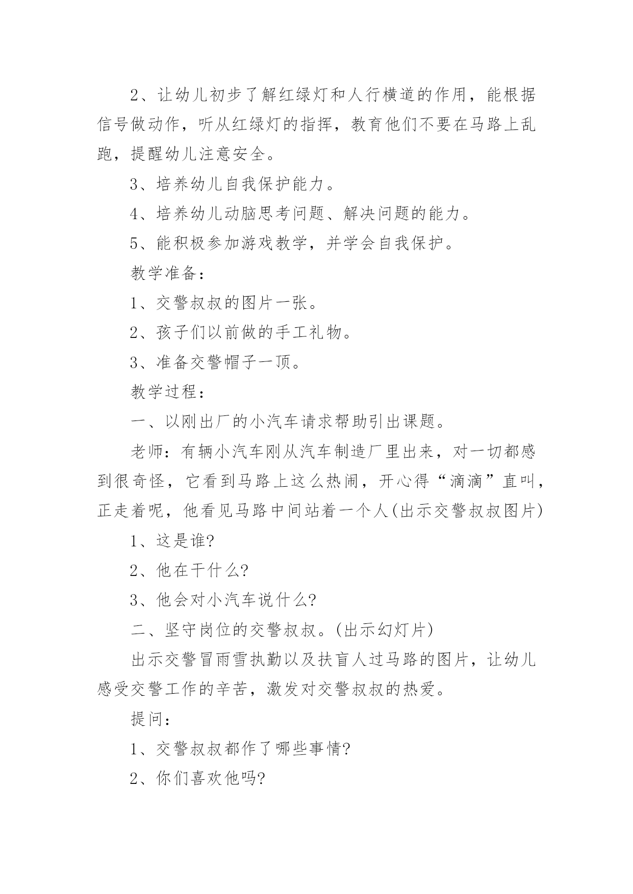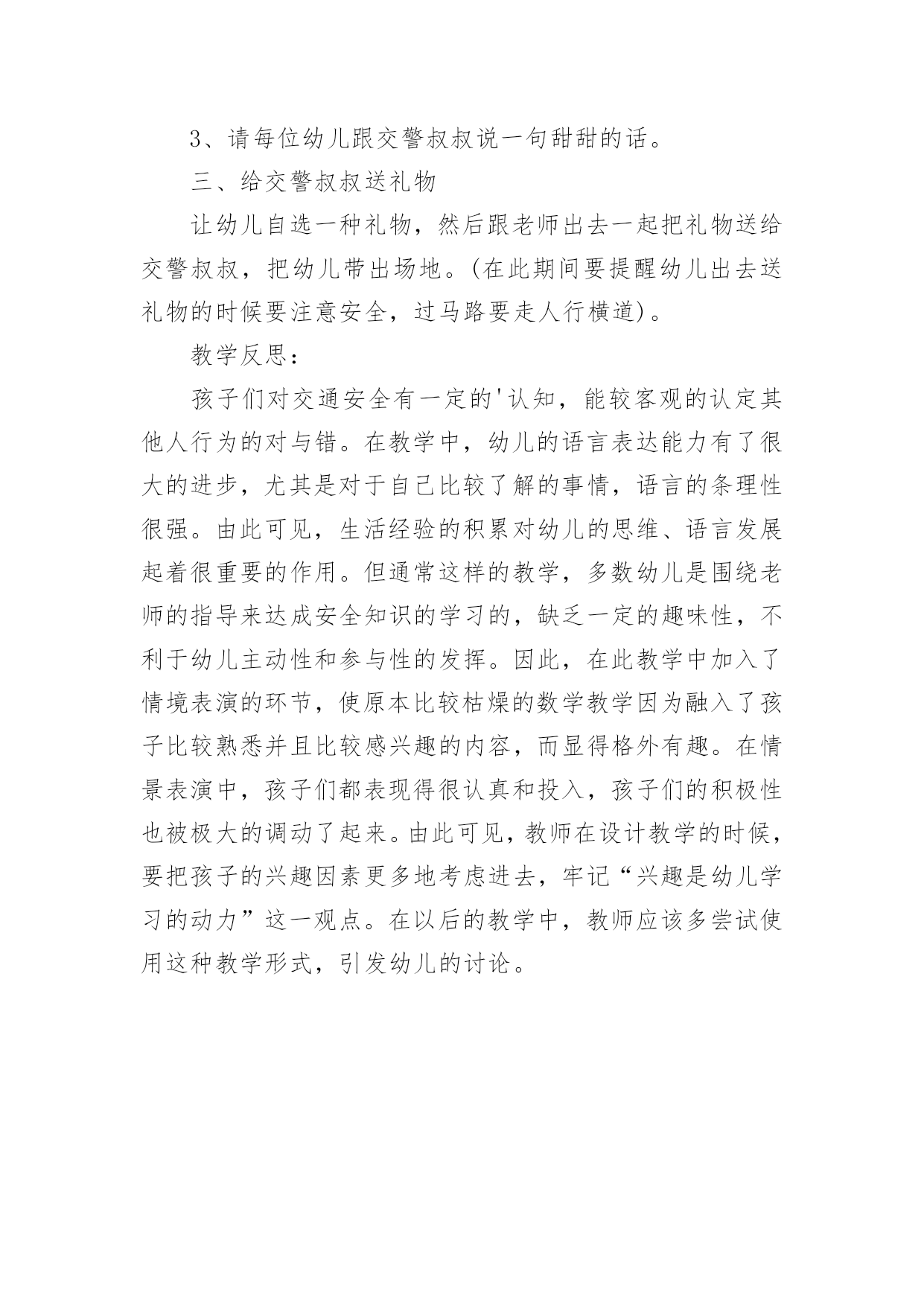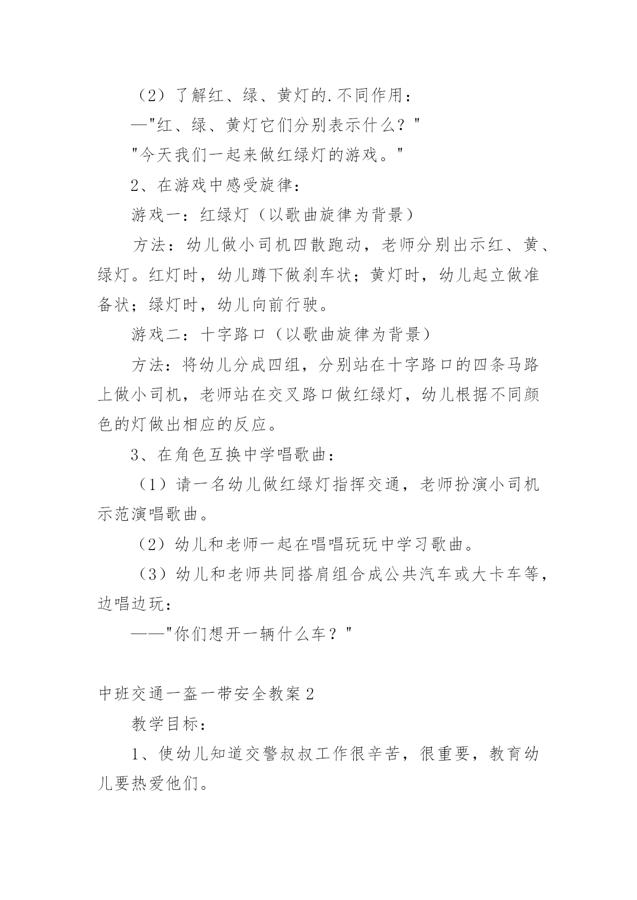中班交通一盔一带安全教案作为一位兢兢业业的人民教师,时常需要用到教案,通过教案准备可以更好地根据具体情况对教学进程做适当的必要的调整。那么应当如何写教案呢?以下是小编收集整理的中班交通一盔一带安全教案,希望能够帮助到大家。中班交通一盔一带安全教案1活动目标:1、通过音乐游戏,巩固对"红灯停、绿灯走"的交通规则的认识。2、愉快地参加音乐游戏。活动准备:幼儿已认识了马路上的红绿灯、红、黄、绿灯(自制)、歌曲录音《红绿灯》。活动重点:能根据音乐的变化变换游戏动作。活动难点:巩固"红灯停、绿灯走"的交通规则。活动过程:1、在讨论中引发主题:(1)回忆引发讨论:—"前几天,我们在马路上看到了什么?""马路上为什么要有红绿灯?"(2)了解红、绿、黄灯的.不同作用:—"红、绿、黄灯它们分别表示什么?""今天我们一起来做红绿灯的游戏。"2、在游戏中感受旋律:游戏一:红绿灯(以歌曲旋律为背景)方法:幼儿做小司机四散跑动,老师分别出示红、黄、绿灯。红灯时,幼儿蹲下做刹车状;黄灯时,幼儿起立做准备状;绿灯时,幼儿向前行驶。游戏二:十字路口(以歌曲旋律为背景)方法:将幼儿分成四组,分别站在十字路口的四条马路上做小司机,老师站在交叉路口做红绿灯,幼儿根据不同颜色的灯做出相应的反应。3、在角色互换中学唱歌曲:(1)请一名幼儿做红绿灯指挥交通,老师扮演小司机示范演唱歌曲。(2)幼儿和老师一起在唱唱玩玩中学习歌曲。(3)幼儿和老师共同搭肩组合成公共汽车或大卡车等,边唱边玩:——"你们想开一辆什么车?"中班交通一盔一带安全教案2教学目标:1、使幼儿知道交警叔叔工作很辛苦,很重要,教育幼儿要热爱他们。2、让幼儿初步了解红绿灯和人行横道的作用,能根据信号做动作,听从红绿灯的指挥,教育他们不要在马路上乱跑,提醒幼儿注意安全。3、培养幼儿自我保护能力。4、培养幼儿动脑思考问题、解决问题的能力。5、能积极参加游戏教学,并学会自我保护。教学准备:1、交警叔叔的图片一张。2、孩子们以前做的手工礼物。3、准备交警帽子一顶。教学过程:一、以刚出厂的小汽车请求帮助引出课题。老师:有辆小汽车刚从汽车制造厂里出来,对一切都感到很奇怪,它看到马路上这么热闹,开心得“滴滴”直叫,正走着呢,他看见马路中间站着一个人(出示交警叔叔图片)1、这是谁?2、他在干什么?3、他会对小汽车说什么?二、坚守岗位的交警叔叔。(出示幻灯片)出示交警冒雨雪执勤以及扶盲人过马路的图片,让幼儿感受交警工作的辛苦,激发对交警叔叔的热爱。提问:1、交警叔叔都作了哪些事情?2、你们喜欢他吗?3、请每位幼儿跟交警叔叔说一句甜甜的话。三、给交警叔叔送礼物让幼儿自选一种礼物,然后跟老师出去一起把礼物送给交警叔叔,把幼儿带出场地。(在此期间要提醒幼儿出去送礼物的时候要注意安全,过马路要走人行横道)。教学反思:孩子们对交通安全有一定的'认知,能较客观的认定其他人行为的对与错。在教学中,幼儿的语言表达能力有了很大的进步,尤其是对于自己比较了解的事情,语言的条理性很强。由此可见,生活经验的积累对幼儿的思维、语言发展起着很重要的作用。但通常这样的教学,多数幼儿是围绕老师的指导来达成安全知识的学习的,缺乏一定的趣味性,不利于幼儿主动性和参与性的发挥。因此,在此教学中加入了情境表演的环节,使原本比较枯燥的数学教学因为融入了孩子比较熟悉并且比较感兴趣的内容,而显得格外有趣。在情景表演中,孩子们都表现得很认真和投入,孩子们的积极性也被极大的调动了起来。由此可见,教师在设计教学的时候,要把孩子的兴趣因素更多地考虑进去,牢记“兴趣是幼儿学习的动力”这一观点。在以后的教学中,教师应该多尝试使用这种教学形式,引发幼儿的讨论。