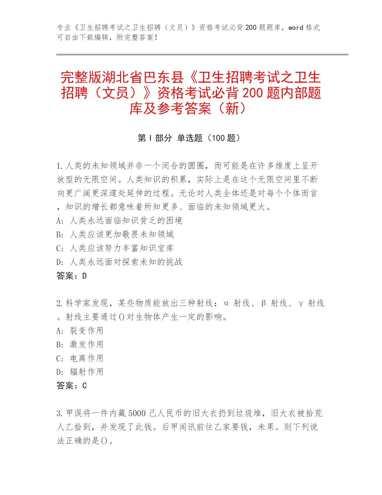 完整版湖北省巴东县《卫生招聘考试之卫生招聘(文员)》资格考试必背200题内部题库及参考答案(新)