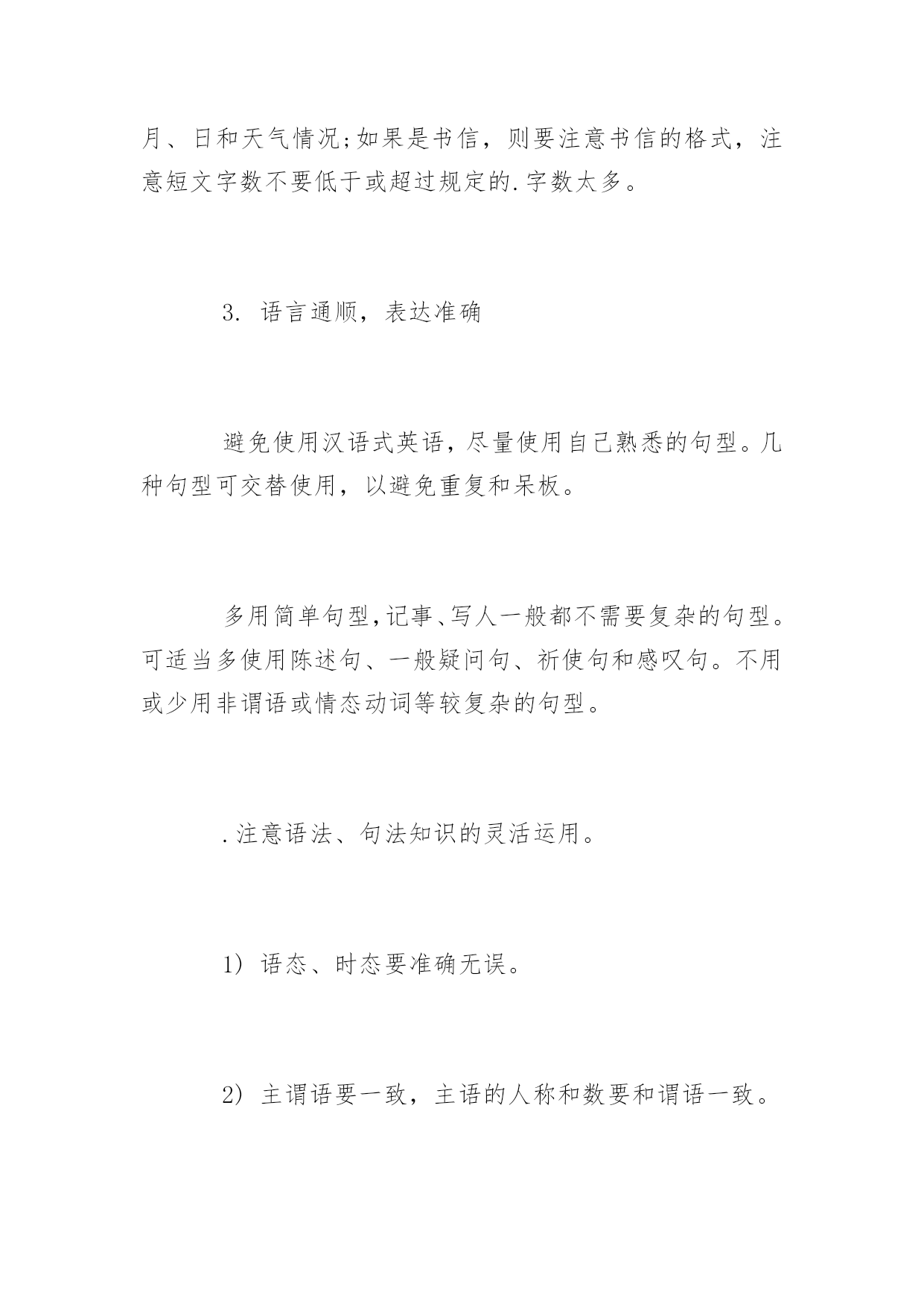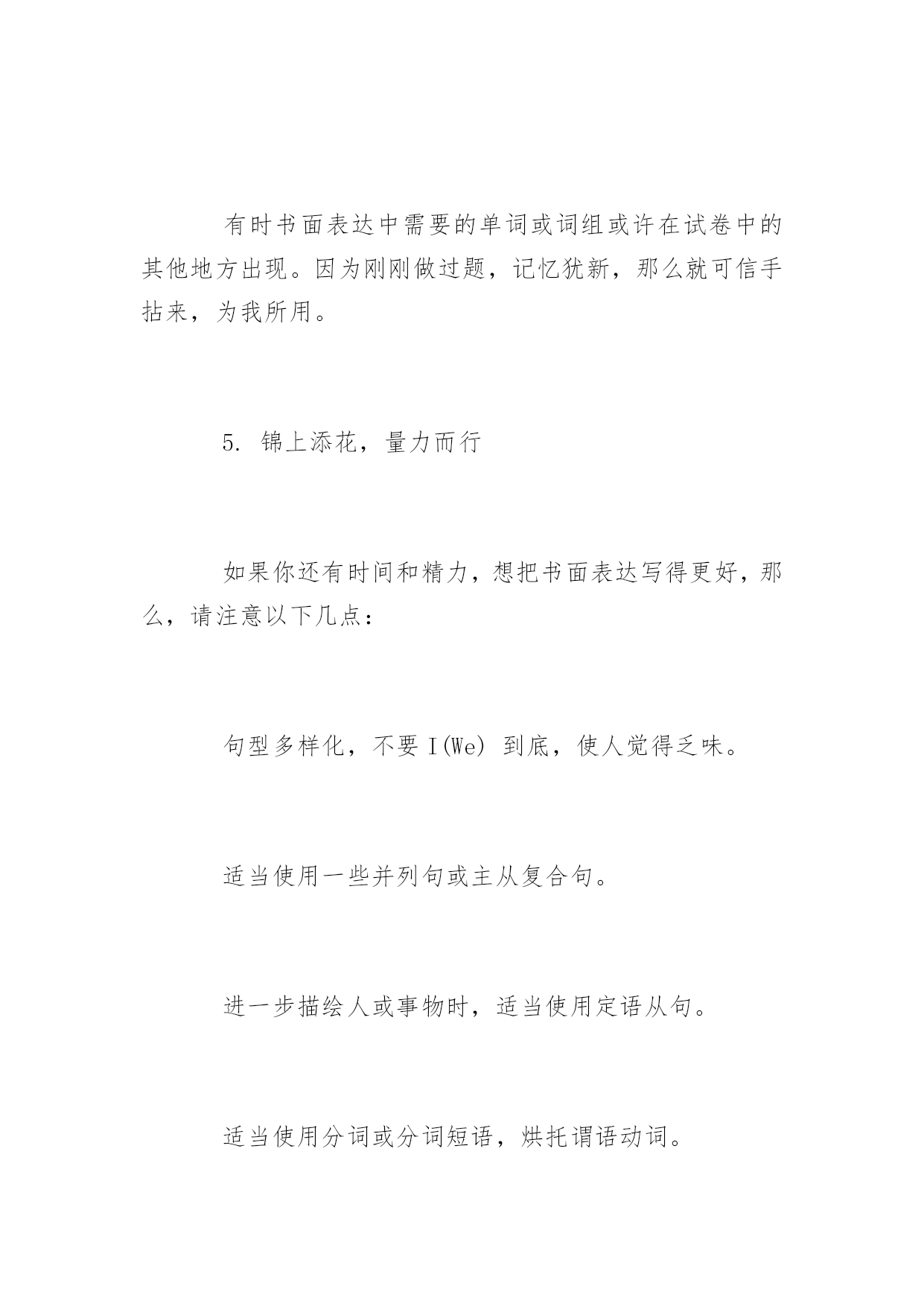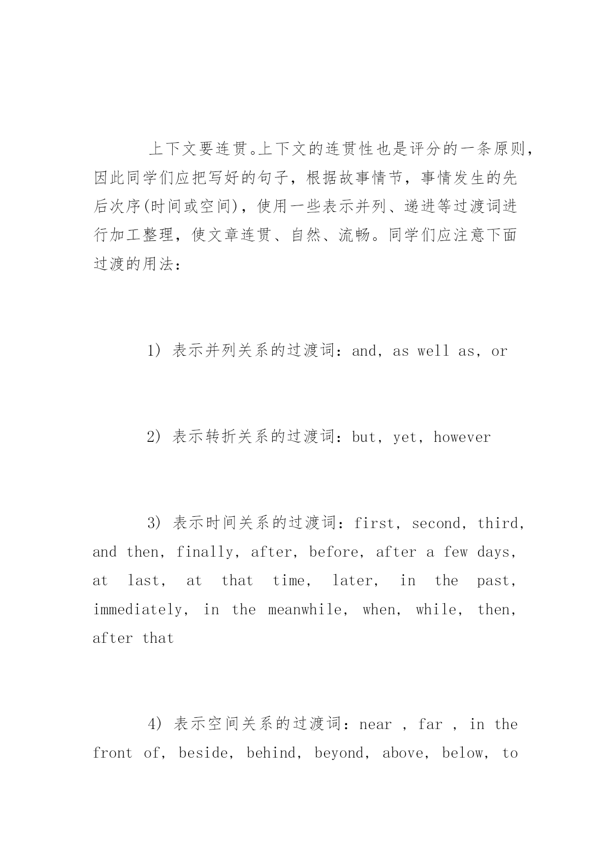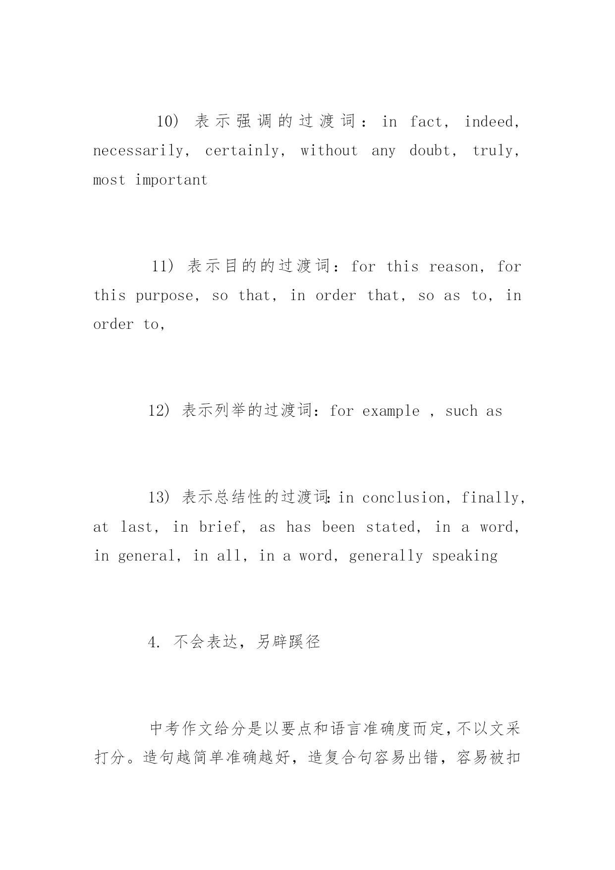 中考写作如何拿高分中考写作如何拿高分中考英语写作如何拿那高分?这是所有考生与师长都关心的,下面小编为大家整理了一些中考拿高分的秘诀,希望对大家有帮助。1.动笔之前,认真审题《中考考试说明》指出,书面表达要切中题意。怎样才能切中题意?就是要认真审题,看到考题后,先不要急于动笔,要仔细看清题目要求的内容。在自己的头脑中构思出一个框架或画面,确定短文的中心思想,不要匆匆下笔,看懂题意,根据、图表、提纲或短文提供的资料和信息来审题。审题要审格式、体裁、人物关系、故事情节、主体时态、活动时间、地点等。2.围绕中心,拟定提纲书面表达评分原则有四条:(1)内容要点;(2)运用词汇和结构的数量;(3)运用语法结构和词汇的准确性;(4)上下文的连贯性。由此可见,要点是给分的一个重要因素。为了防止写作过程中遗漏要点,同学们要充分发挥自己的观察力,把情景中给出的各个要点逐条列出。根据短文的中心思想考虑如何开头、展开和结尾,设想几个承上启下的连词,将主要句型、关键词语草草记下,形成提纲,写时切忌结构分散,废话连篇,严重跑题。书面表达,内容广泛,题材多样,要弄清考题的要求是写人、叙事、介绍、评论、图表、书信、、通知、便条还是看图作文或改写缩写。如果是,要写清年、月、日和天气情况;如果是书信,则要注意书信的格式,注意短文字数不要低于或超过规定的.字数太多。3.语言通顺,表达准确避免使用汉语式英语,尽量使用自己熟悉的句型。几种句型可交替使用,以避免重复和呆板。多用简单句型,记事、写人一般都不需要复杂的句型。可适当多使用陈述句、一般疑问句、祈使句和感叹句。不用或少用非谓语或情态动词等较复杂的句型。.注意语法、句法知识的灵活运用。1)语态、时态要准确无误。2)主谓语要一致,主语的人称和数要和谓语一致。3)注意人称代词的宾格形式。4)注意冠词用法,例如:Heisanhoneststudent.中的an不能写成a。5)注意拼写、标点符号和大小写,例如:receive,believe,fourteen,forty,ninth,restaurant等。标点符号特别注意汉英的不同,例如:汉语英语A.句号。.B.省略号C.顿号、无描写人物时,要生动具体,例如:1)外表特征:tall,short,fat,thin,strong,weak,ordinary-looking等。2)服饰颜色:red,yellow,blue,white,green,brown,black等。3)内心境界:glad,happy,sad,excited,anxious,interested等。4)感情描写:love,like,hate,feel,laugh,cry,smile,shout等。5)动作描写:come,go,get,have,take,bring,fetch等。上下文要连贯。上下文的连贯性也是评分的一条原则,因此同学们应把写好的句子,根据故事情节,事情发生的先后次序(时间或空间),使用一些表示并列、递进等过渡词进行加工整理,使文章连贯、自然、流畅。同学们应注意下面过渡的用法:1)表示并列关系的过渡词:and,aswellas,or2)表示转折关系的过渡词:but,yet,however3)表示时间关系的过渡词:first,second,third,andthen,finally,after,before,afterafewdays,atlast,atthattime,later,inthepast,immediately,inthemeanwhile,when,while,then,afterthat4)表示空间关系的过渡词:near,far,inthefrontof,beside,behind,beyond,above,below,totheright,totheleft,ononeside,ontheothersideof,outside5)表示比较关系的过渡词:inthesameway,justlike,justas6)表示对照关系的过渡词:but,still,yet,however,ontheotherhand,inspiteof,eventhough7)表示递进关系的过渡词:also,and,then,too,inaddition,moreover,again8)表示因果关系的过渡词:because,since,then,thus,otherwise,so,therefore,asaresult9)表示解释说明的过渡词:forexample,infact,inthiscase,for,actually10)表示强调的过渡词:infact,indeed,necessarily,certainly,