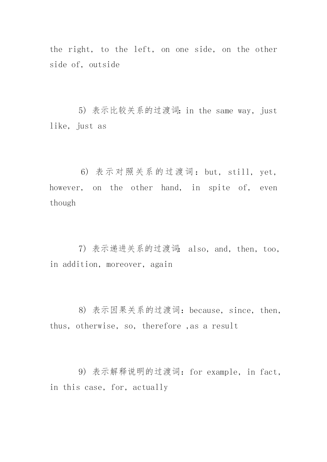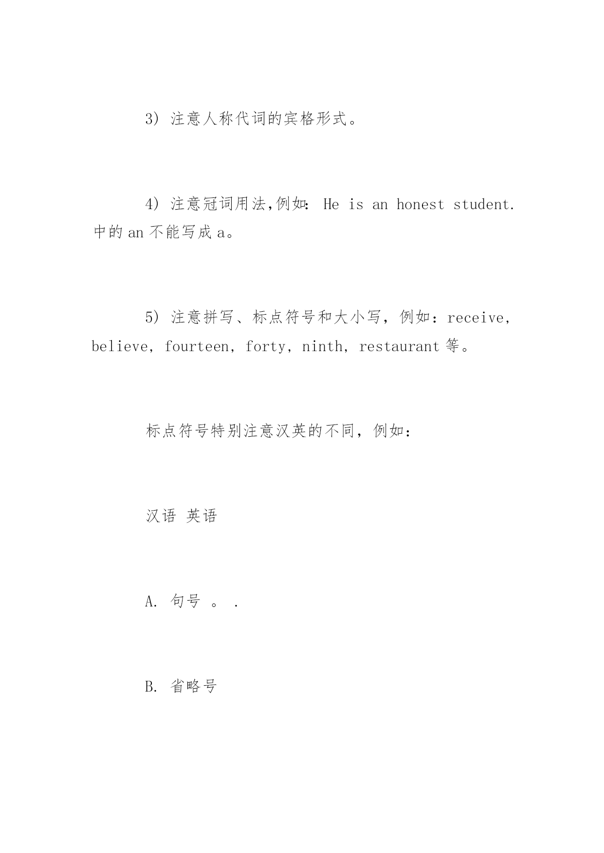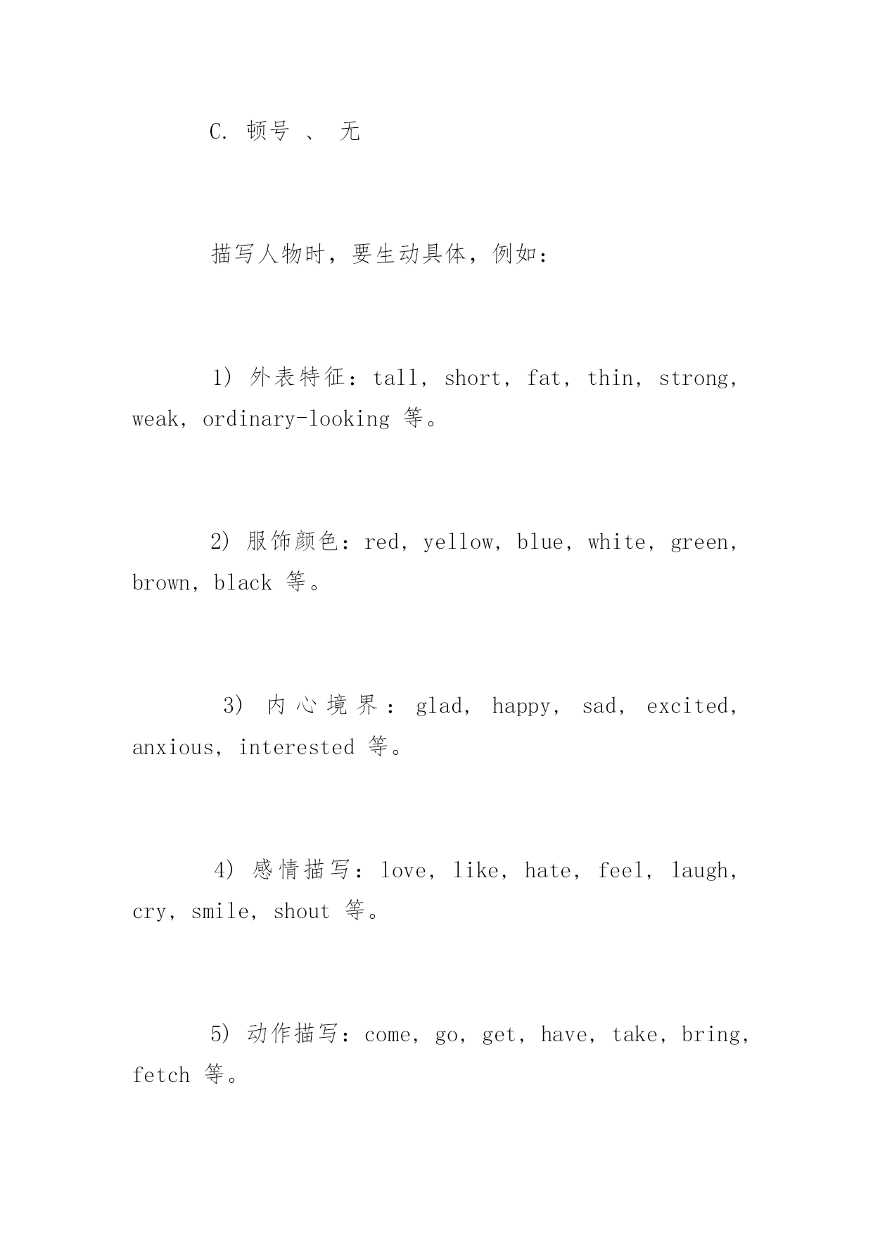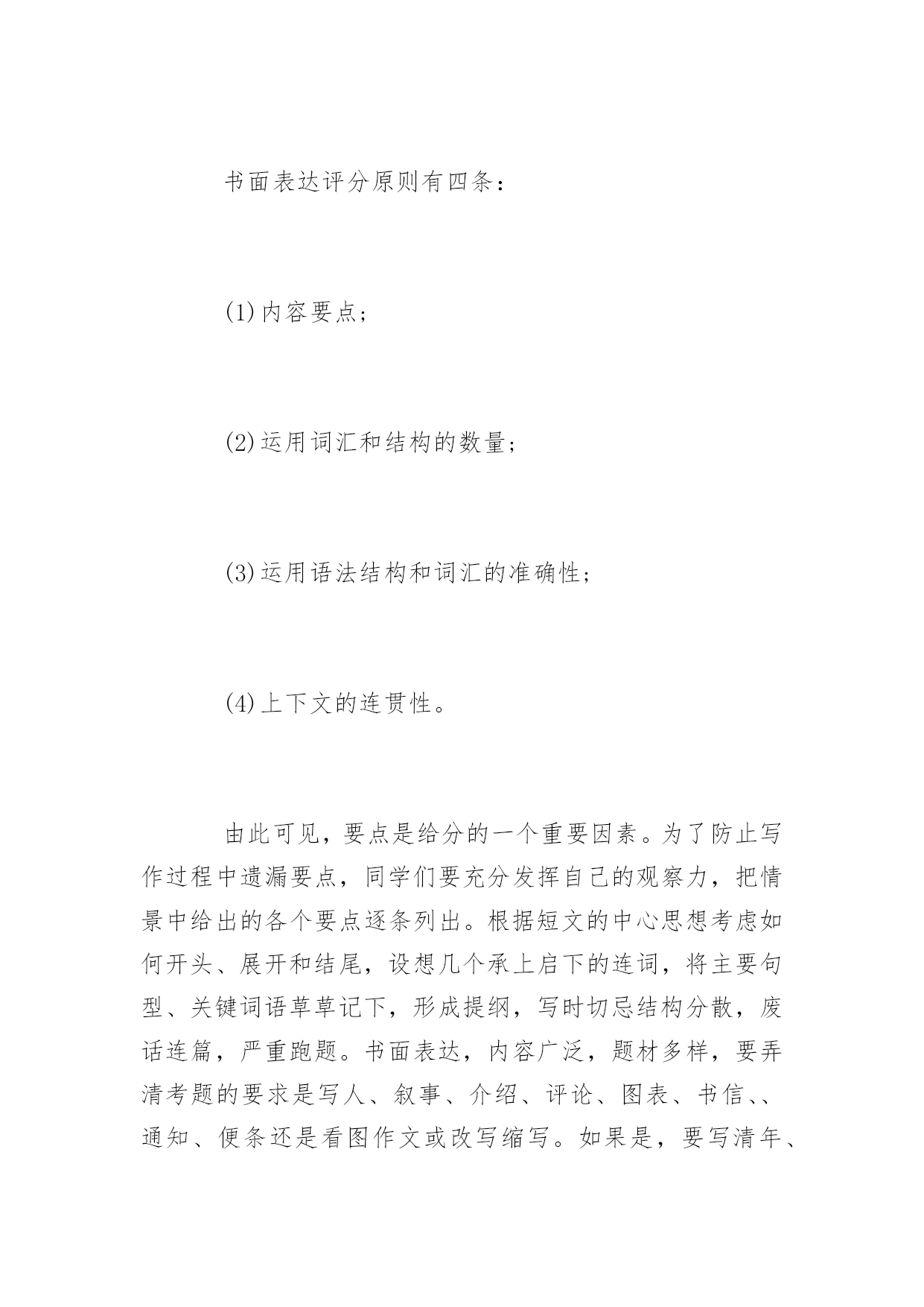 中考写作如何拿高分中考写作如何拿高分中考英语写作如何拿那高分?这是所有考生与师长都关心的,下面小编为大家整理了一些中考拿高分的秘诀,希望对大家有帮助。1.动笔之前,认真审题《中考考试说明》指出,书面表达要切中题意。怎样才能切中题意?就是要认真审题,看到考题后,先不要急于动笔,要仔细看清题目要求的内容。在自己的头脑中构思出一个框架或画面,确定短文的中心思想,不要匆匆下笔,看懂题意,根据、图表、提纲或短文提供的资料和信息来审题。审题要审格式、体裁、人物关系、故事情节、主体时态、活动时间、地点等。2.围绕中心,拟定提纲书面表达评分原则有四条:(1)内容要点;(2)运用词汇和结构的数量;(3)运用语法结构和词汇的准确性;(4)上下文的连贯性。由此可见,要点是给分的一个重要因素。为了防止写作过程中遗漏要点,同学们要充分发挥自己的观察力,把情景中给出的各个要点逐条列出。根据短文的中心思想考虑如何开头、展开和结尾,设想几个承上启下的连词,将主要句型、关键词语草草记下,形成提纲,写时切忌结构分散,废话连篇,严重跑题。书面表达,内容广泛,题材多样,要弄清考题的要求是写人、叙事、介绍、评论、图表、书信、、通知、便条还是看图作文或改写缩写。如果是,要写清年、月、日和天气情况;如果是书信,则要注意书信的格式,注意短文字数不要低于或超过规定的.字数太多。3.语言通顺,表达准确避免使用汉语式英语,尽量使用自己熟悉的句型。几种句型可交替使用,以避免重复和呆板。多用简单句型,记事、写人一般都不需要复杂的句型。可适当多使用陈述句、一般疑问句、祈使句和感叹句。不用或少用非谓语或情态动词等较复杂的句型。.注意语法、句法知识的灵活运用。1)语态、时态要准确无误。2)主谓语要一致,主语的人称和数要和谓语一致。3)注意人称代词的宾格形式。4)注意冠词用法,例如:Heisanhoneststudent.中的an不能写成a。5)注意拼写、标点符号和大小写,例如:receive,believe,fourteen,forty,ninth,restaurant等。标点符号特别注意汉英的不同,例如:汉语英语A.句号。.B.省略号C.顿号、无描写人物时,要生动具体,例如:1)外表特征:tall,short,fat,thin,strong,weak,ordinary-looking等。2)服饰颜色:red,yellow,blue,white,green,brown,black等。3)内心境界:glad,happy,sad,excited,anxious,interested等。4)感情描写:love,like,hate,feel,laugh,cry,smile,shout等。5)动作描写:come,go,get,have,take,bring,fetch等。上下文要连贯。上下文的连贯性也是评分的一条原则,因此同学们应把写好的句子,根据故事情节,事情发生的先后次序(时间或空间),使用一些表示并列、递进等过渡词进行加工整理,使文章连贯、自然、流畅。同学们应注意下面过渡的用法:1)表示并列关系的过渡词:and,aswellas,or2)表示转折关系的过渡词:but,yet,however3)表示时间关系的过渡词:first,second,third,andthen,finally,after,before,afterafewdays,atlast,atthattime,later,inthepast,immediately,inthemeanwhile,when,while,then,afterthat4)表示空间关系的过渡词:near,far,inthefrontof,beside,behind,beyond,above,below,totheright,totheleft,ononeside,ontheothersideof,outside5)表示比较关系的过渡词:inthesameway,justlike,justas6)表示对照关系的过渡词:but,still,yet,however,ontheotherhand,inspiteof,eventhough7)表示递进关系的过渡词:also,and,then,too,inaddition,moreover,again8)表示因果关系的过渡词:because,since,then,thus,otherwise,so,therefore,asaresult9)表示解释说明的过渡词:forexample,infact,inthiscase,for,actually10)表示强调的过渡词:infact,indeed,necessarily,certainly,